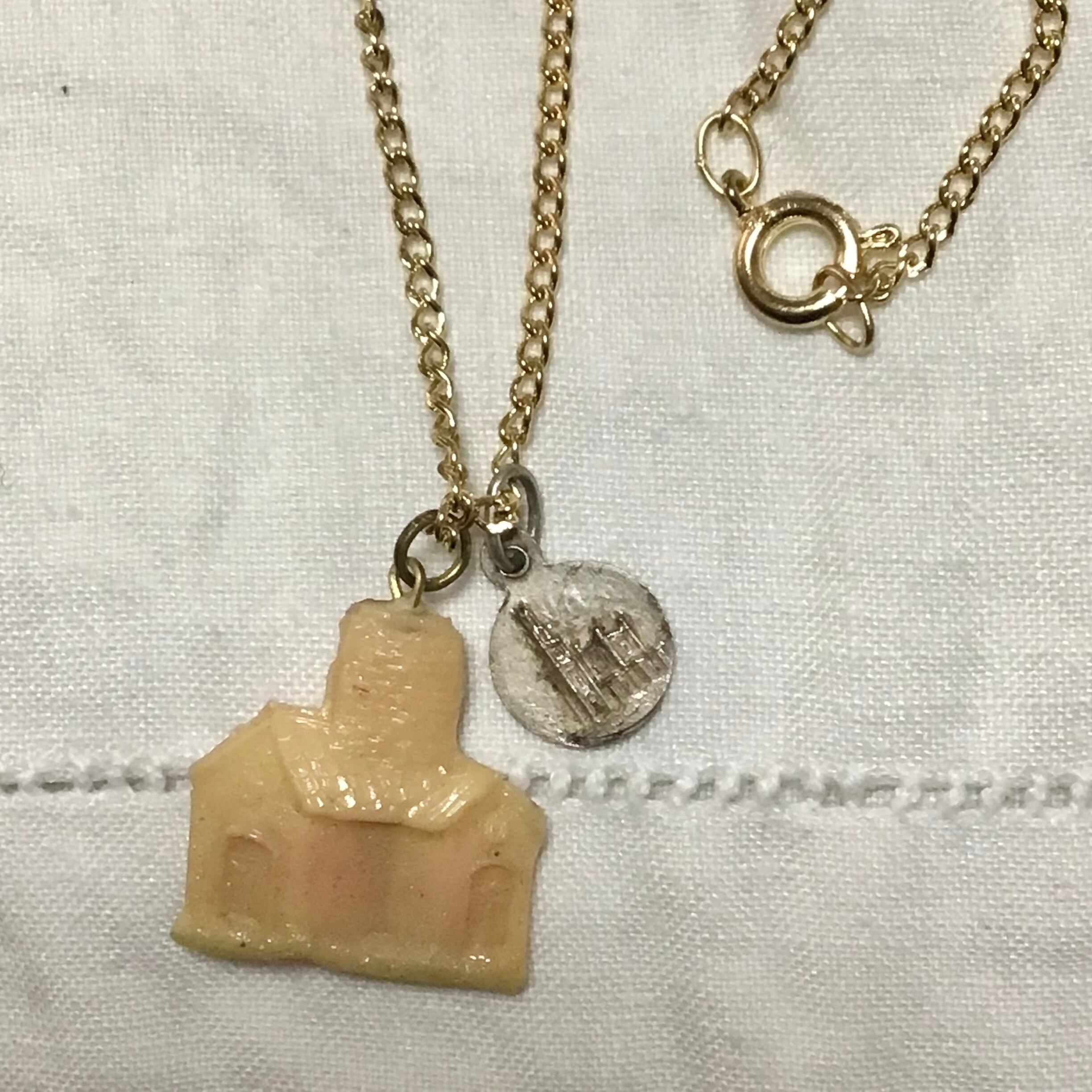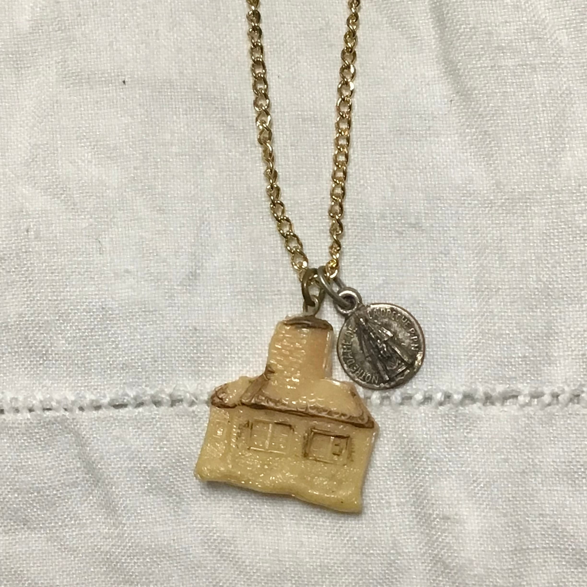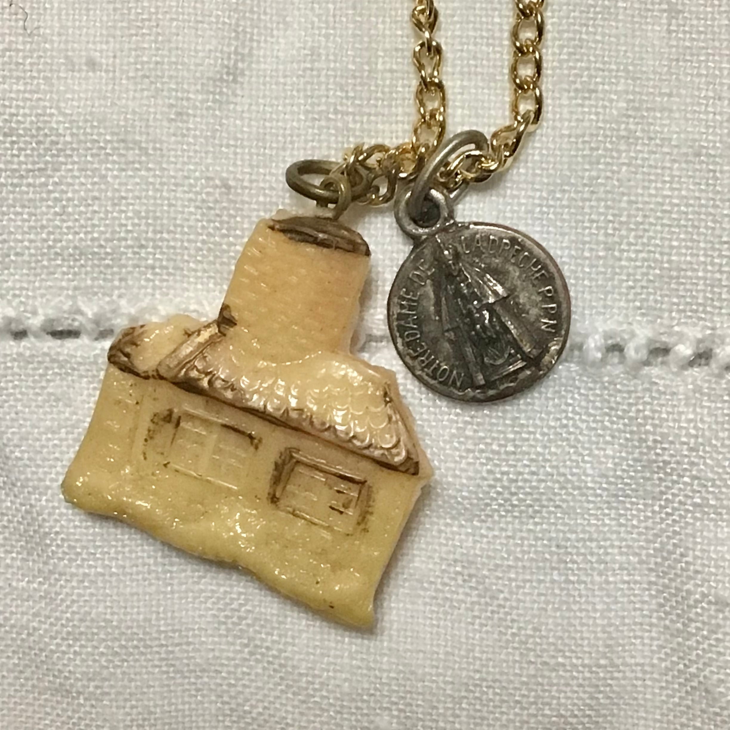 1950年代のプラスチックチャームに小さなメダイを合わせたネックレス、チェーンは80年代のデッドストックです♡よく見ると細かなお家のデザインや、古いプラスチックの風合いがとても良いお品、チープですがこなれ感もありおすすめです!