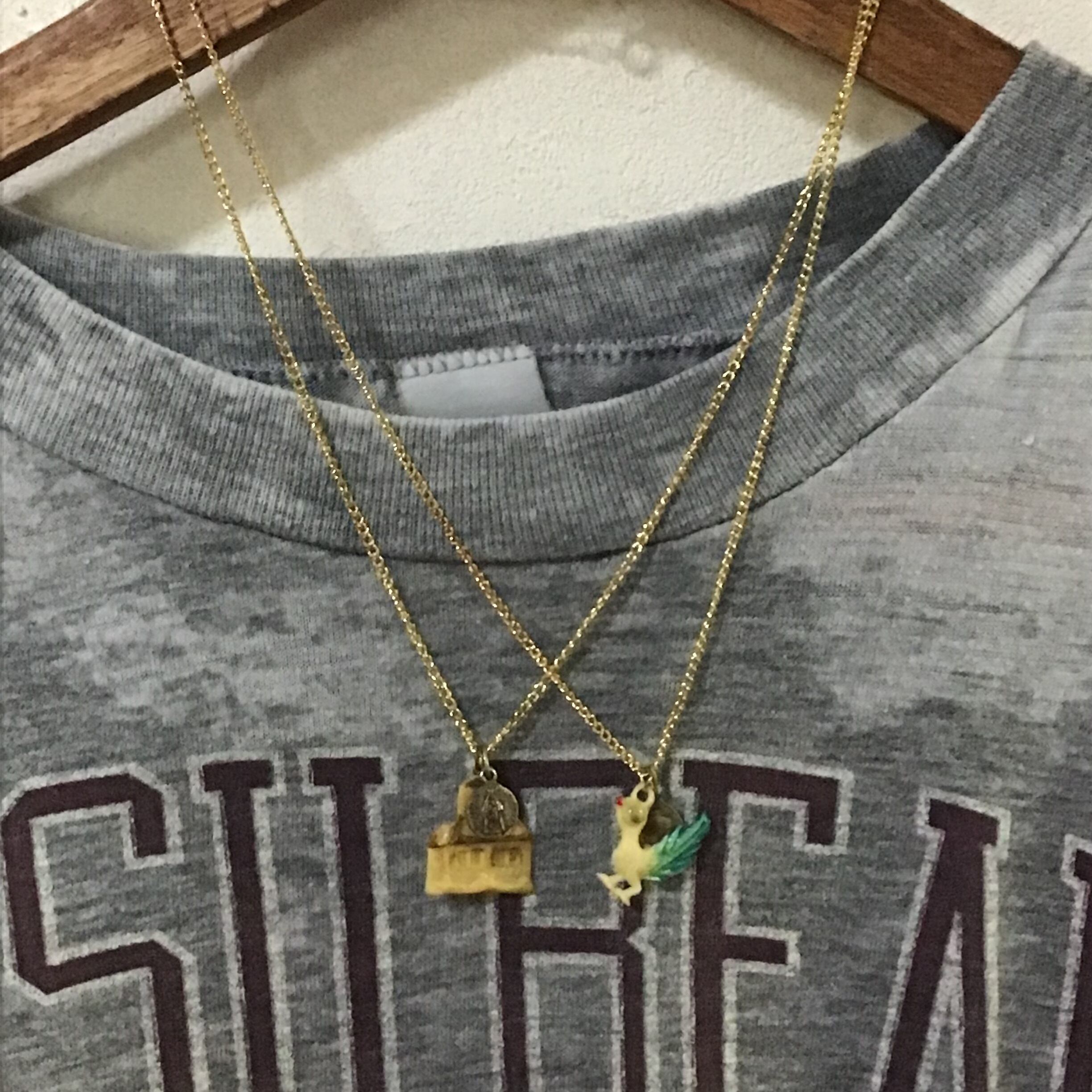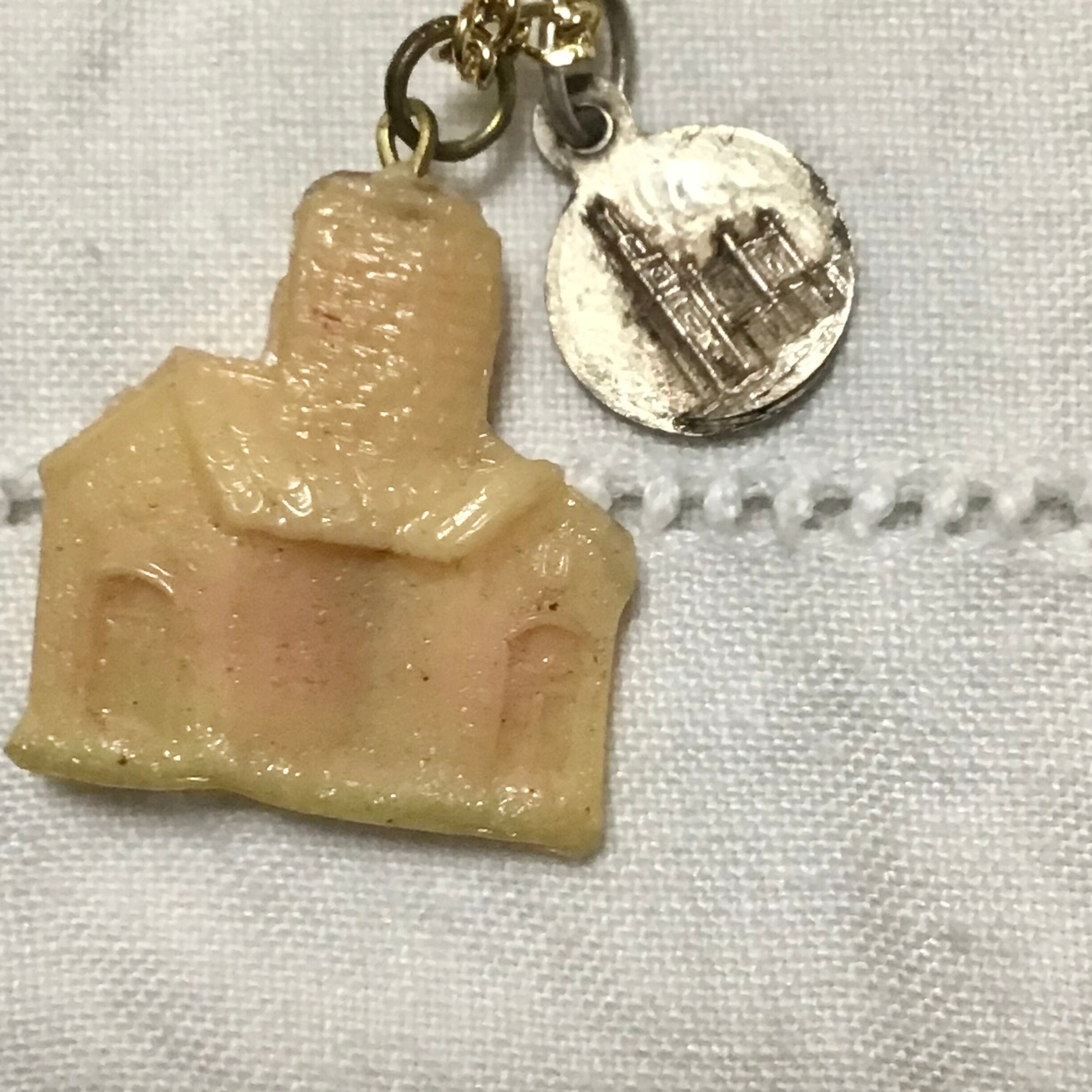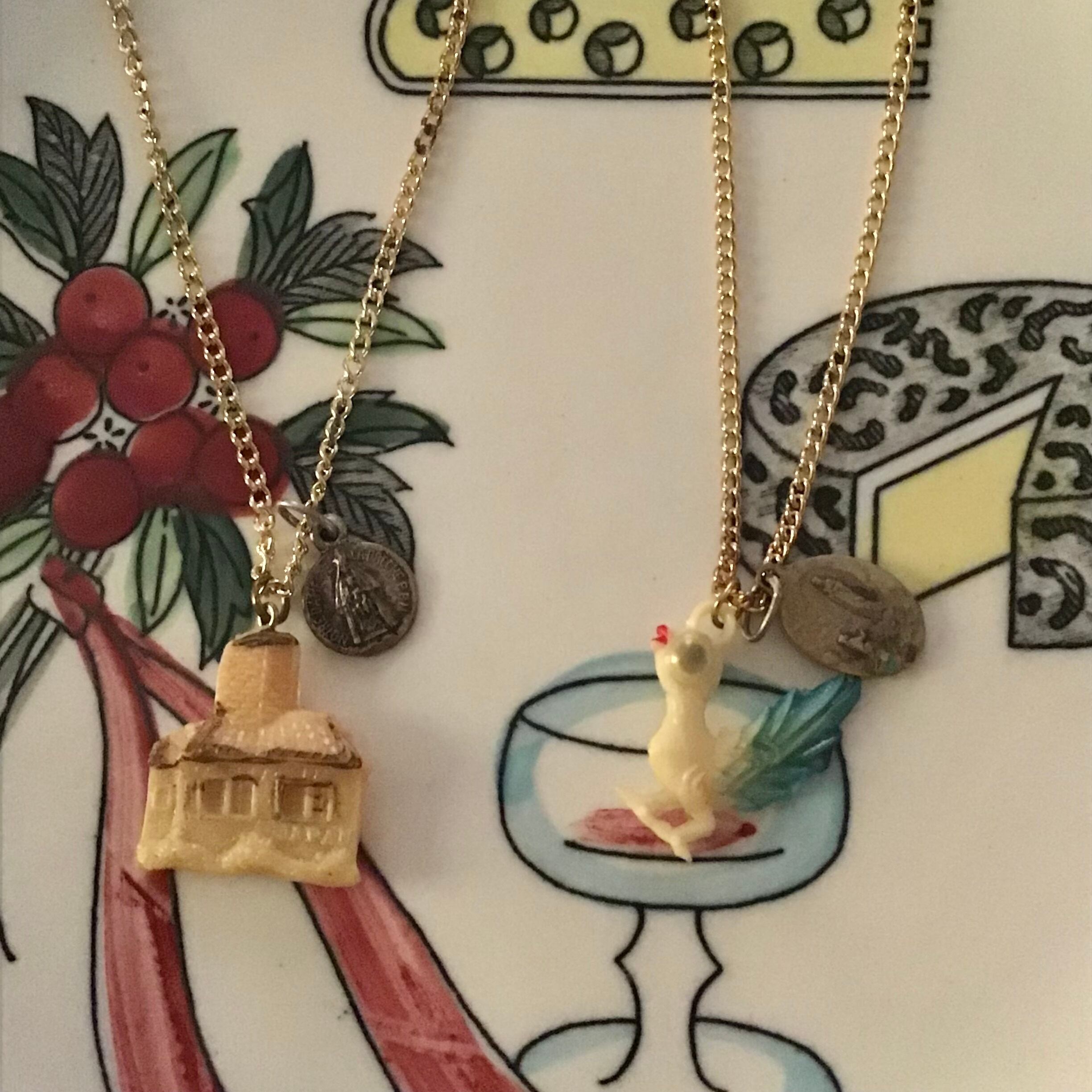 1950年代のプラスチックチャームに小さなメダイを合わせたネックレス、チェーンは80年代のデッドストックです♡よく見ると細かなお家のデザインや、古いプラスチックの風合いがとても良いお品、チープですがこなれ感もありおすすめです!