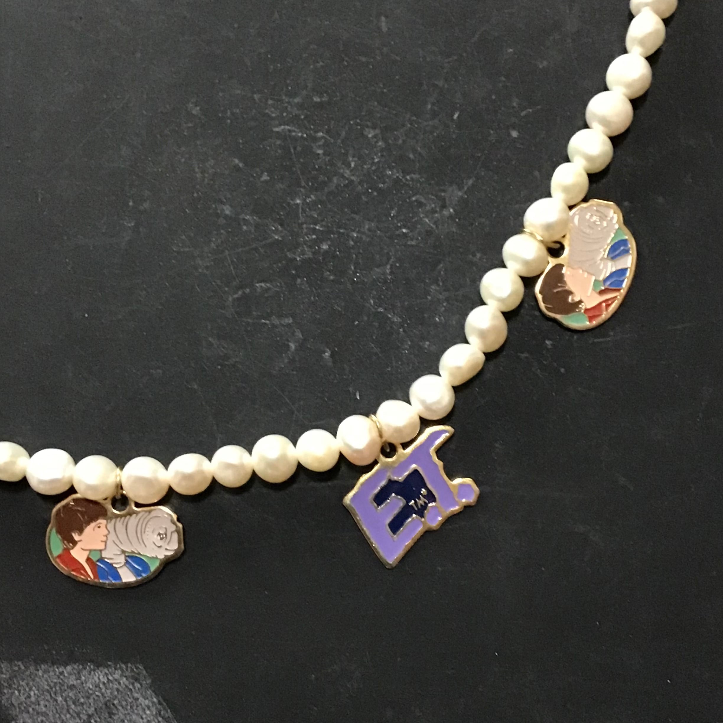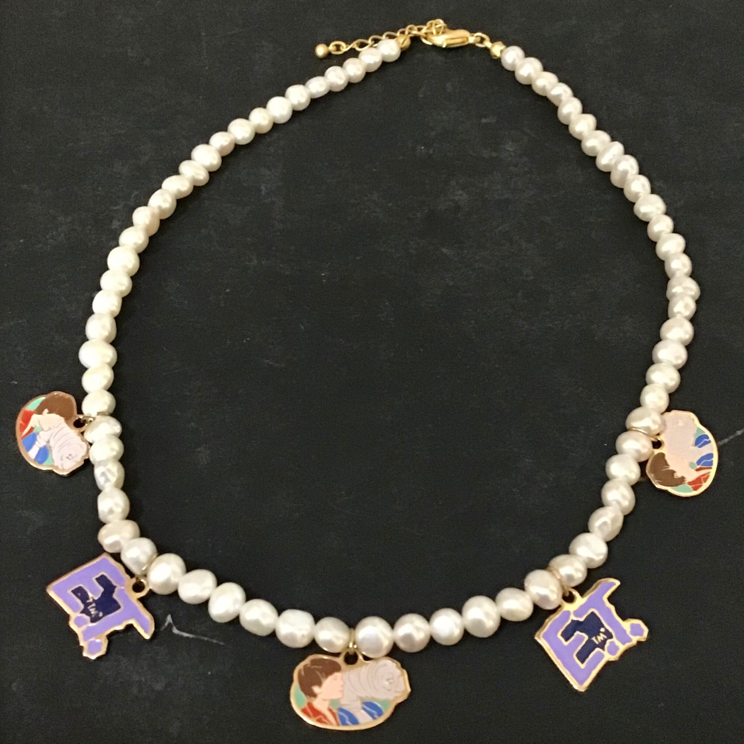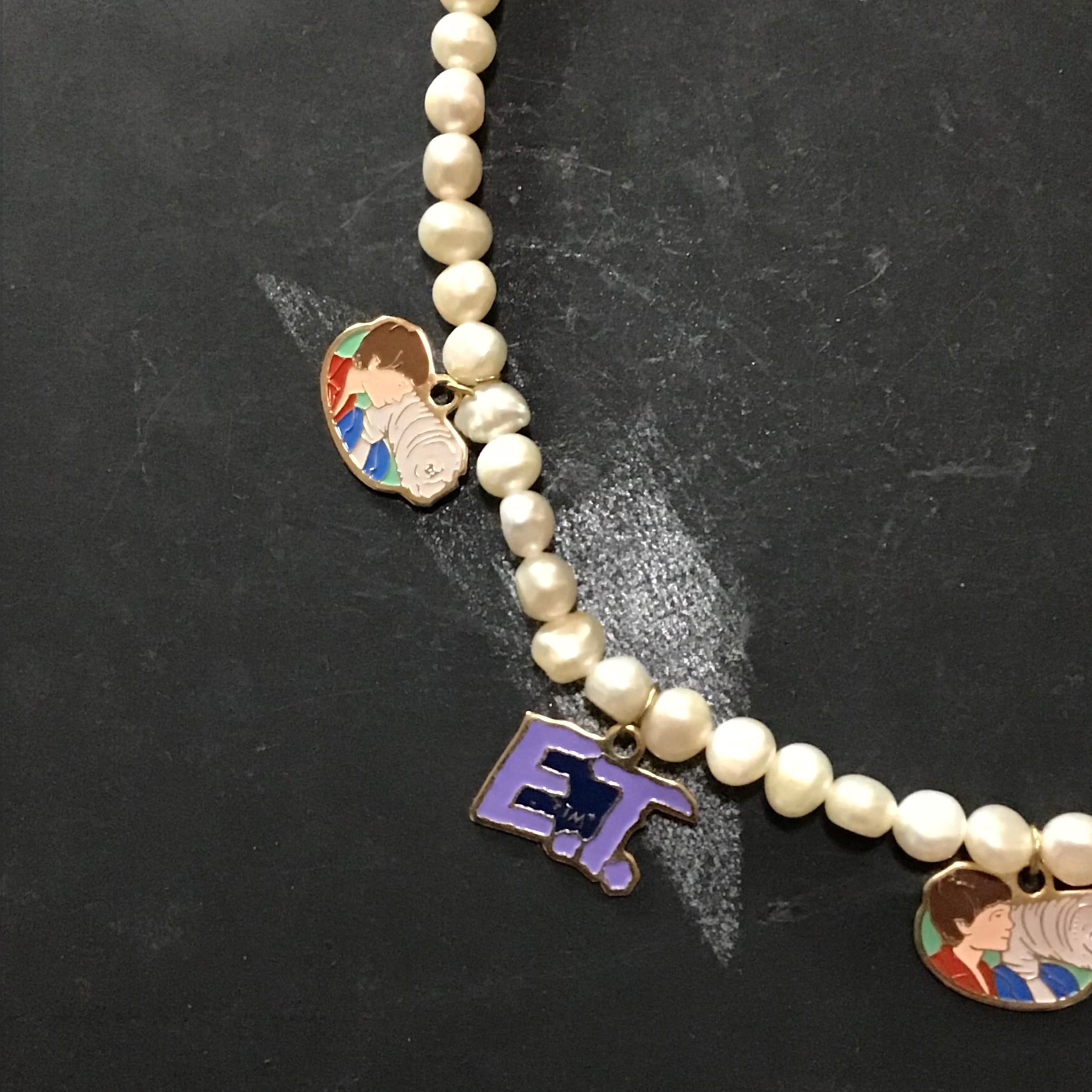 2種類のE.T.チャームが付いた淡水パールのネックレス。ネックレスは近年の物ですが、短くするとチョーカーの様に首に添い、Tシャツなどに合わせるととても可愛いです♡シルバーなどお手持ちのネックレスと重ねても◎