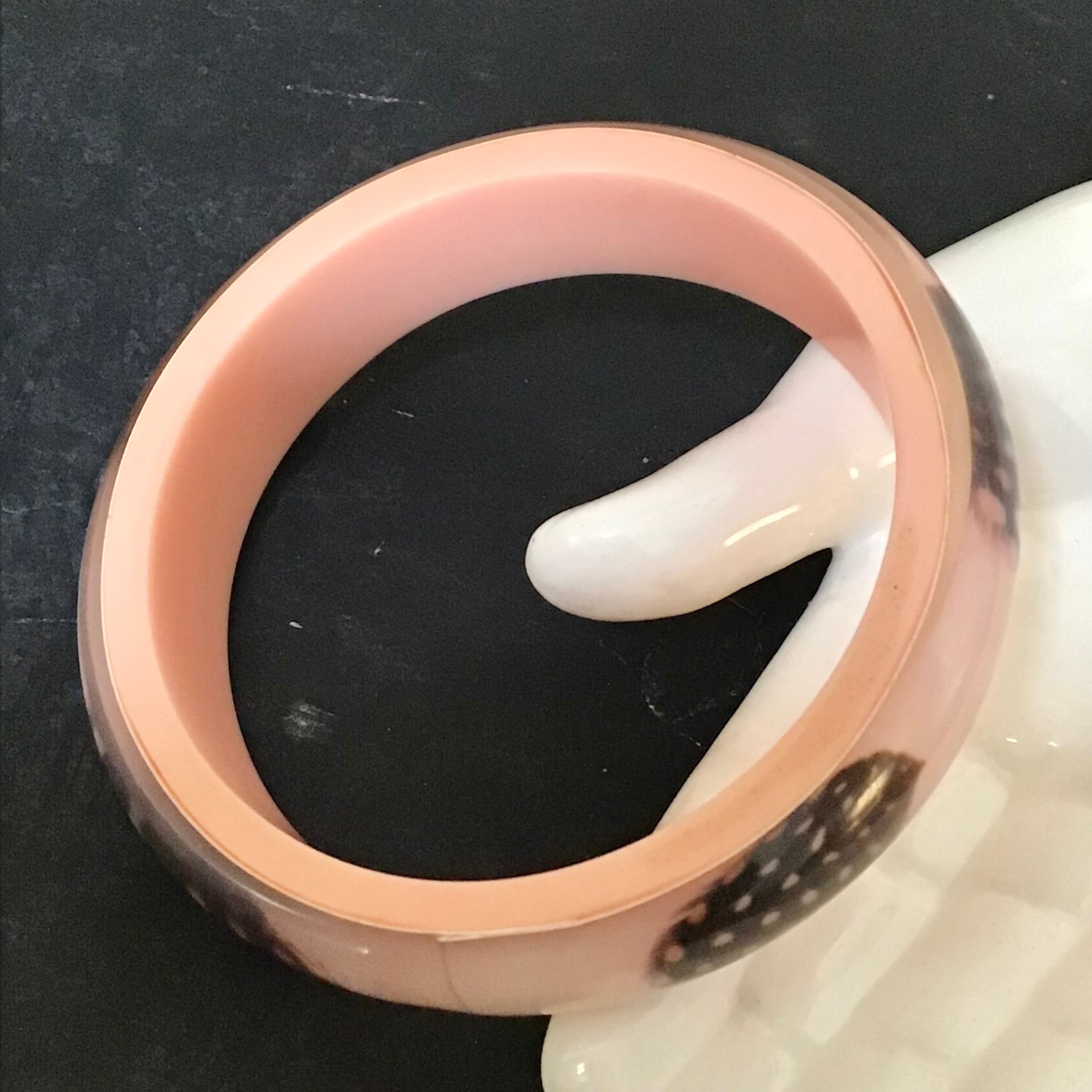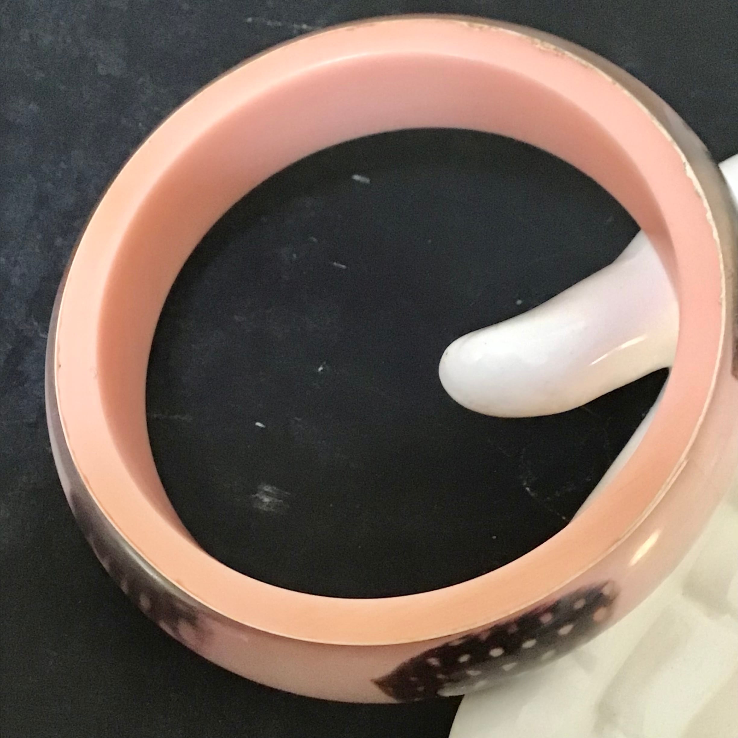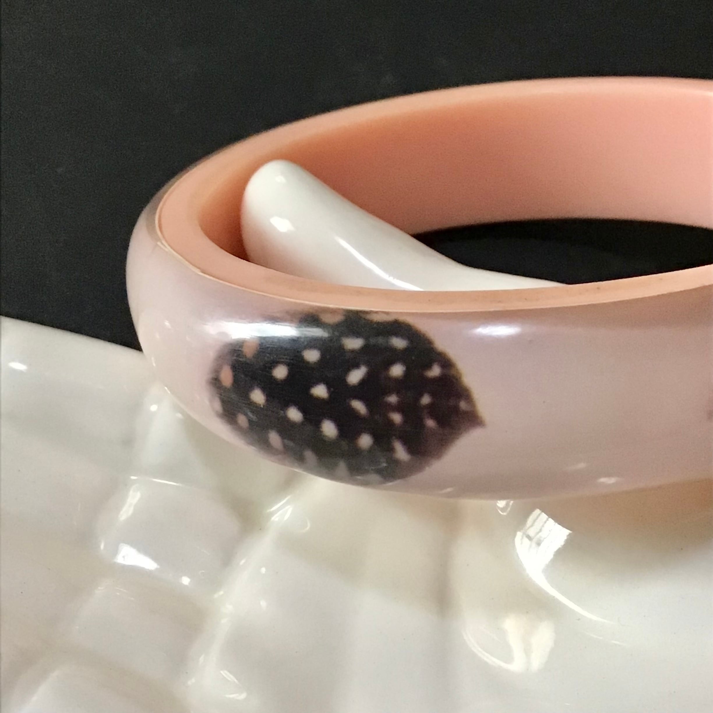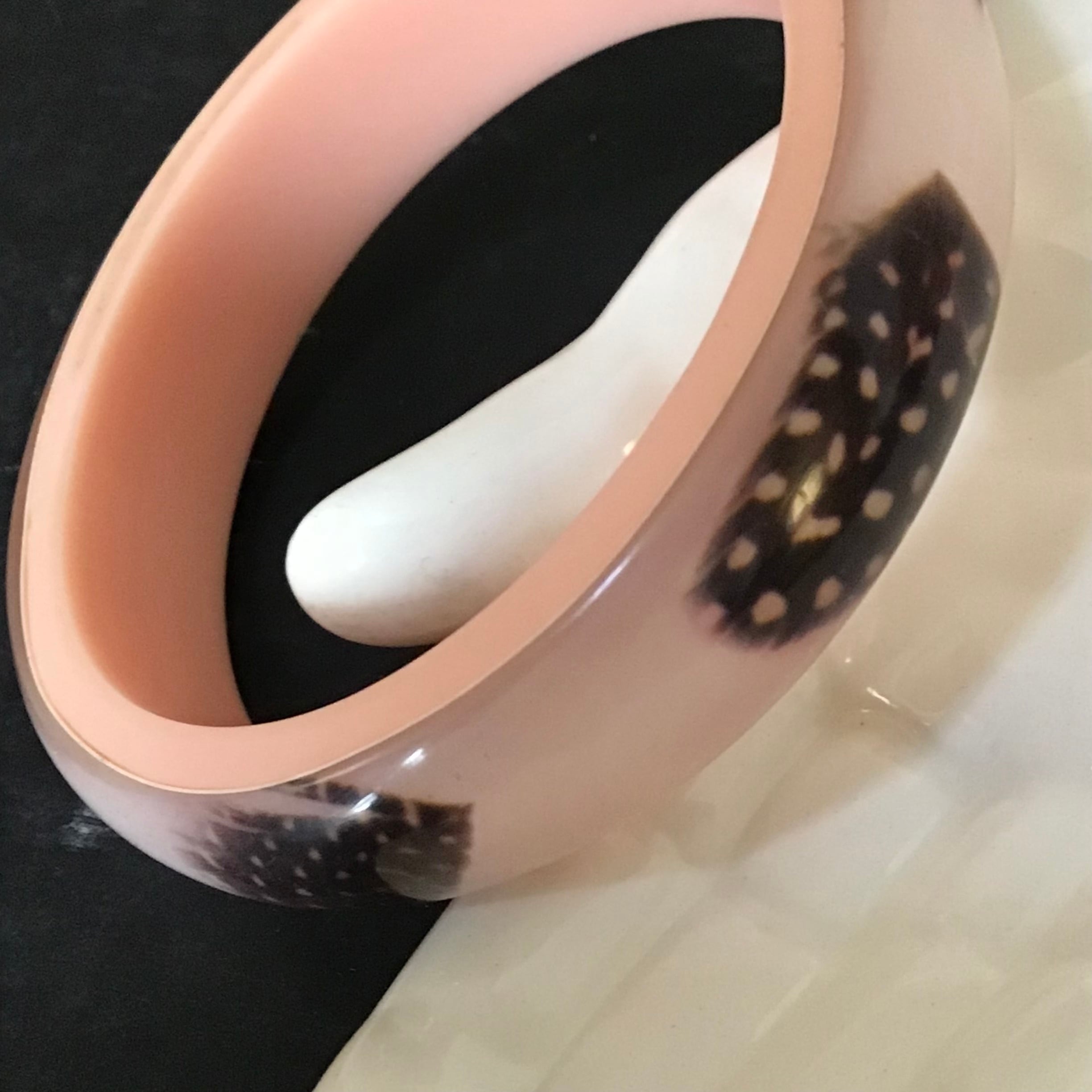 1960年代、ほろほろ鳥の羽が閉じ込められたルーサイトのバングル。薄いコーラルピンクとクリアの2層になった程よいボリューム感、肌馴染みの良いカラーでさりげなく使えます♡ニットやスウェットの上からつけても可愛いです◎