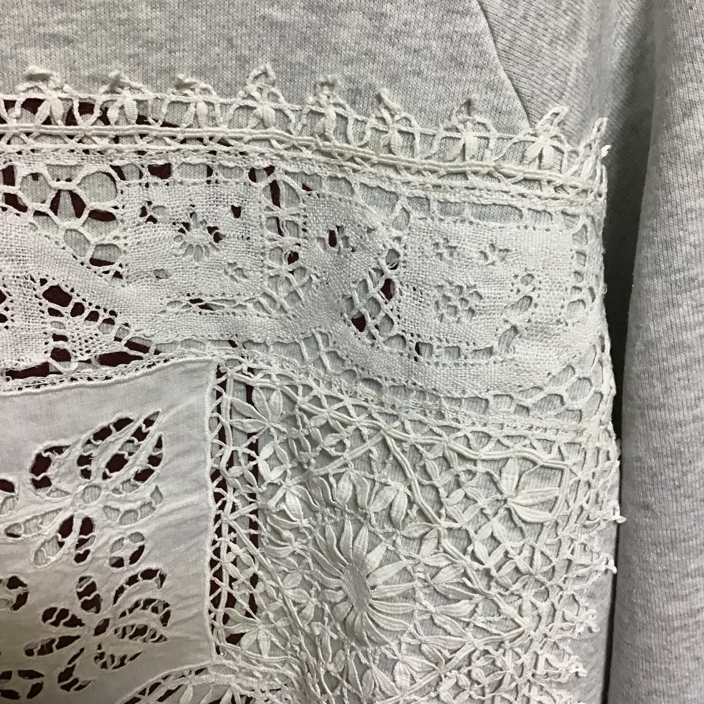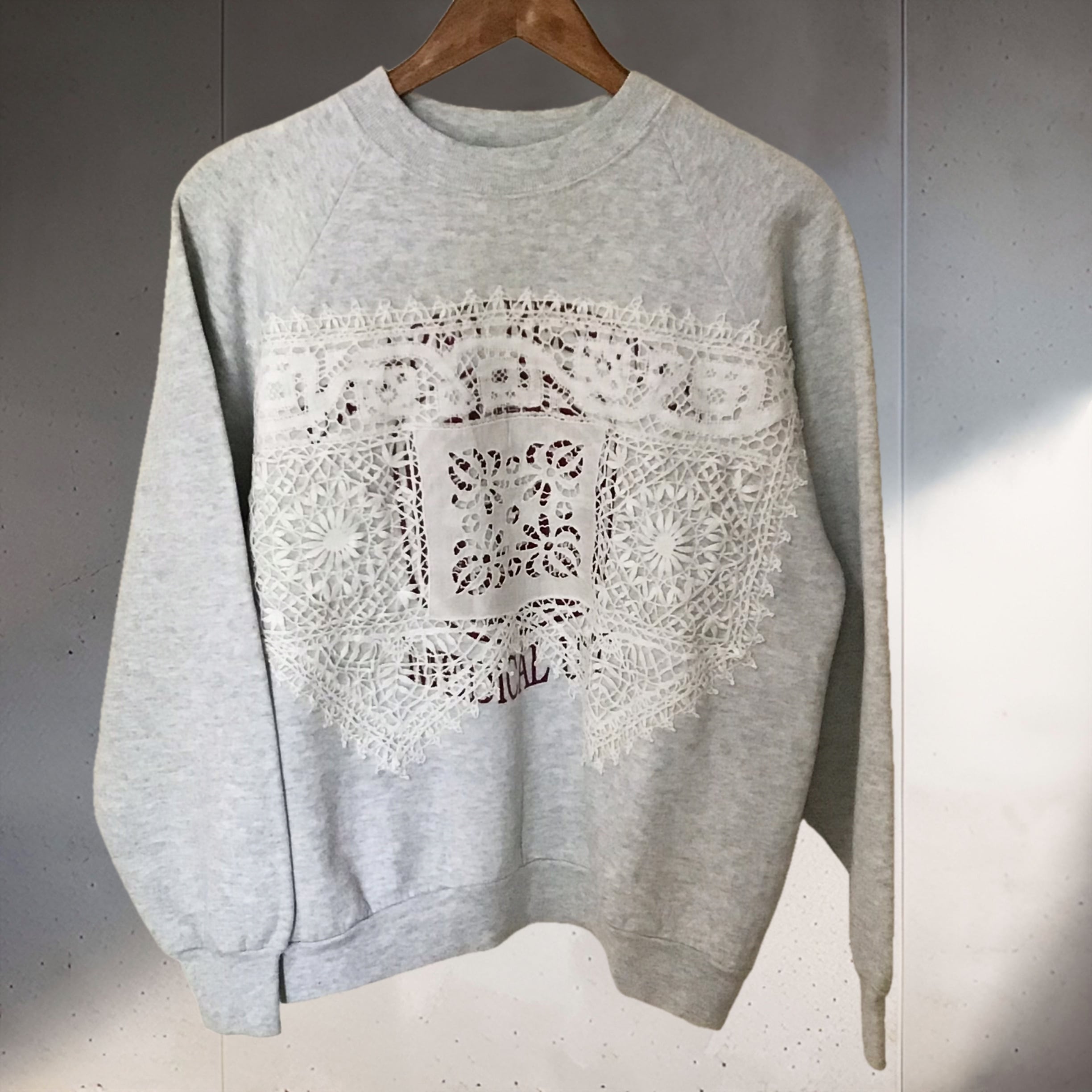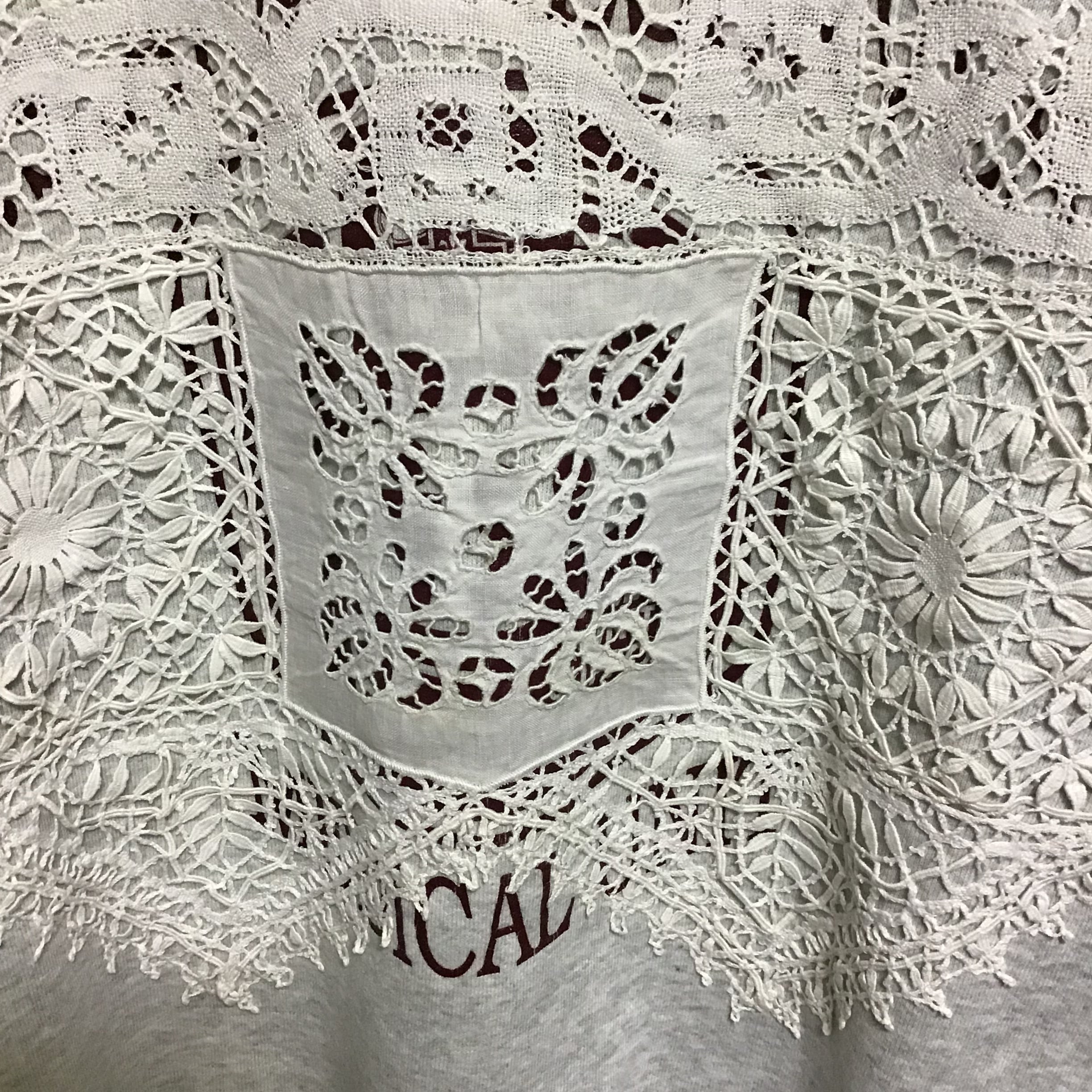 1990年代のプリントスウェットに勲章のようなデザインのアンティークレースをあしらいました。様々な編み方で作られた大きなレースは繊細さの中に可愛らしさもあり、レースの隙間からちらりと覗くプリントとも高相性でです♡春先には一枚で主役になってくれそうなおすすめのお品です◎