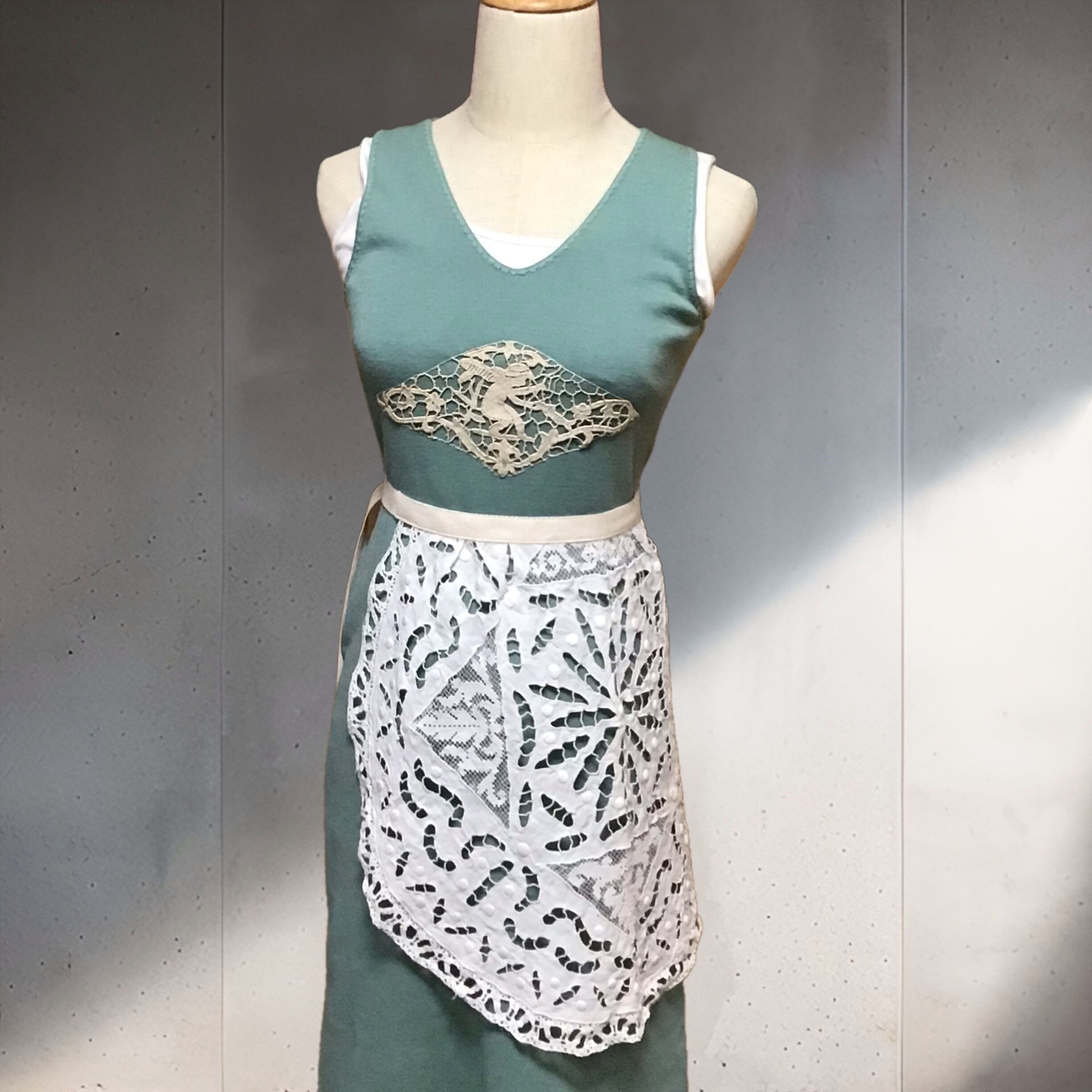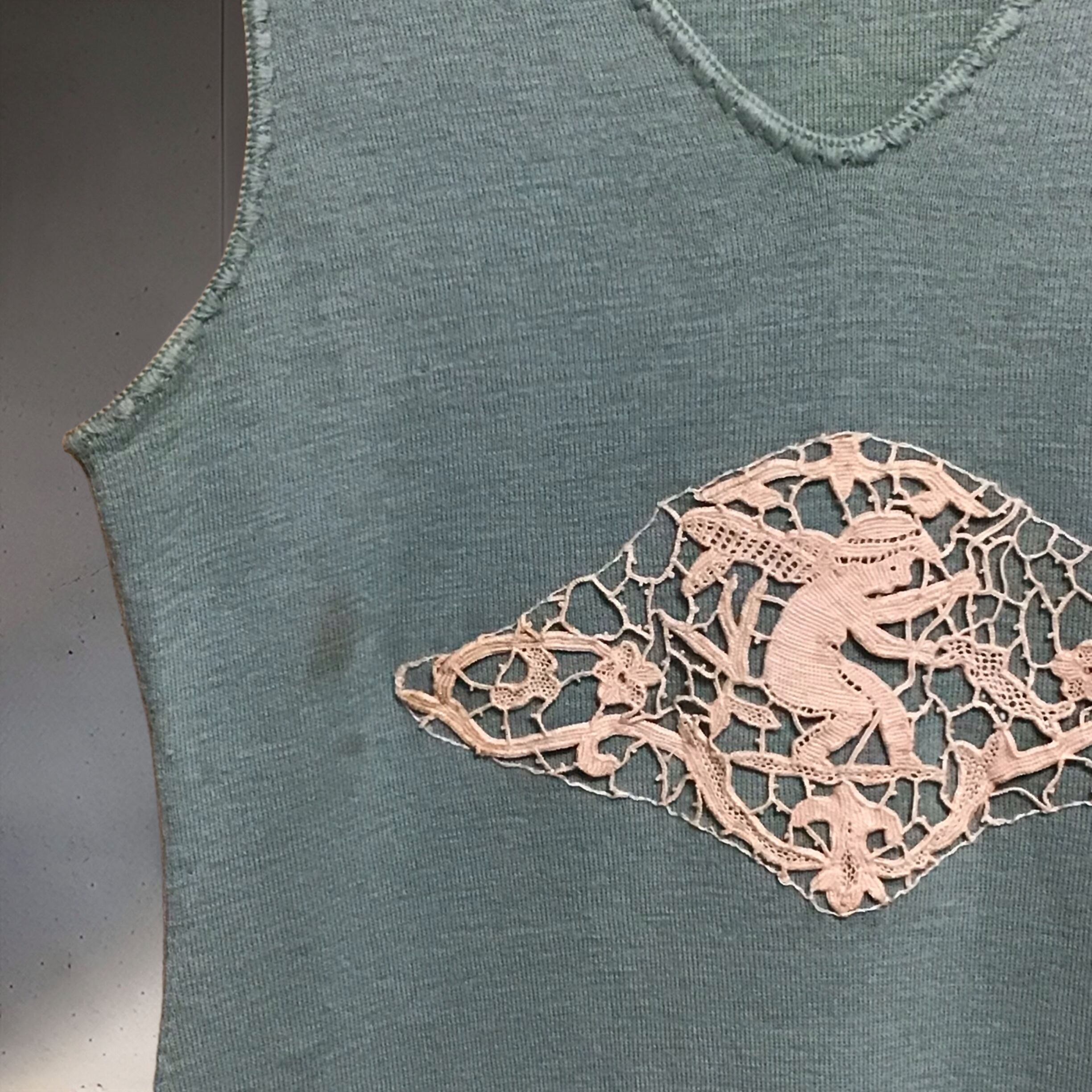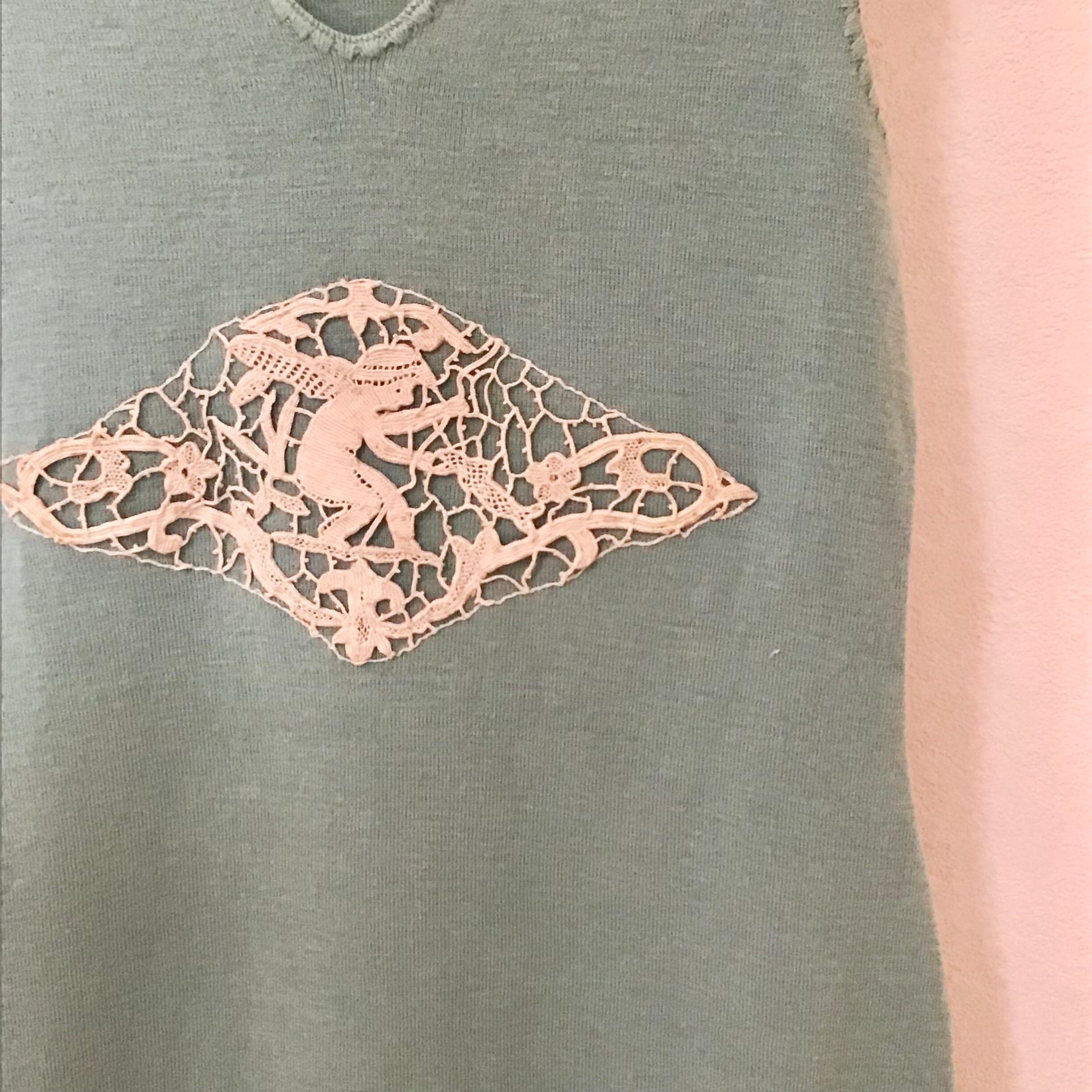 古いニットのアンダードレスに天使モチーフのアンティークレースをあしらいました。絶妙なモスグリーンがとっても良い色で素敵です♡タンクトップや薄手のインナーを合わせたり、ブラウスやカーディガンのインナーにしたりと活躍してくれそうです♡デニムやスウェットパンツに重ねても◎