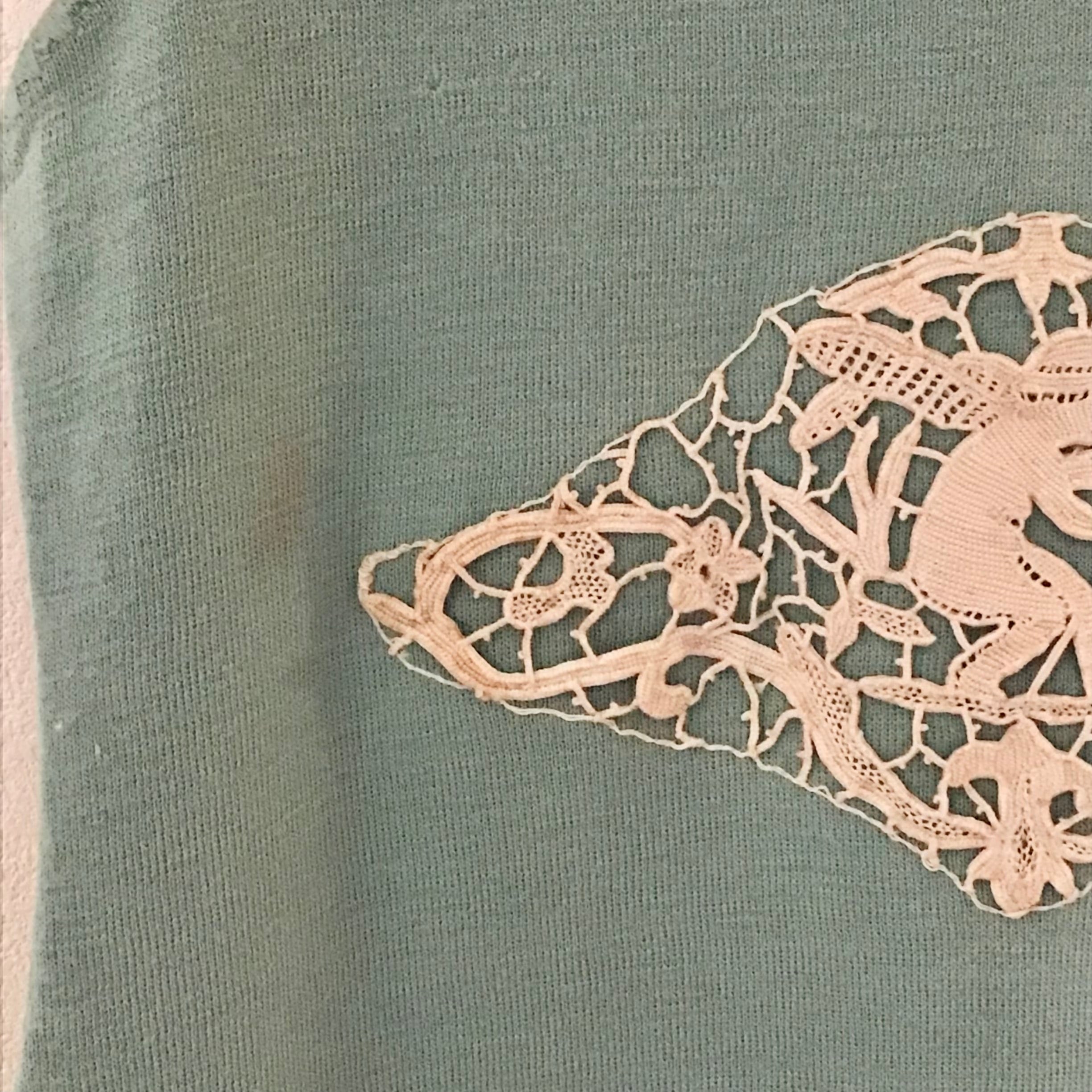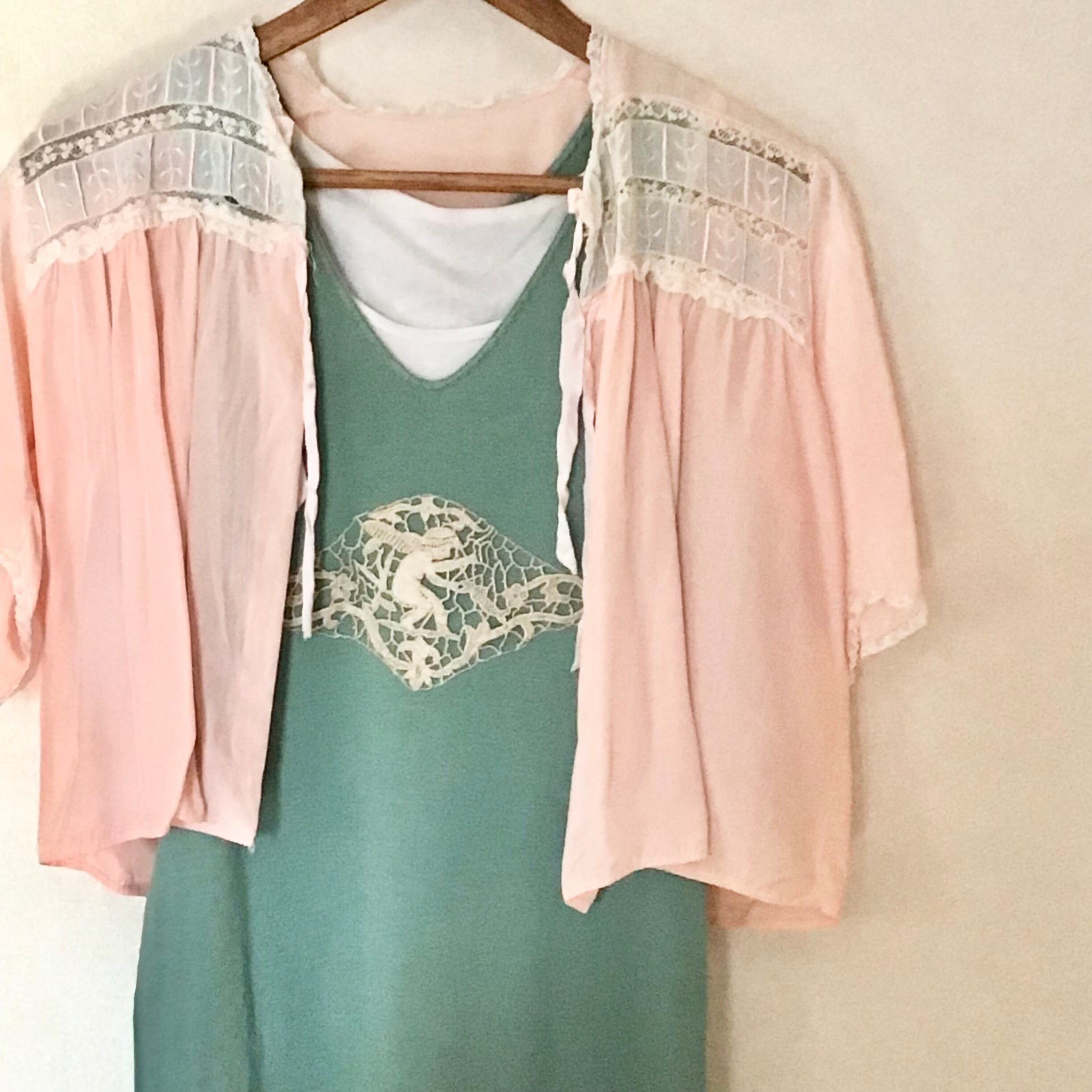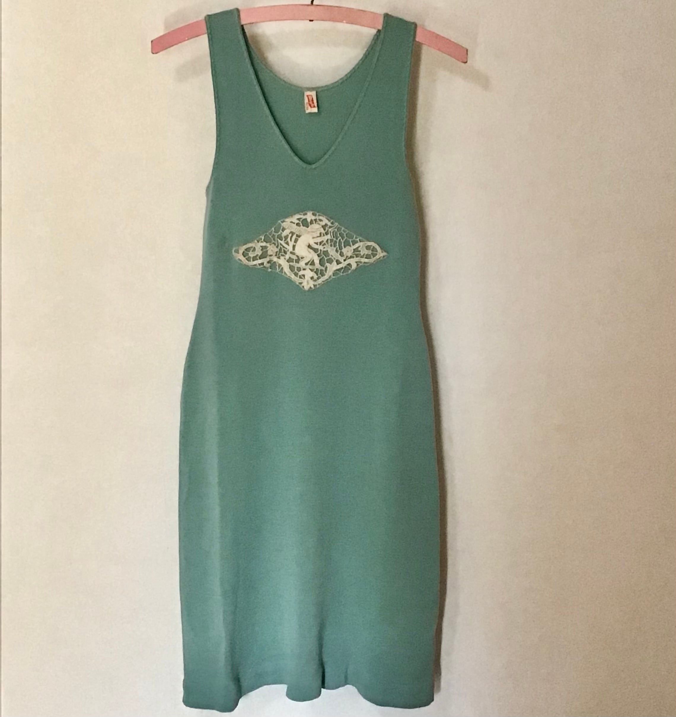 古いニットのアンダードレスに天使モチーフのアンティークレースをあしらいました。絶妙なモスグリーンがとっても良い色で素敵です♡タンクトップや薄手のインナーを合わせたり、ブラウスやカーディガンのインナーにしたりと活躍してくれそうです♡デニムやスウェットパンツに重ねても◎