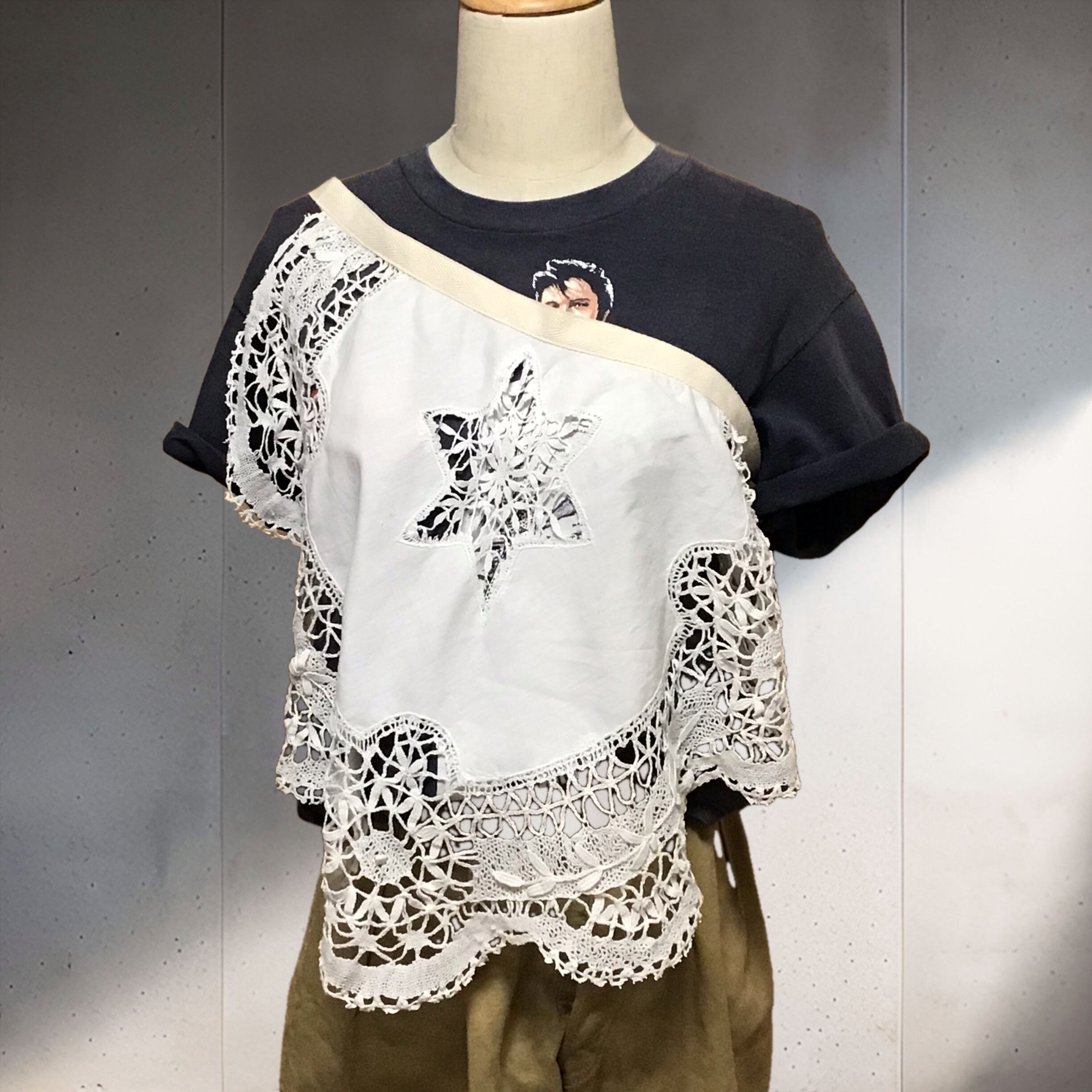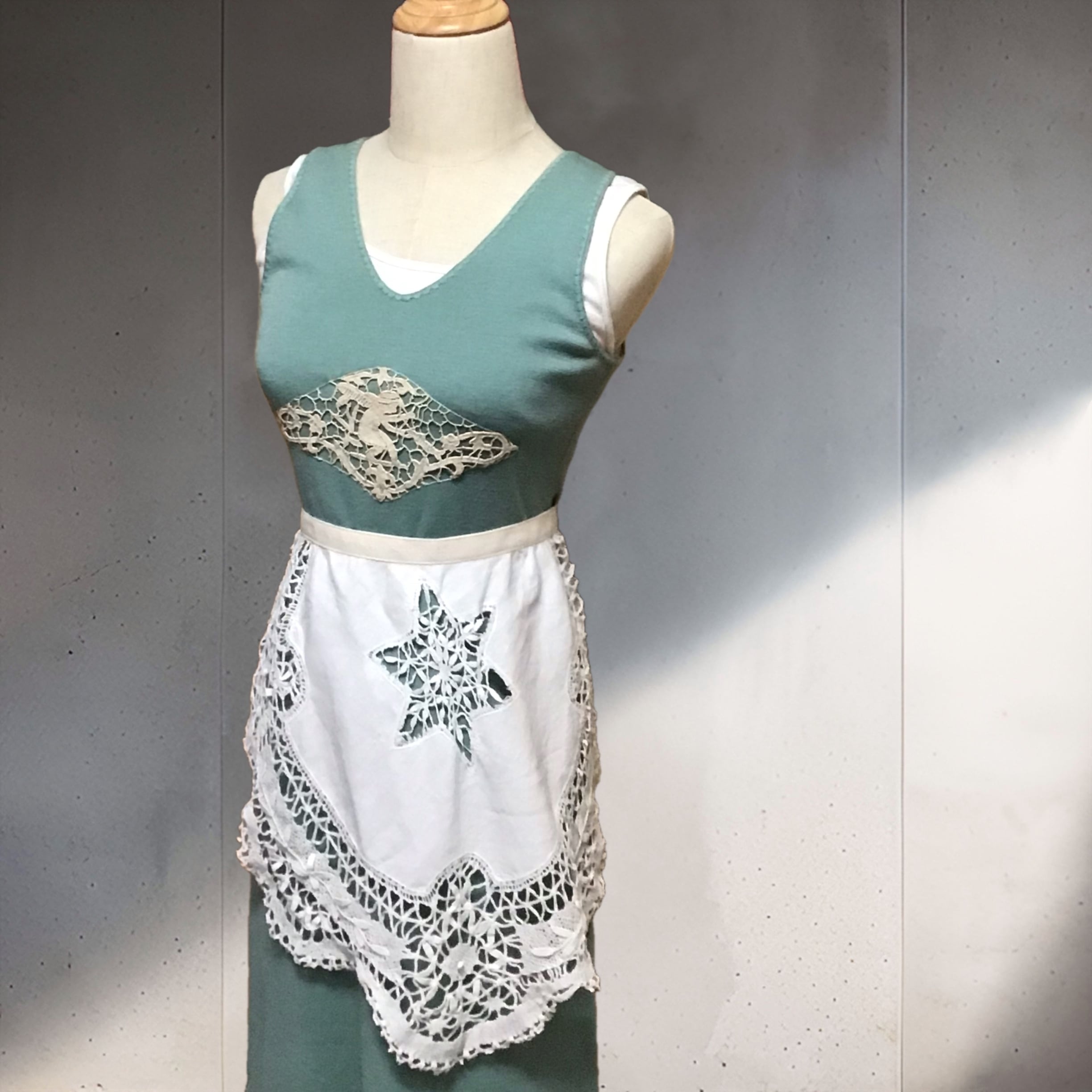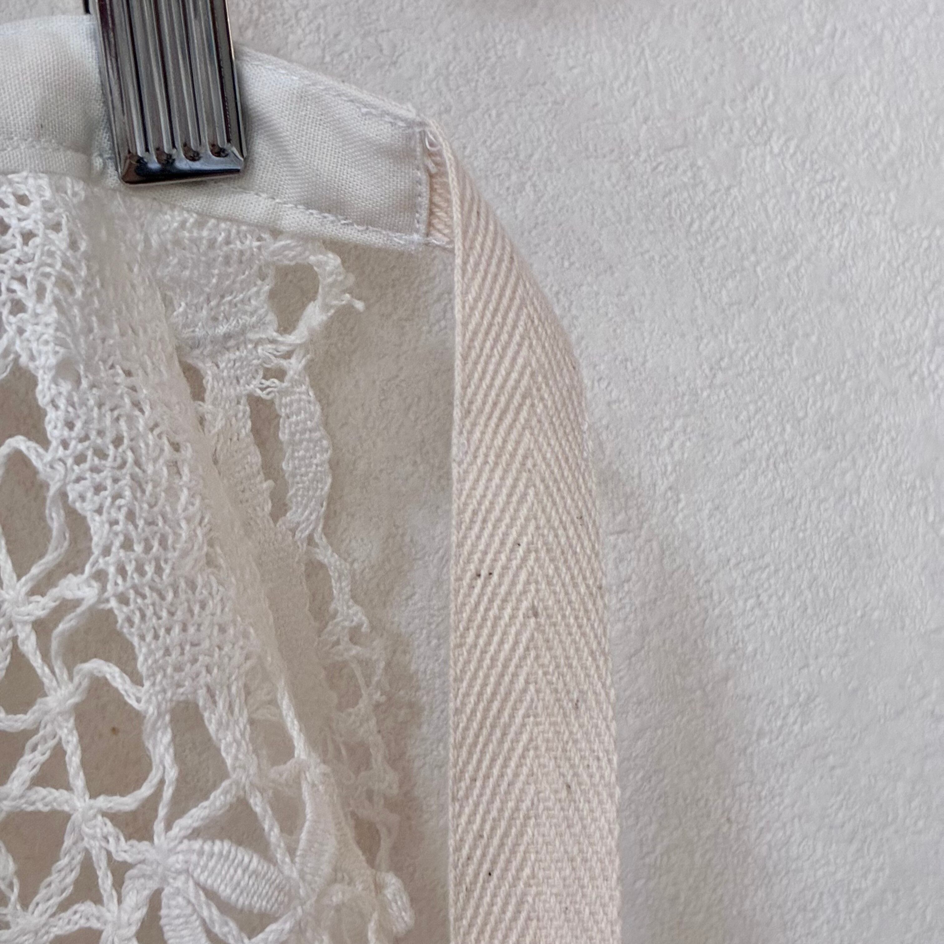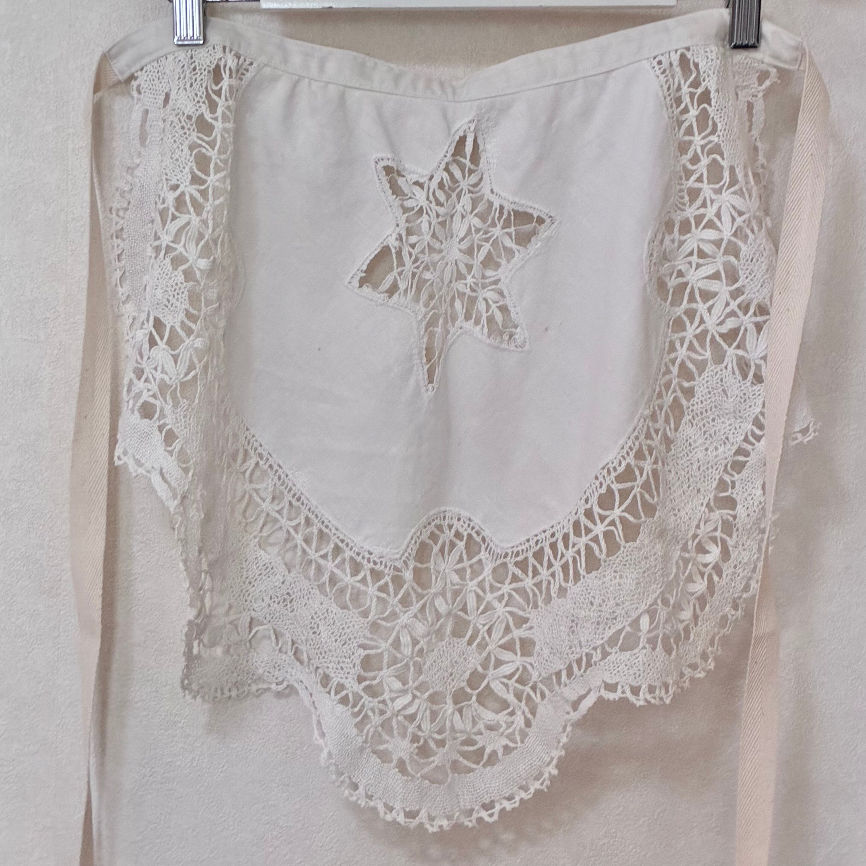 大きなスカラップデザインのアンティークレースのエプロン、腰や胸に巻いてお使い頂けます。レースの隙間からTシャツのプリントを覗かせてたり、ボトムの腰に巻いてジャケットなどを羽織ってレースを裾からチラ見せも可愛いです!オールシーズン使えるおすすめのお品です♡