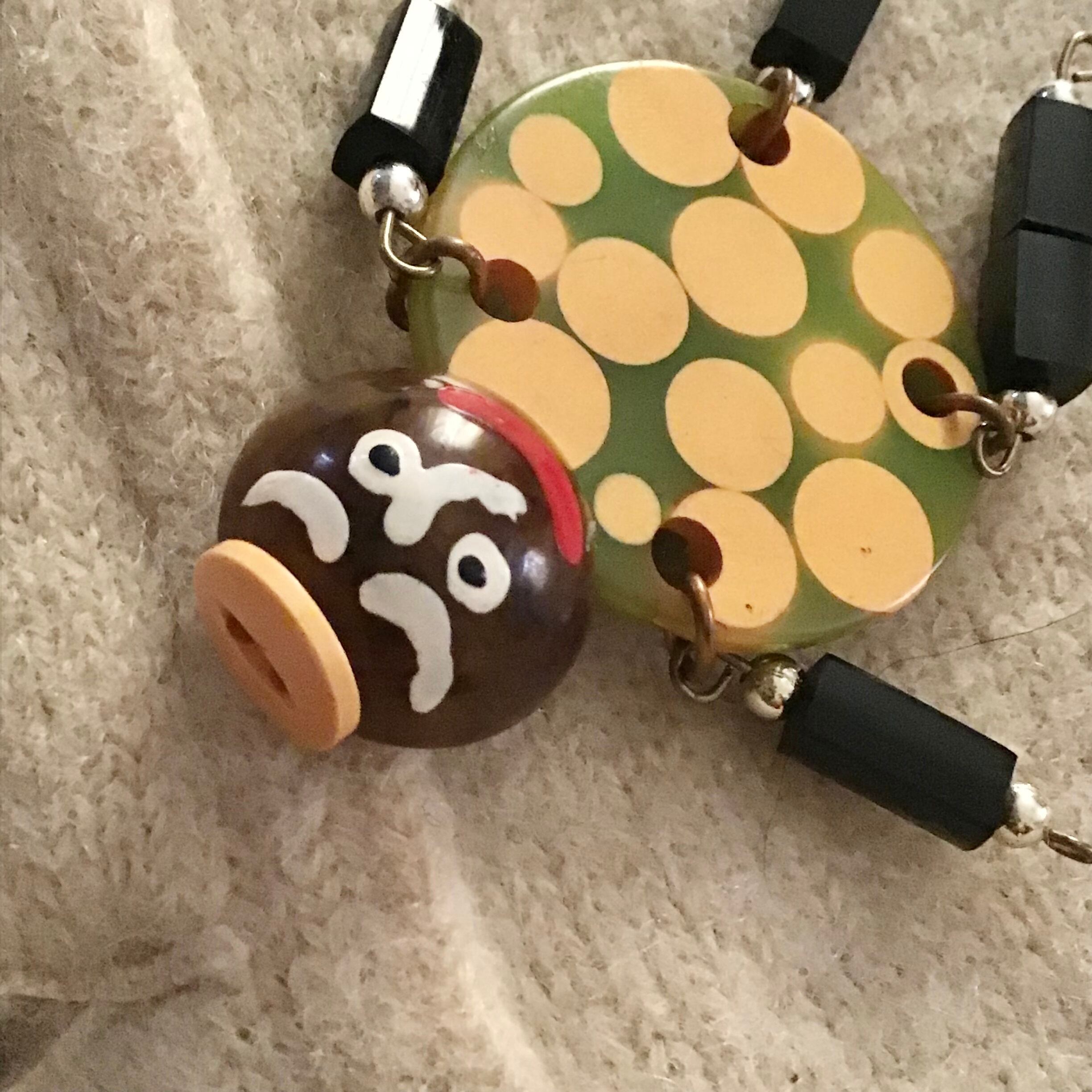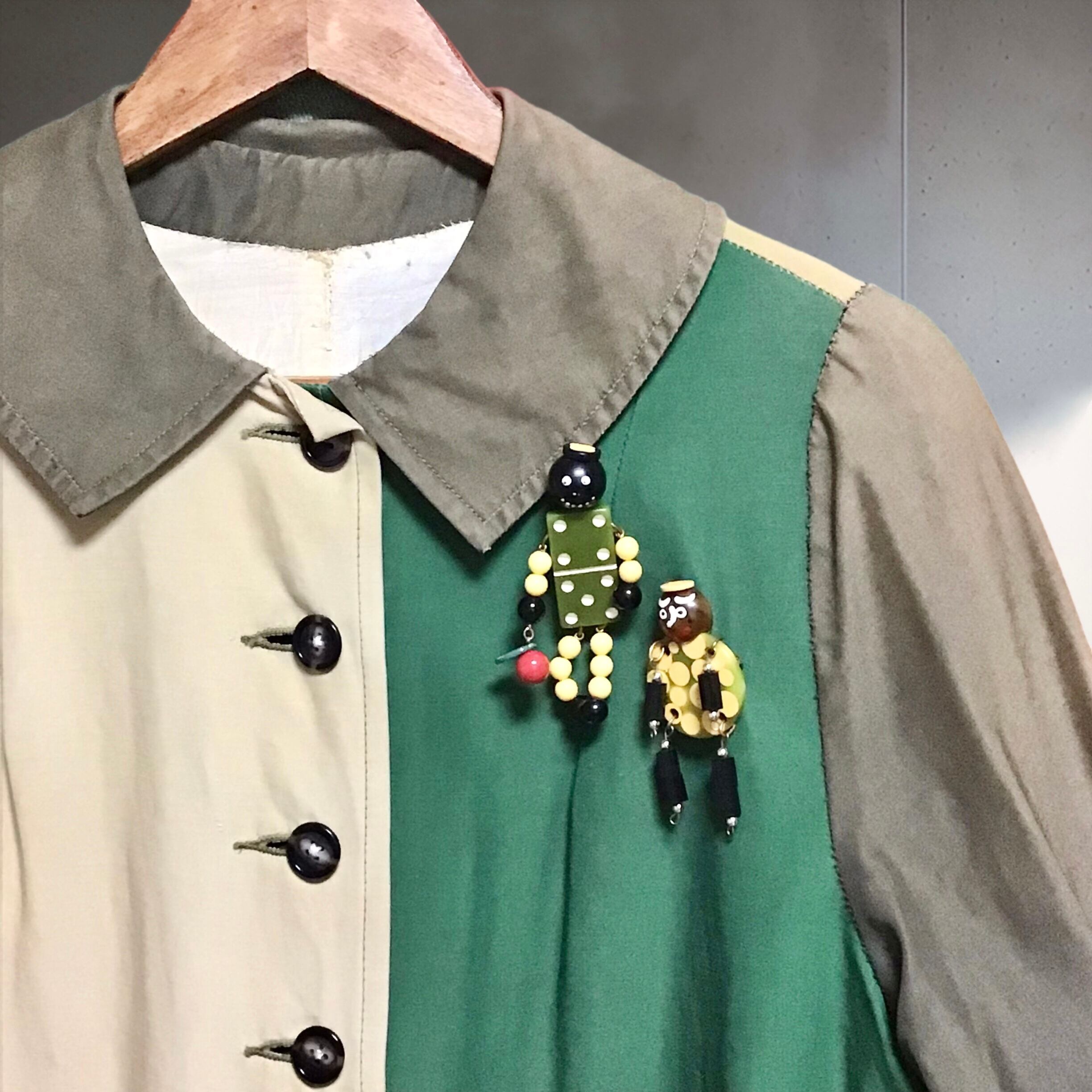 1950年代、ベークライトパーツのブローチ。不思議な柄のパーツに揺れる手足、手描きのゆるい表情がなんとも魅力的なお品です♡意外とどんなカラーにも馴染む色使いなのもポイントで、丸いデザインを活かして缶バッジと合わせても◎