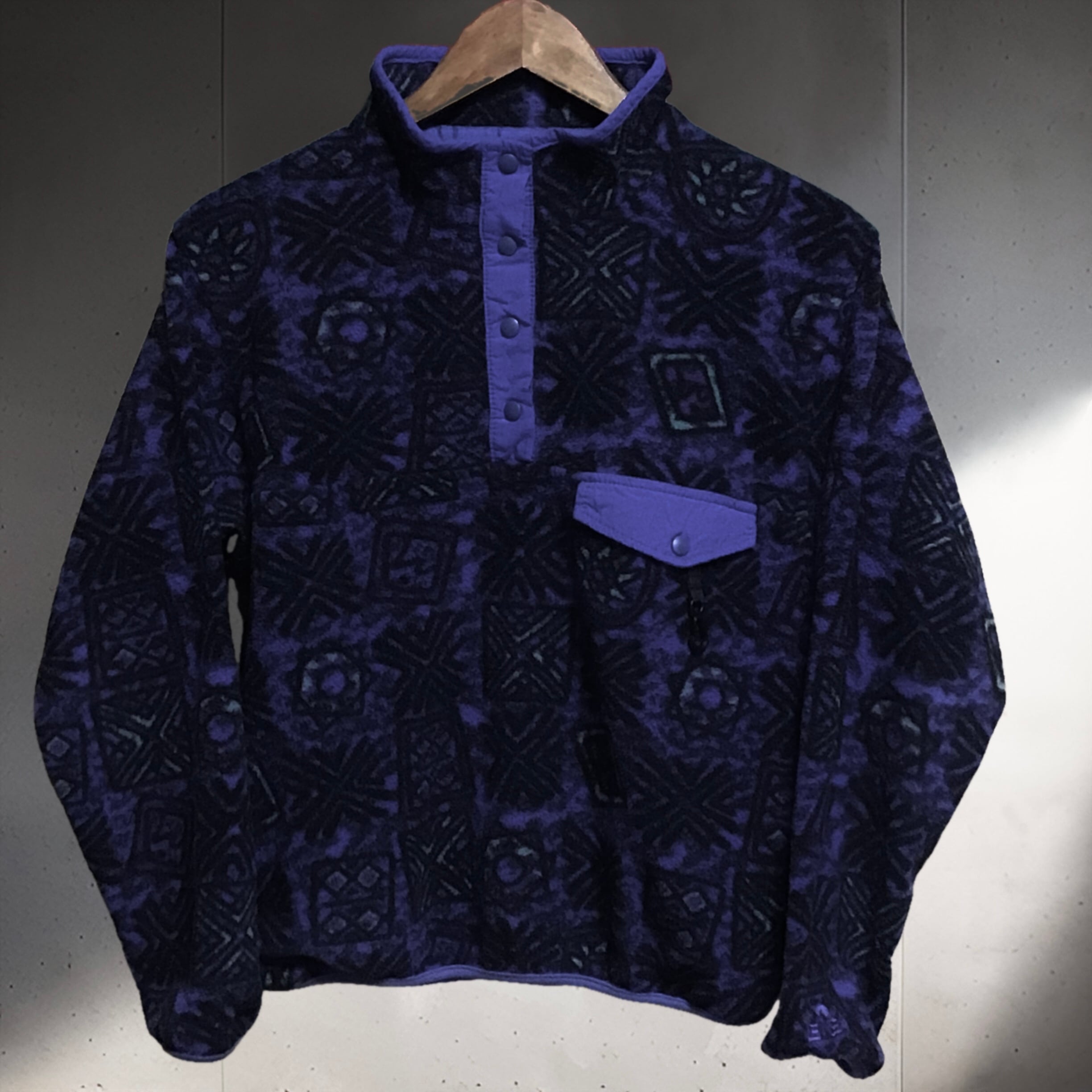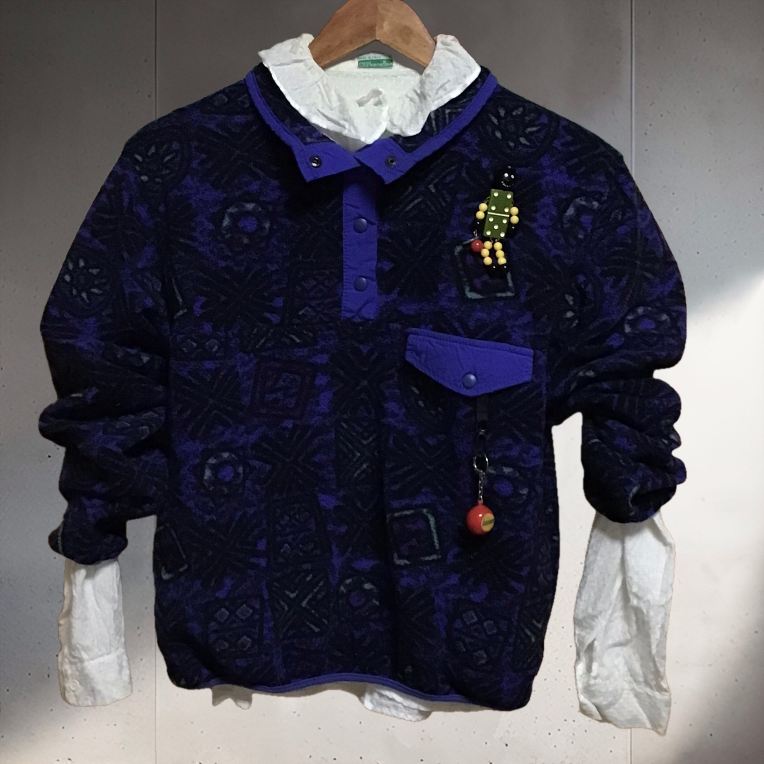 EMSのフリース総柄スナップT。薄手でインナーとしても使いやすく、落ち着いたトーンの柄が大人な雰囲気で良いです◎チノパンやショーツなどリラックス感のあるボトムや、スカートに合わせても可愛いです♡