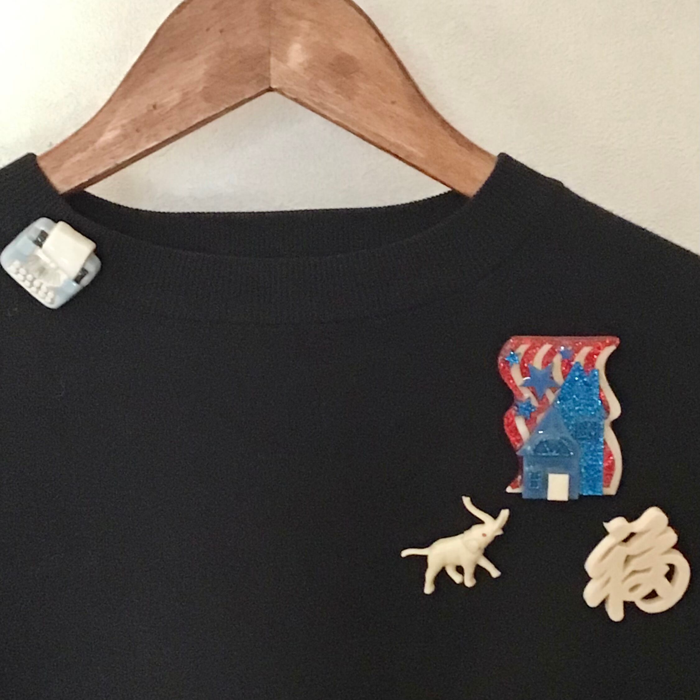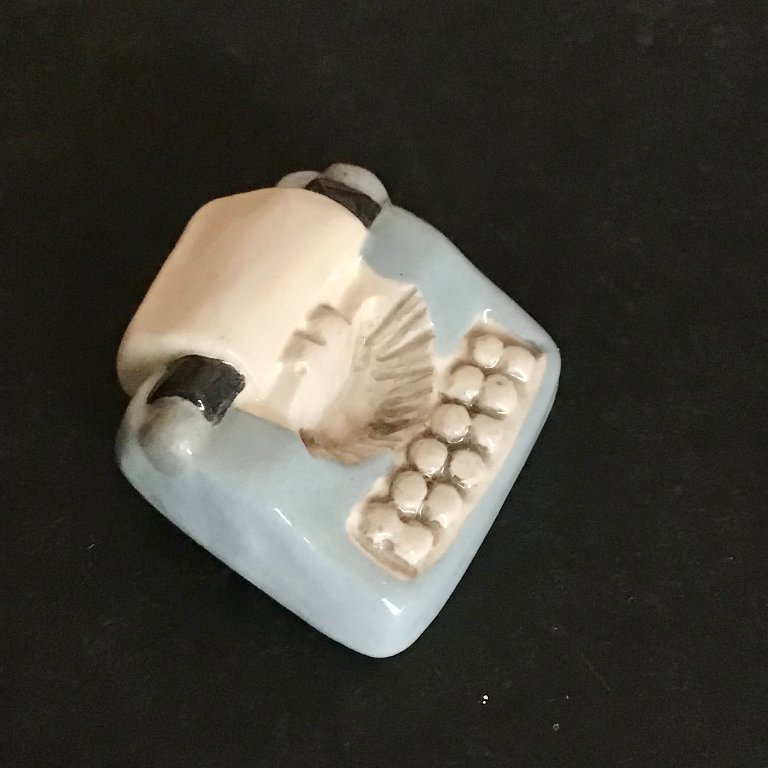 陶器のハンドメイドブローチ、コロンとしたタイプライターのデザインがユニークで、ヴィンテージならではの楽しさを感じさせてくれます♡そして意外にも水色×白のカラーリングが合わせやすく、襟元にちょこんとつけたり、缶バッジなどと合わせたりと楽しめそうです◎