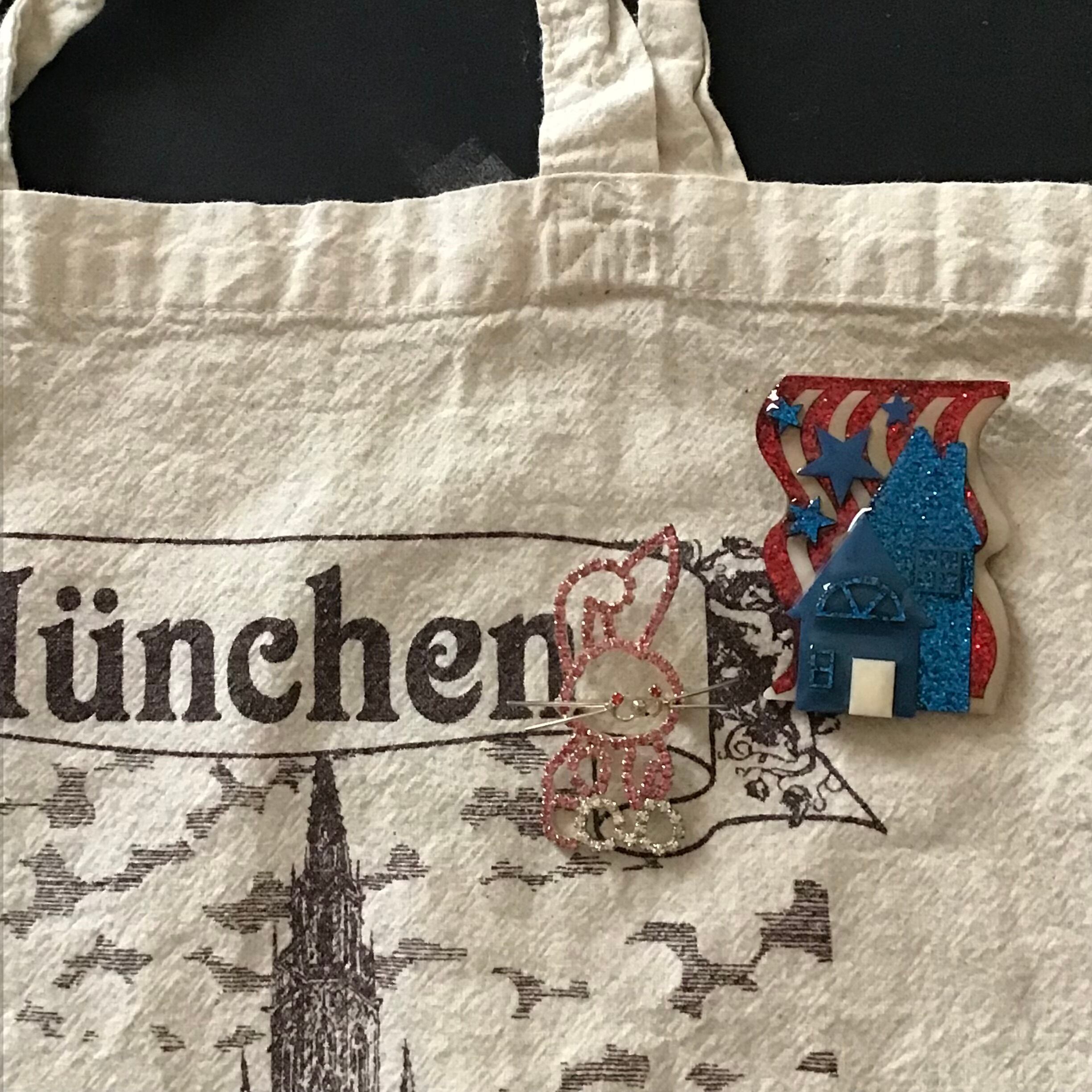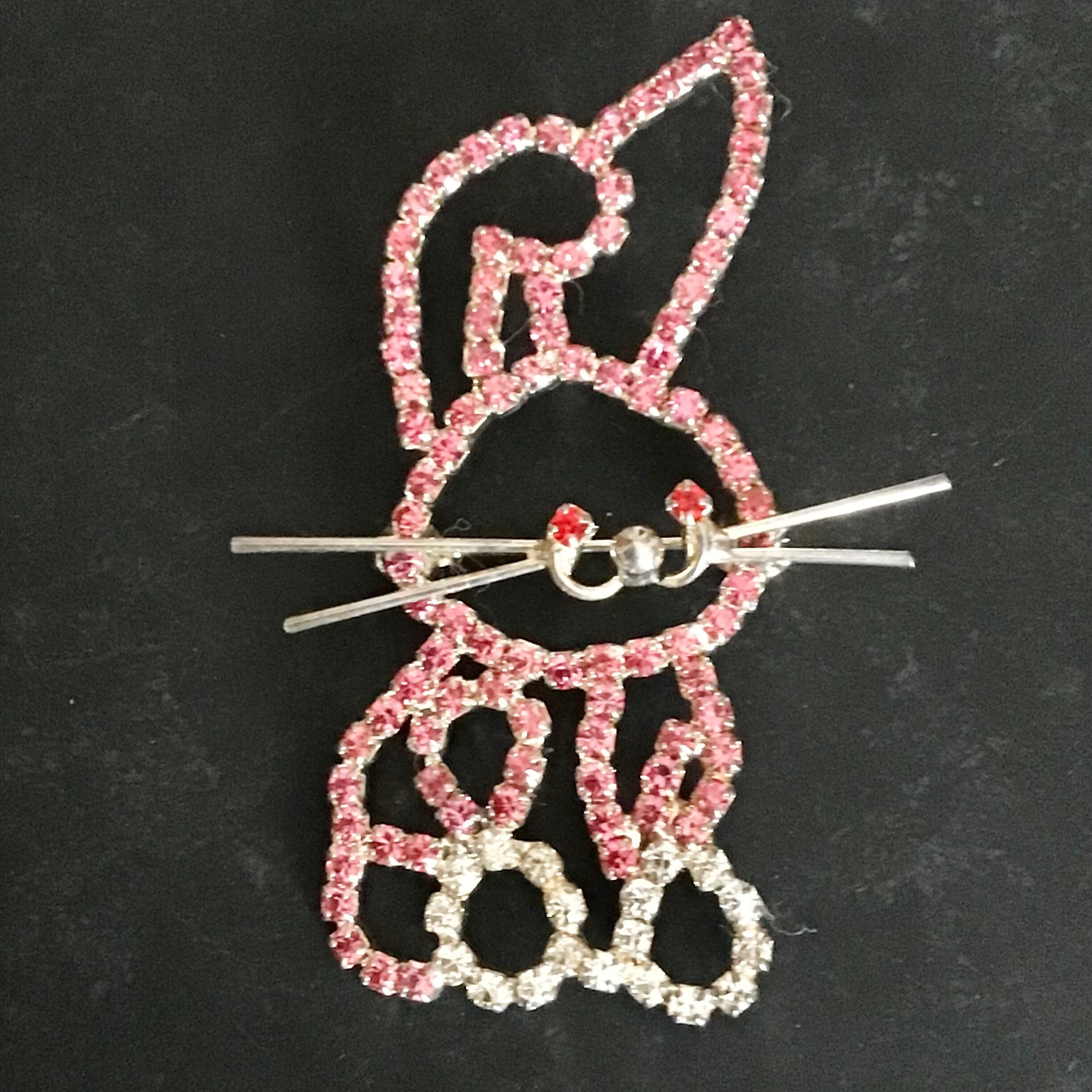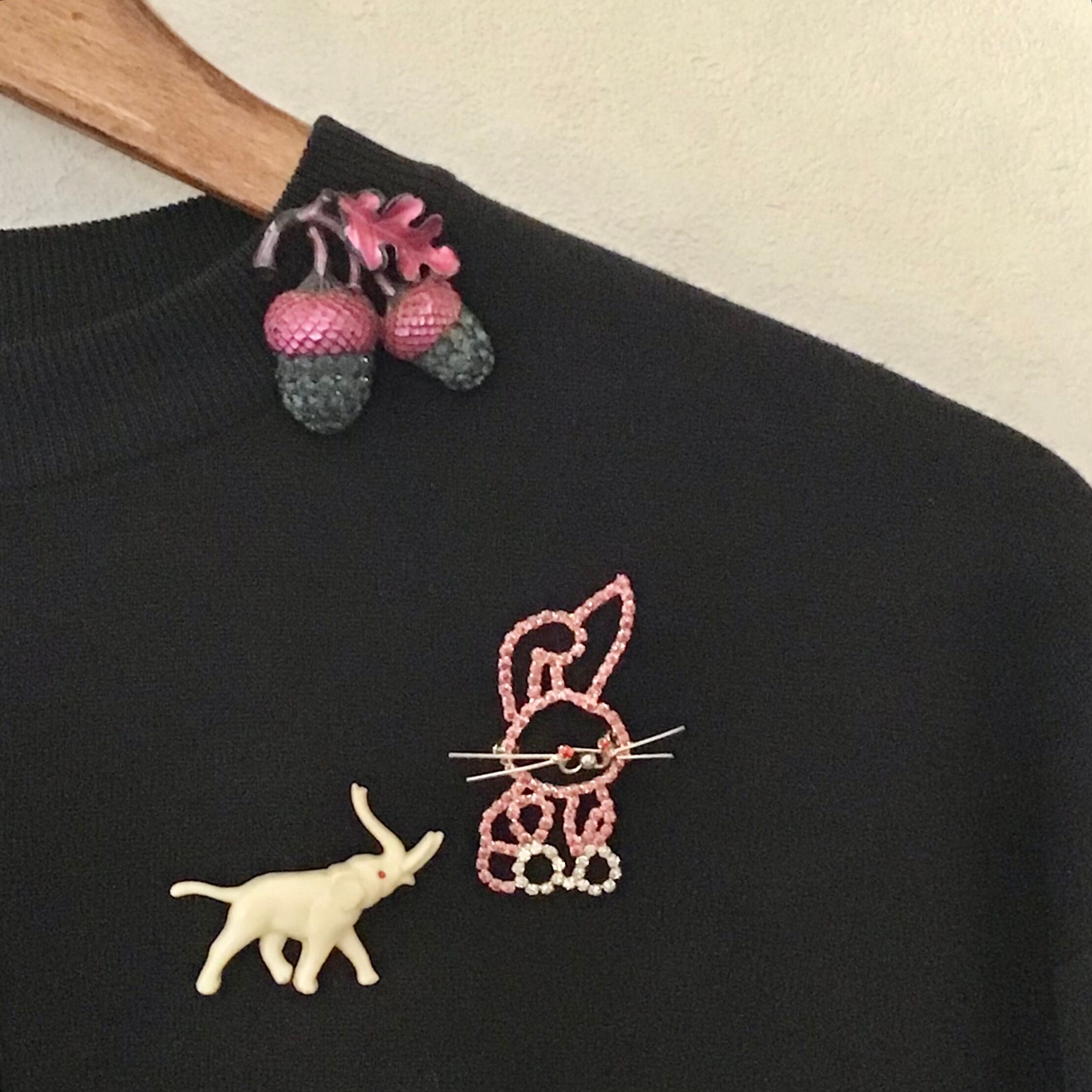 うさぎのラインストーンブローチ、赤い目とひげがチャームポイントの愛くるしいお品です♡いろいろな動物モチーフを重ねつけしたり、店主はニンジンのブローチを見つけて一緒につけたいと思いました◎