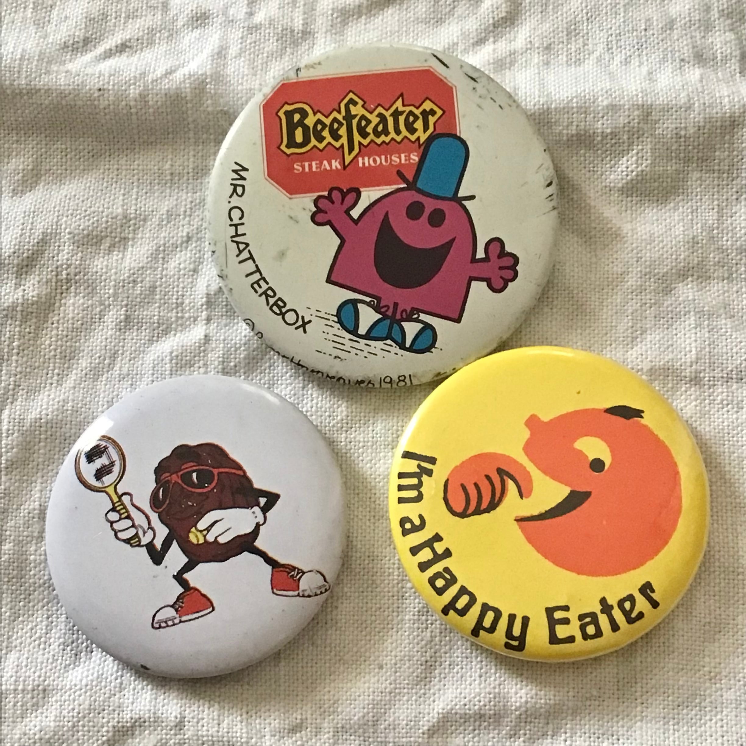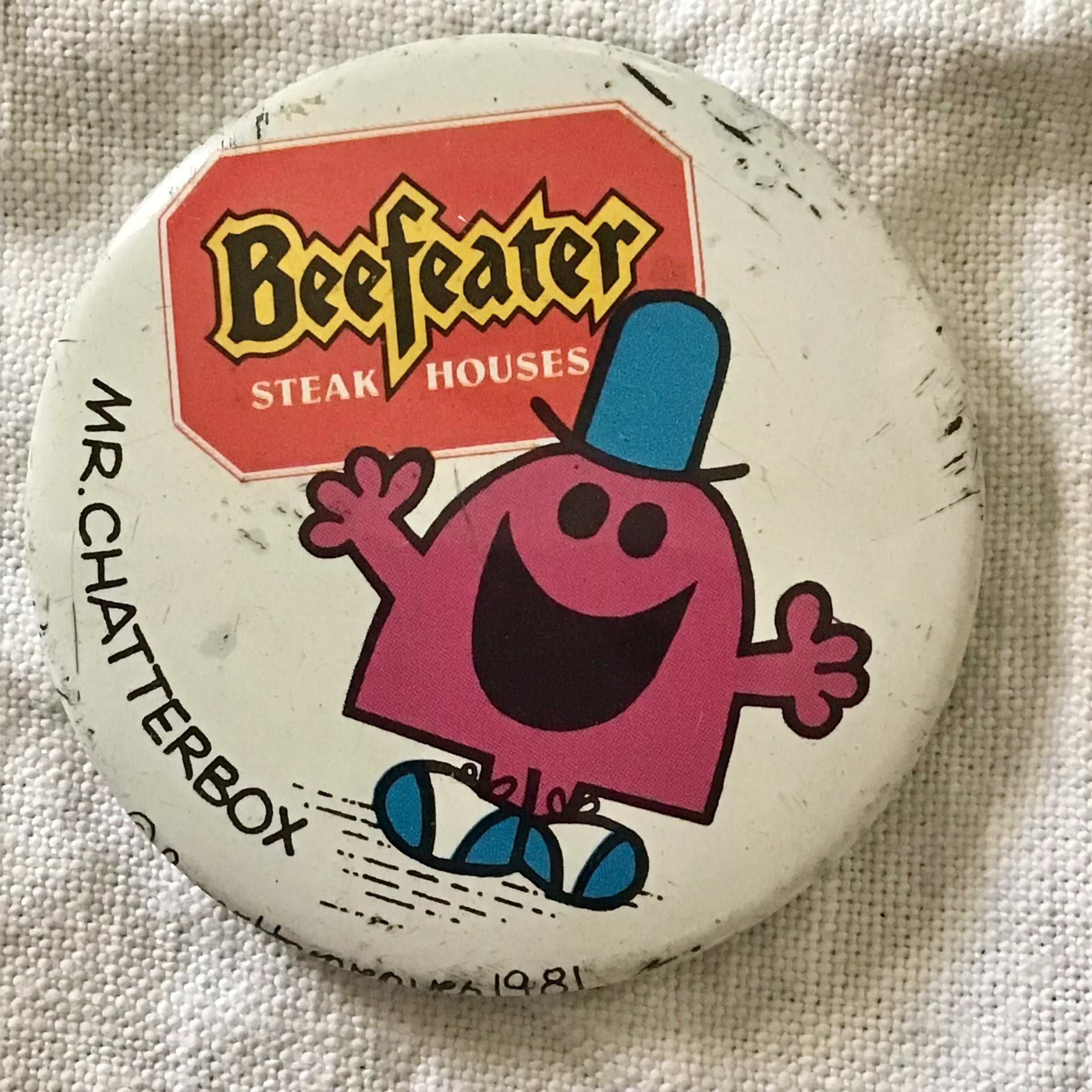 おしゃべりなMr.Chatterboxの絵柄が可愛い缶バッジ。小ぶりなのでいろいろなサイズとの重ねつけや、ちょこんとひとつでも良い感じです◎
