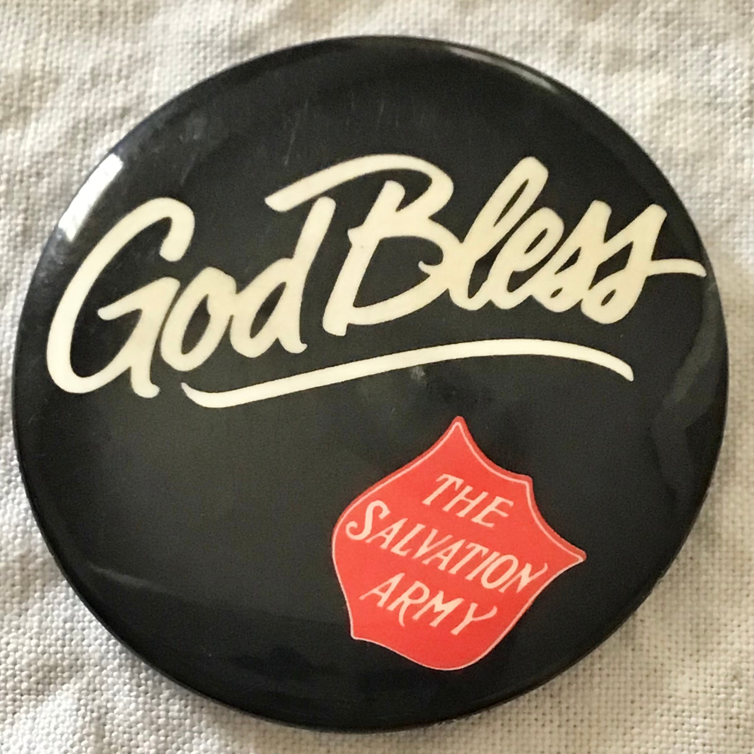 神の御加護がありそうな缶バッジ、シンプルなメッセージがヴィンテージらしく良い雰囲気です♡ひとつでも存在感のあるサイズです。お好みの場所につけてお楽しみください◎