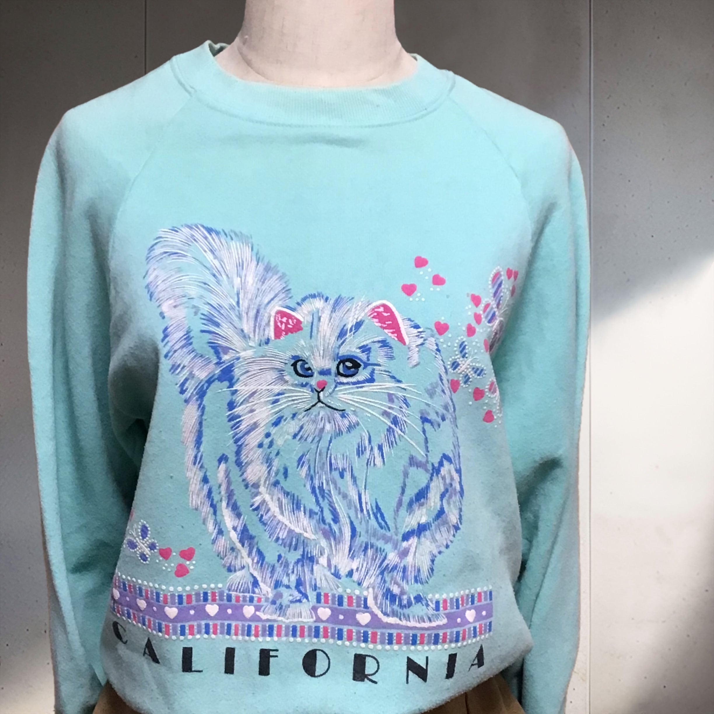 1980年代のプリントスウェット。フサフサの猫ちゃんが可愛いプリントです♡スッキリとしたサイズ感でいろいろなコーディネートに使えそうです◎猫好きさんにもおすすめです◎
