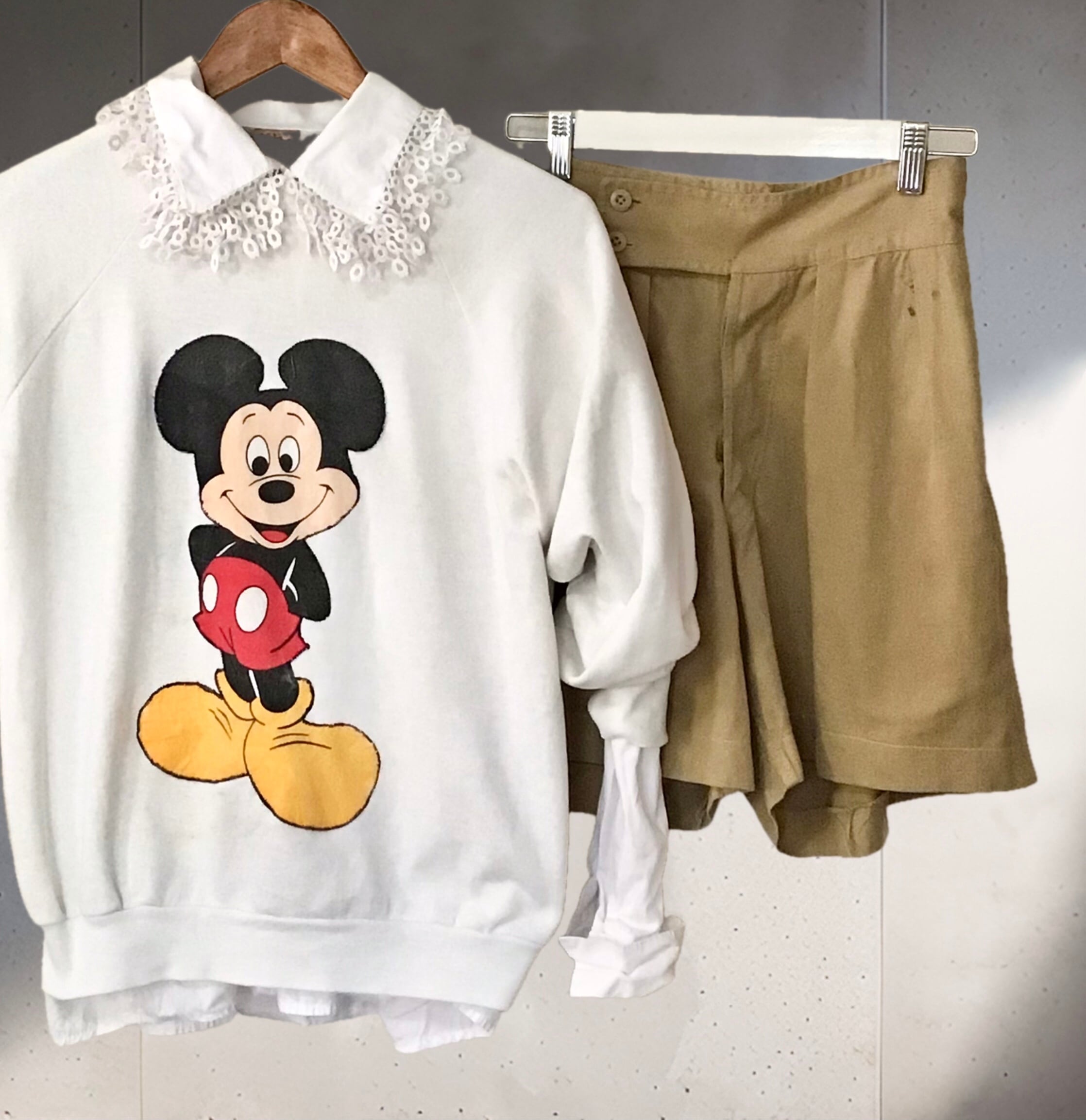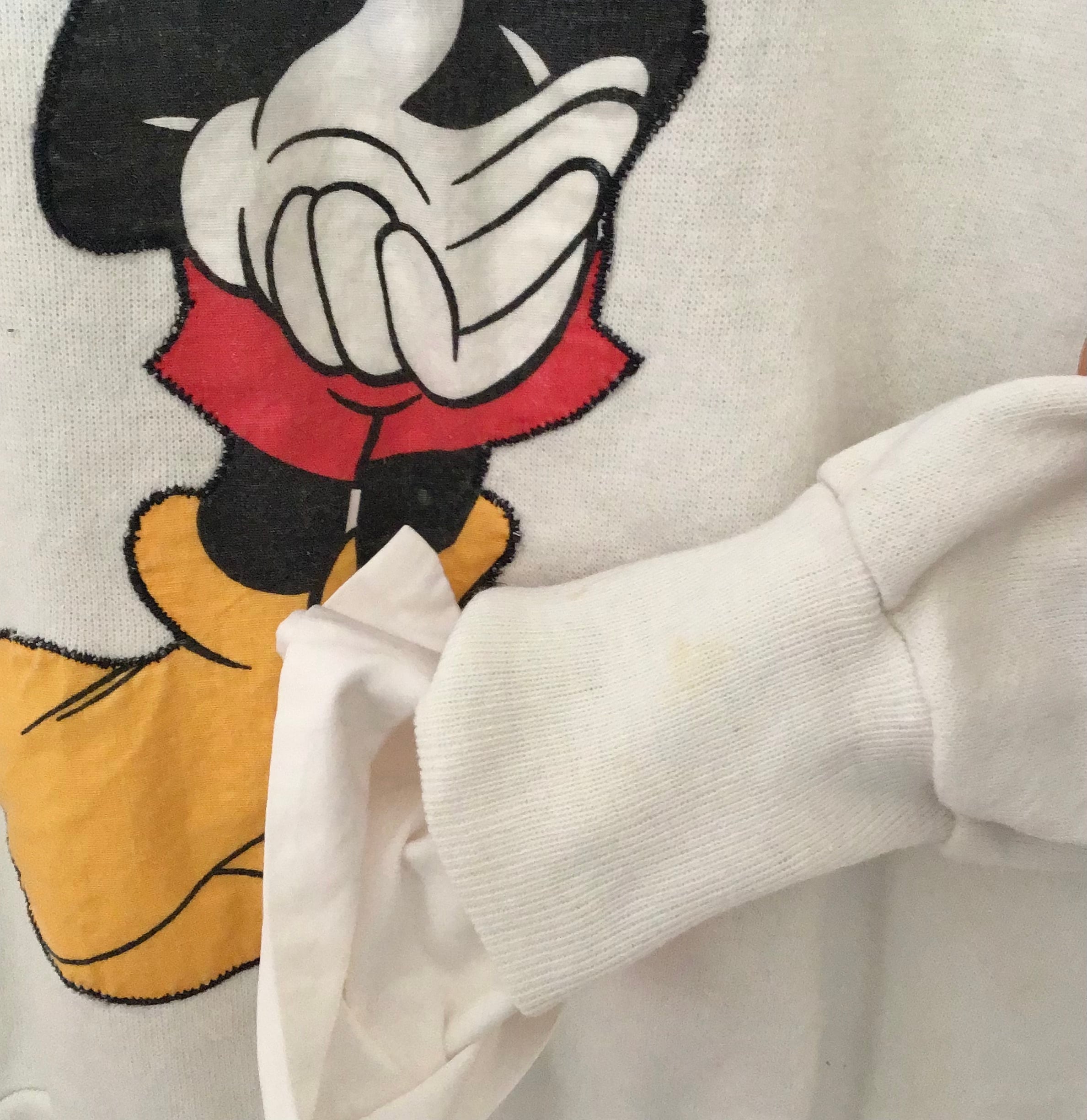 1980年代のスウェット、ミッキーマウスがアップリケされており、背中の手を組むミッキーも可愛いです♡ハンドメイドらしいお作り、経年の汚れはありますが、ヴィンテージらしいとても良い雰囲気です◎