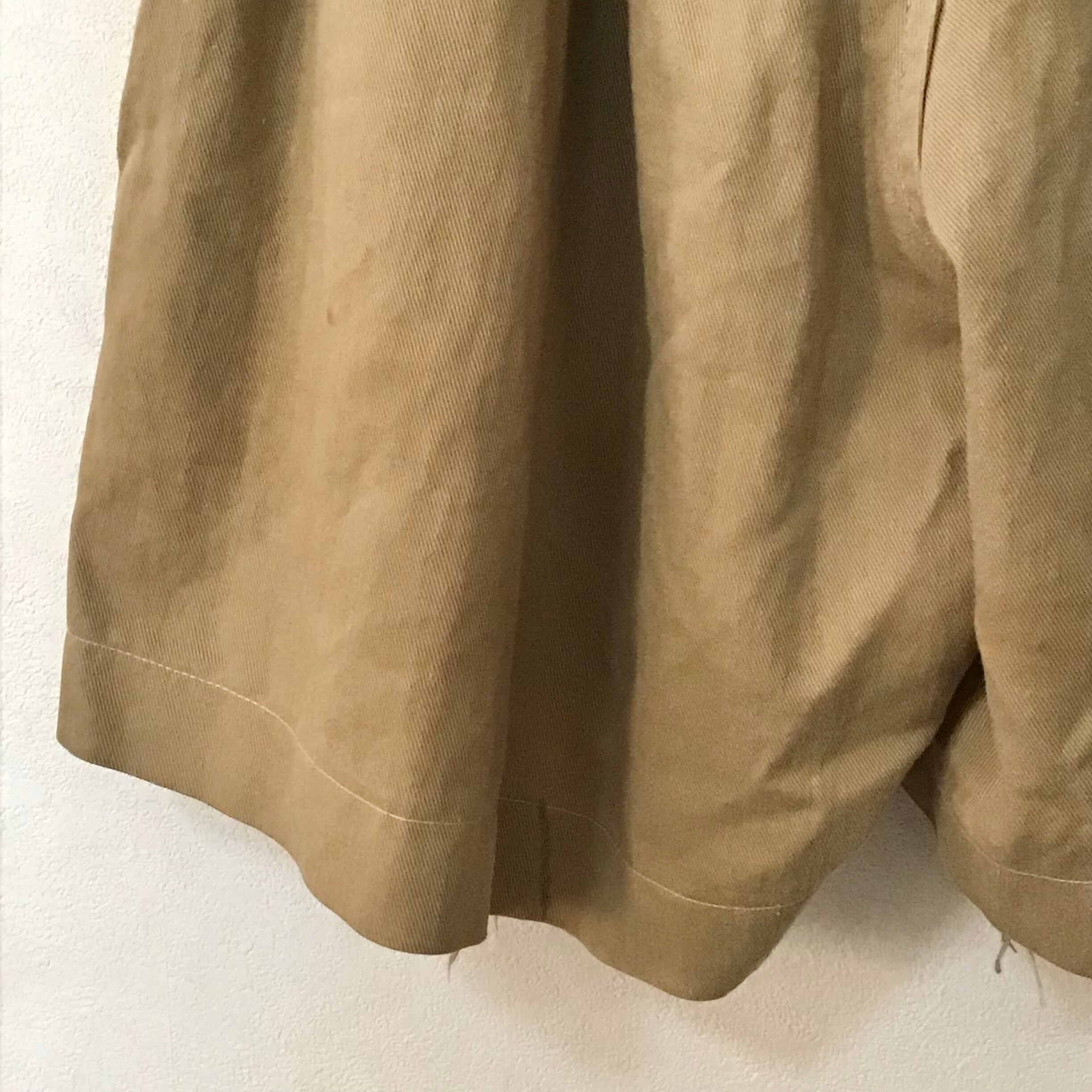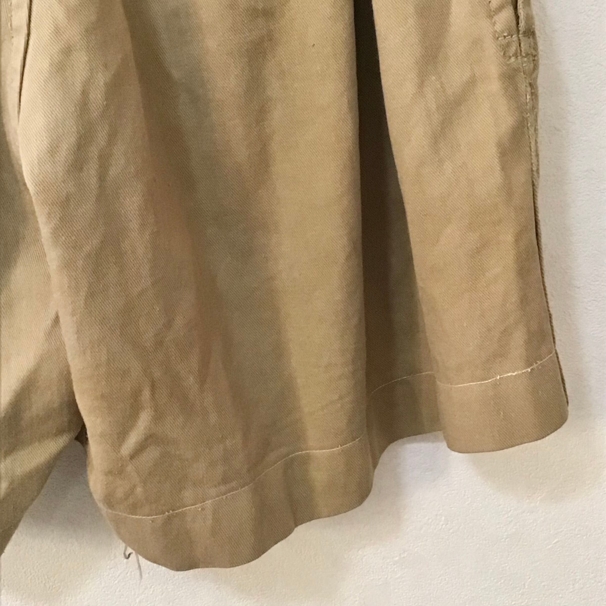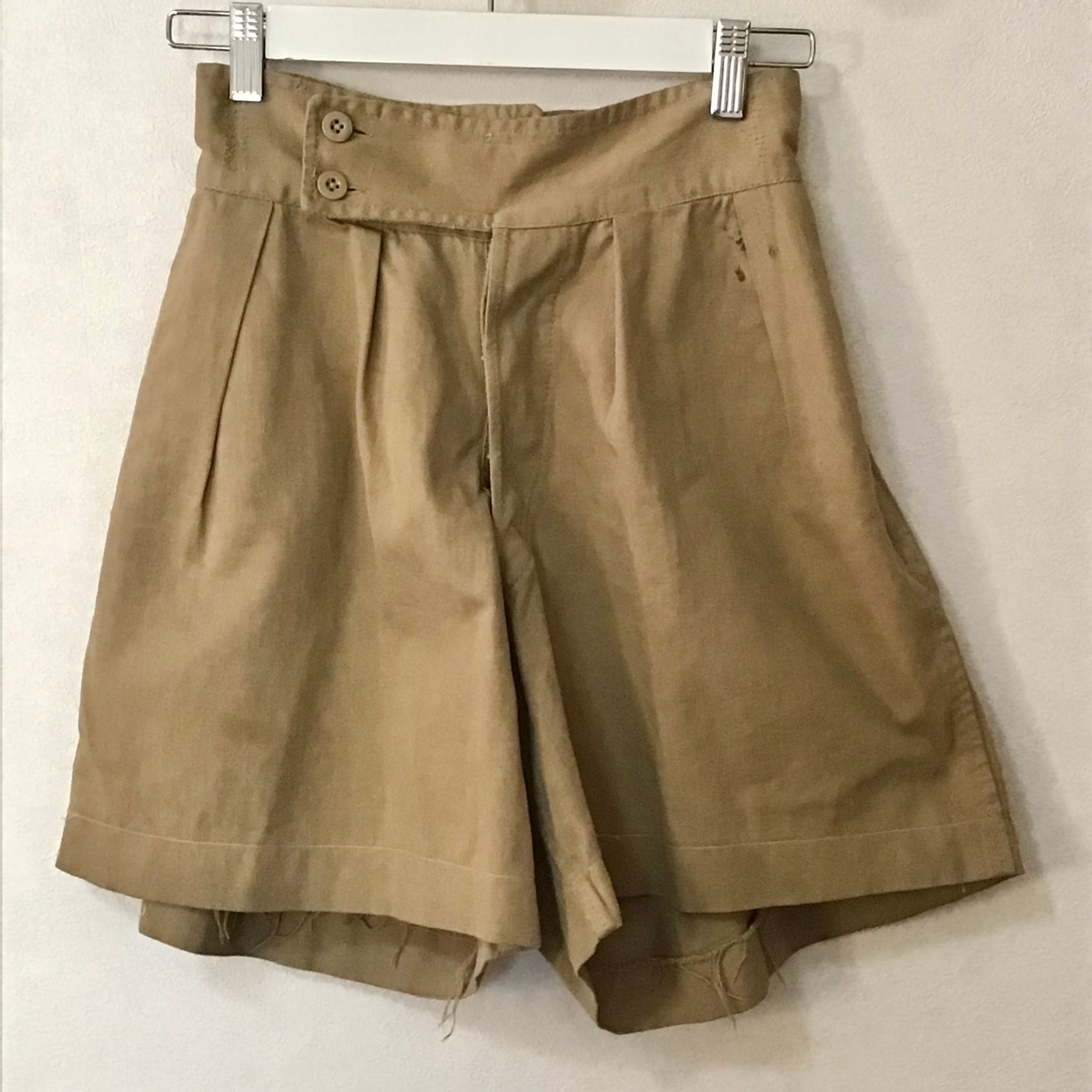 イギリス軍のグルカショーツ、以前の持ち主によりカスタムされています。ウエスト部分はベルトが外されサイズも詰められおり、丈もカットされざっくりと縫われています。ウエストが小さくなっている分ふんわりとしたシルエットになりとても可愛いです。使い込まれてはいますが、生地感もとても良くおすすめです!