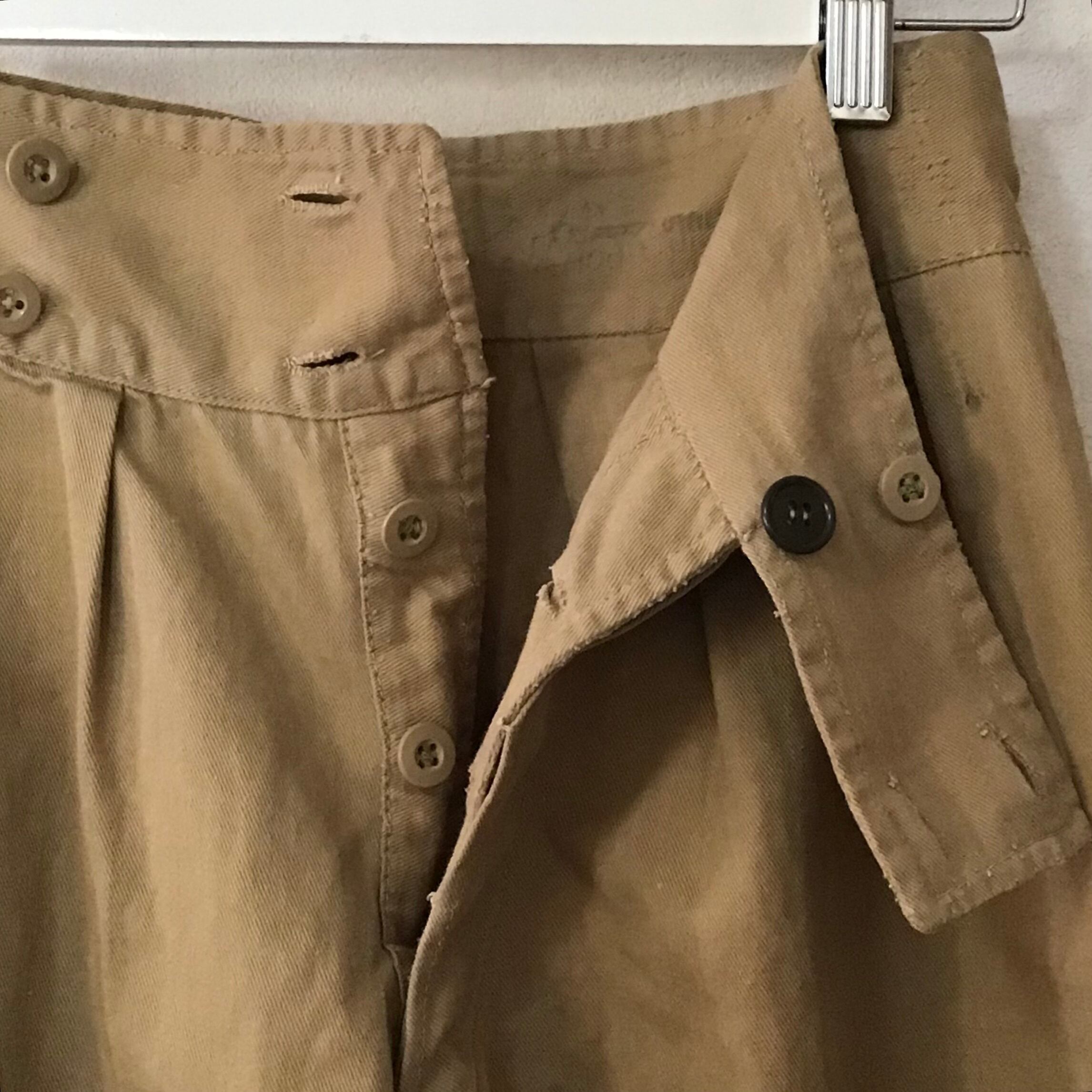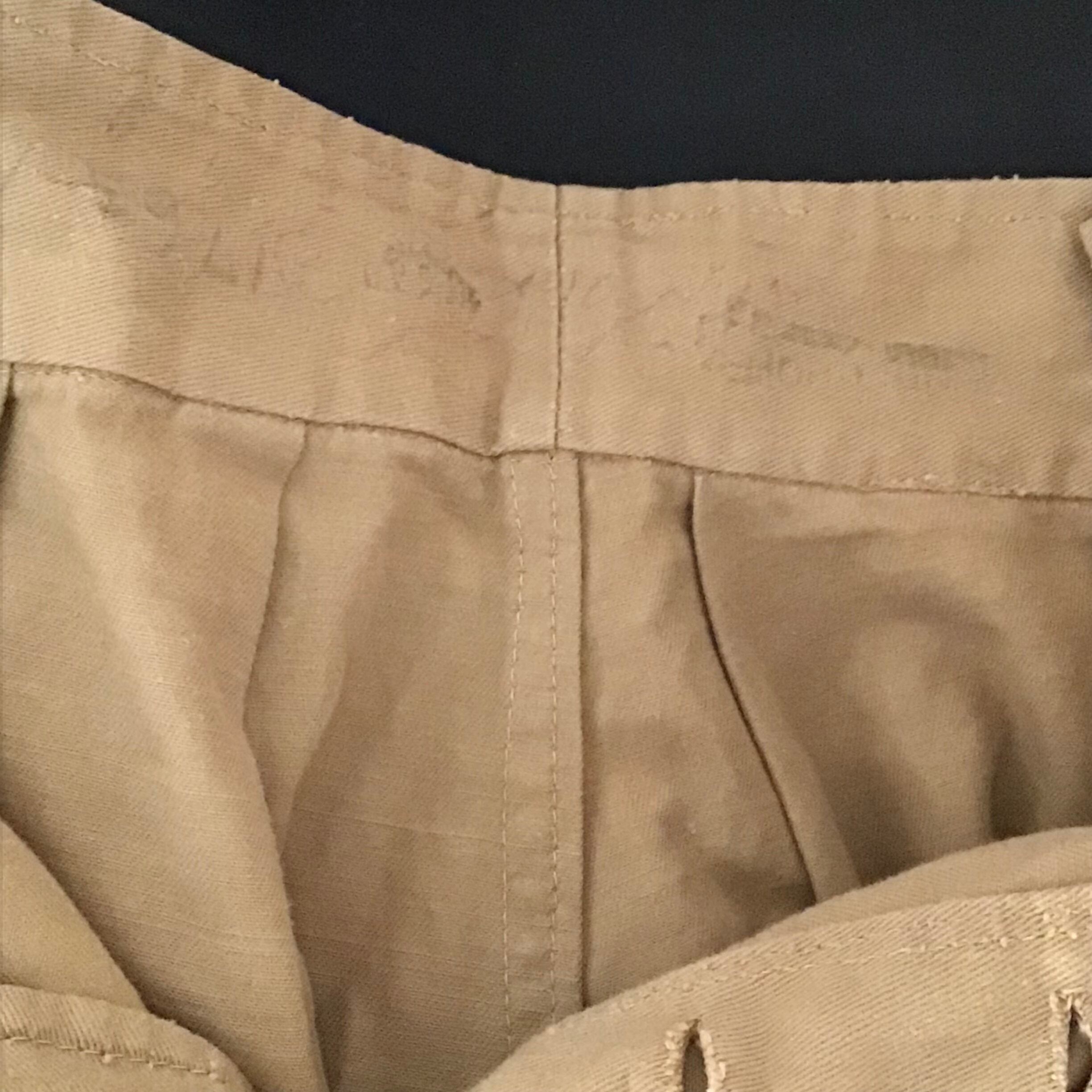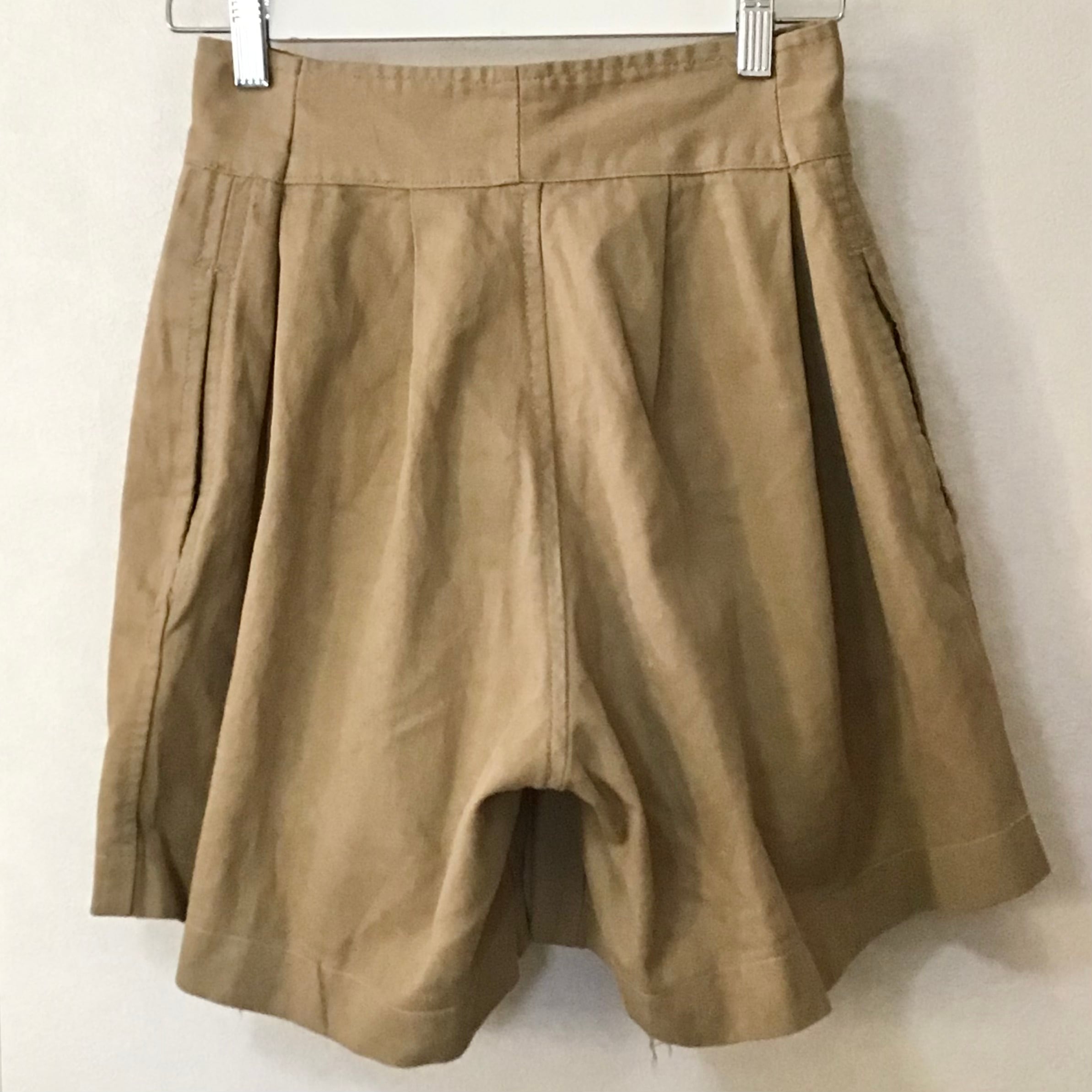 イギリス軍のグルカショーツ、以前の持ち主によりカスタムされています。ウエスト部分はベルトが外されサイズも詰められおり、丈もカットされざっくりと縫われています。ウエストが小さくなっている分ふんわりとしたシルエットになりとても可愛いです。使い込まれてはいますが、生地感もとても良くおすすめです!