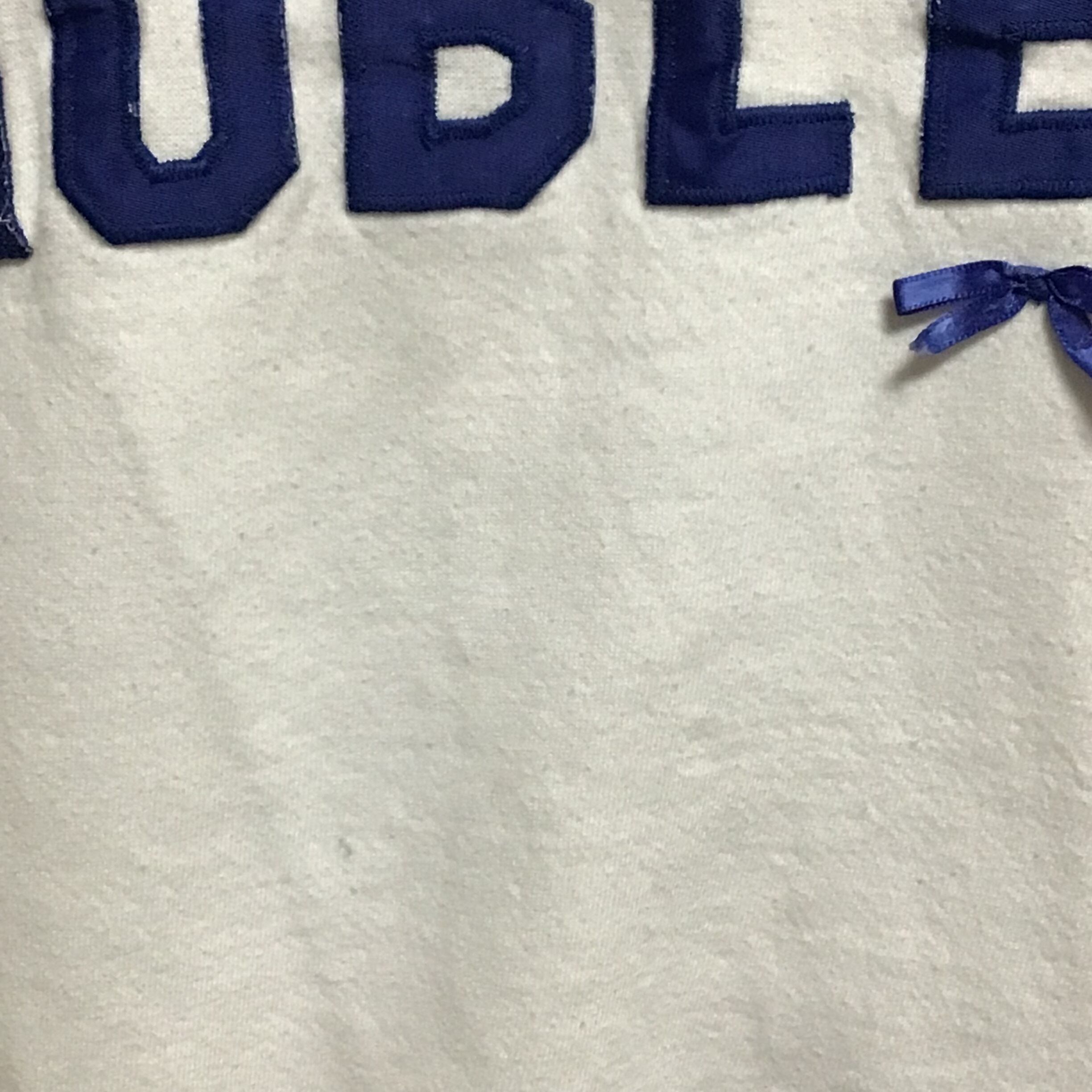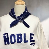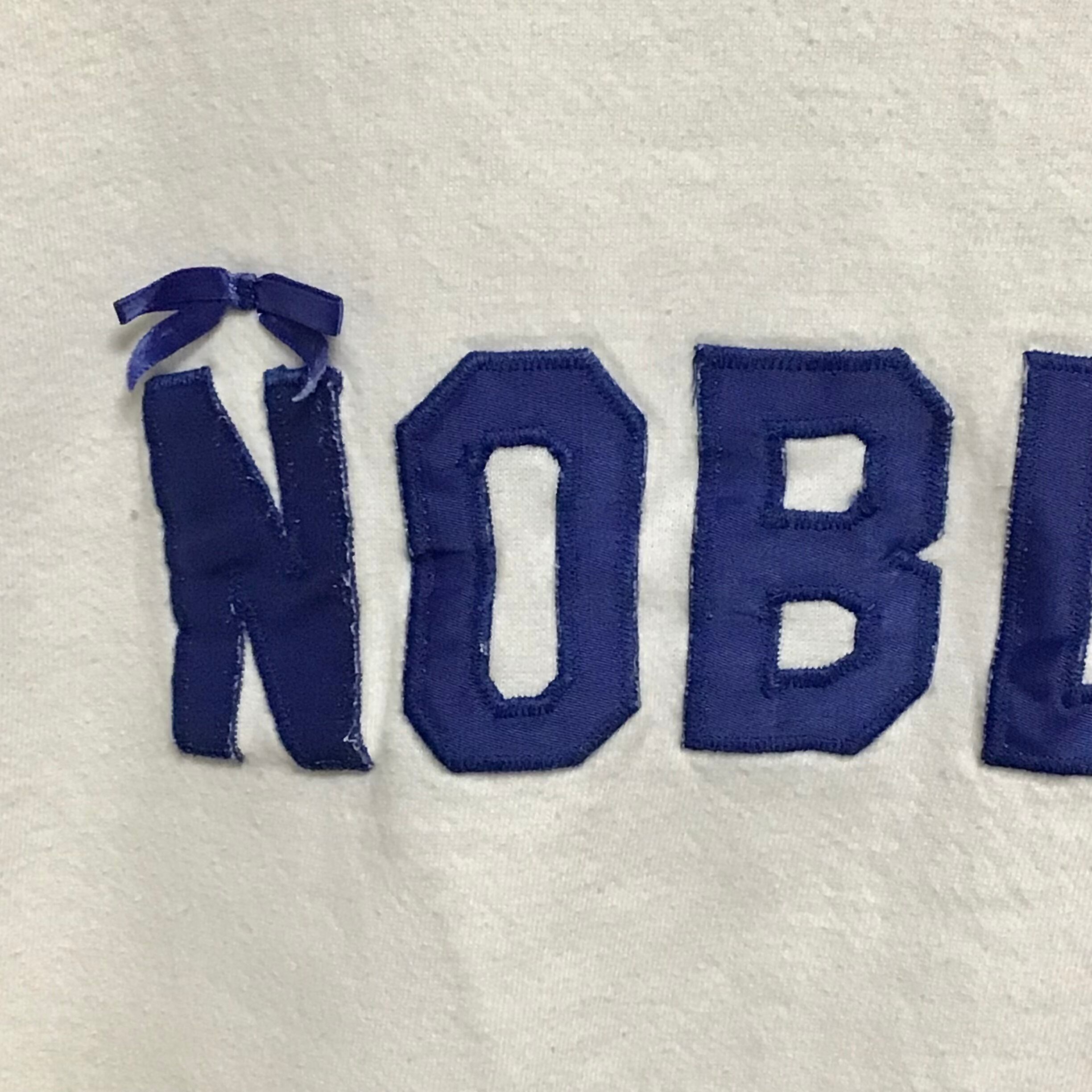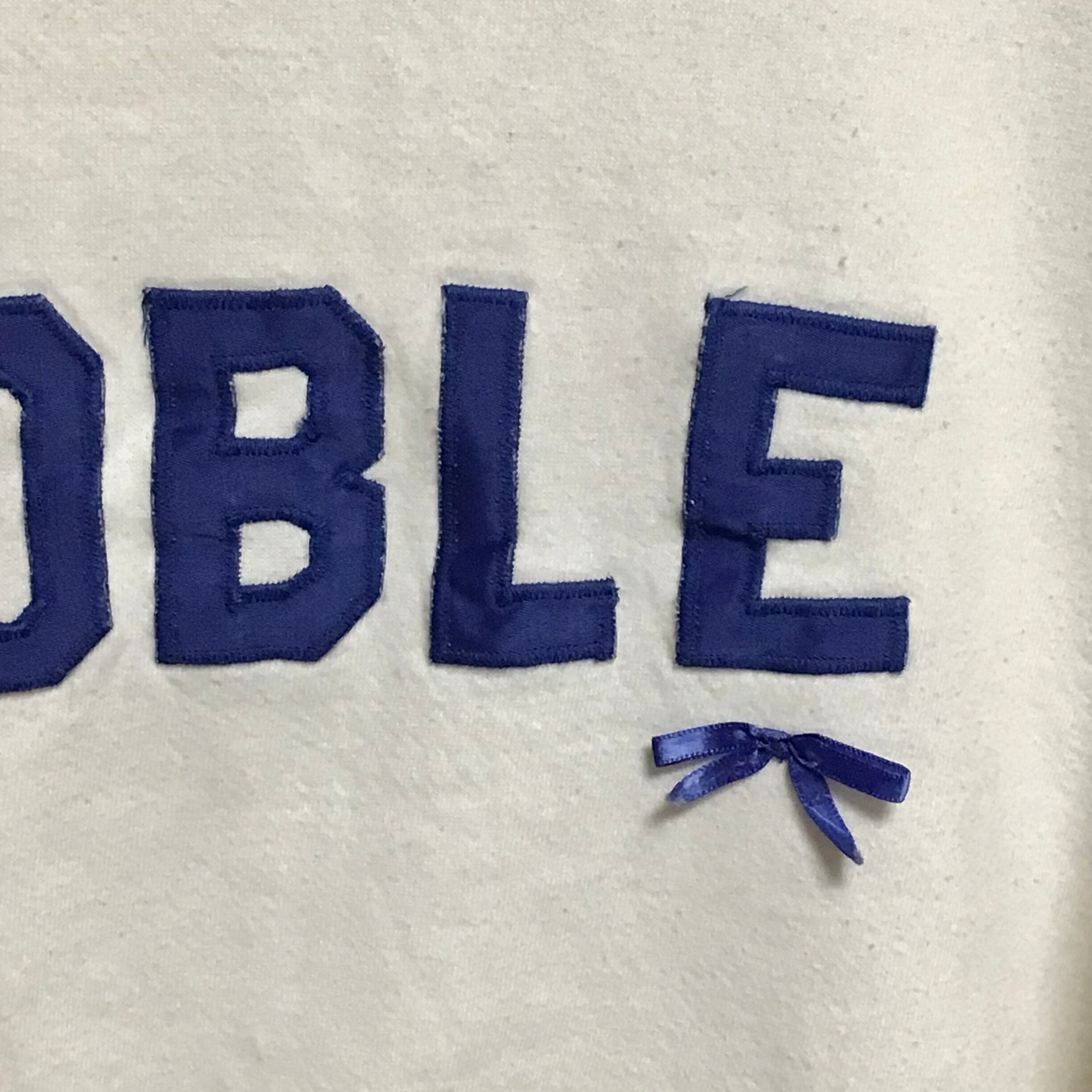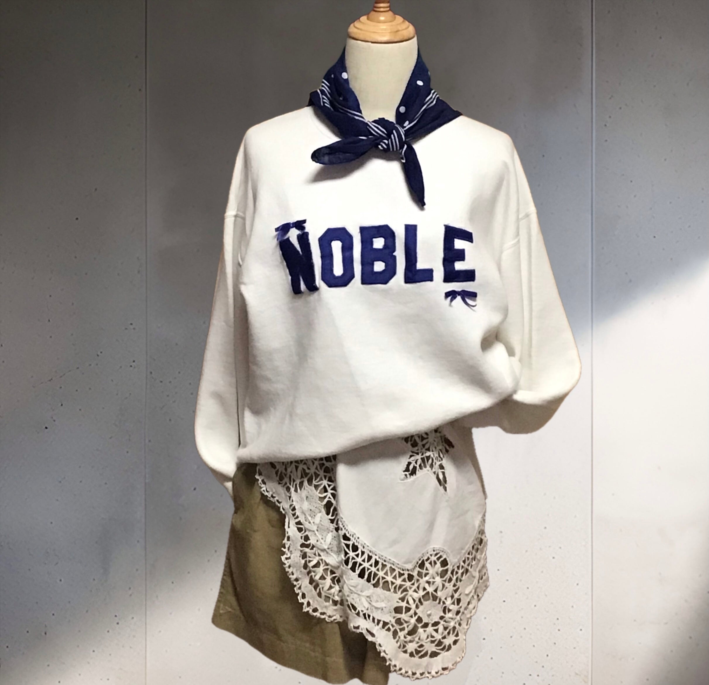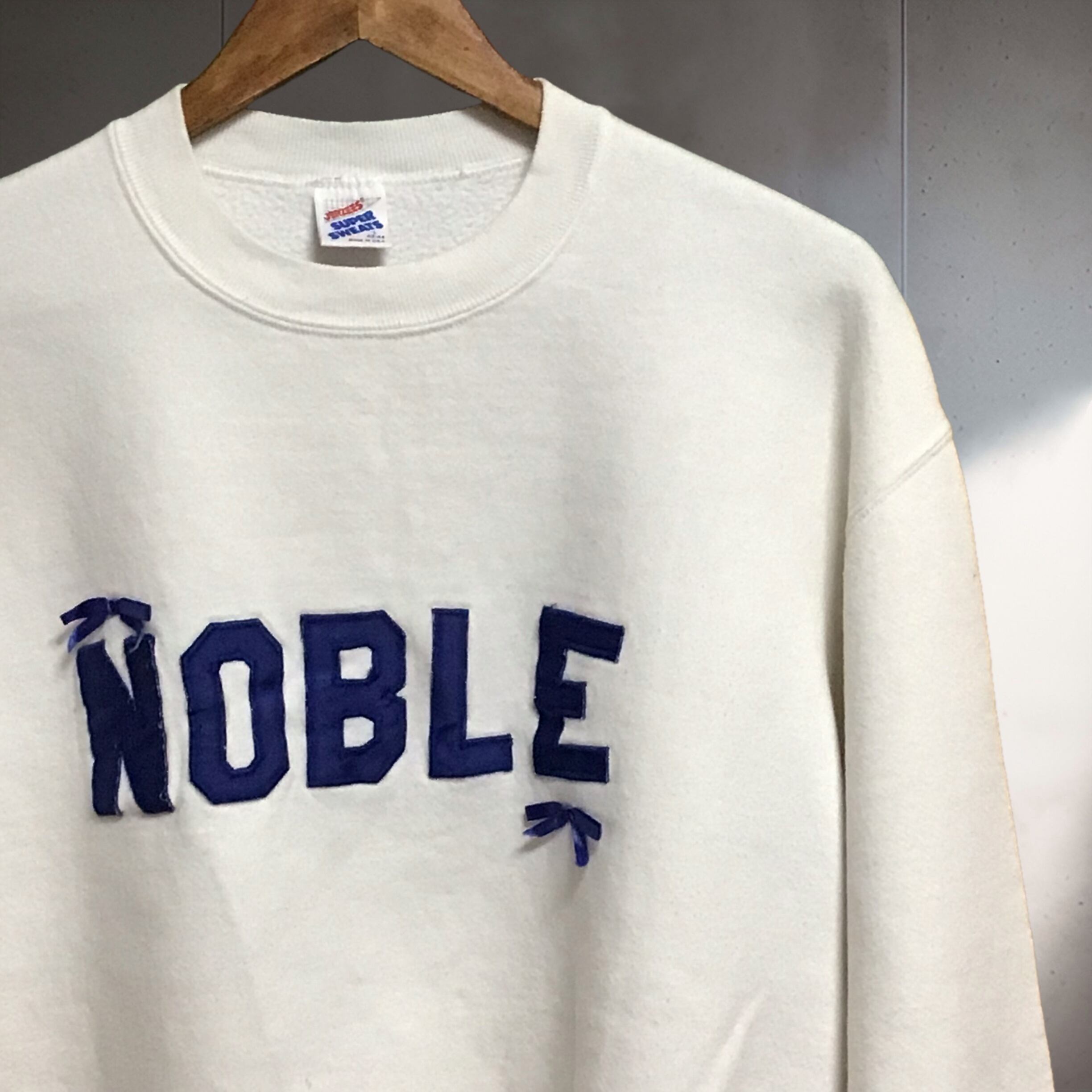1990年代のスウェット、白いボディにネイビーの”NOBLE“アップリケと小さなリボンが爽やかです♡スラックスややショーツにローファーで合わせたり、首元にはバンダナや付け襟も合いそうです◎