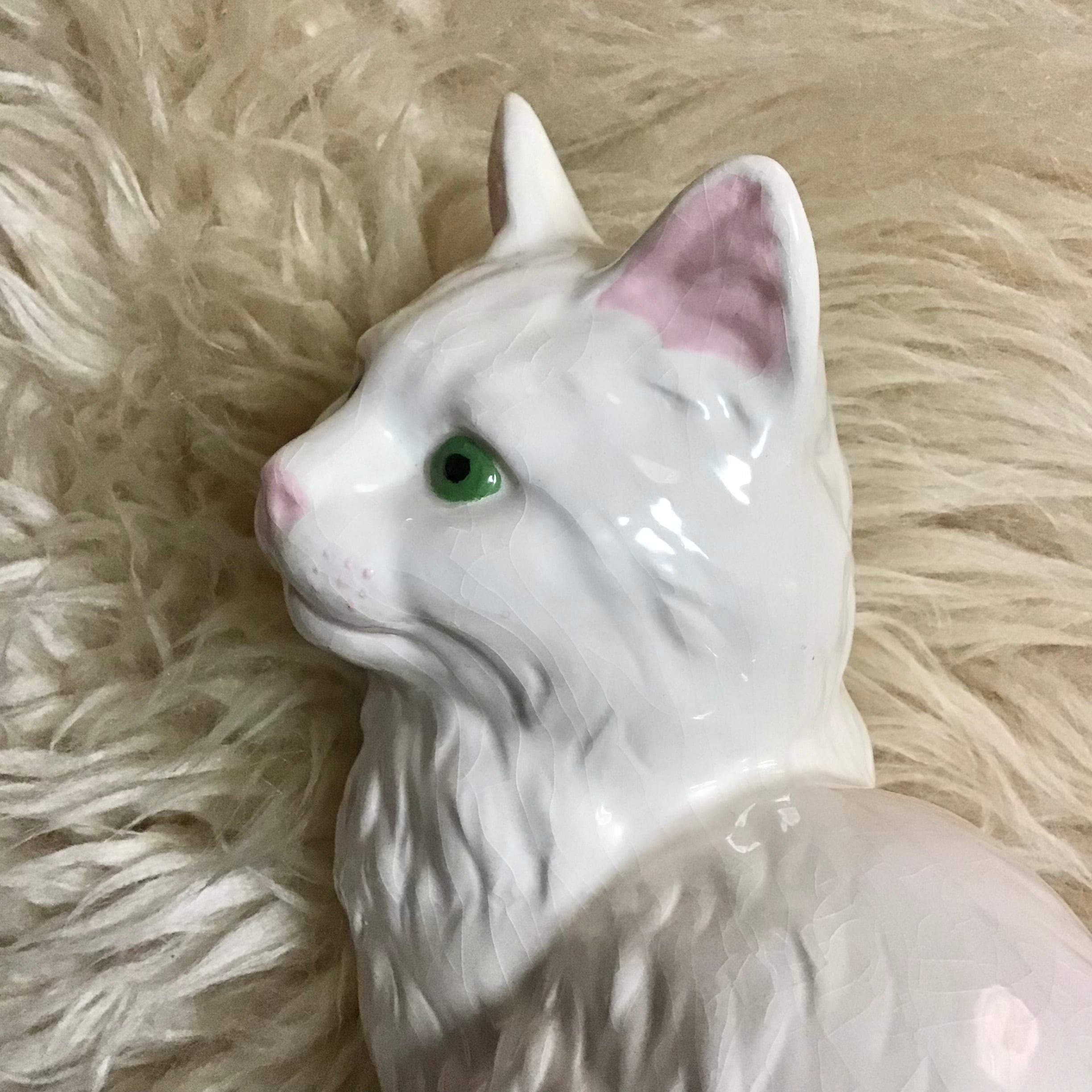 陶器の大きめ猫ちゃん。くるんとした尻尾やグリーンの瞳が印象的で、おひげの点々もたまらなく可愛いです♡是非お気に入りの場所に飾ってお楽しみください◎猫好きさんへのギフトにも!