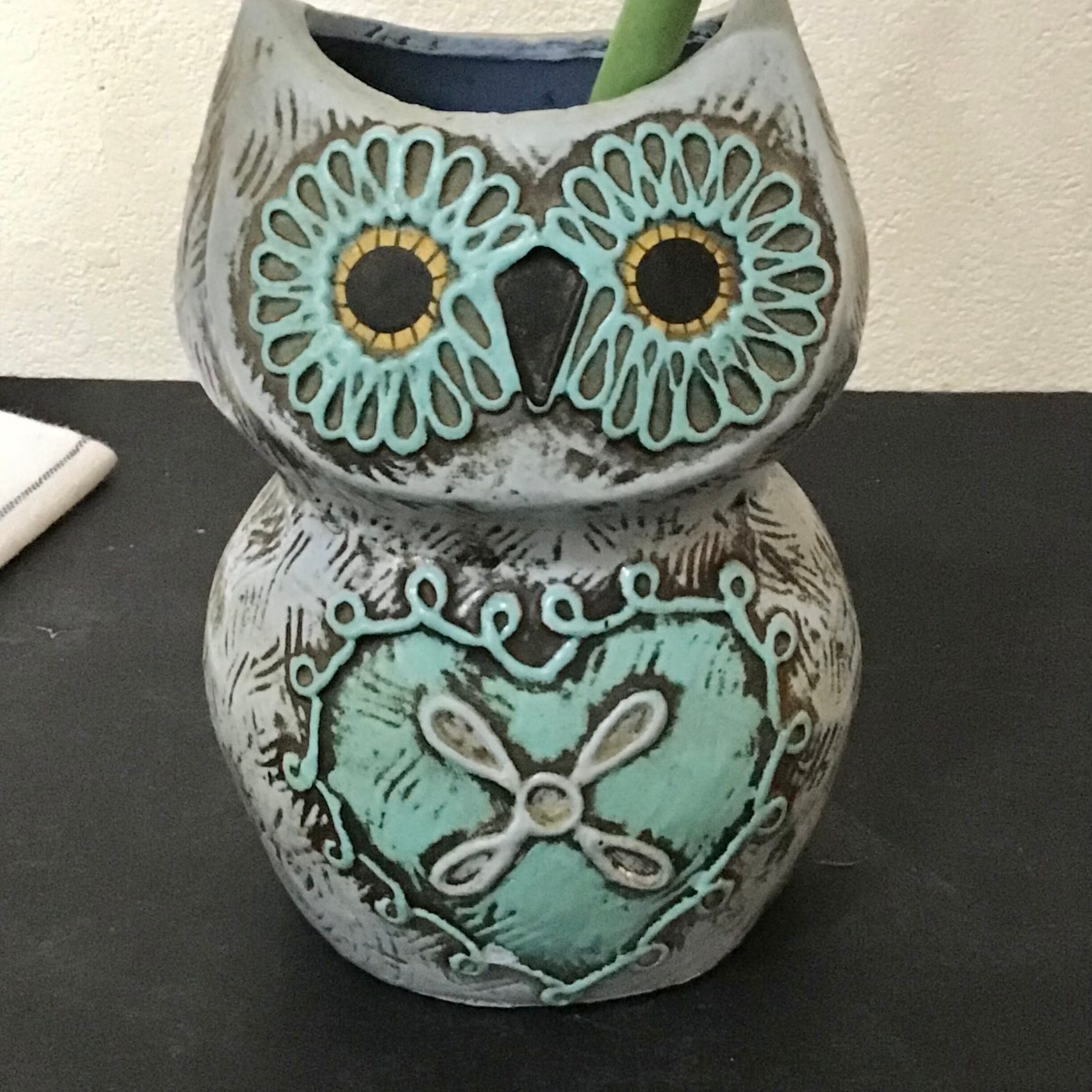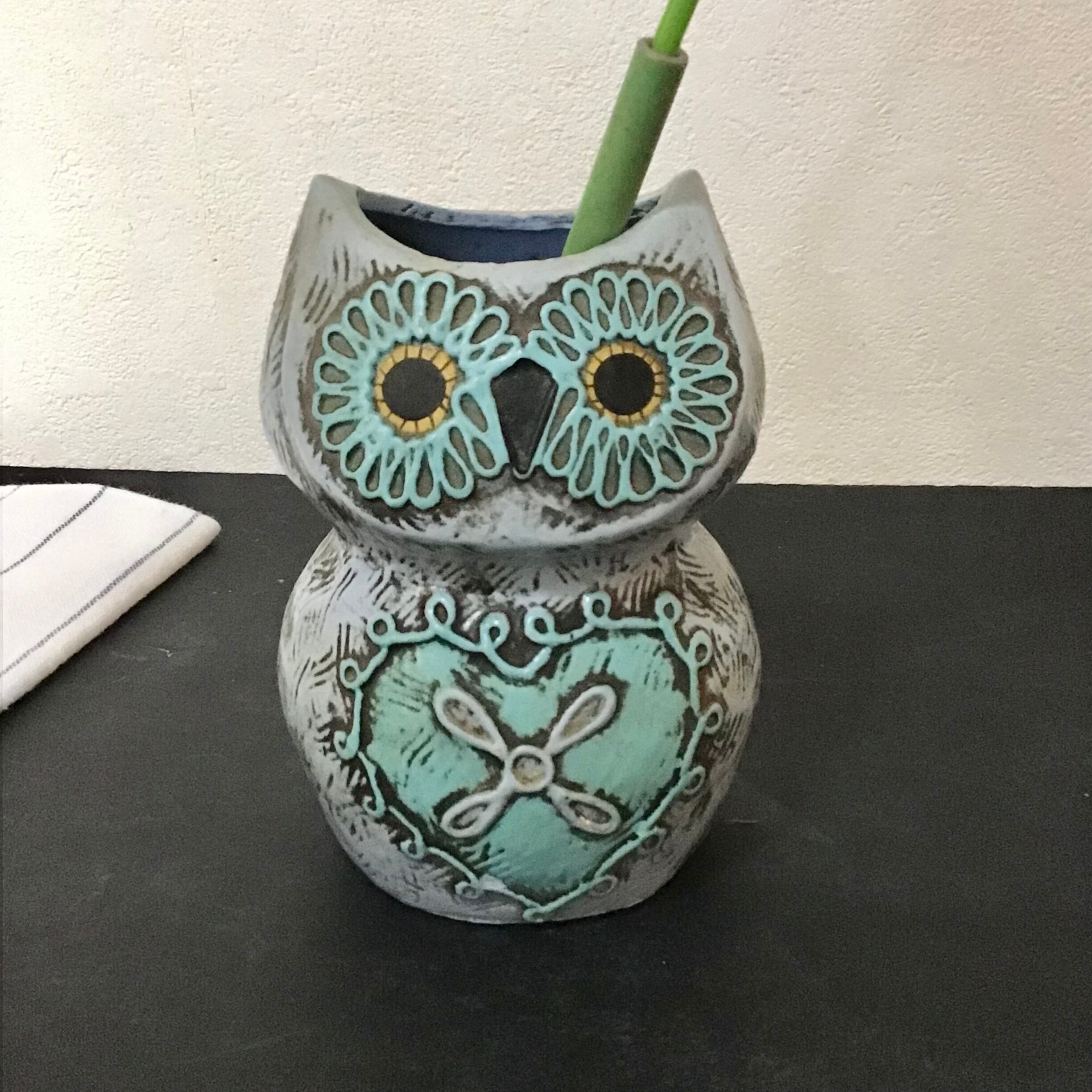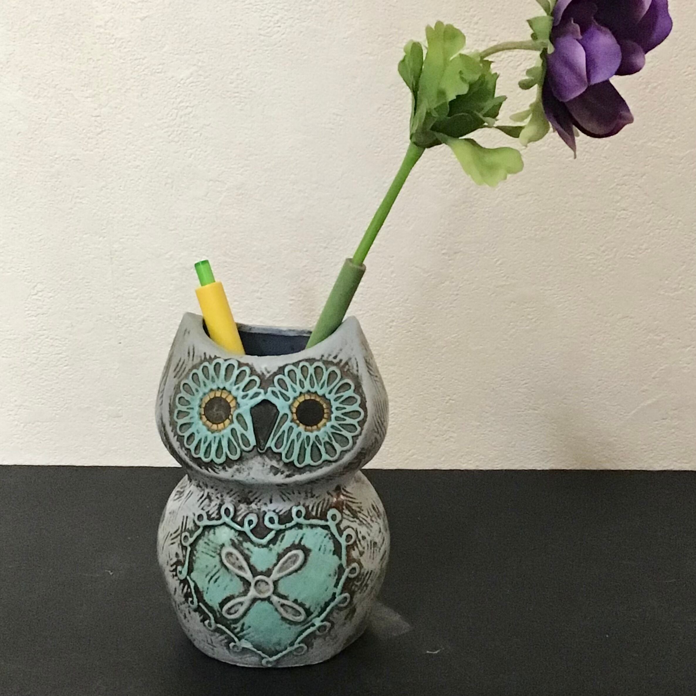 1970年代のフクロウのペン立て、陶器ではなく、プラスチックの様な軽い素材です。ブルーが爽やかでクリっとした瞳やお腹のハートが可愛いです♡ペンやメイク道具の収納にしたり、縁起の良いモチーフなので玄関などに飾って頂いても良いと思います◎