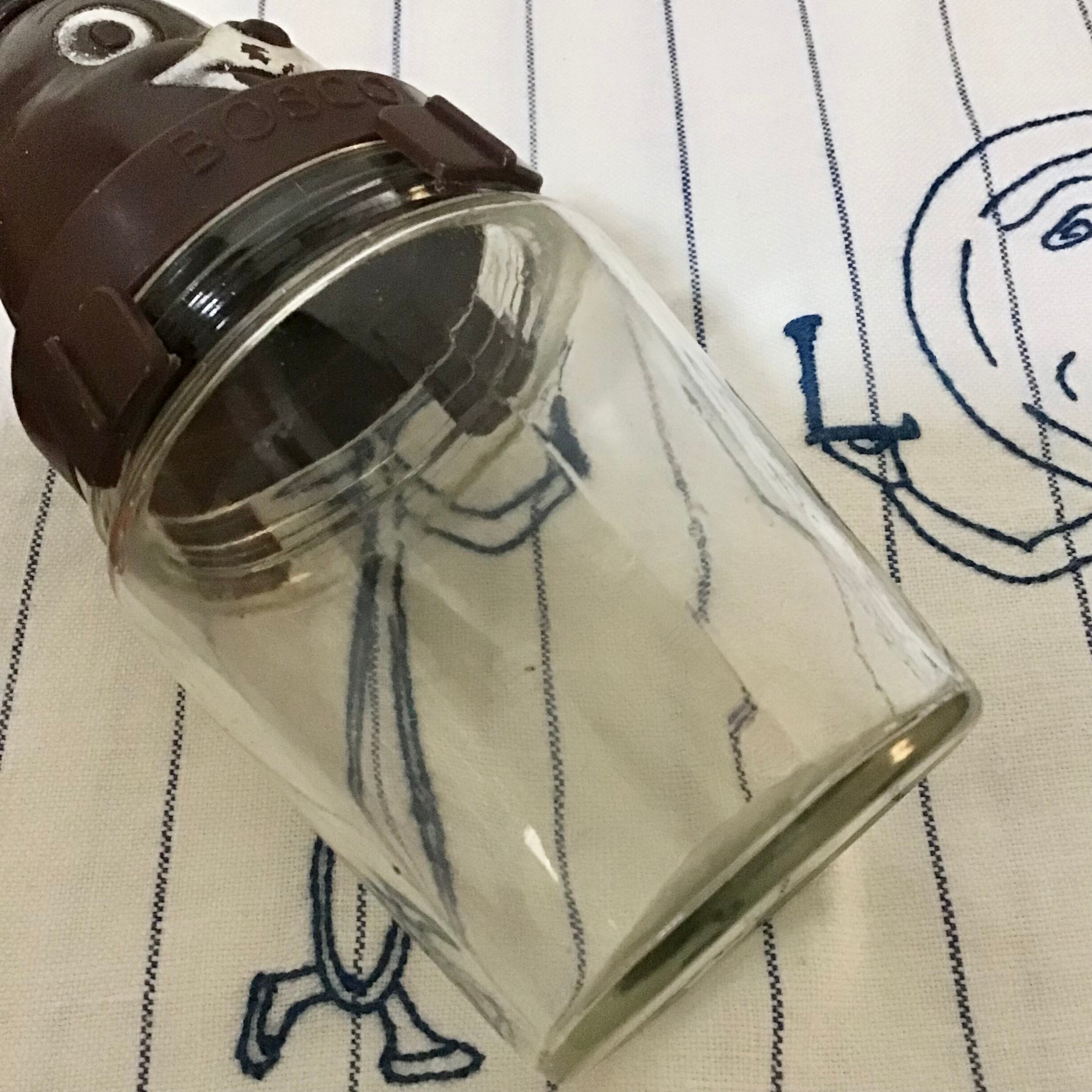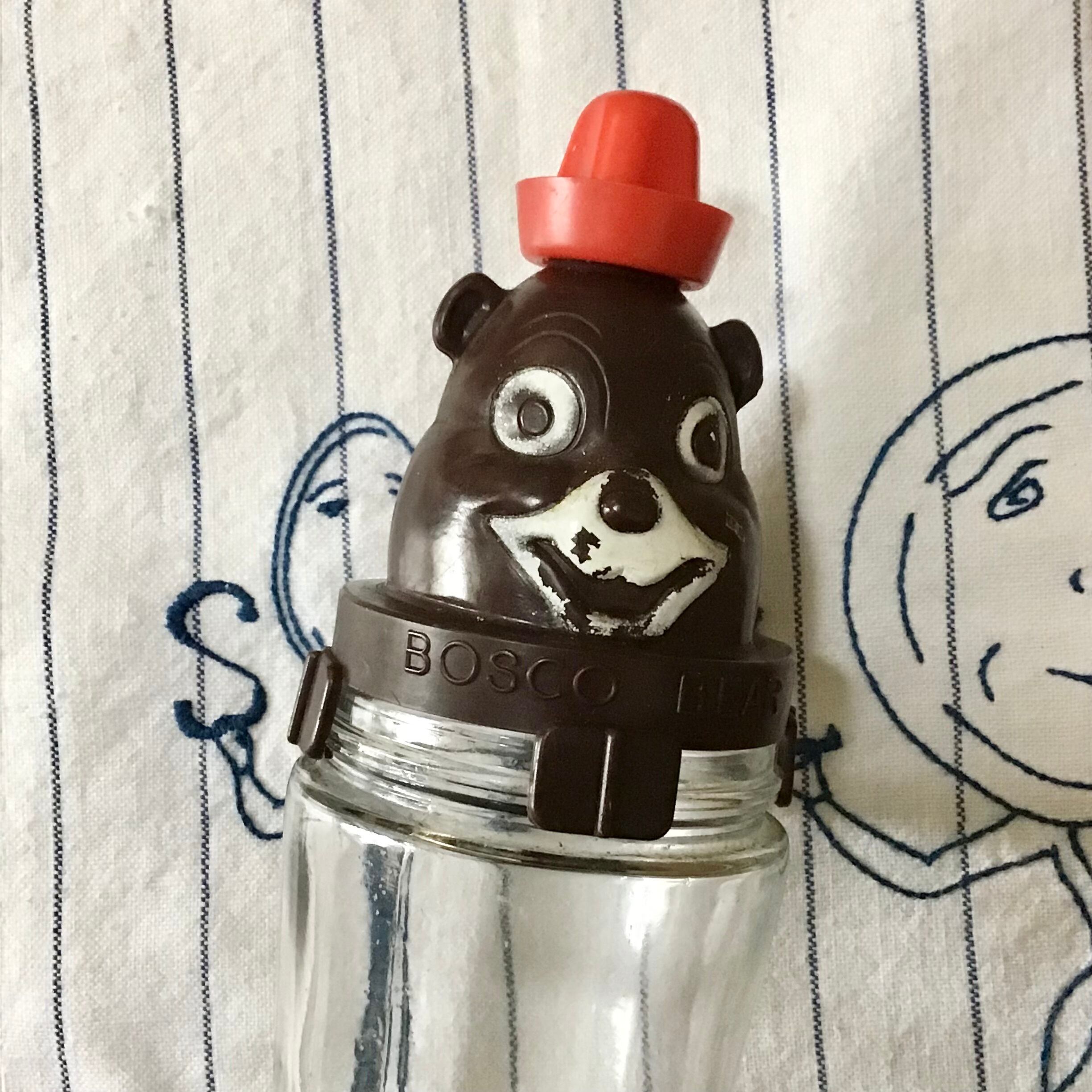 ヘイゼルアトラス社製、ボスコのチョコレートシロップガラスジャー。マスコットのボスコベアがデザインされ、当時はこの容器にシロップが入って販売されていた様です♡
