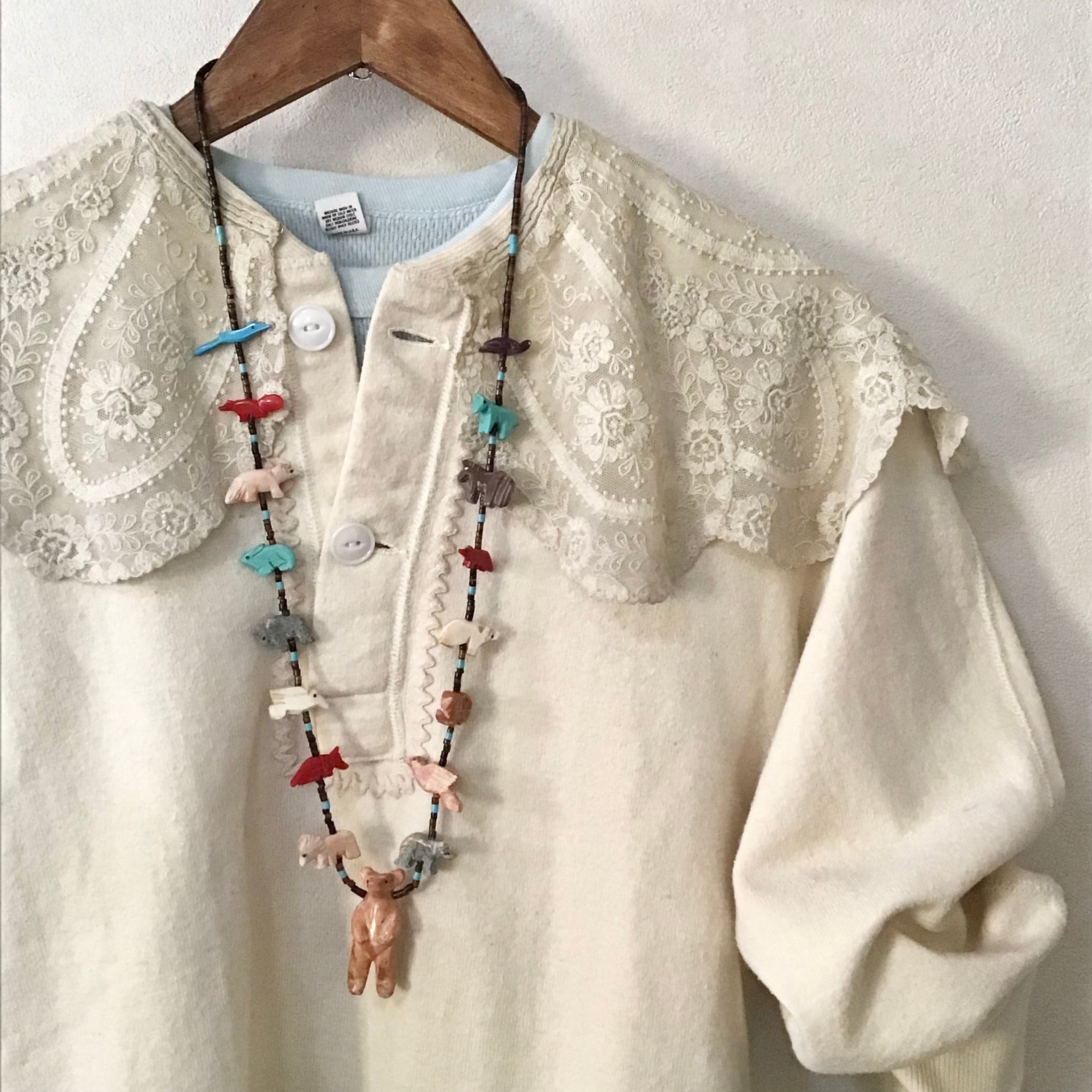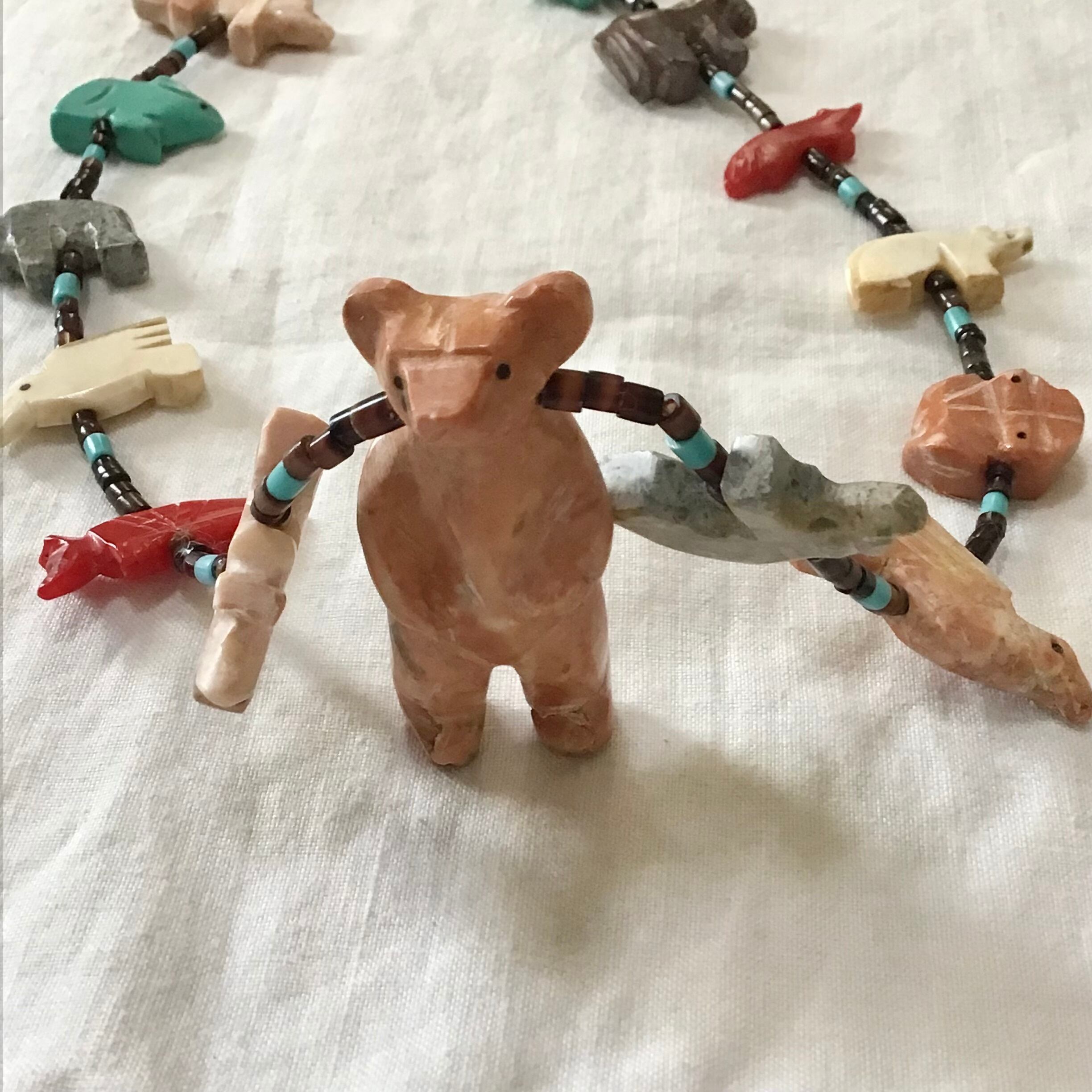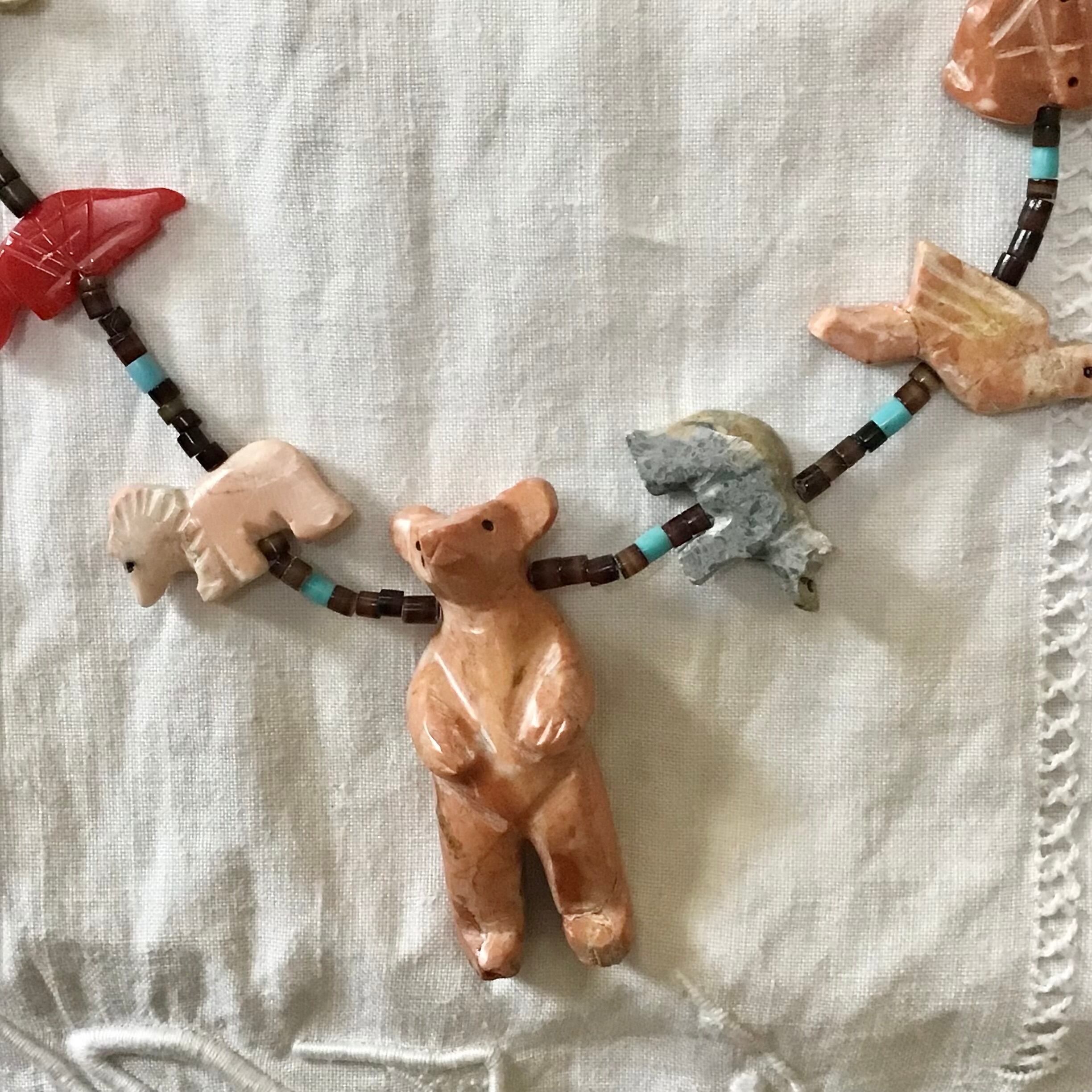 大きなクマのフェティッシュネックレス。クマさんの周りをたくさんの動物たちが囲む、印象的なデザインがとても素敵です♡サーモンピンクがかった石のクマ、周囲に連なる動物たちは天然石や合成ブロックを手彫りしたものを使っており、大きさや色が均一でない貝のビーズも良い雰囲気です◎少しくすんだお色味が馴染みやすく、さりげなく主役になってくれそうです!