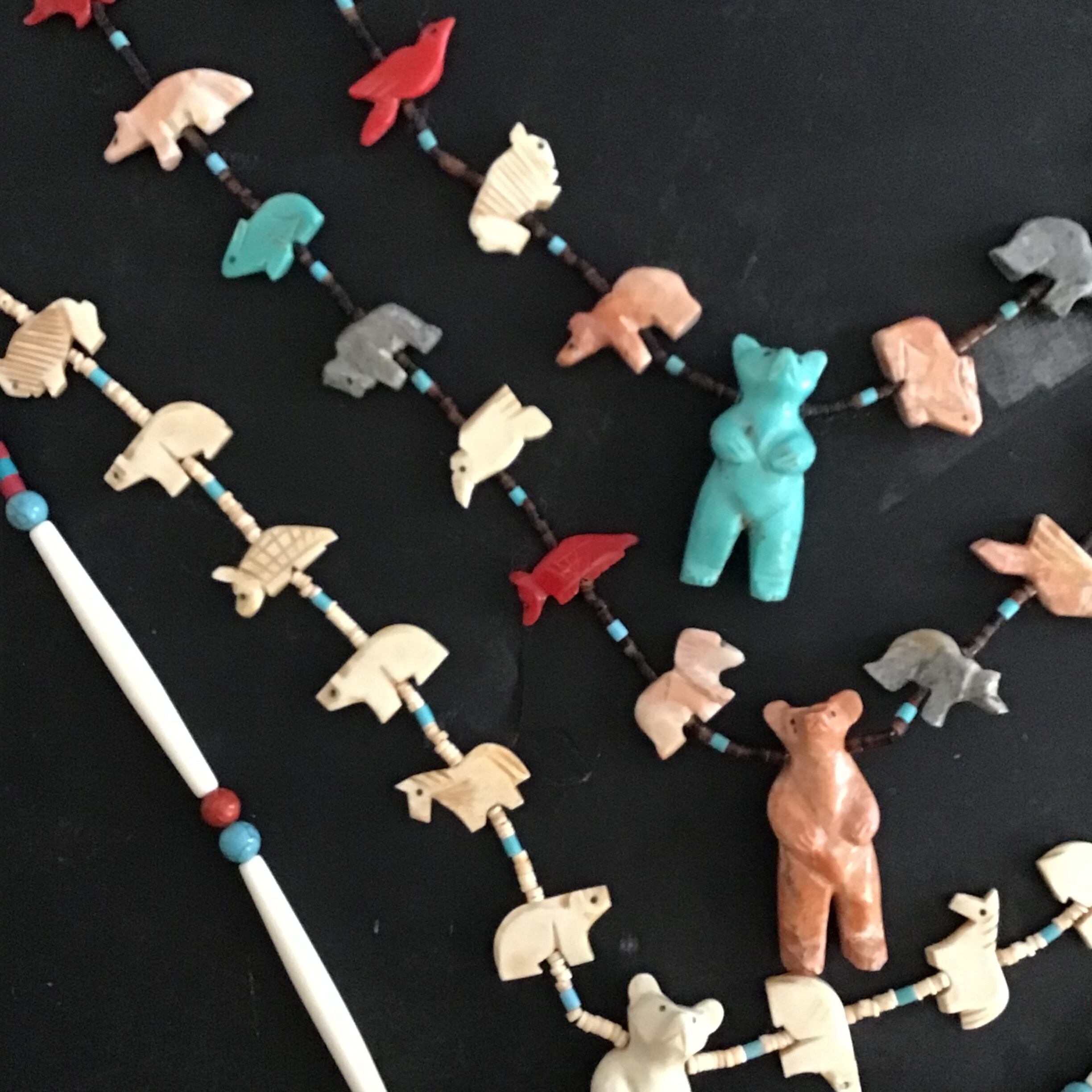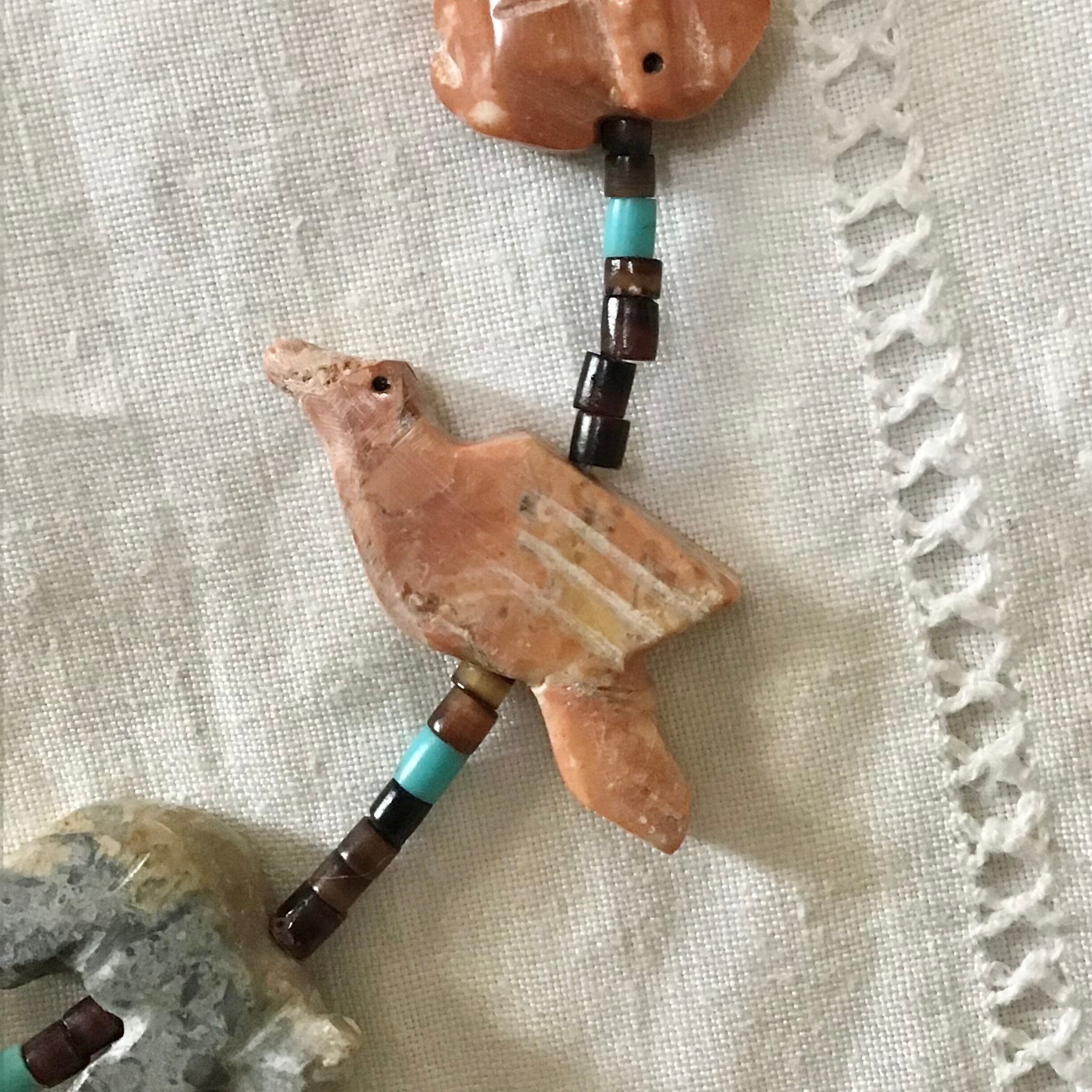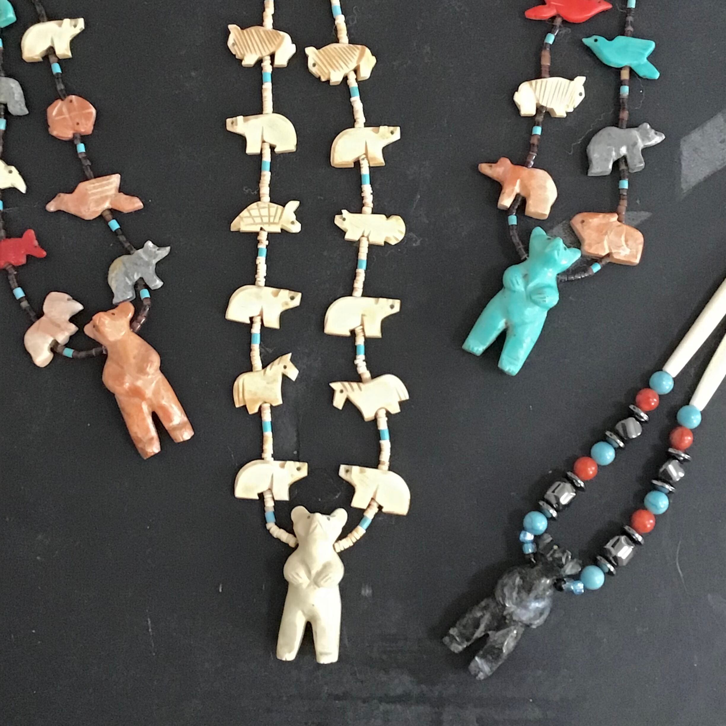 大きなクマのフェティッシュネックレス。クマさんの周りをたくさんの動物たちが囲む、印象的なデザインがとても素敵です♡サーモンピンクがかった石のクマ、周囲に連なる動物たちは天然石や合成ブロックを手彫りしたものを使っており、大きさや色が均一でない貝のビーズも良い雰囲気です◎少しくすんだお色味が馴染みやすく、さりげなく主役になってくれそうです!