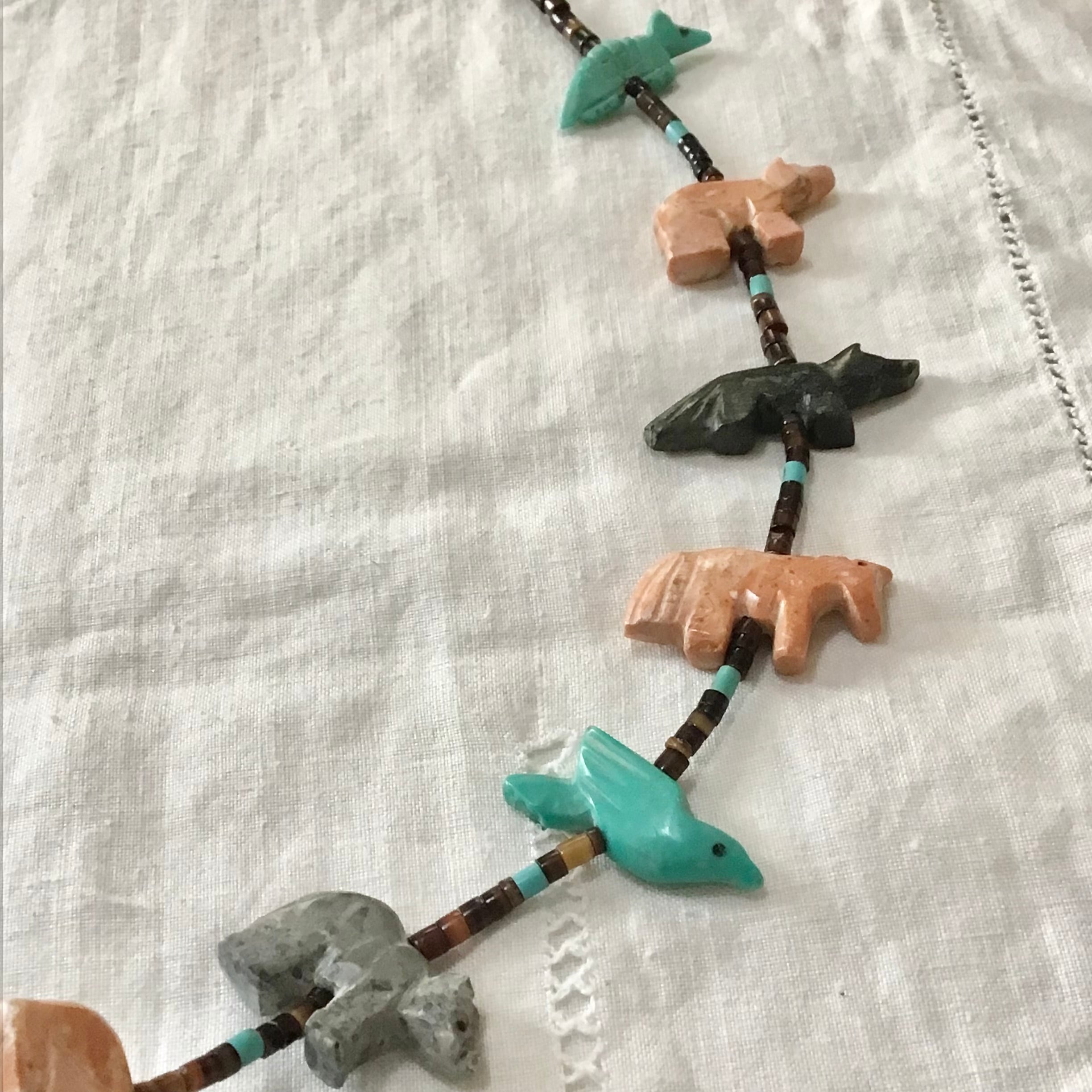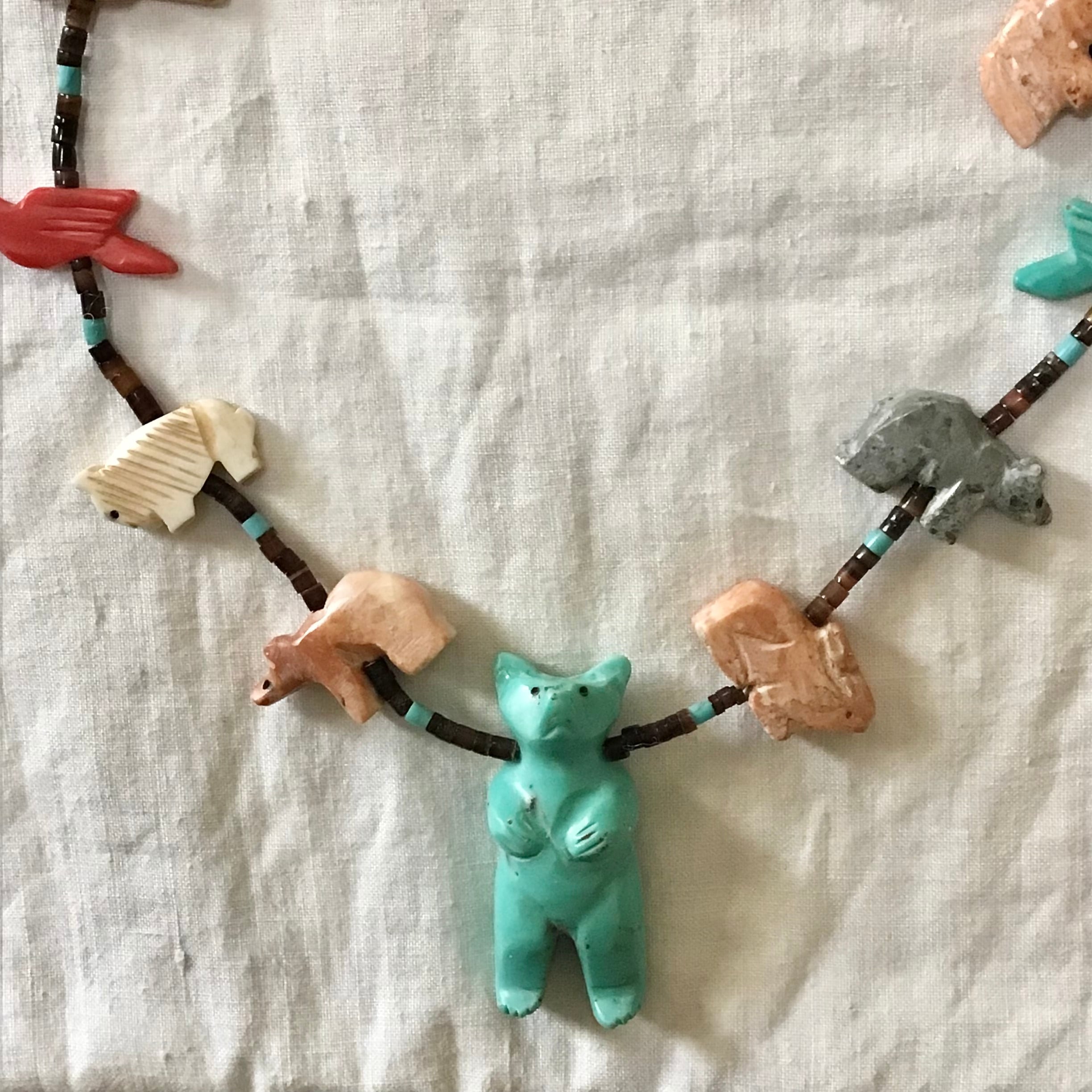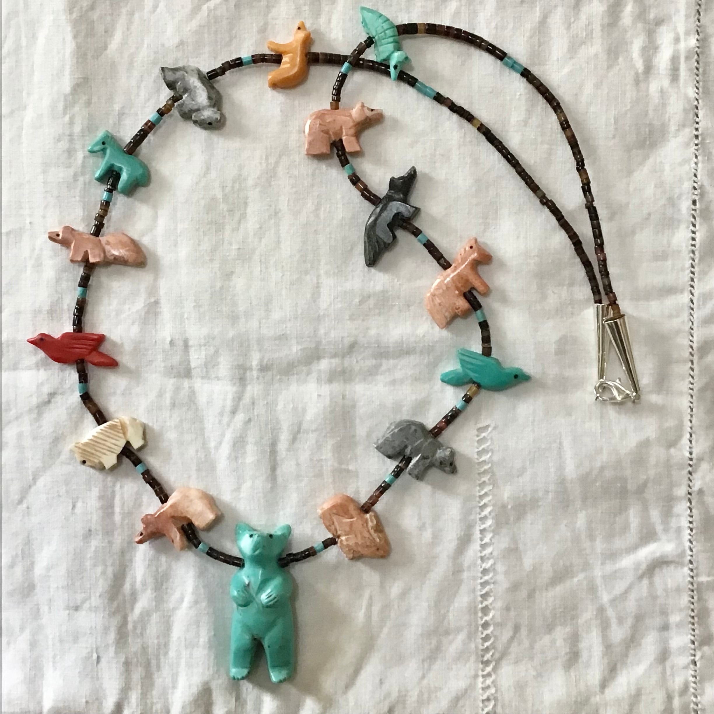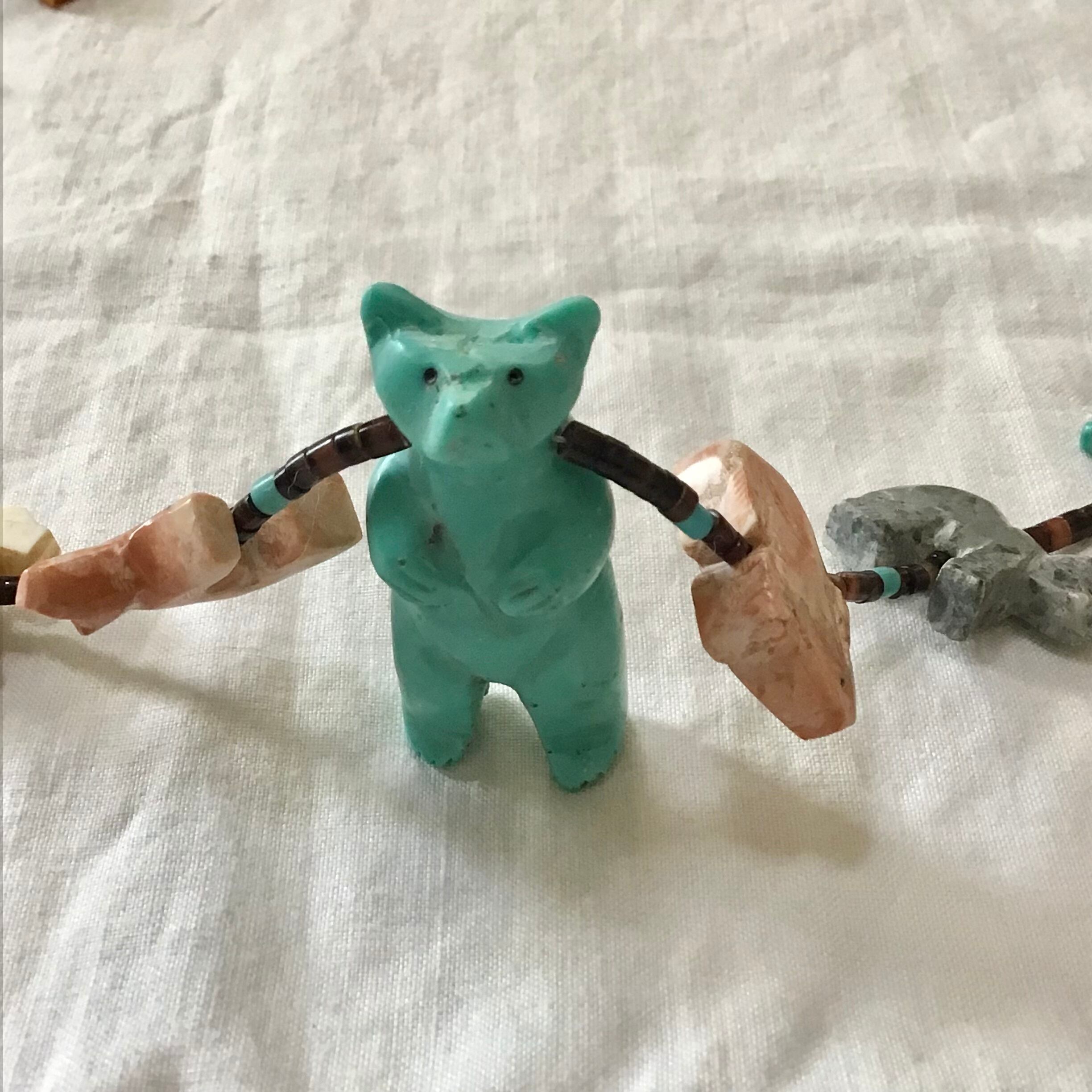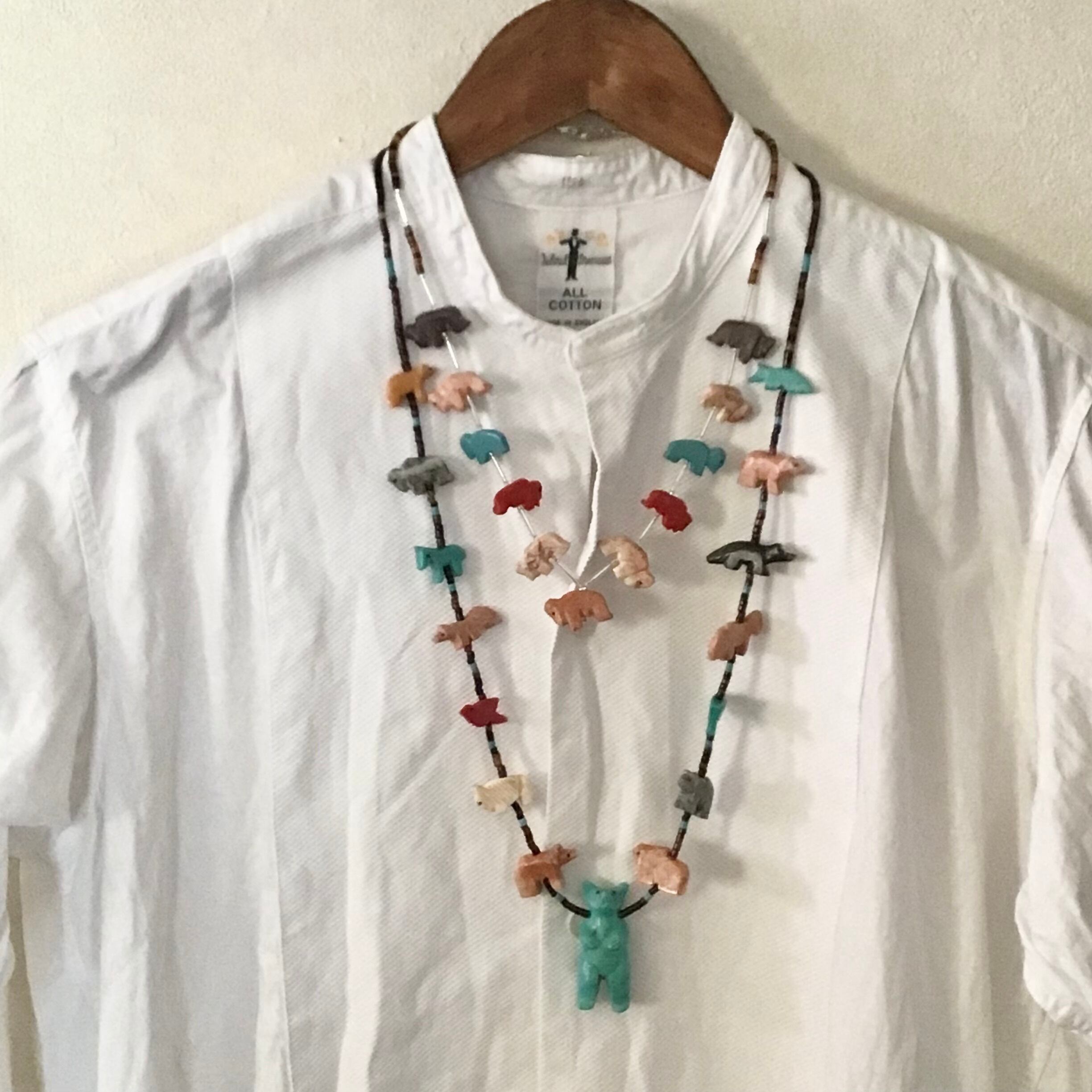 大きなクマのフェティッシュネックレス。クマさんの周りをたくさんの動物たちが囲む、印象的なデザインがとても素敵です♡クマは合成物ですが、周囲に連なる動物たちは天然石を手彫りしたものを使っており、大きさや色が均一でない貝のビーズも良い雰囲気です◎華やかさと手作りの温かみを感じるおすすめのお品です!