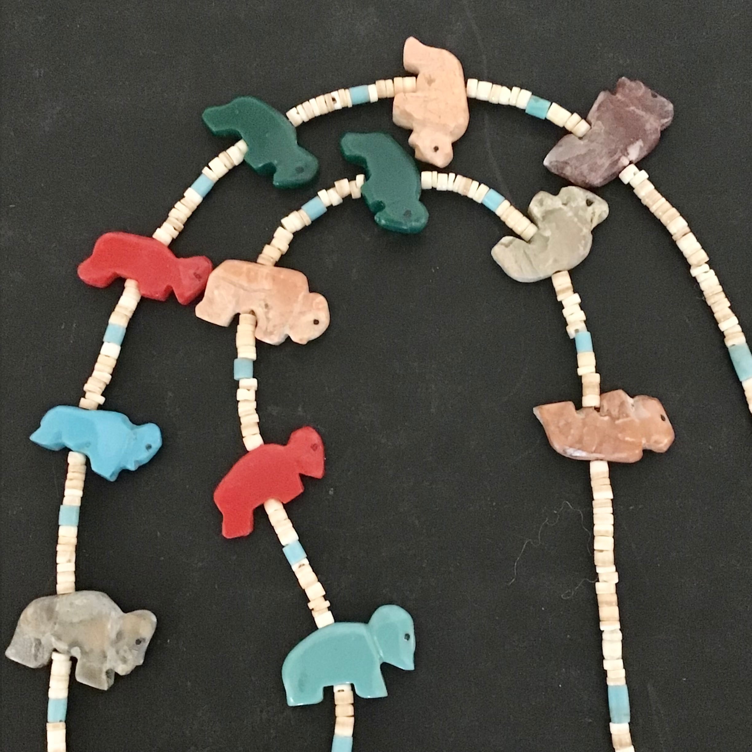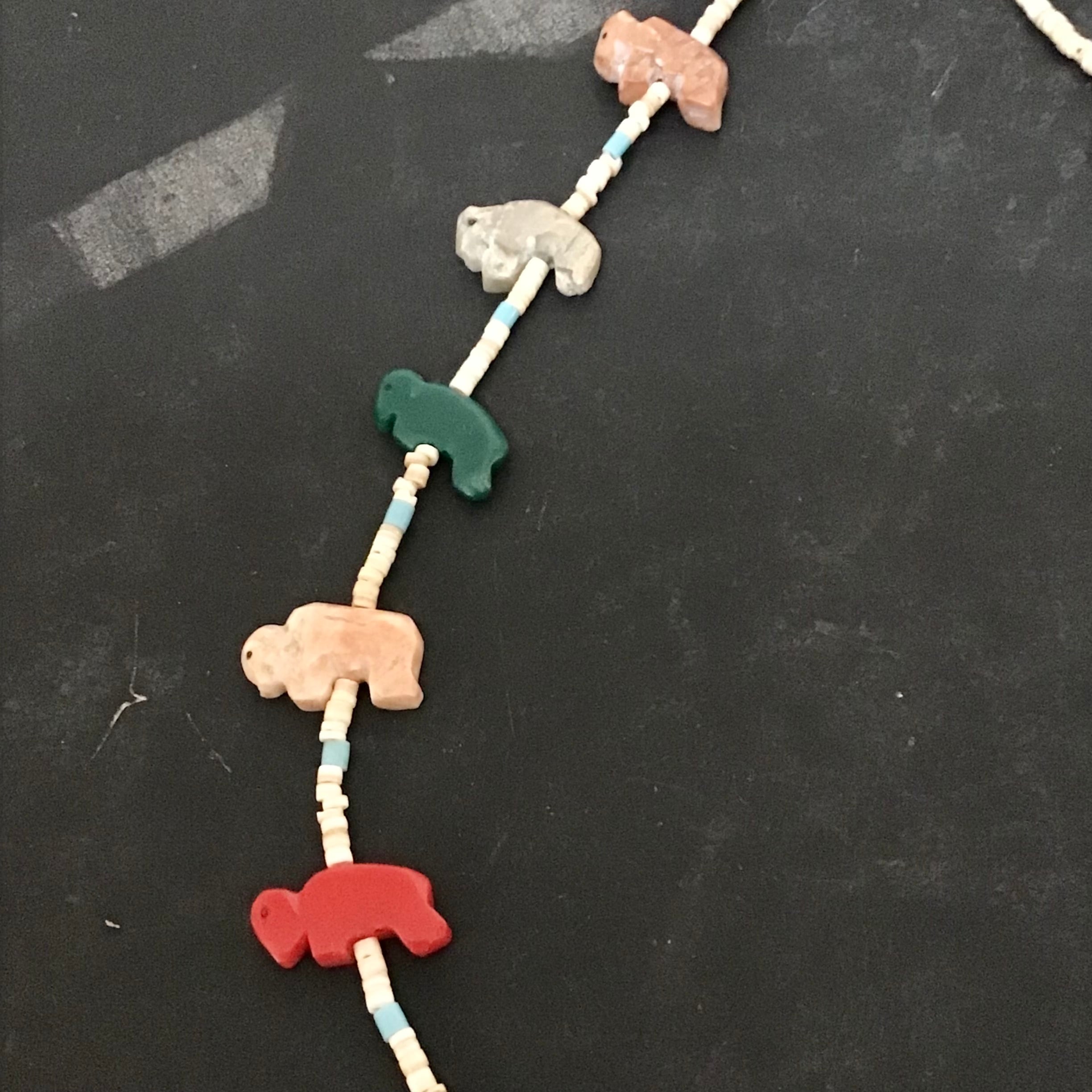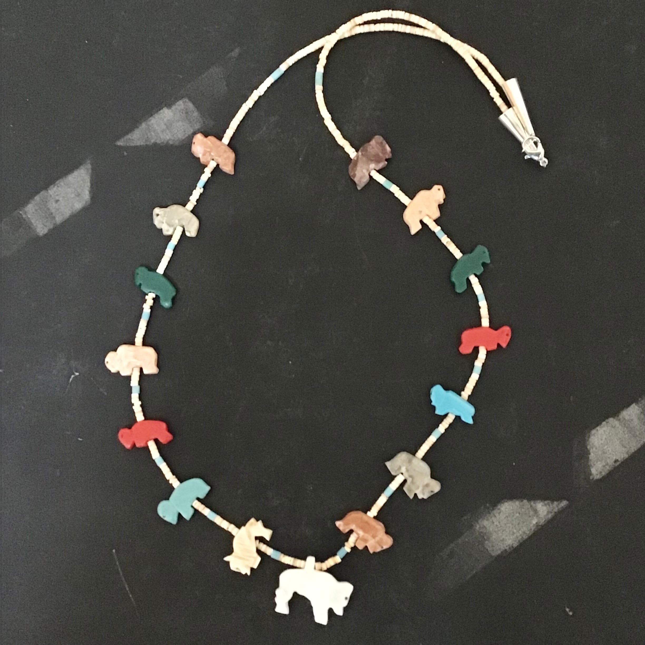 大きなバッファローのフェティッシュネックレス。白いバッファローの周りを様々なお色の小さなバッファローたちが囲むデザインがとても素敵です♡大小のバッファローは天然石を手彫りしたものを使っており、大きさや色が均一でない貝のビーズも良い雰囲気です◎カラフルで程よく存在感もあり、コーディネートを華やかにしてくれそうです!シルバージュエリーともよく合いおすすめです◎