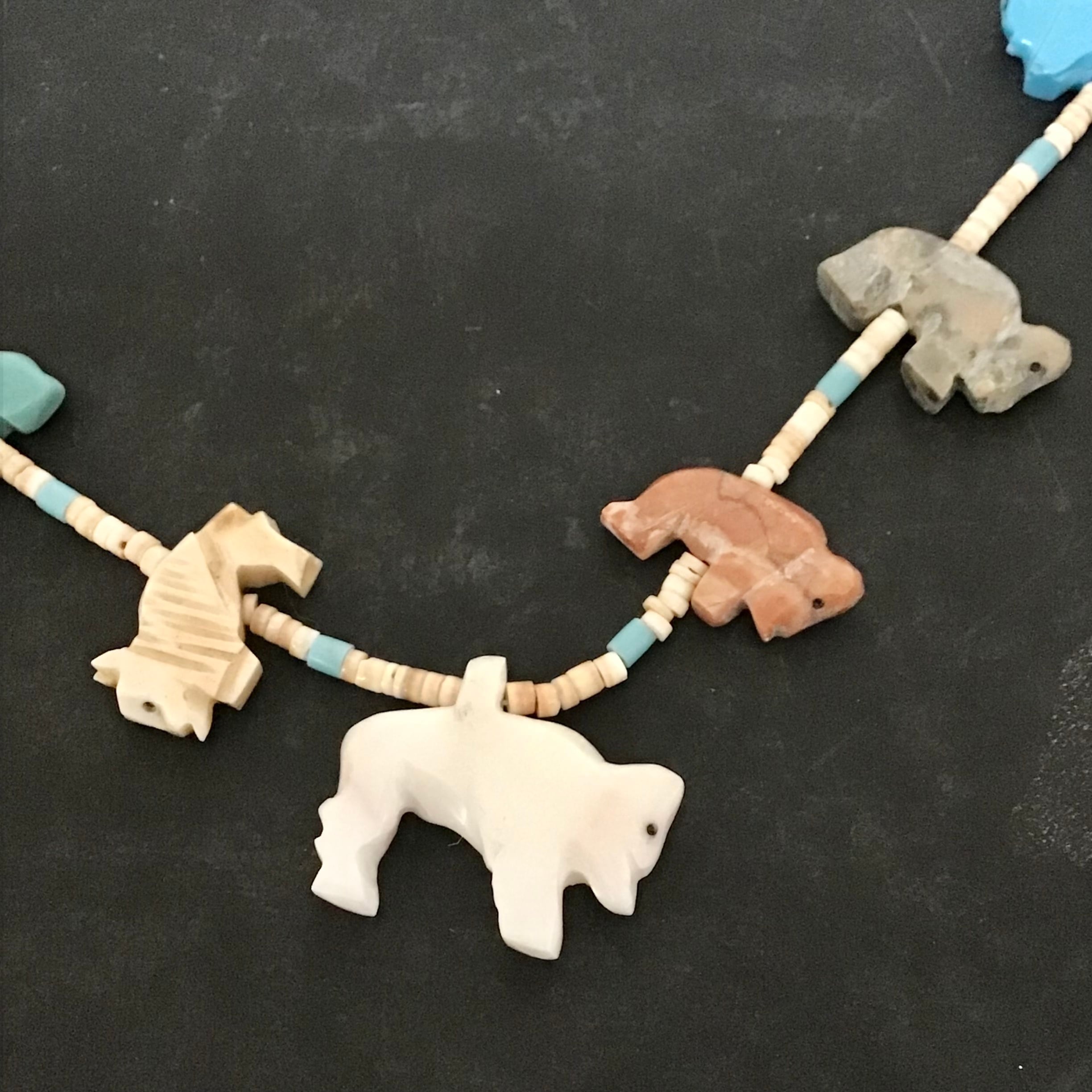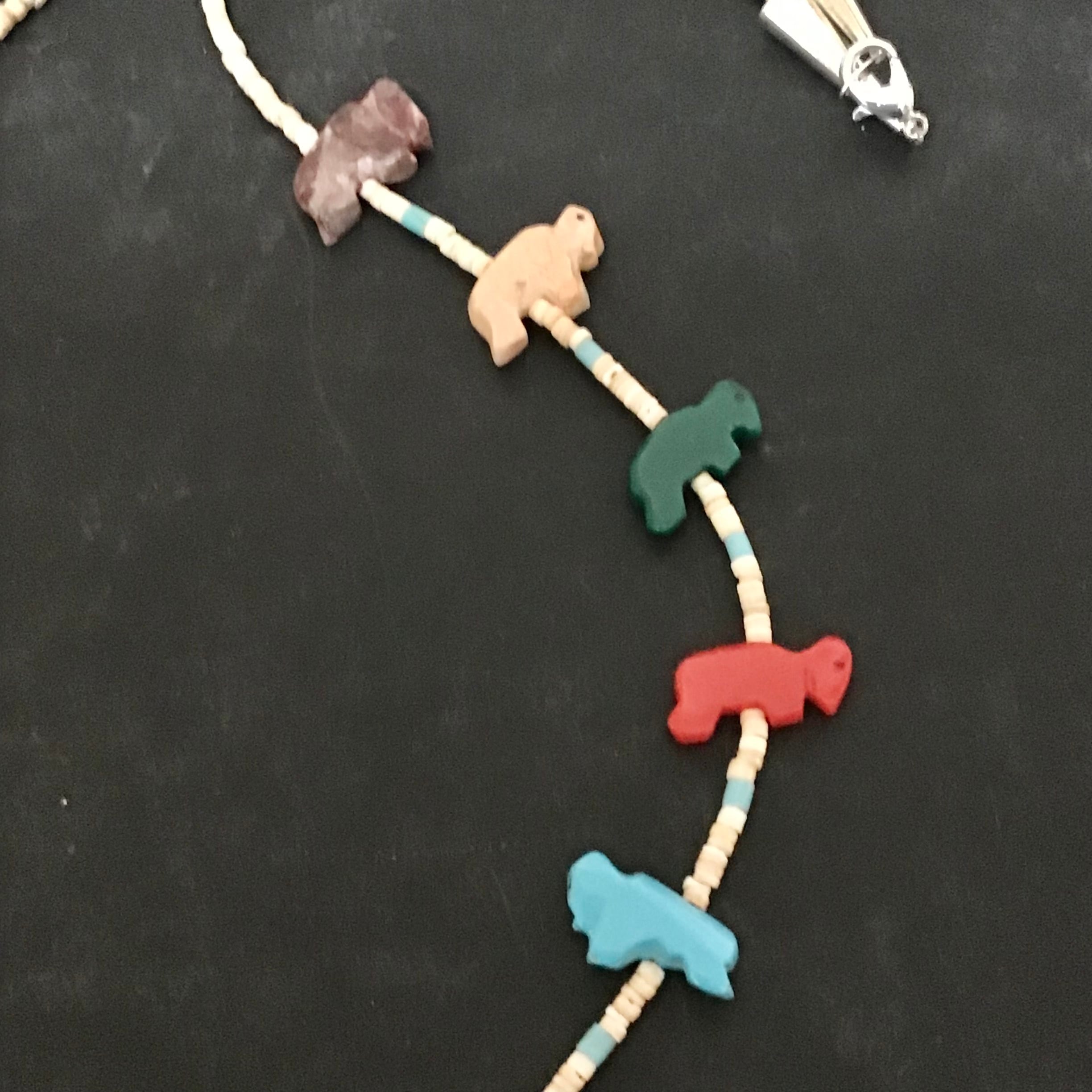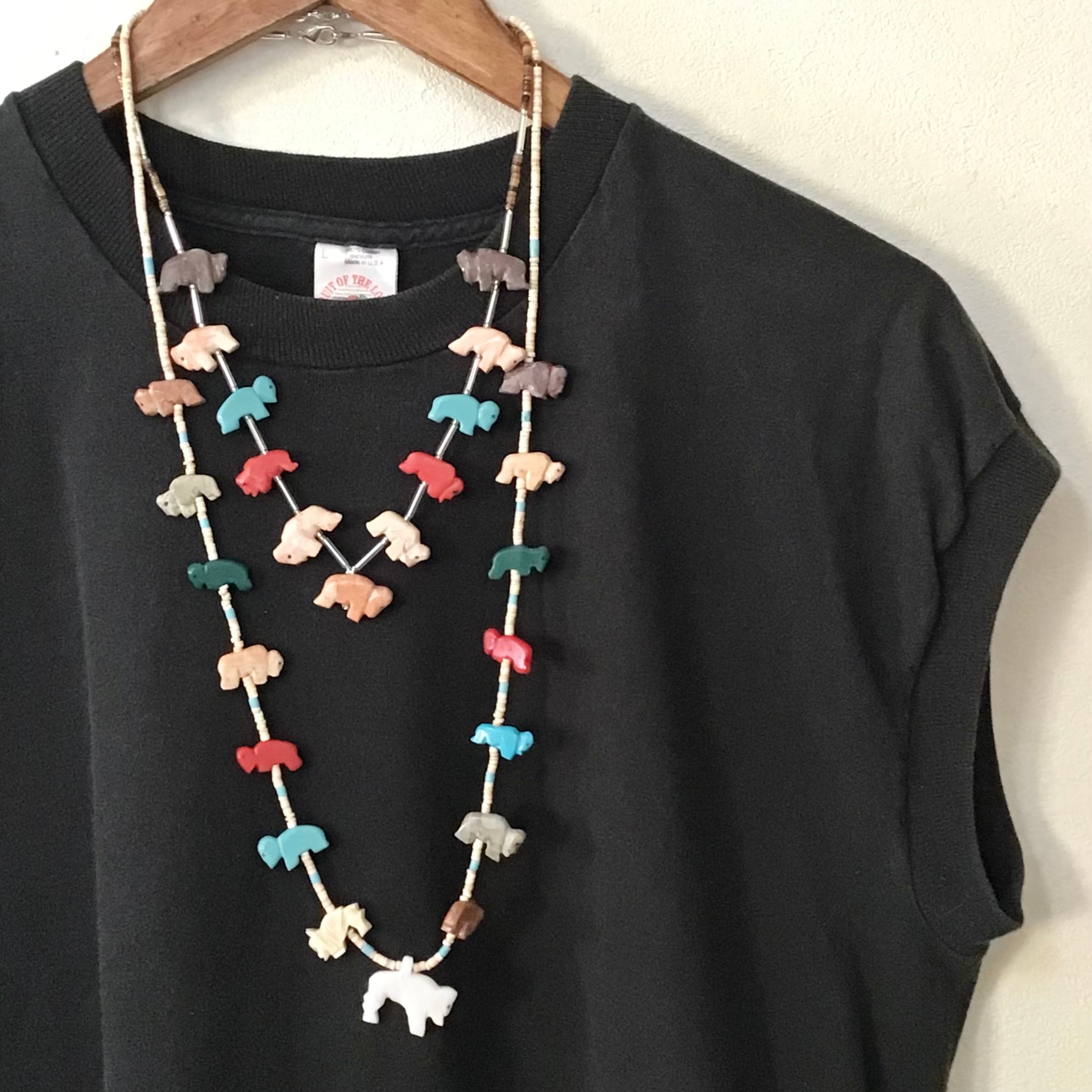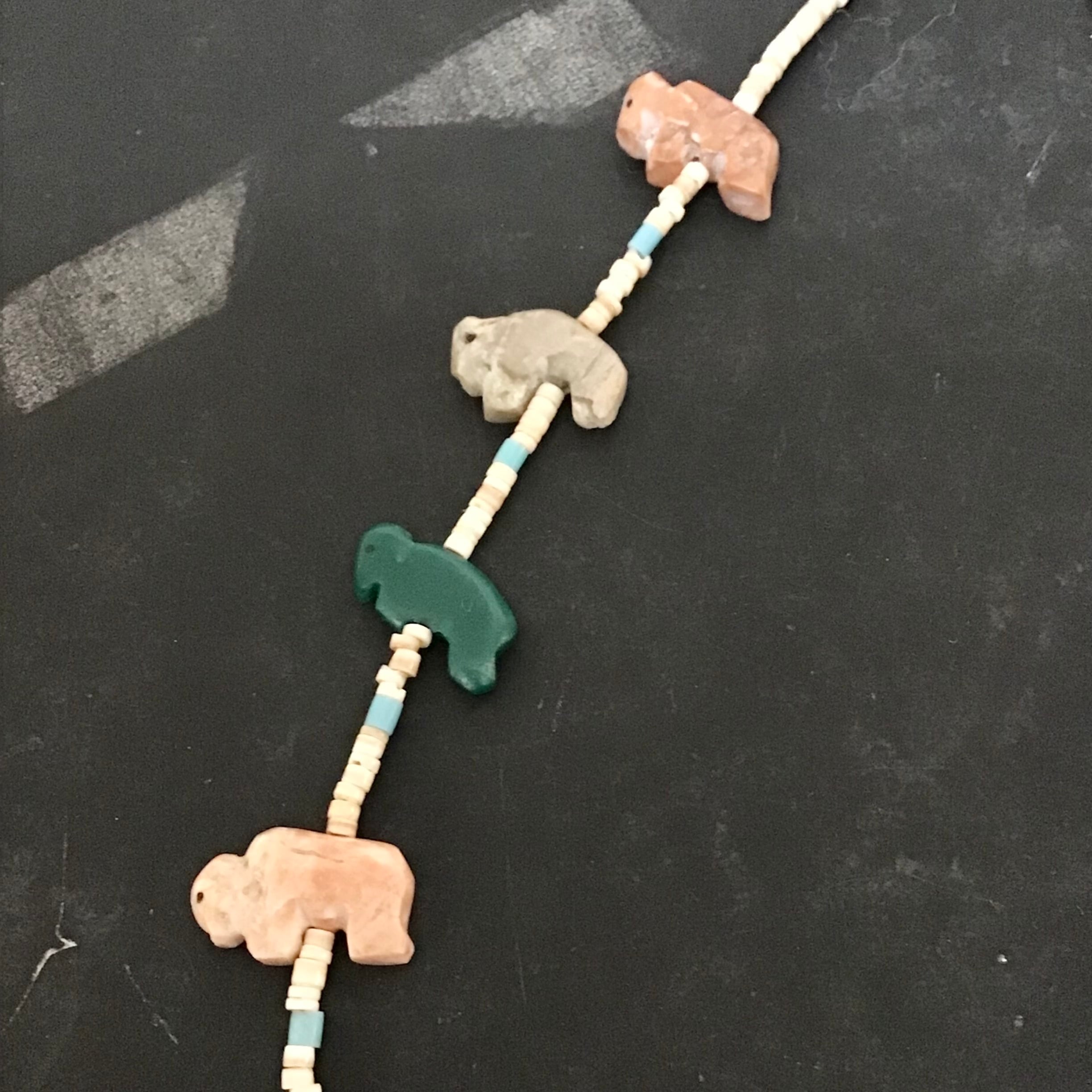 大きなバッファローのフェティッシュネックレス。白いバッファローの周りを様々なお色の小さなバッファローたちが囲むデザインがとても素敵です♡大小のバッファローは天然石を手彫りしたものを使っており、大きさや色が均一でない貝のビーズも良い雰囲気です◎カラフルで程よく存在感もあり、コーディネートを華やかにしてくれそうです!シルバージュエリーともよく合いおすすめです◎