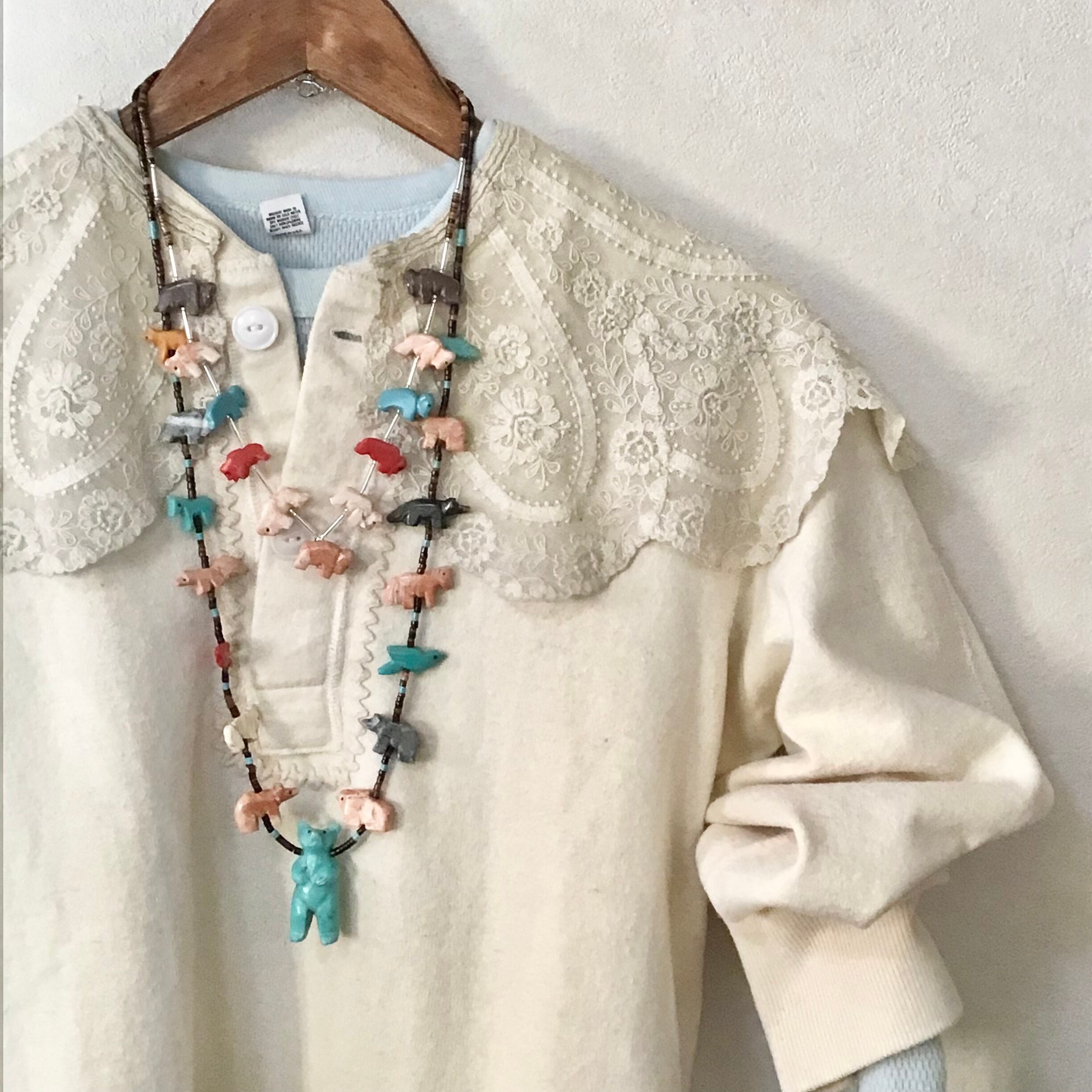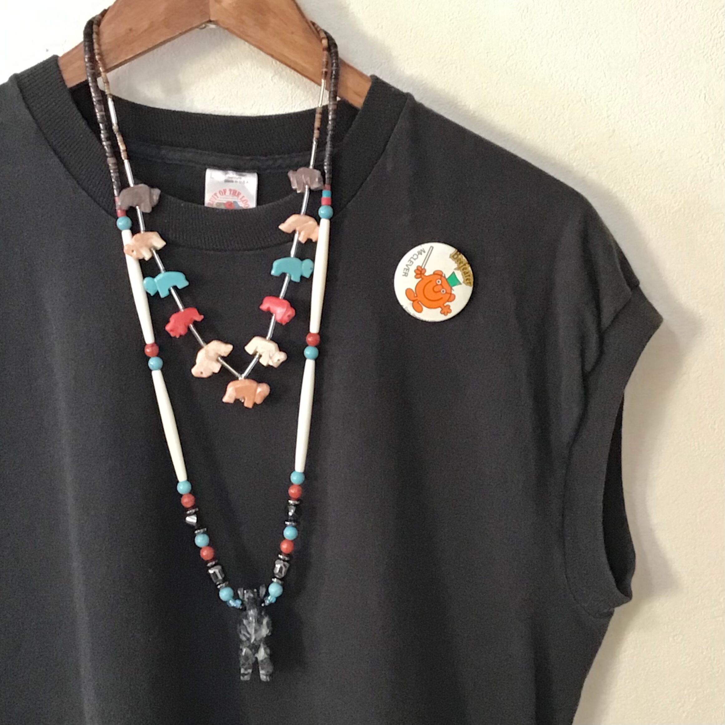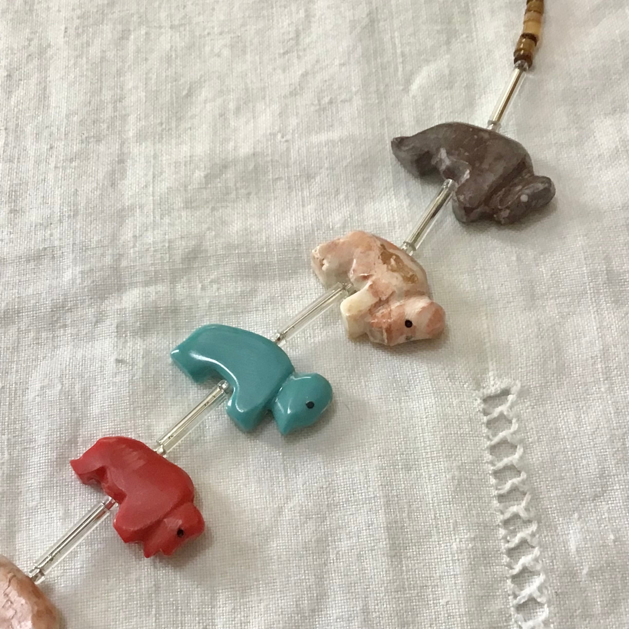 バッファローのフェティッシュネックレス。天然石と合成石を掘ったバッファロー達がカラフルで可愛いらしく、ガラスビーズがさりげなくて素敵です♡比較的小ぶりなのでウッドビーズなどのネックレスと合わせたり、シルバーとも高相性で重ねつけも楽しんで頂けます!