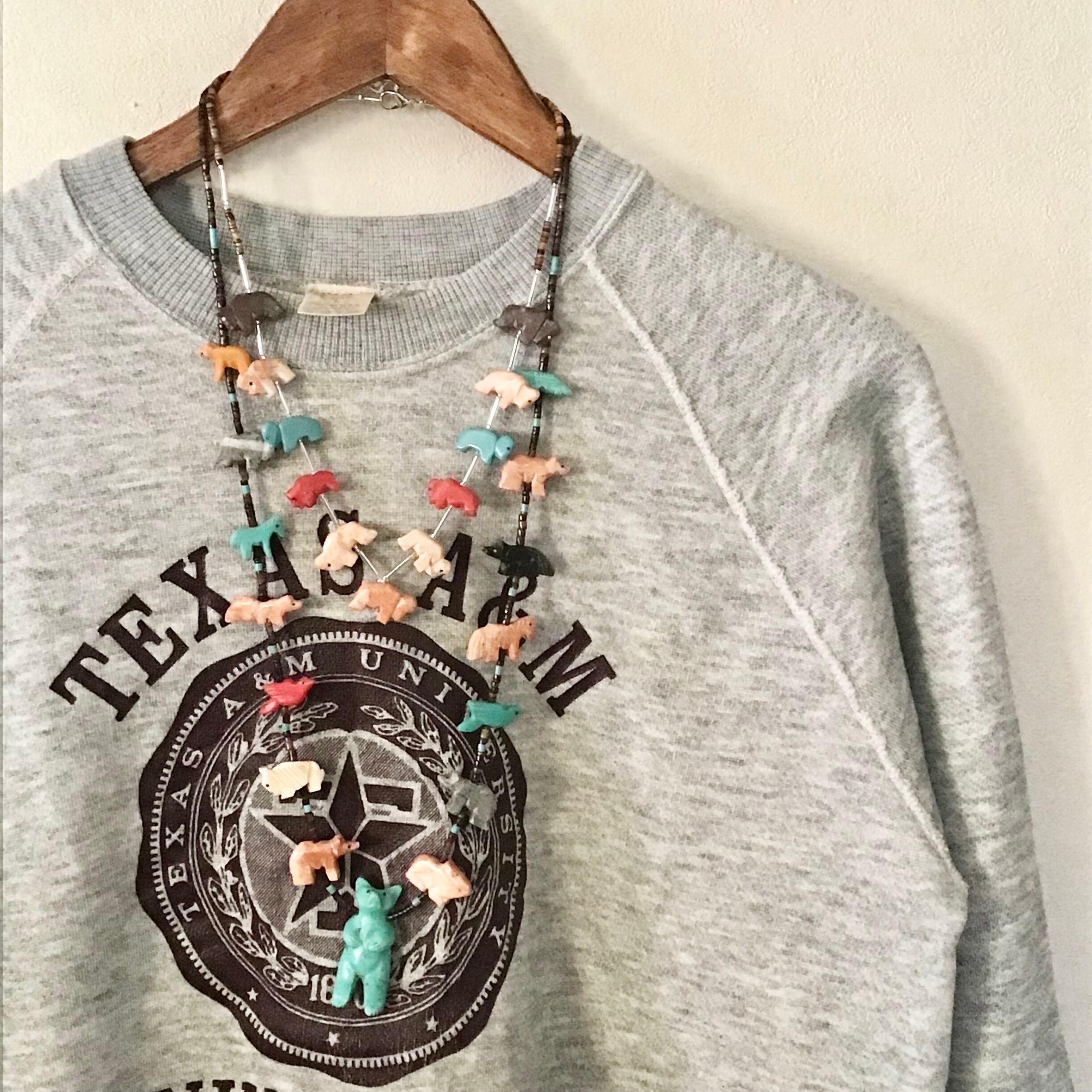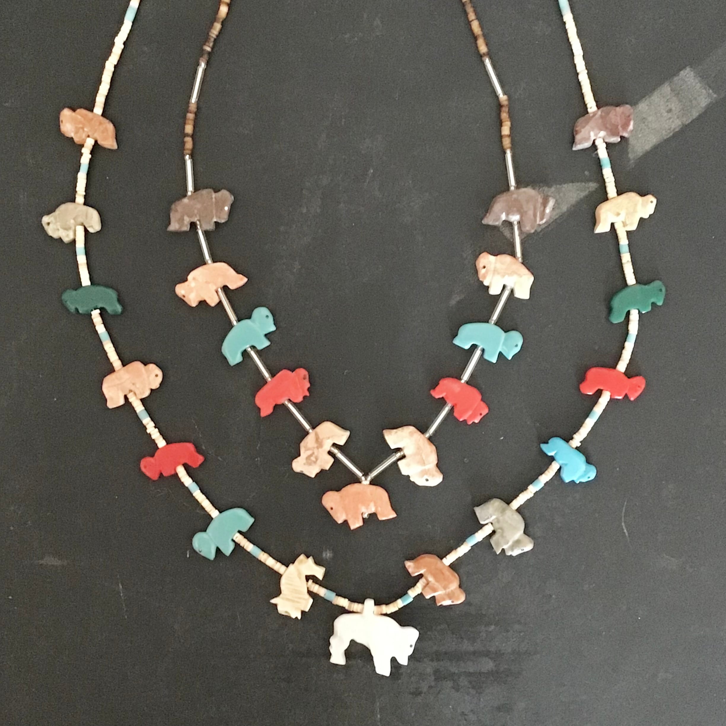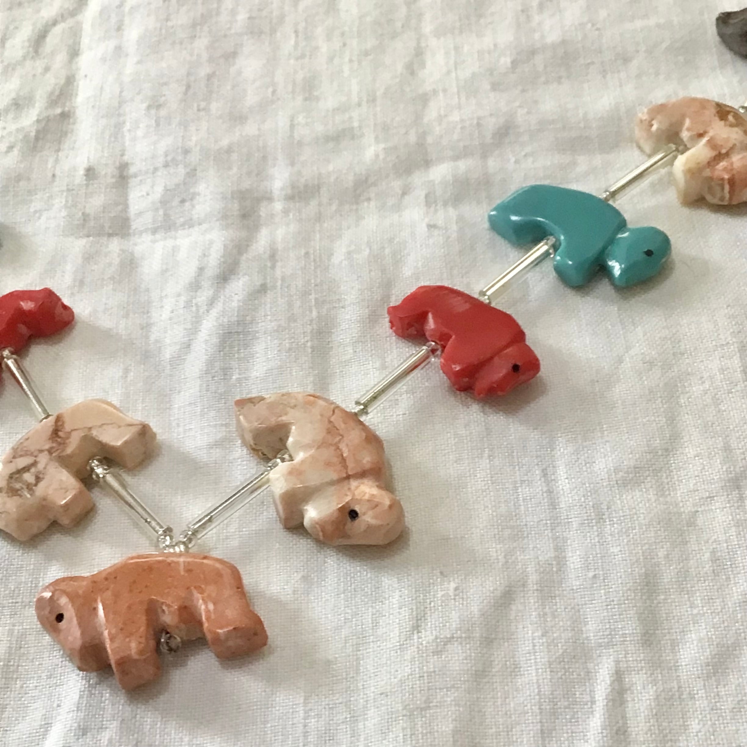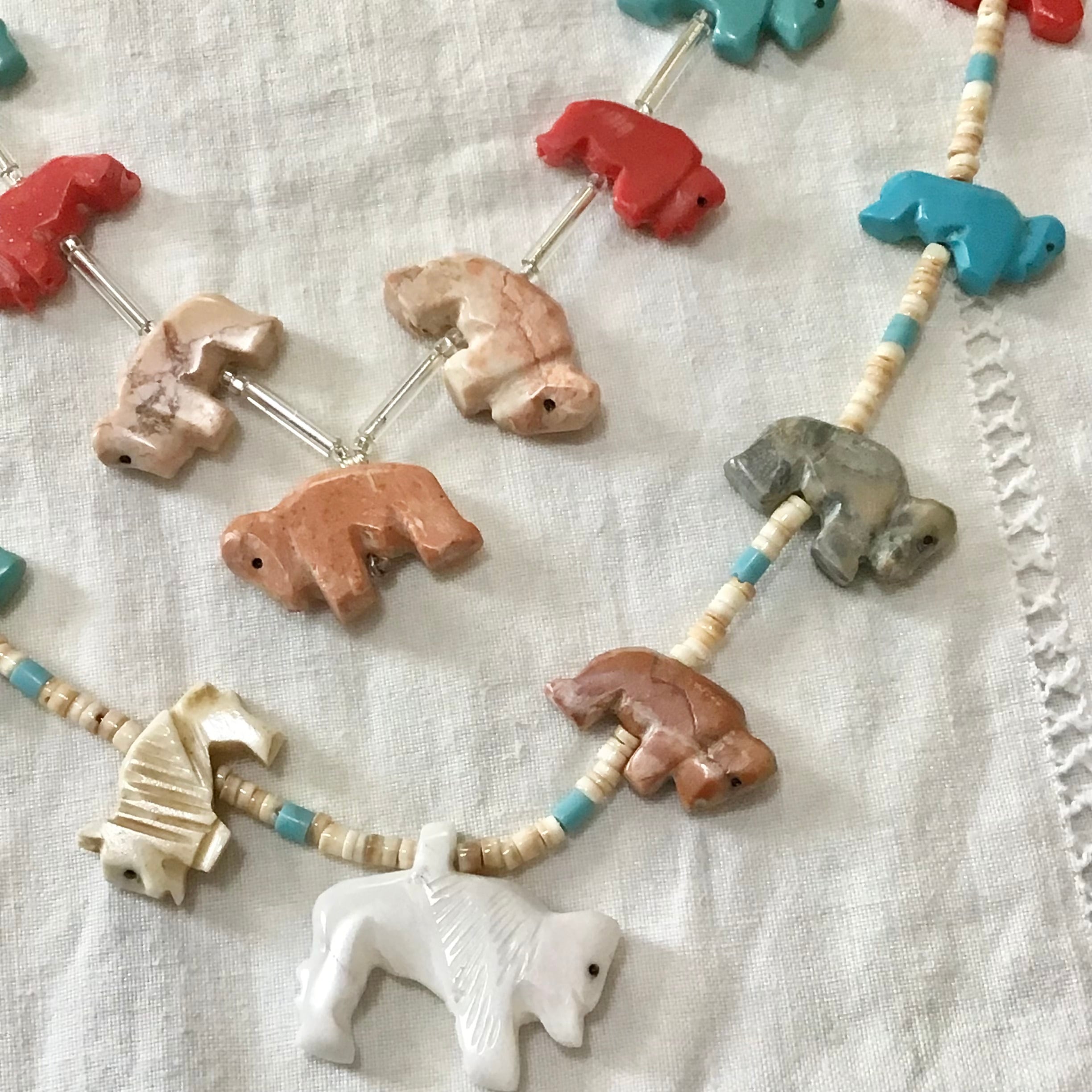 バッファローのフェティッシュネックレス。天然石と合成石を掘ったバッファロー達がカラフルで可愛いらしく、ガラスビーズがさりげなくて素敵です♡比較的小ぶりなのでウッドビーズなどのネックレスと合わせたり、シルバーとも高相性で重ねつけも楽しんで頂けます!