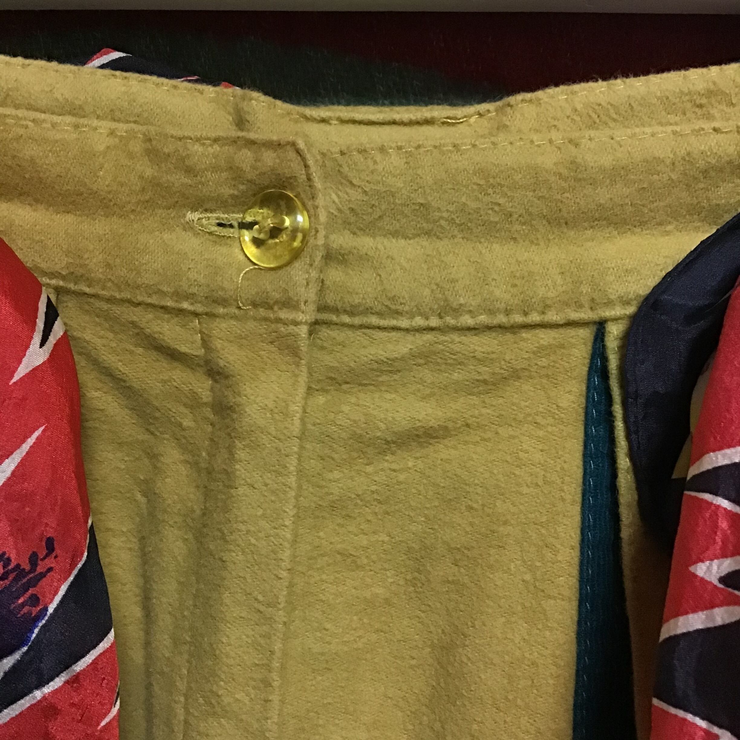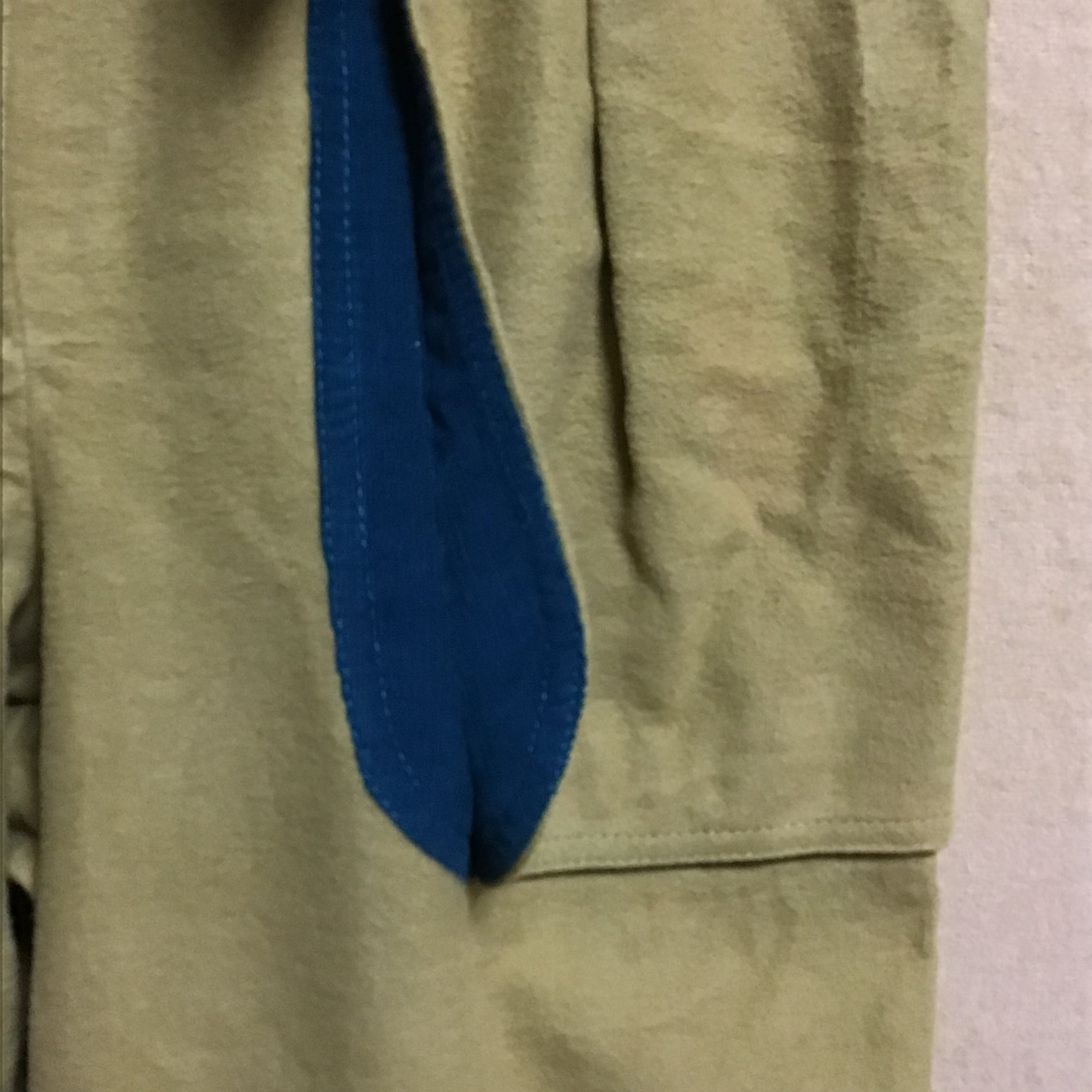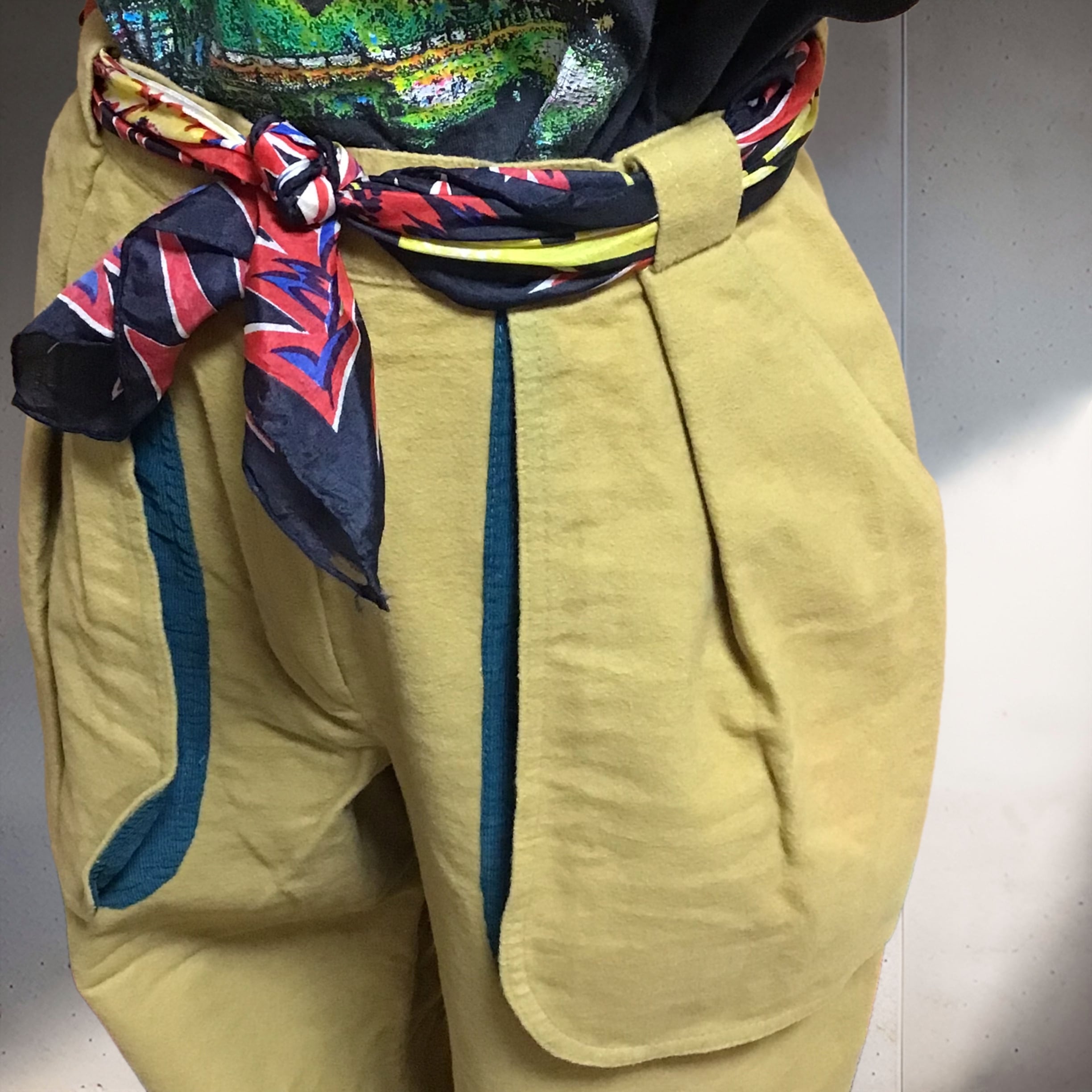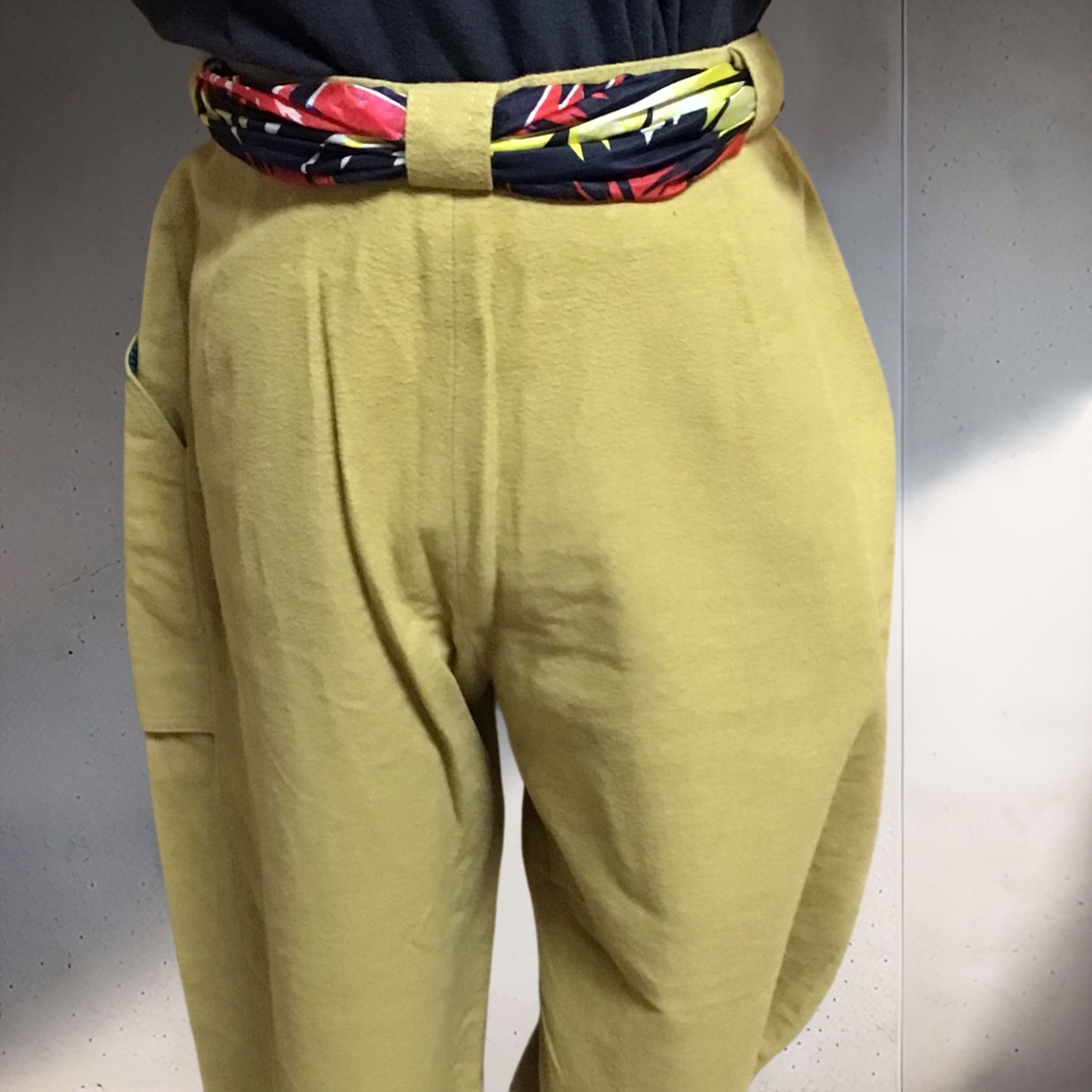 コットンネルのハイウエストパンツ、大きめのポケットが立体的でちらりと覗くブルーグリーンがポイントになっています♡少し起毛したネル素材が温かみもありリラックス感のあるコーディネートができそうです◎写真の様にベルトの代わりのスカーフを使っても素敵です!