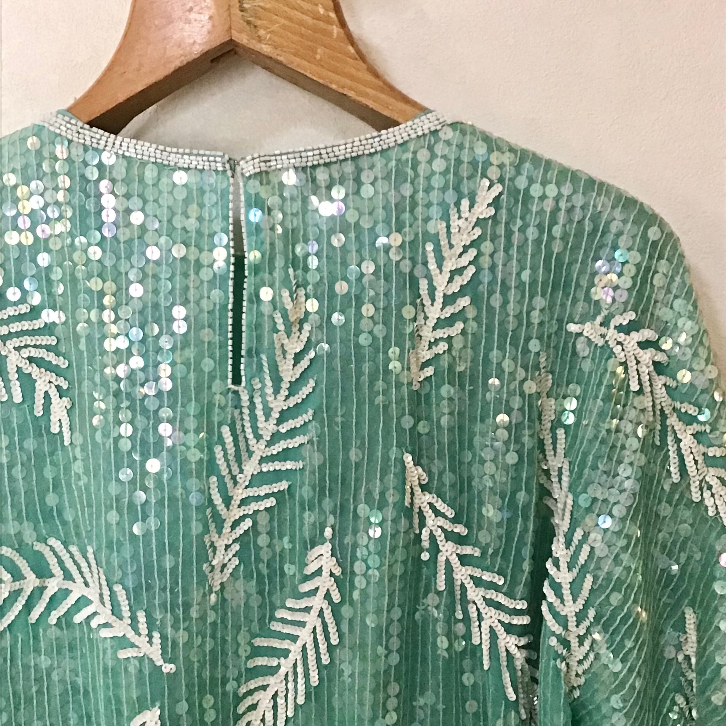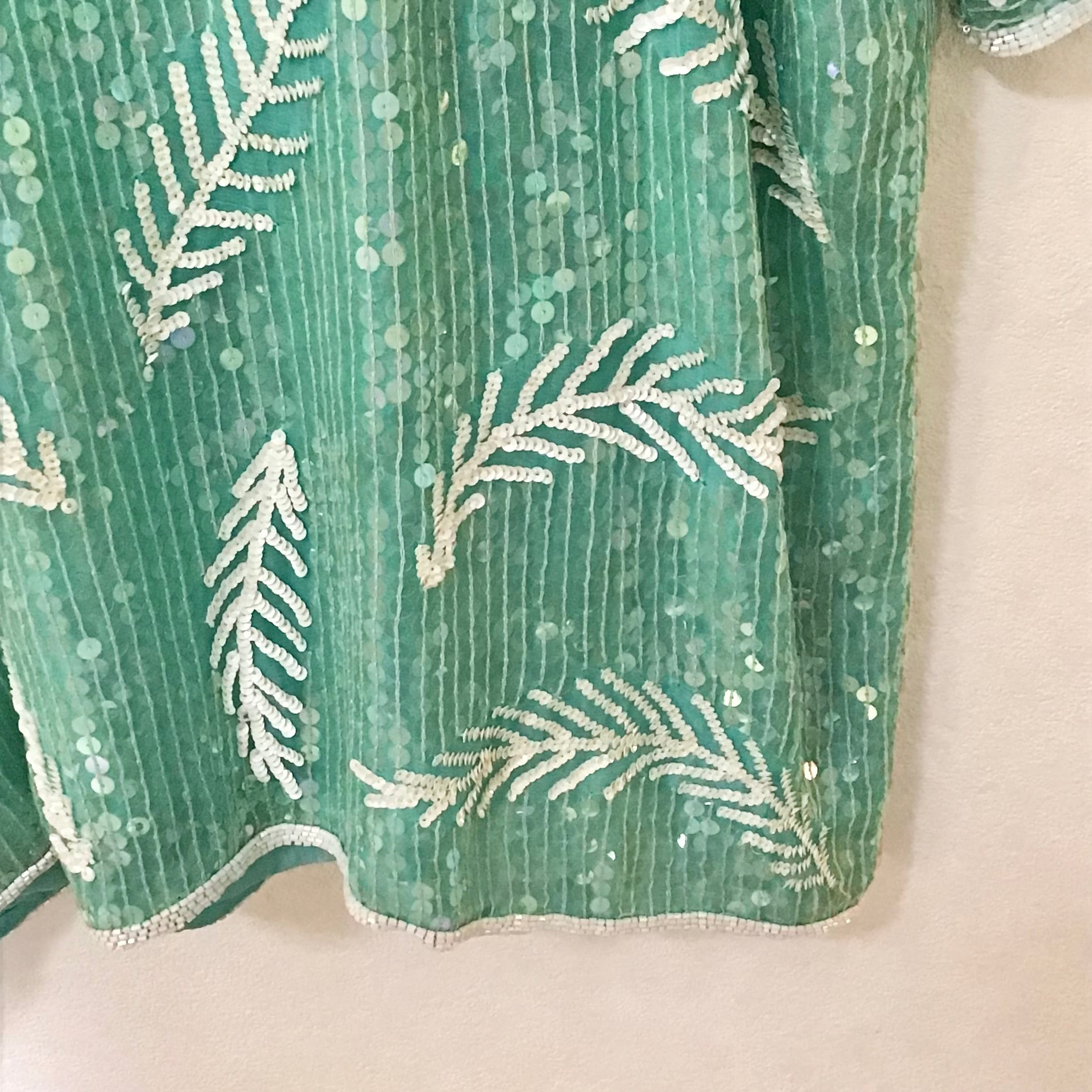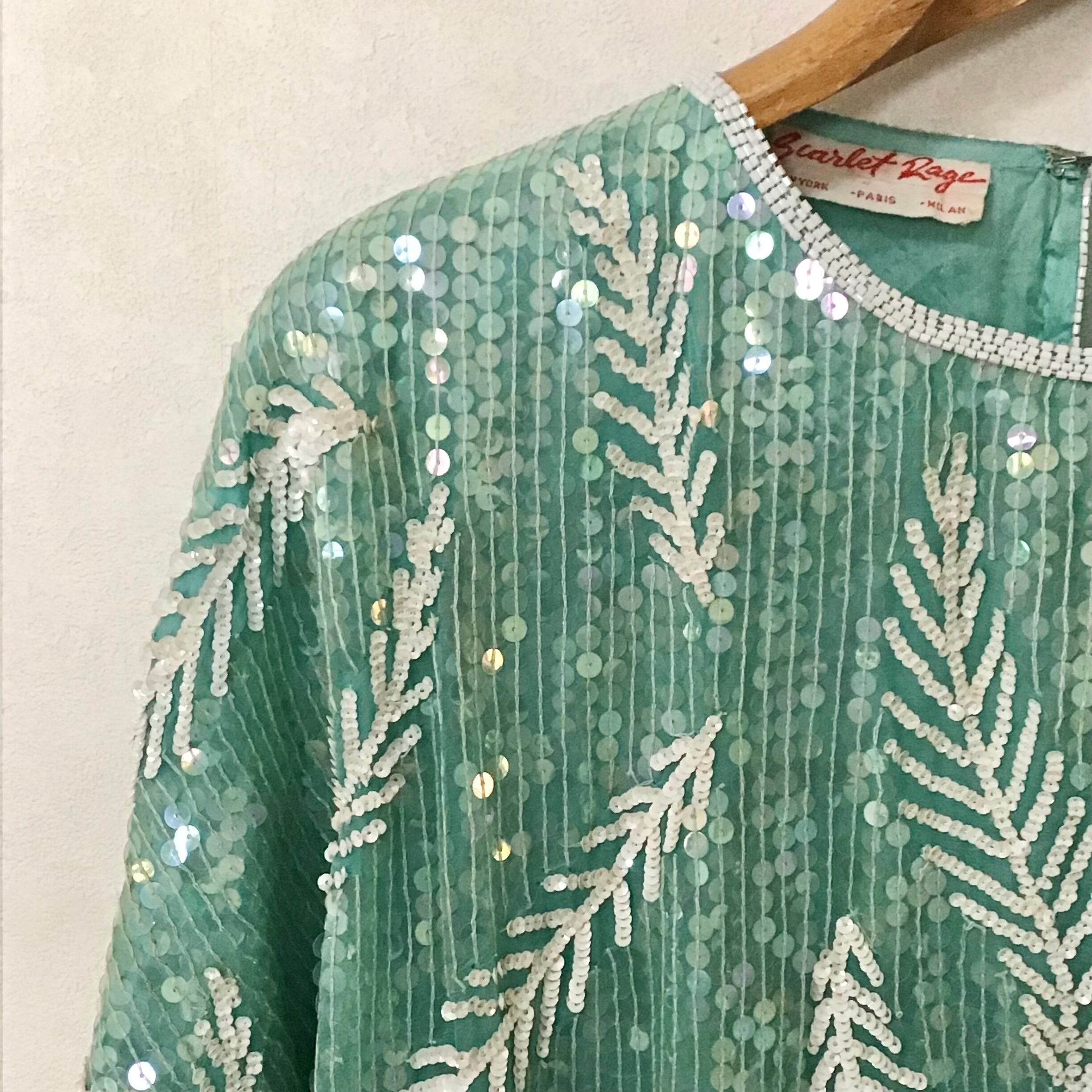 1970年代のスパンコールトップス、シルク地にびっしりと入ったクリアなスパンコールの中にシダの様な柄が浮き出るデザイン。光の加減でキラキラと光るクリアなスパンコールがとても美しいです♡ミントグリーンと白の組み合わせも爽やかで潔く、首や袖口の小さなビーズも繊細で素敵です!