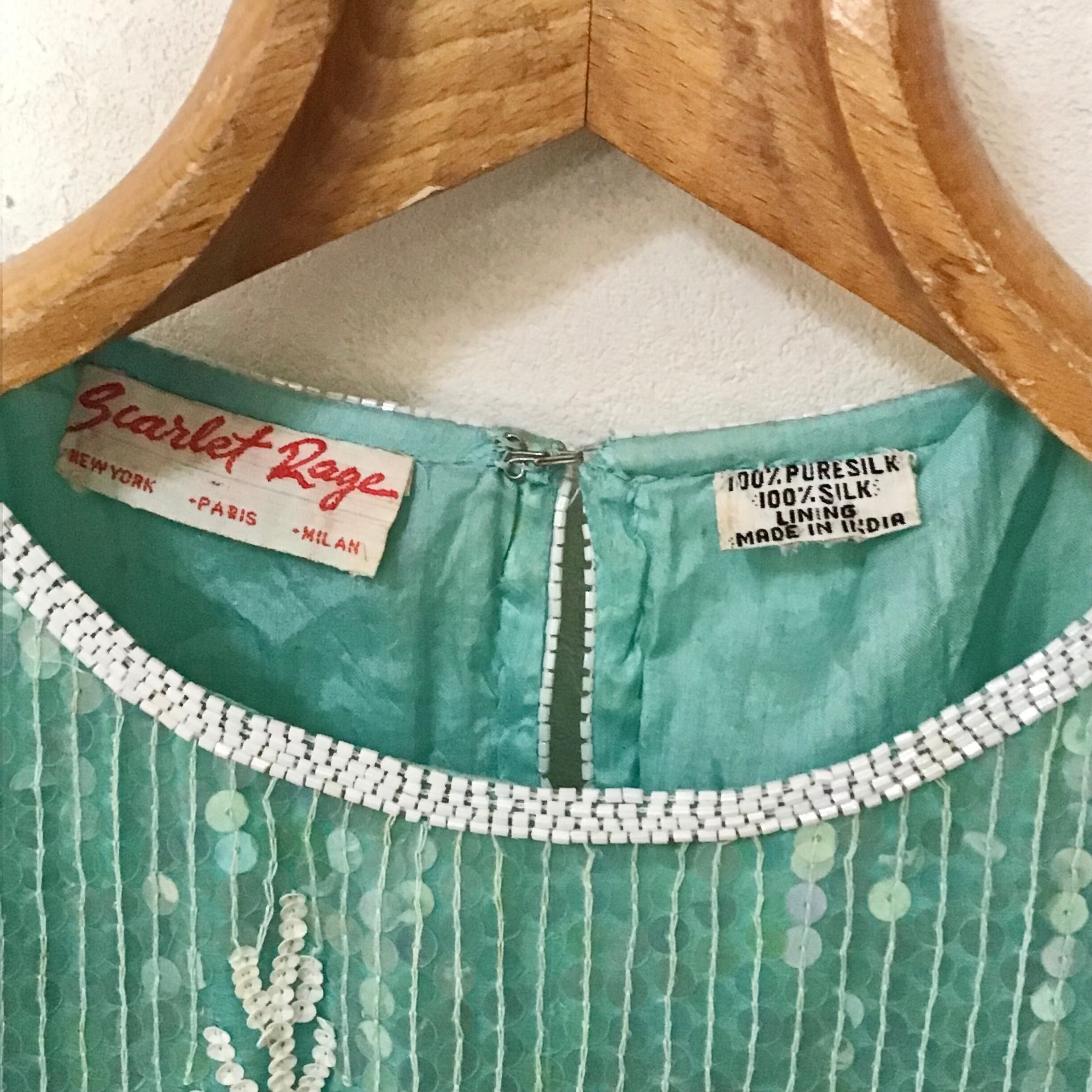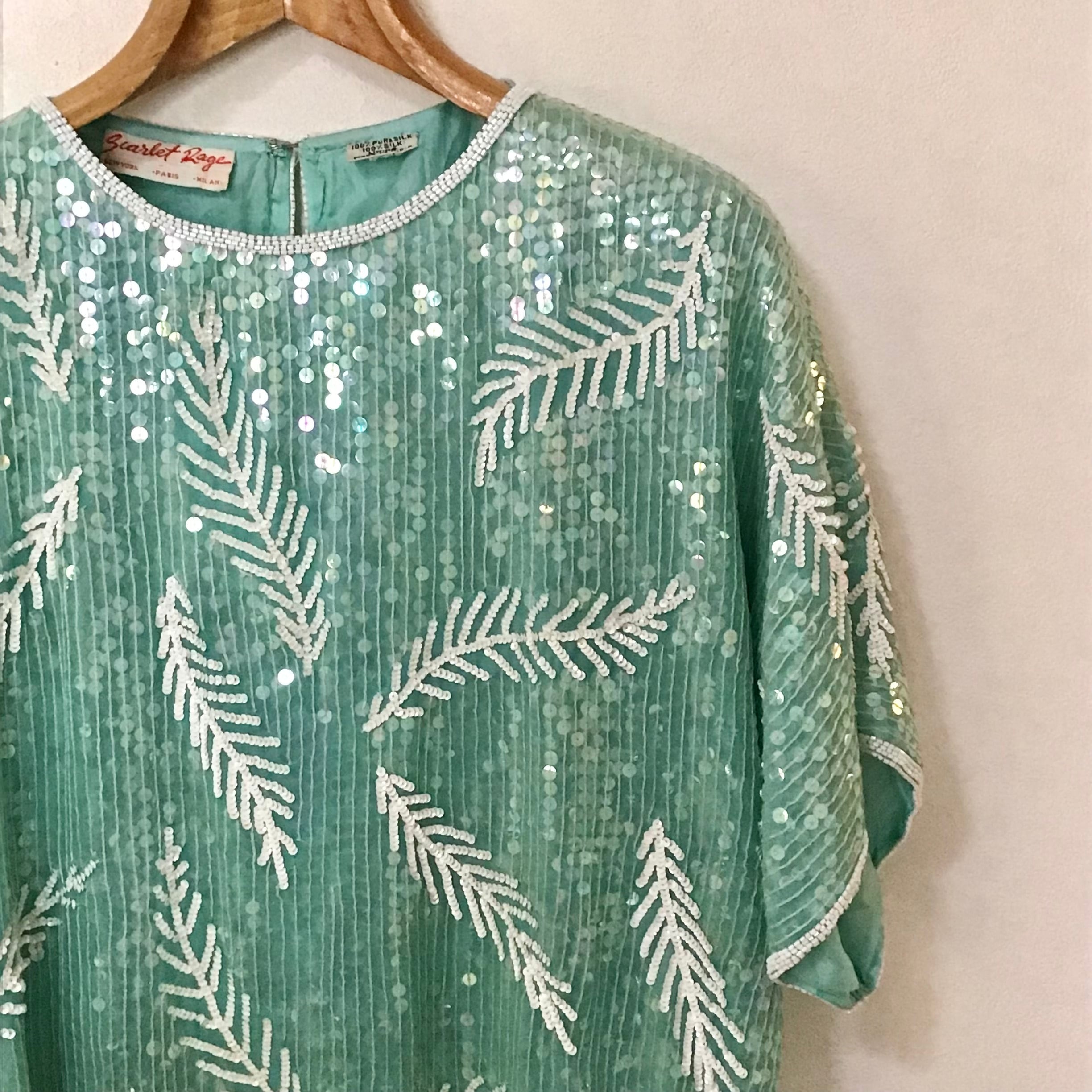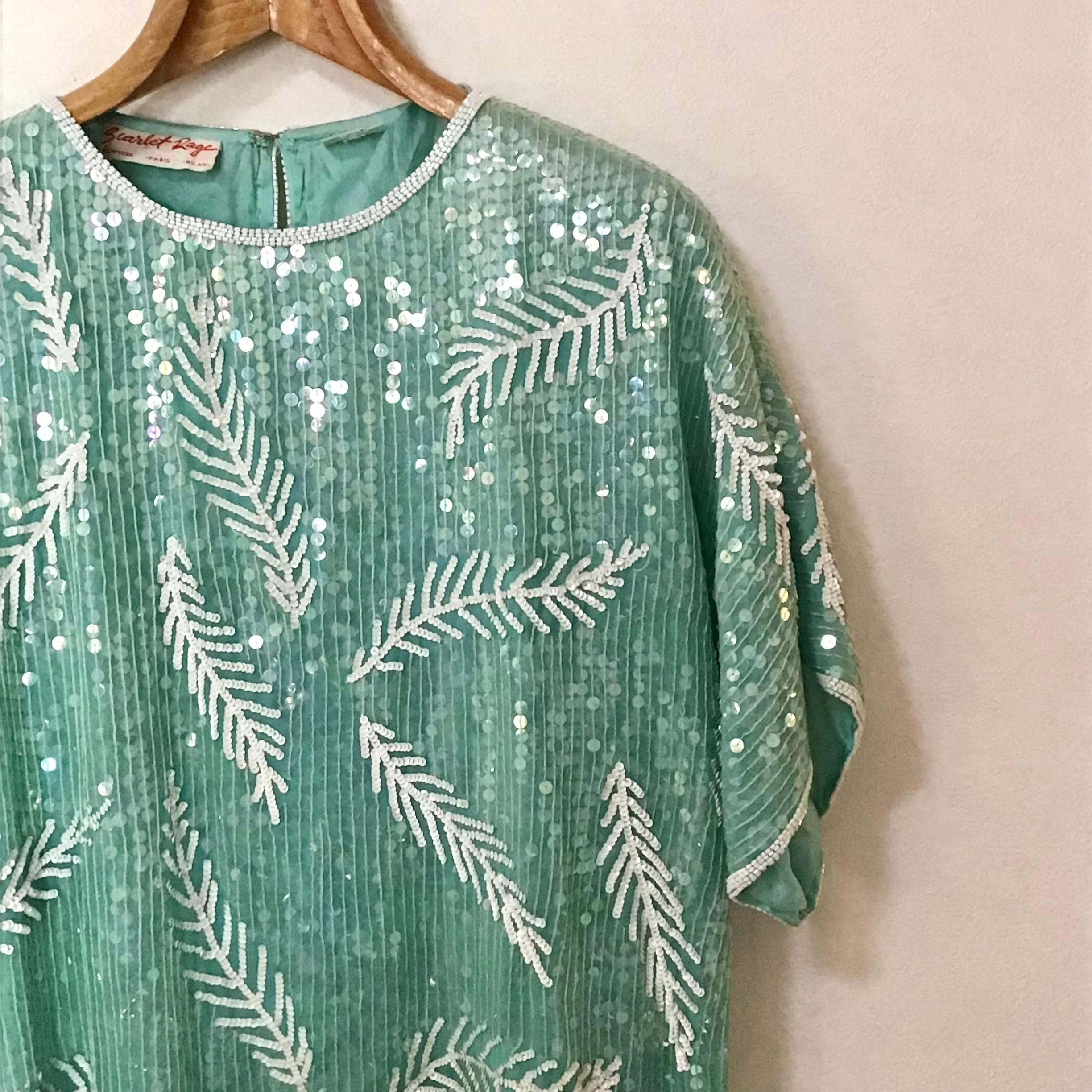1970年代のスパンコールトップス、シルク地にびっしりと入ったクリアなスパンコールの中にシダの様な柄が浮き出るデザイン。光の加減でキラキラと光るクリアなスパンコールがとても美しいです♡ミントグリーンと白の組み合わせも爽やかで潔く、首や袖口の小さなビーズも繊細で素敵です!
