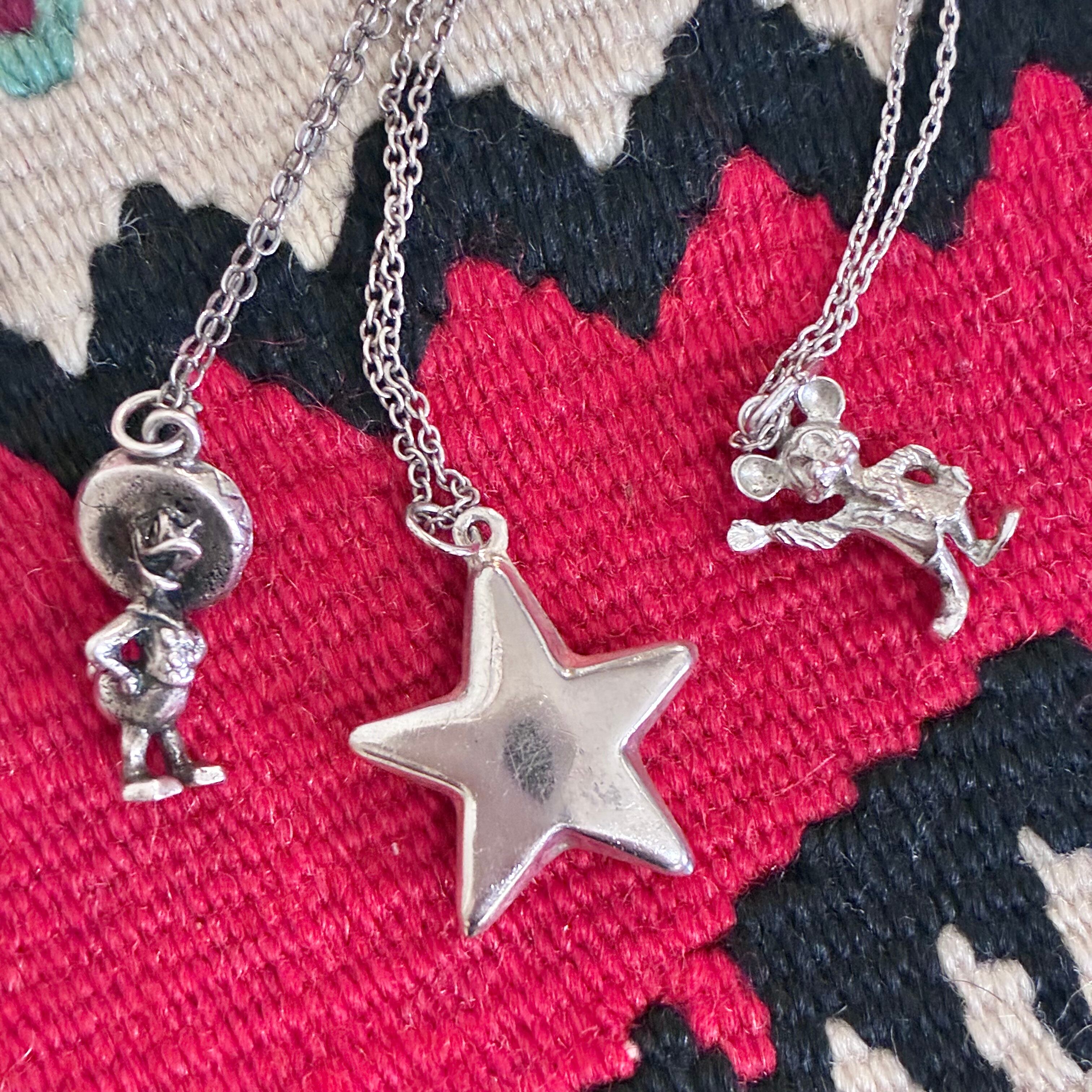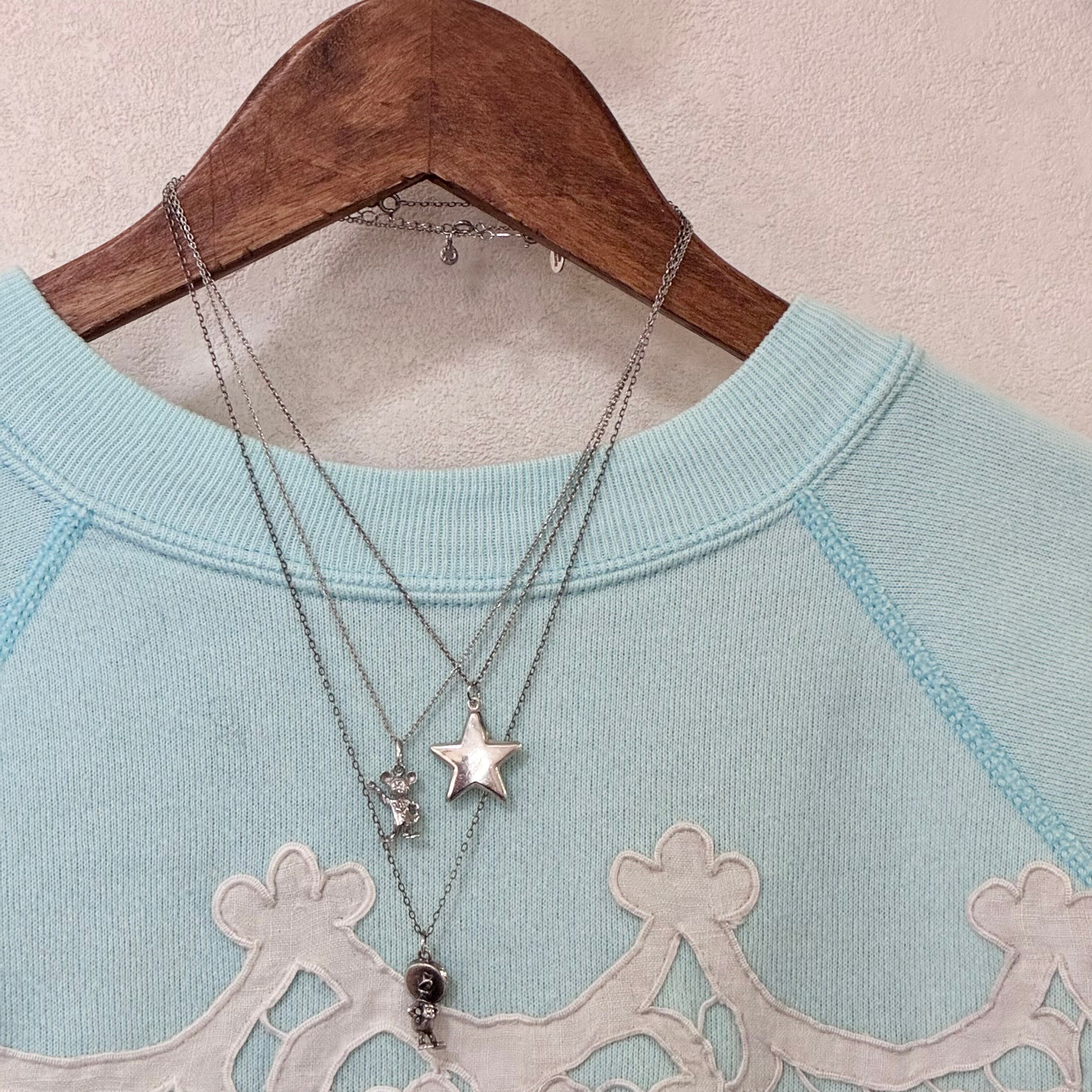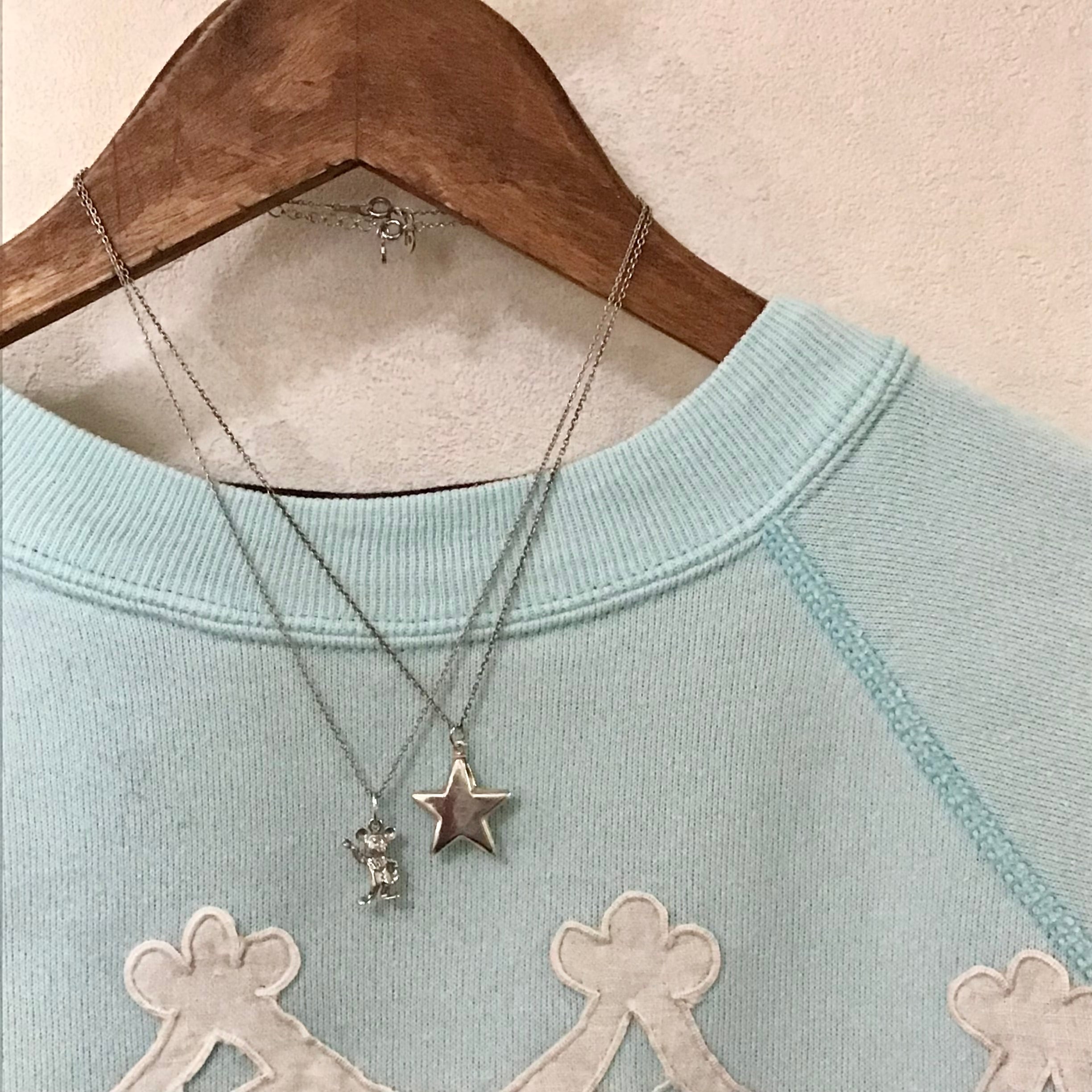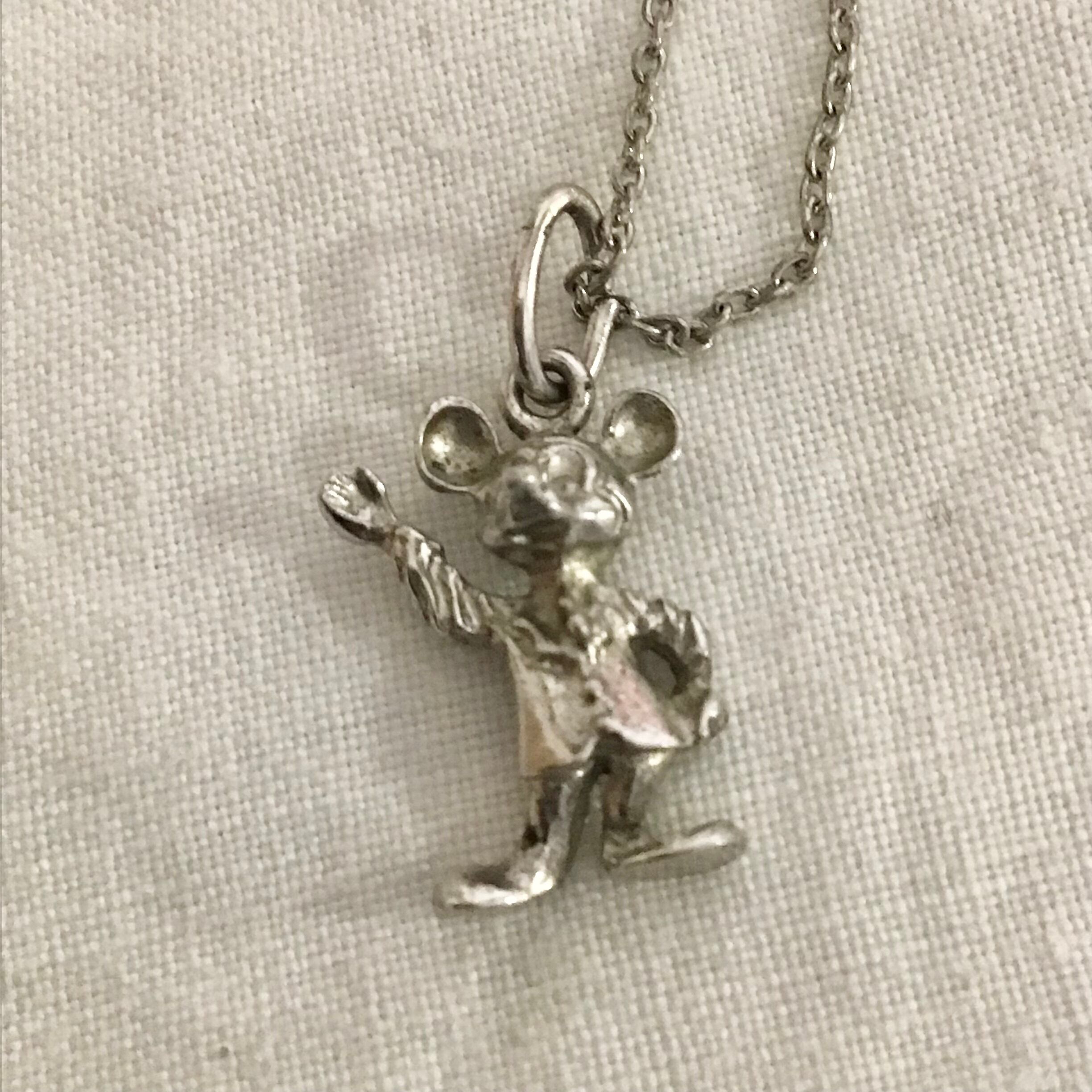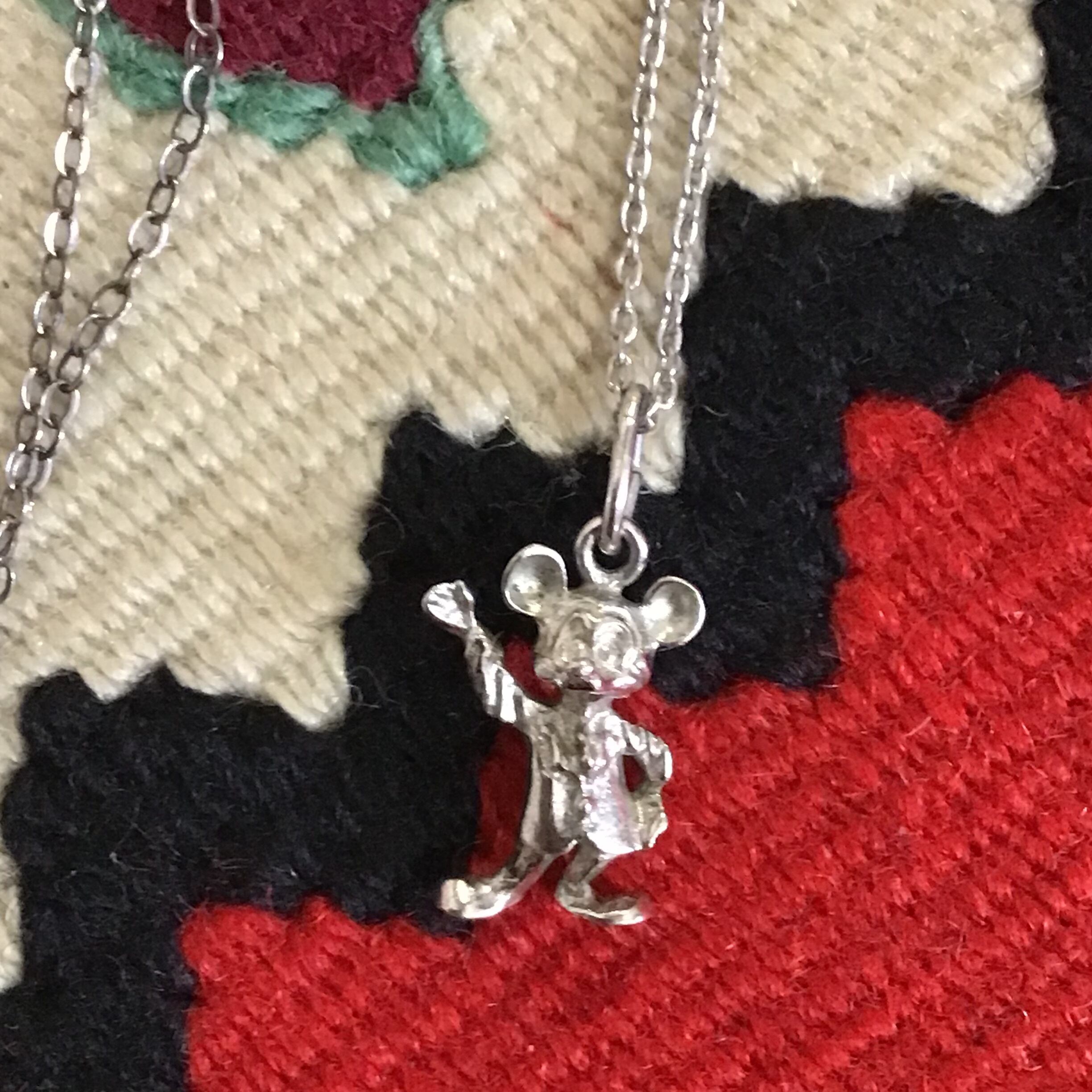 ヴィンテージネックレス、サイズ調節可能のチェーンとチャーム共にシルバー925製です。陽気に手を挙げるポーズがとっても可愛いらしく、お顔やジャケットのドレープなど細部までこだわって作られていると思います♡手持ちのチャームを足してオリジナル感のあるネックレスにするのも楽しいです◎ミッキー好きさんへのギフトにも!