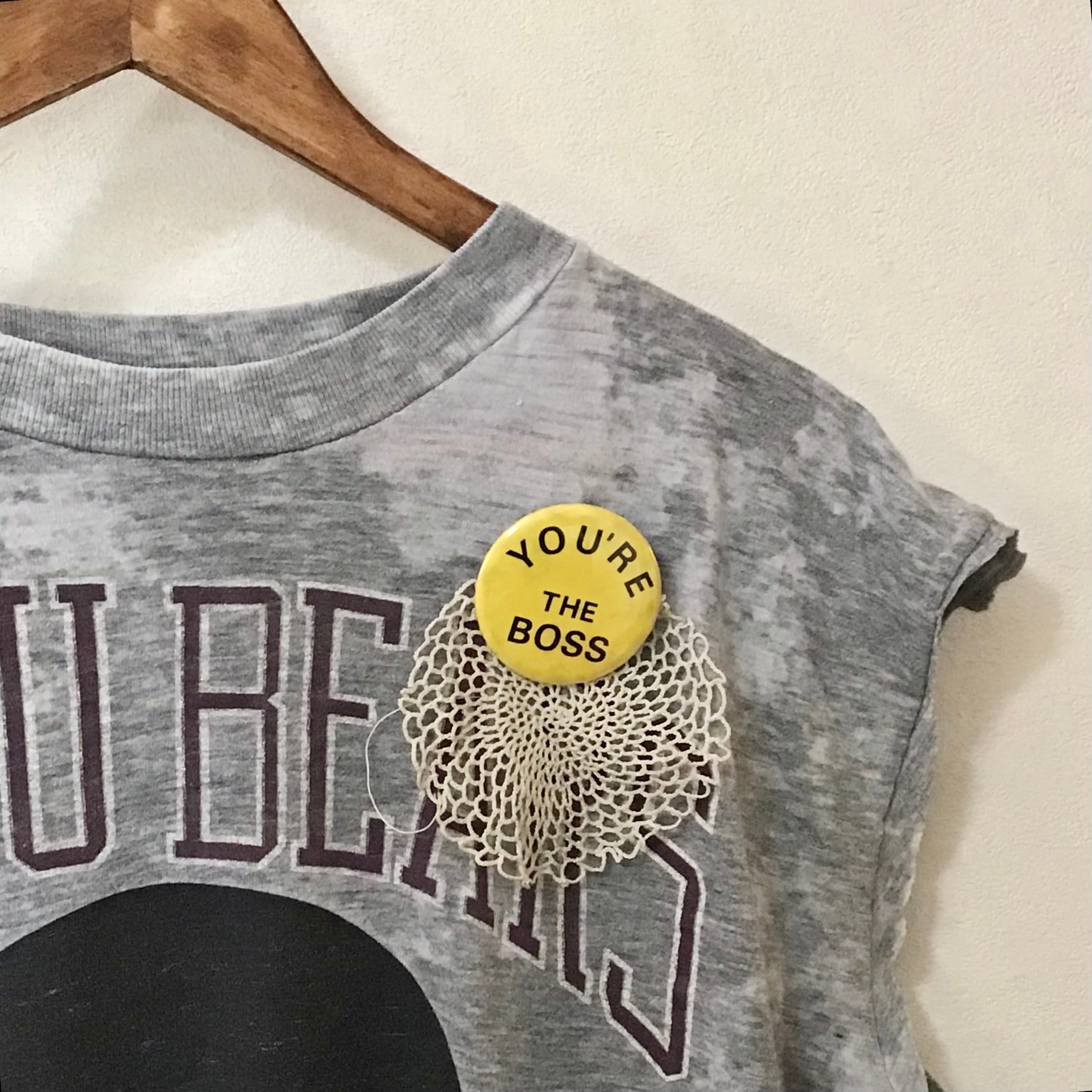 イエロー×ブルーが爽やかな缶バッジです。ボスへのアピールにも使えそうなユニークなデザイン♡ジャケットやスウェット、ニットに合いそうです◎写真のようにレースモチーフと組み合わせても可愛いです!
