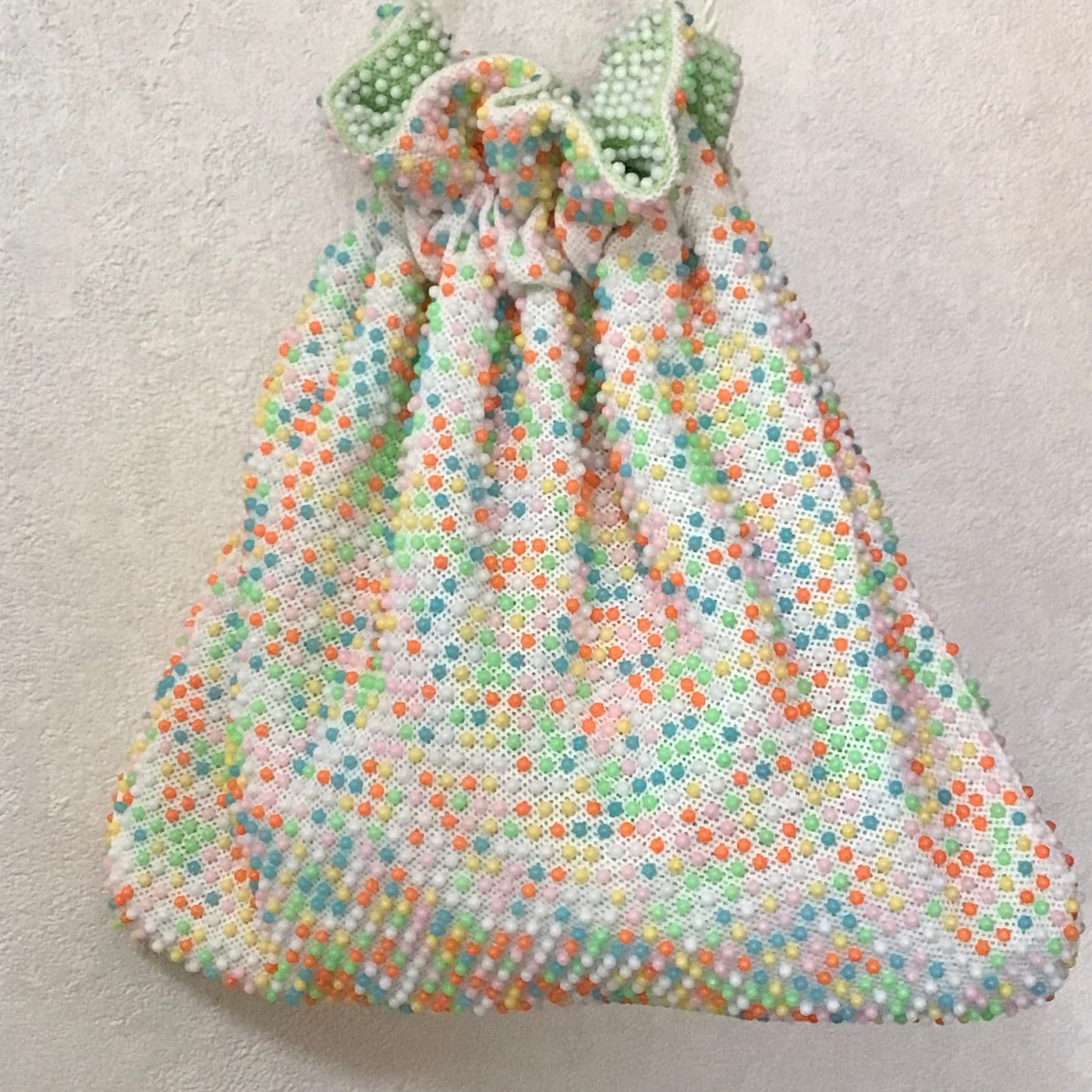 1960年代のプラスチックビーズバッグです。こちらはリバーシブルで、それぞれカラーやビーズのサイズも異なりどちらも可愛いです♡Tシャツにデニムのゆるっとしたコーディネートに合わせたり、バッグインバッグとしても◎