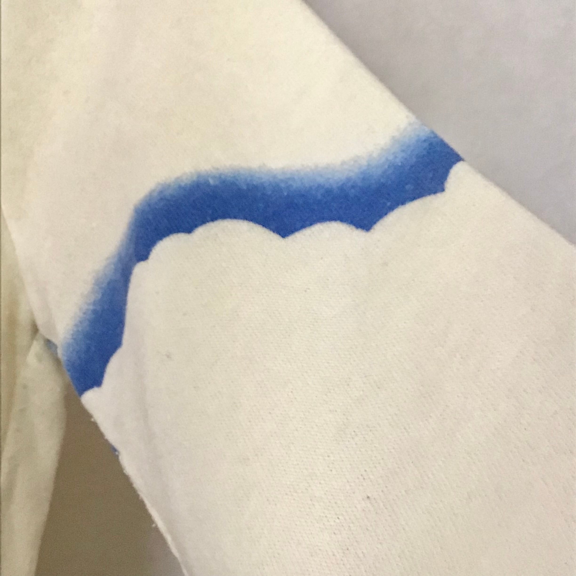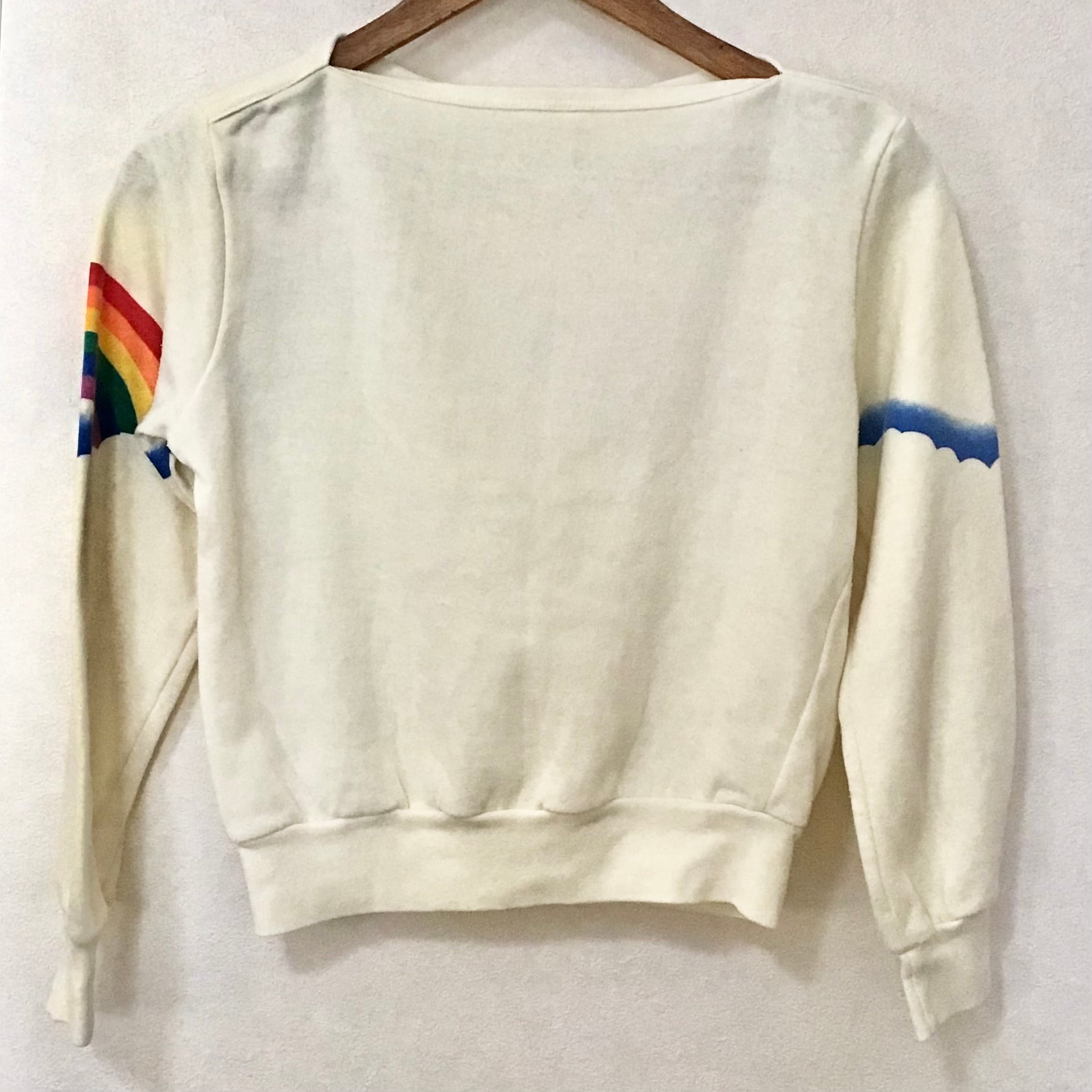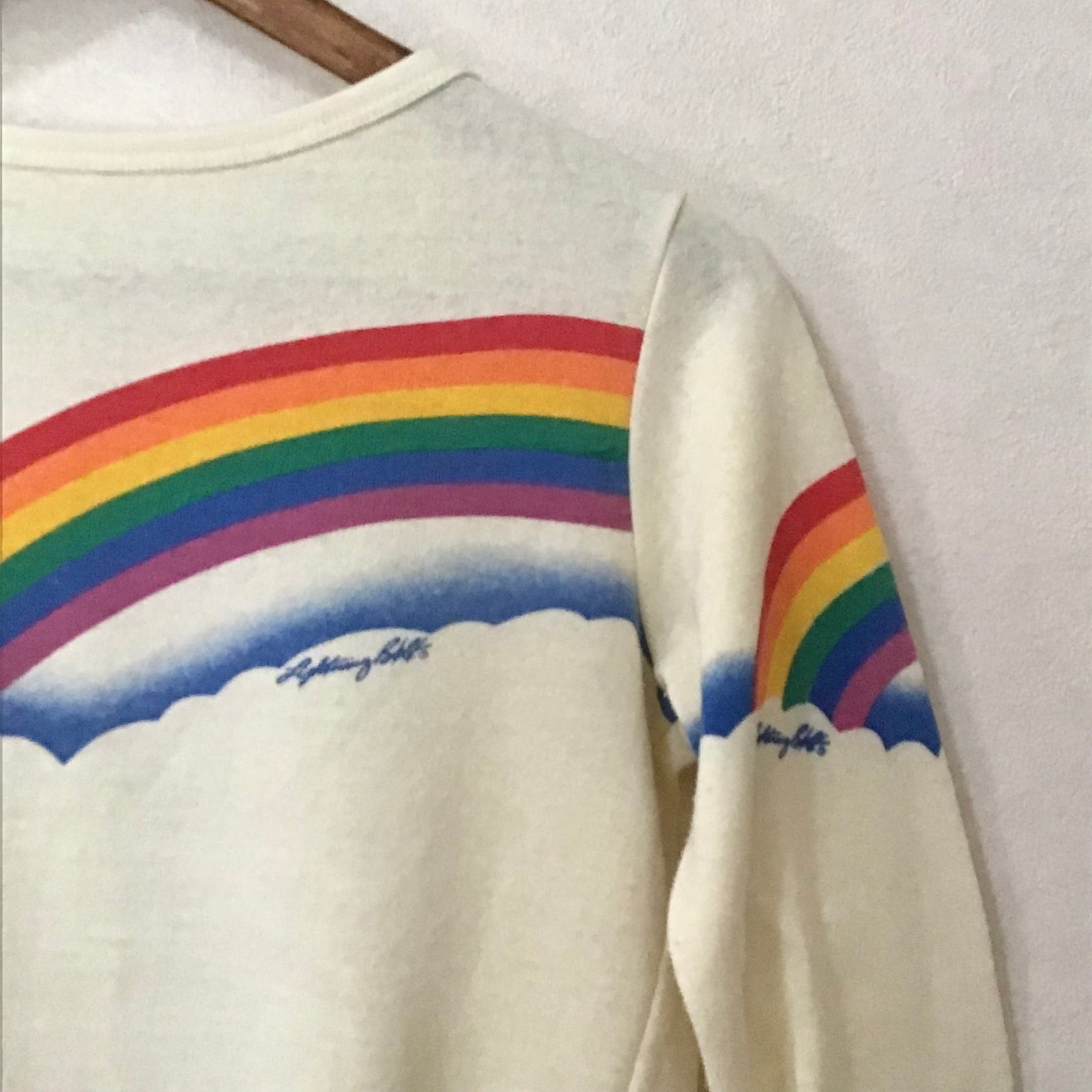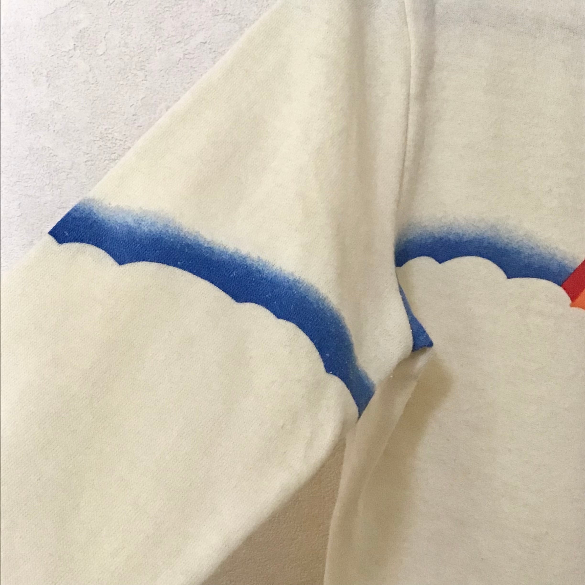 1970年代のスウェット、Lightning Boltの物です。袖から繋がって入る雲や虹のプリントがとても雰囲気良く、首はスウェットには珍しいボートネックでスッキリとしています♡コンパクトサイズでロングスカートや太めのパンツに合いそうです◎ハッピーな気分になるスウェット、おすすめです!