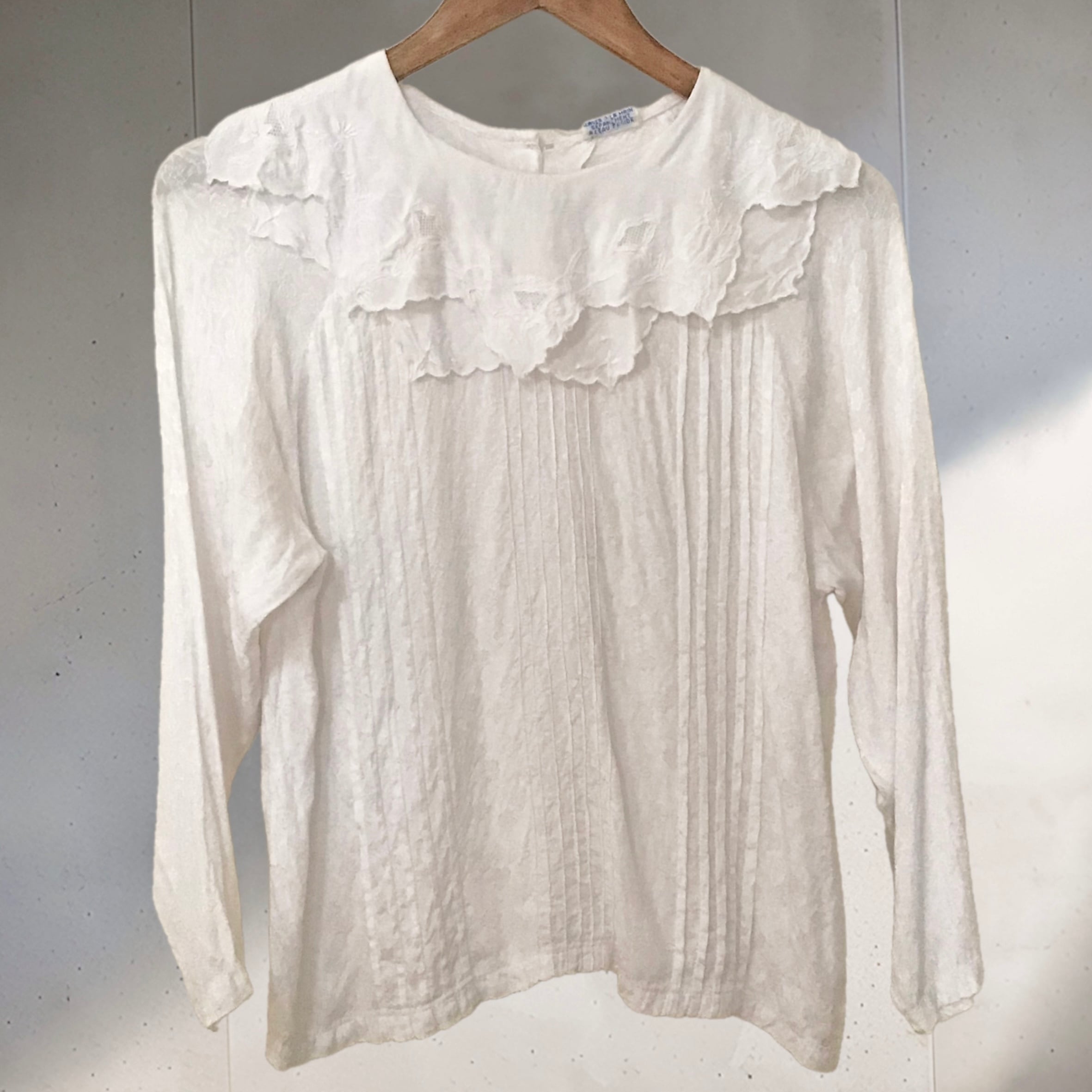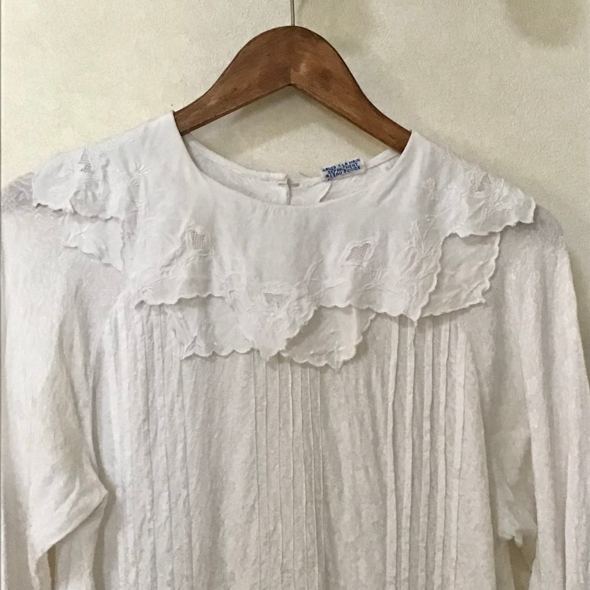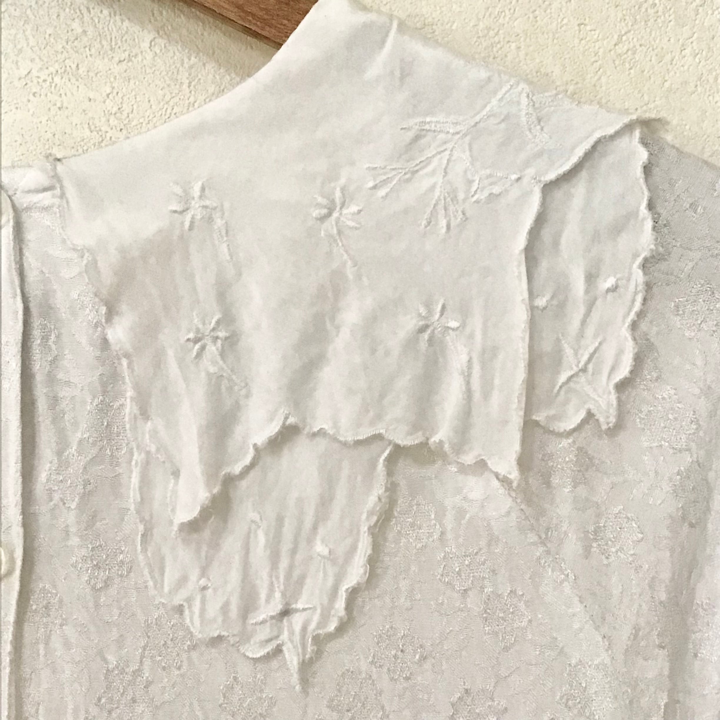 ビスコースのブラウス、二重の襟や後ろボタンのデザインが雰囲気の良いお品です♡織柄の入った生地や襟の刺繍が可愛らしく、スウェットやニットに合わせて襟を出すのもおすすめです◎とろみのあるビスコースが柔らかく、重ね着もしやすいです!