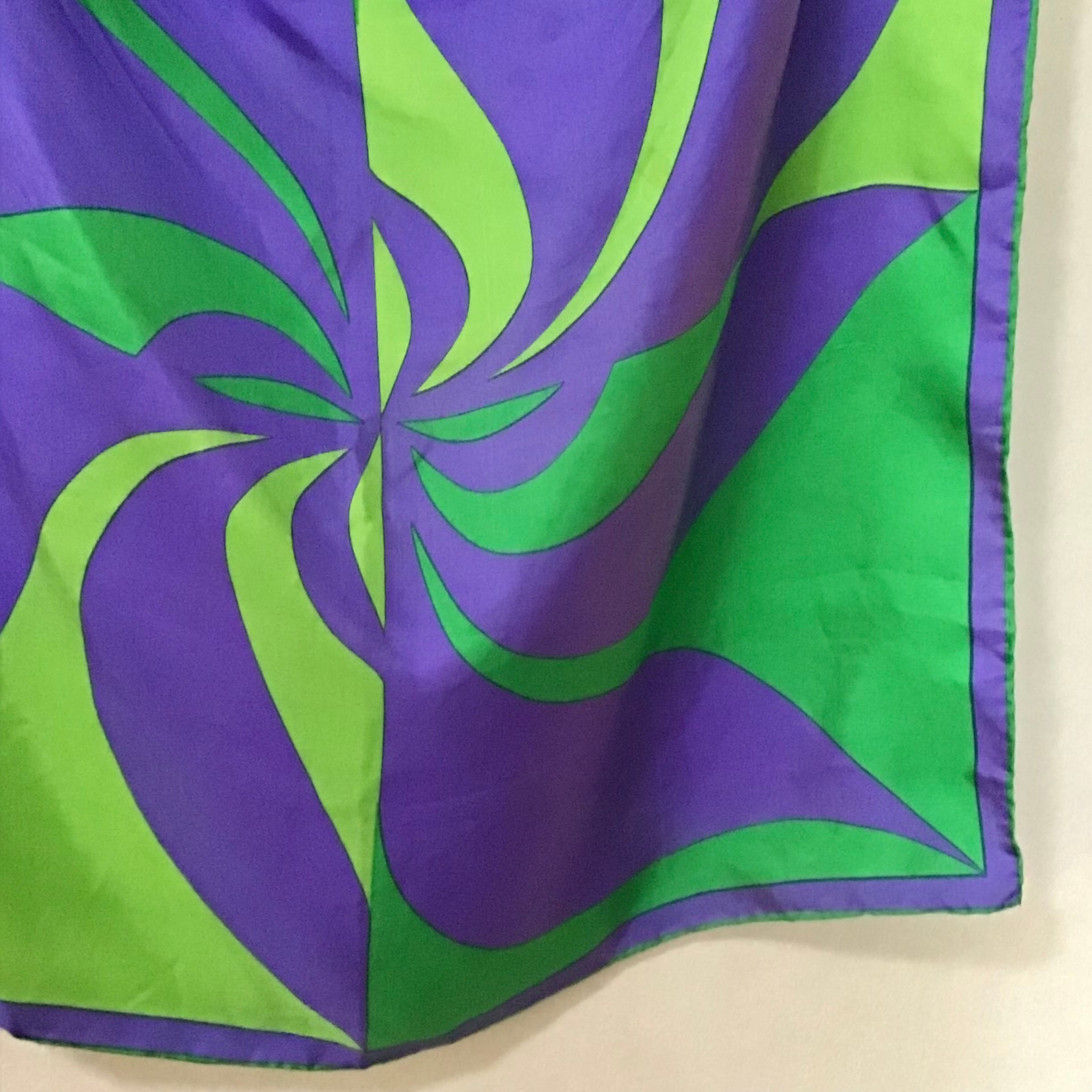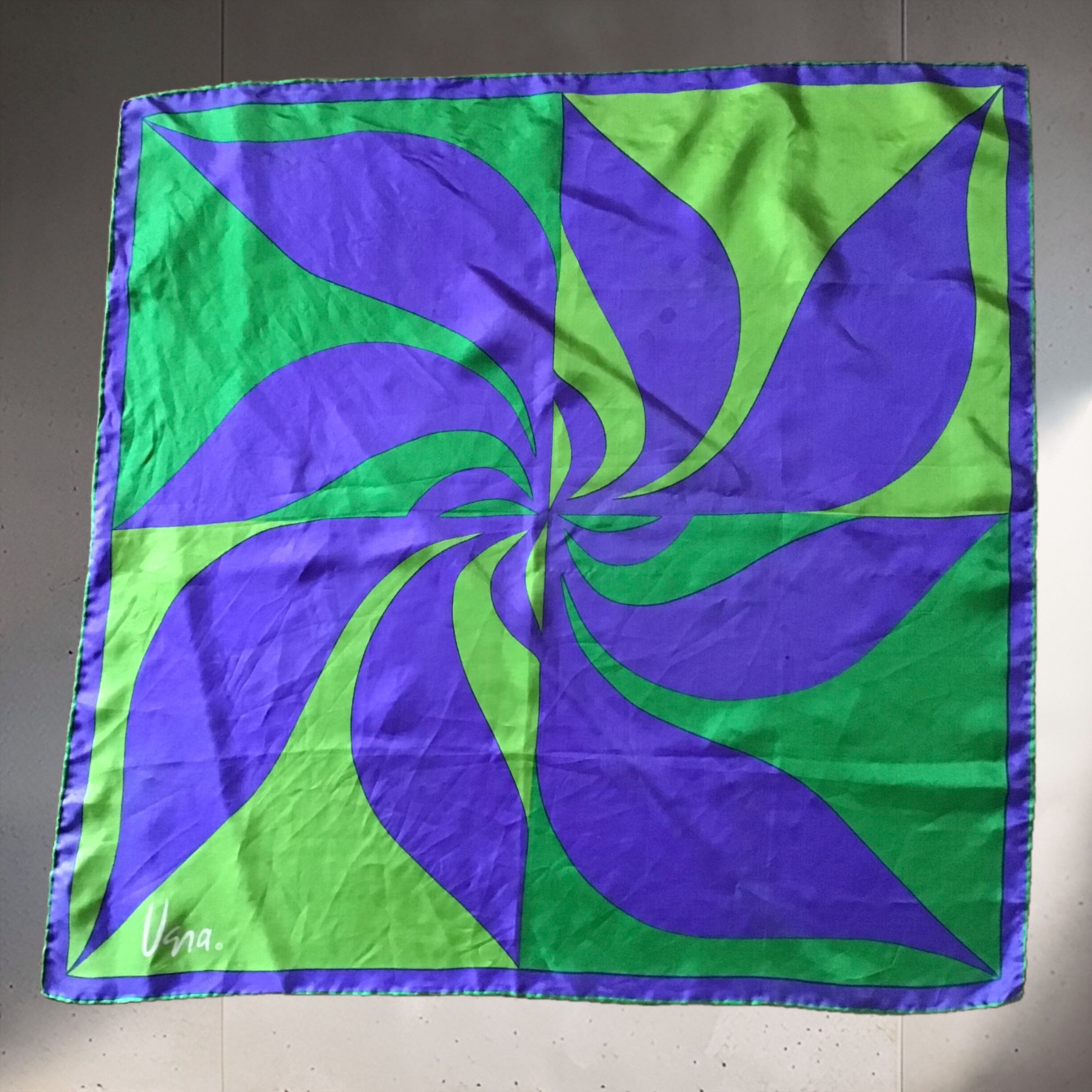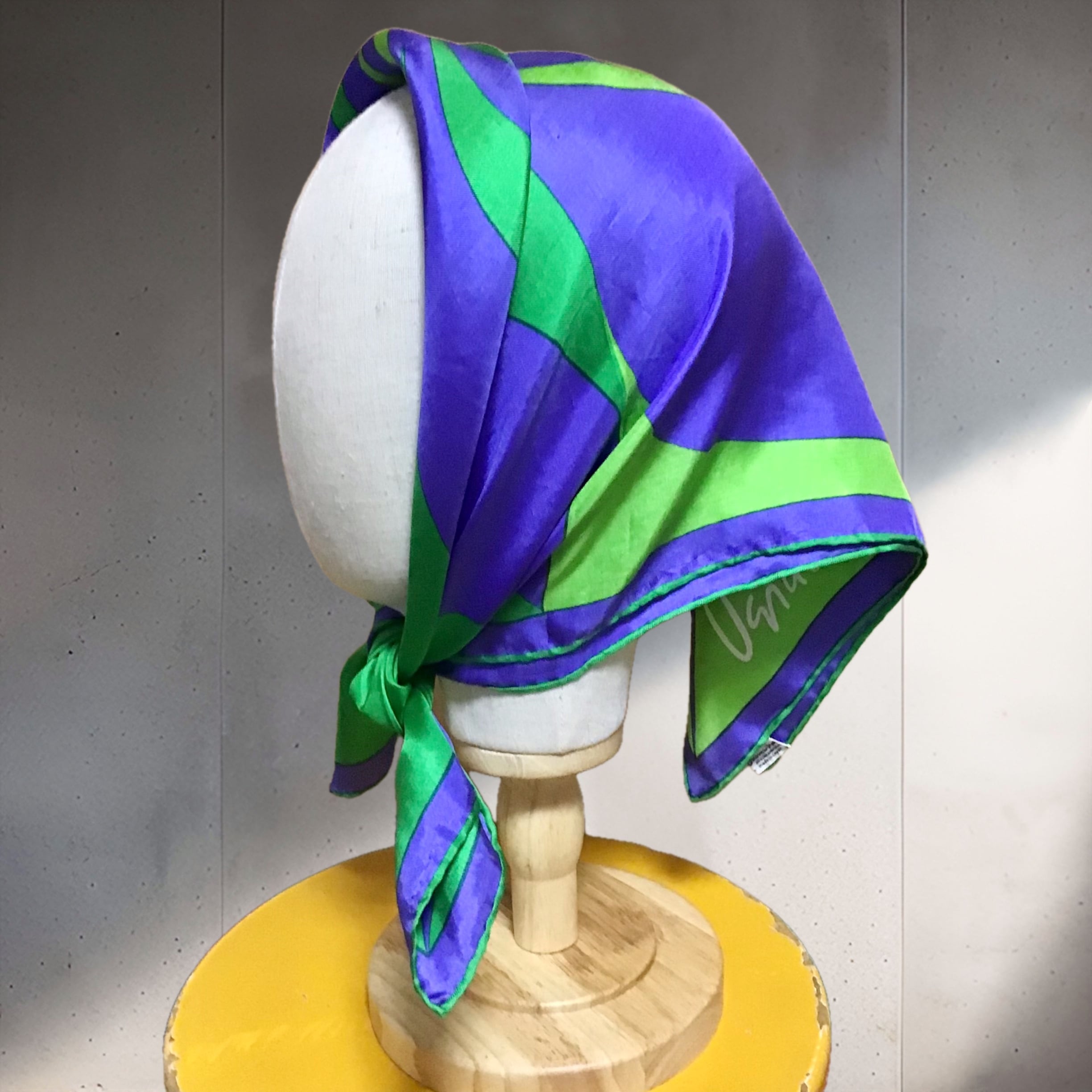 ベラのシルクスカーフ。発色の良いグリーンとパープルの渦巻きデザインが綺麗で、巻いた時の色の出方も良いです♡頭に巻いたり、写真の様にお手持ちのリングを使ったアレンジもおすすめです◎