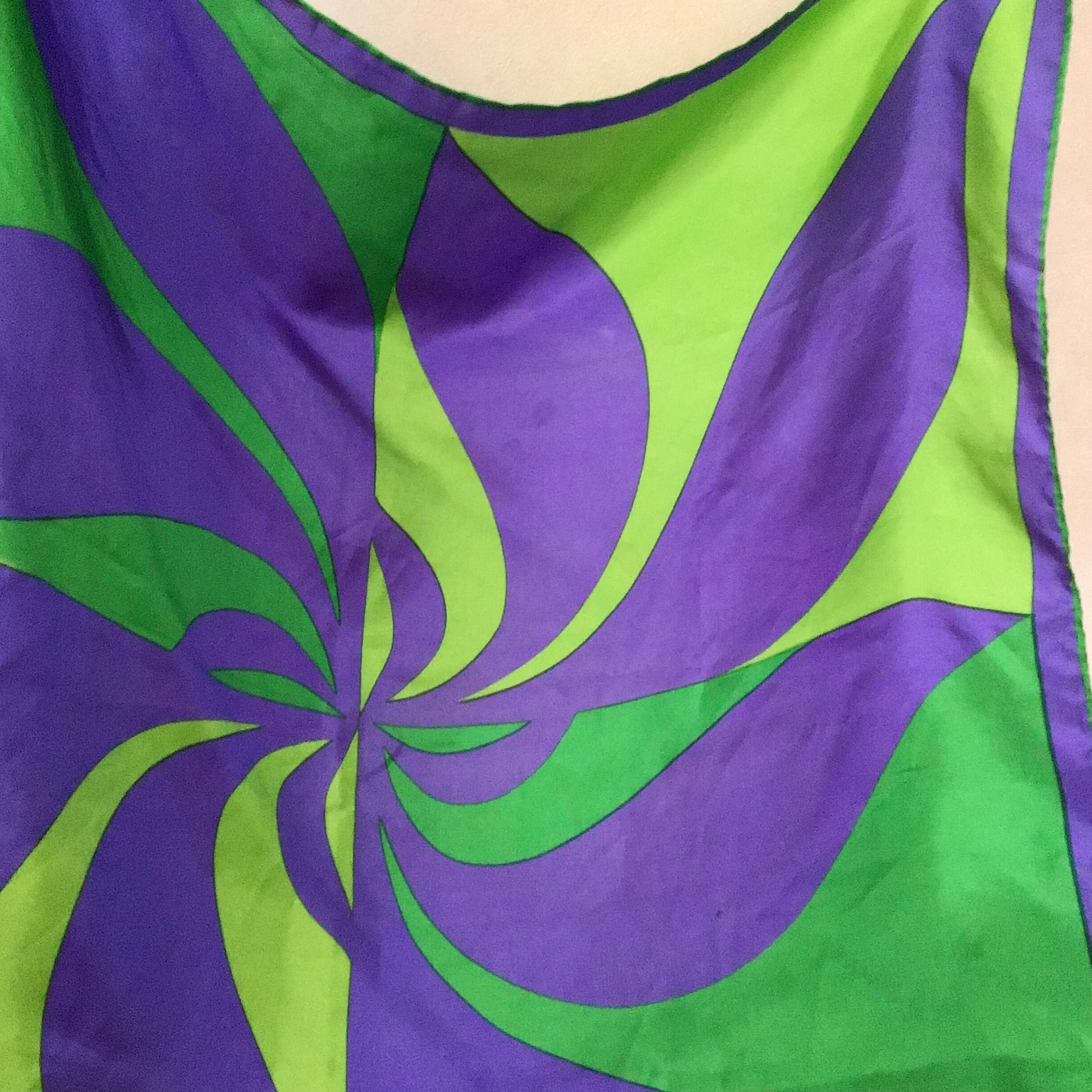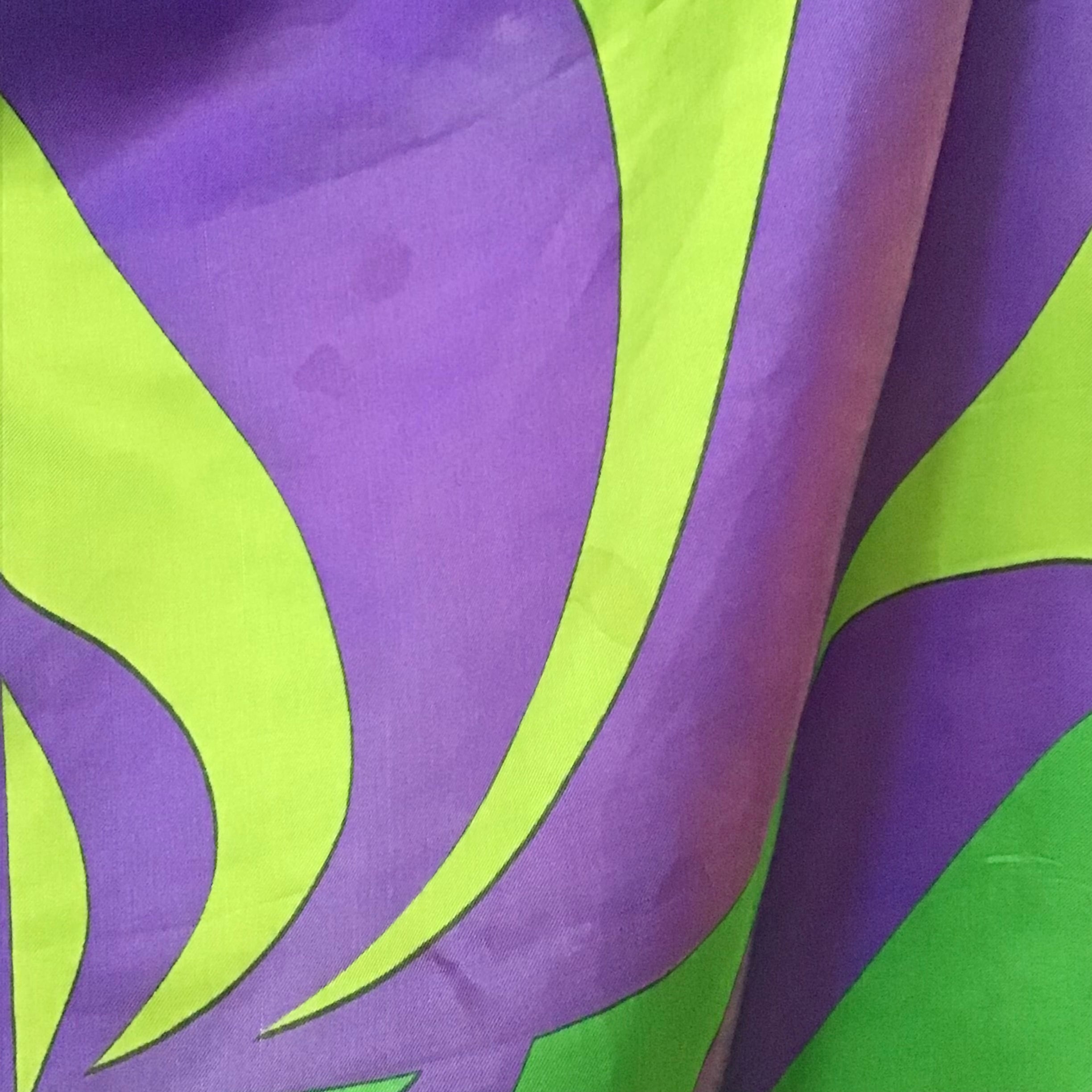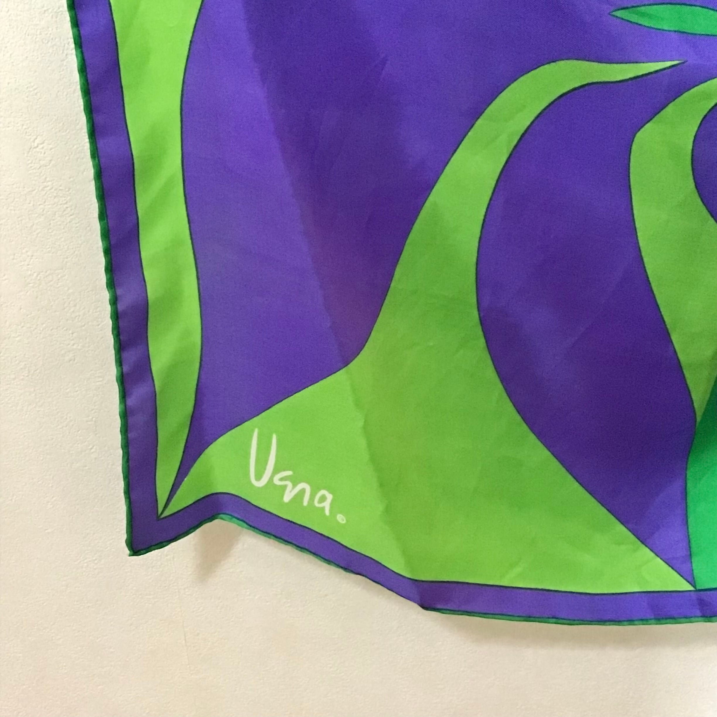 ベラのシルクスカーフ。発色の良いグリーンとパープルの渦巻きデザインが綺麗で、巻いた時の色の出方も良いです♡頭に巻いたり、写真の様にお手持ちのリングを使ったアレンジもおすすめです◎
