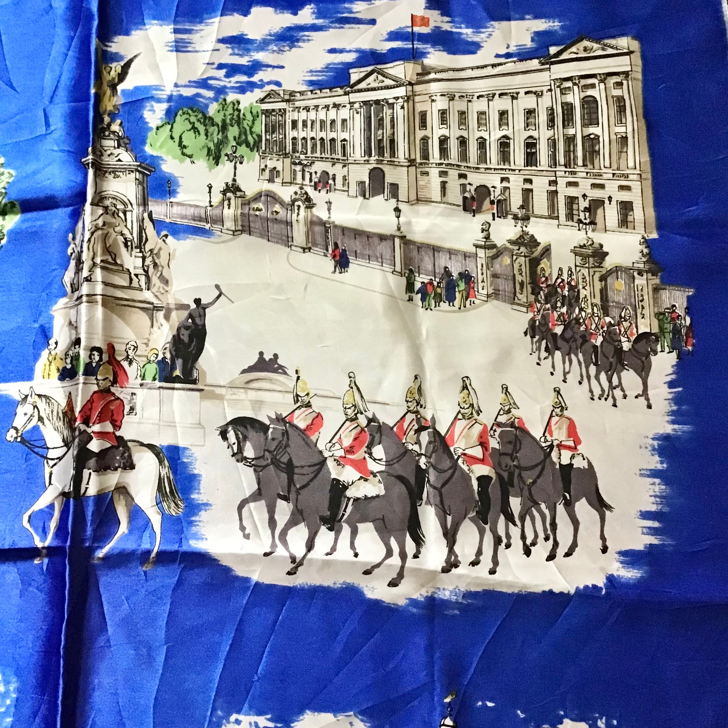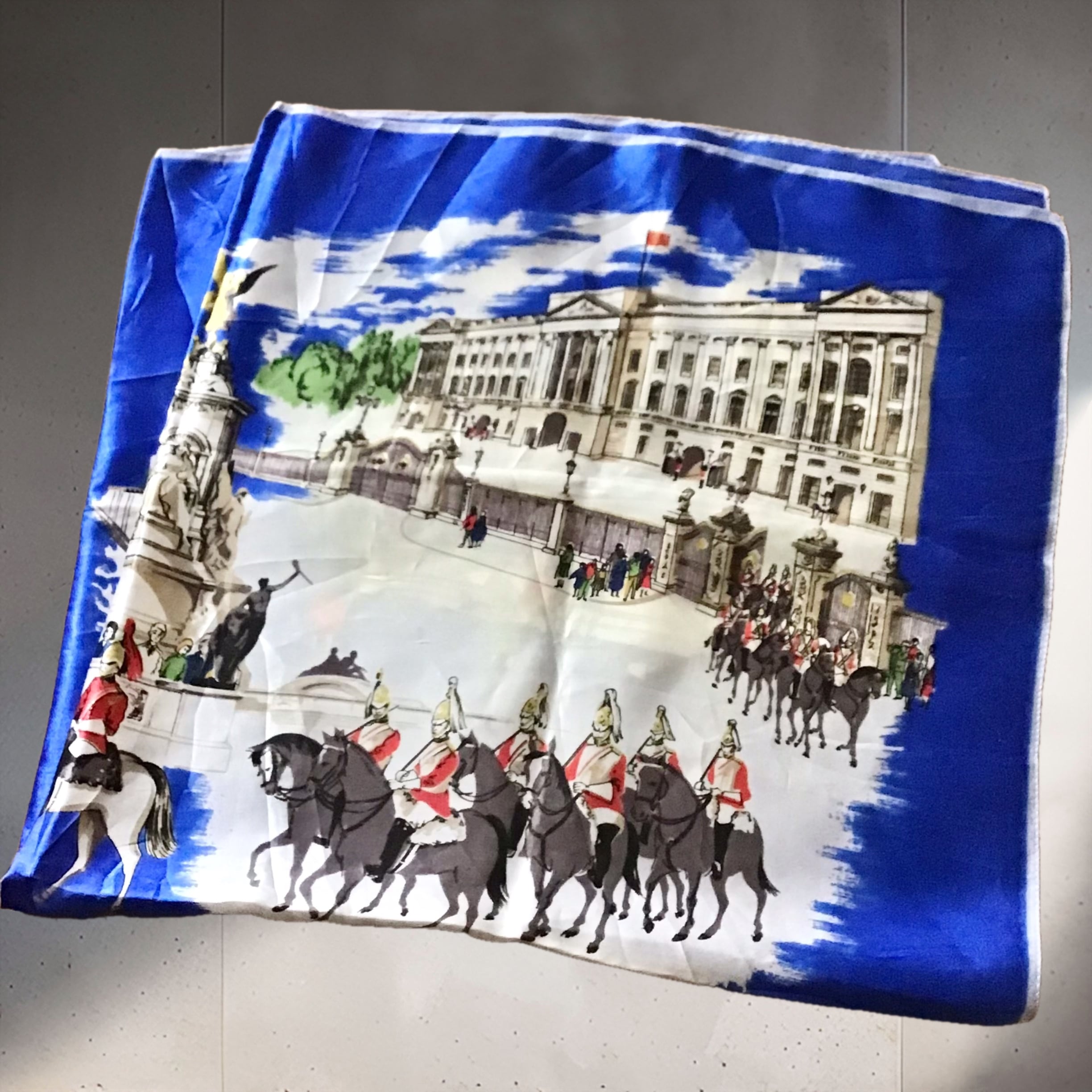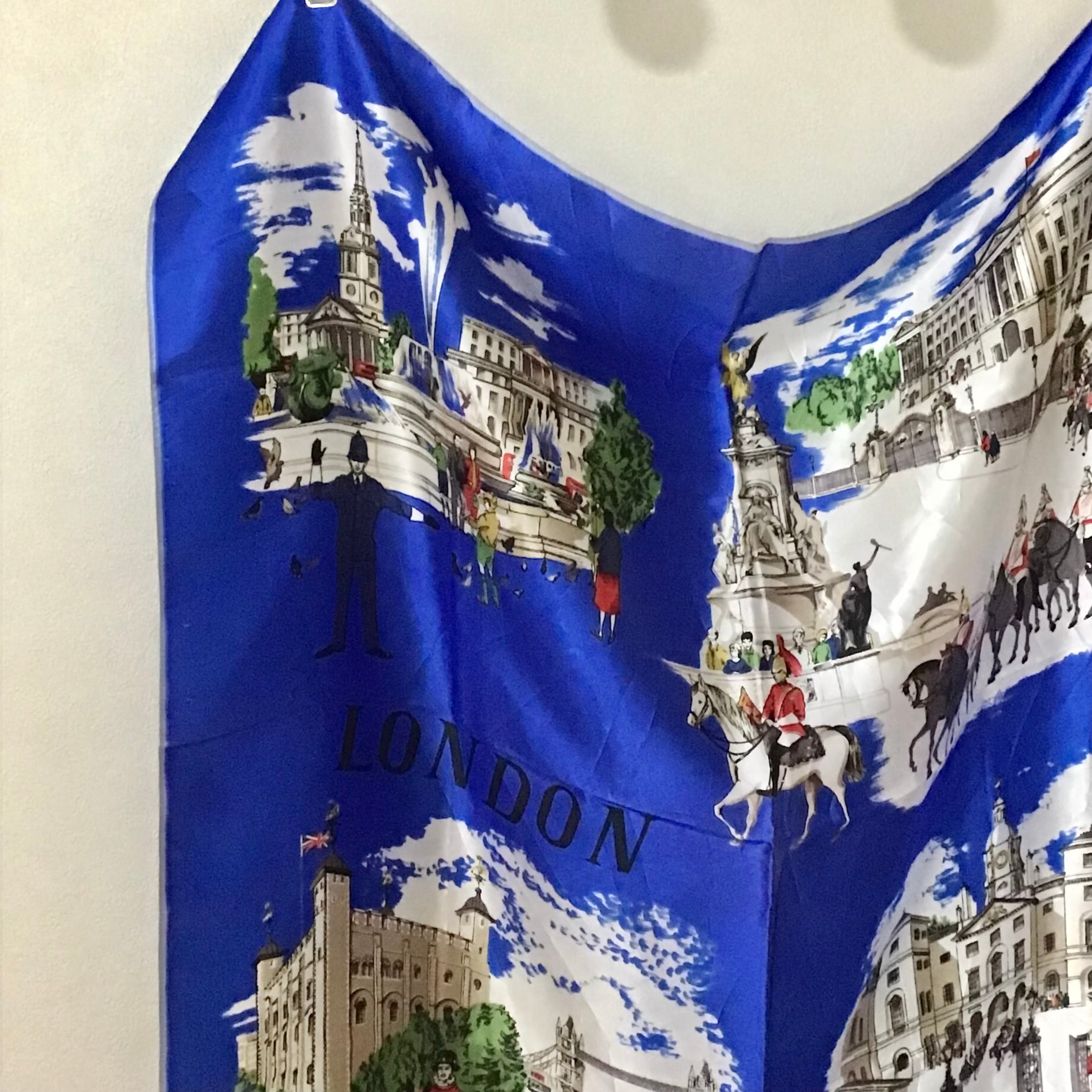 ロンドンのスーベニアスカーフ。こちらはシルクではありませんが、鮮やかなブルーやイラストのタッチも良くいのでご紹介です♡頭やバッグに巻いたり、写真の様にお手持ちのリングを使ったアレンジもおすすめです◎生地感もしっかりとしており気兼ねなく使って頂けると思います!