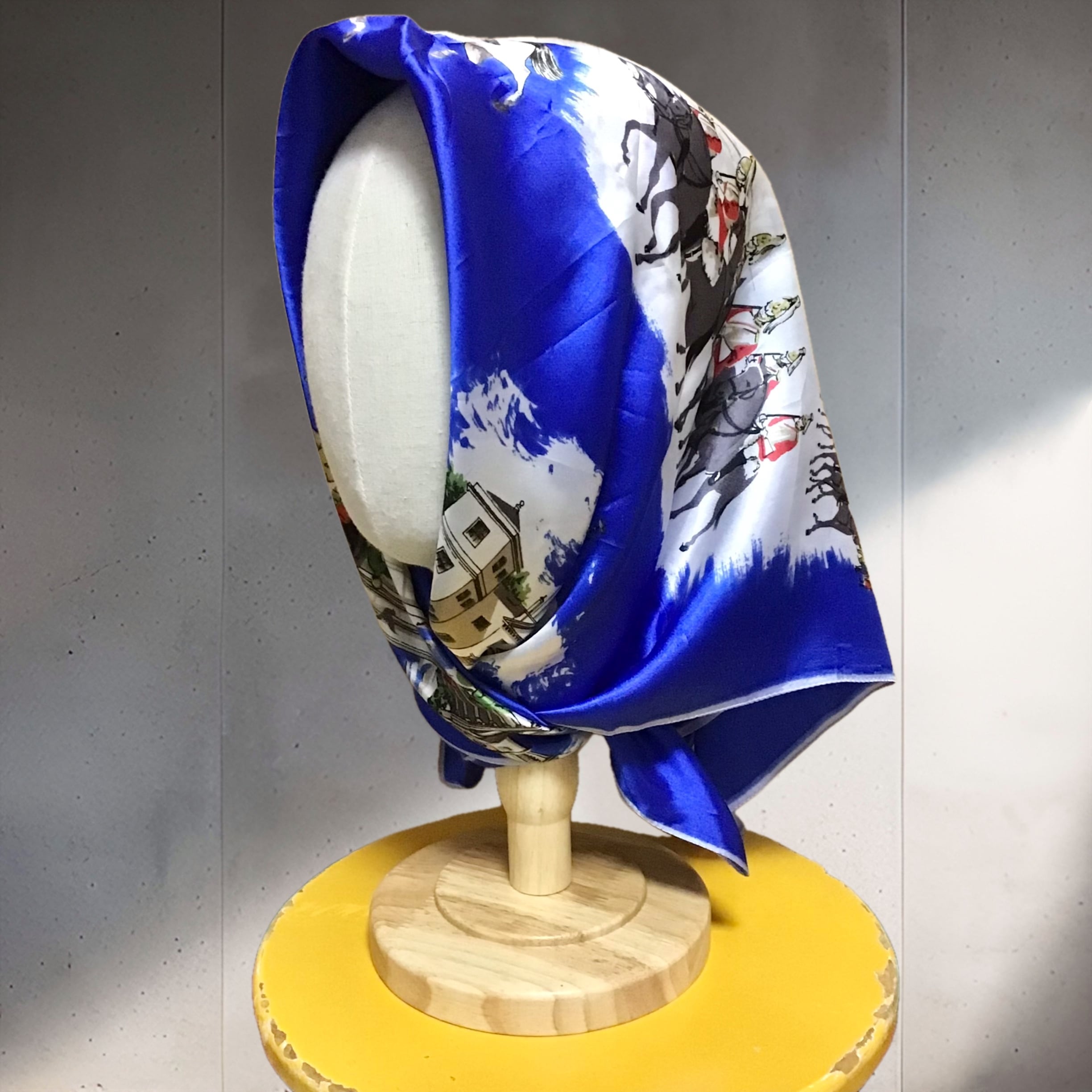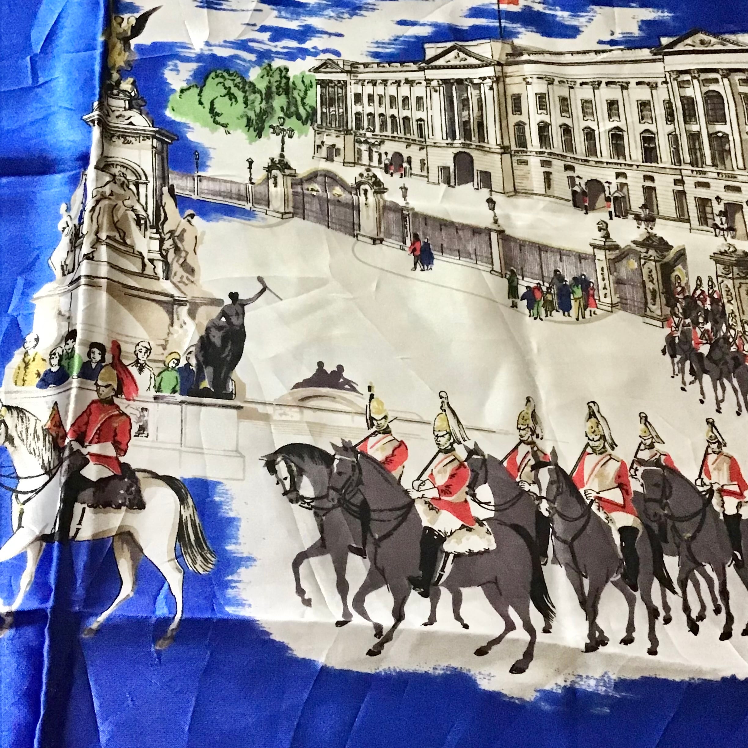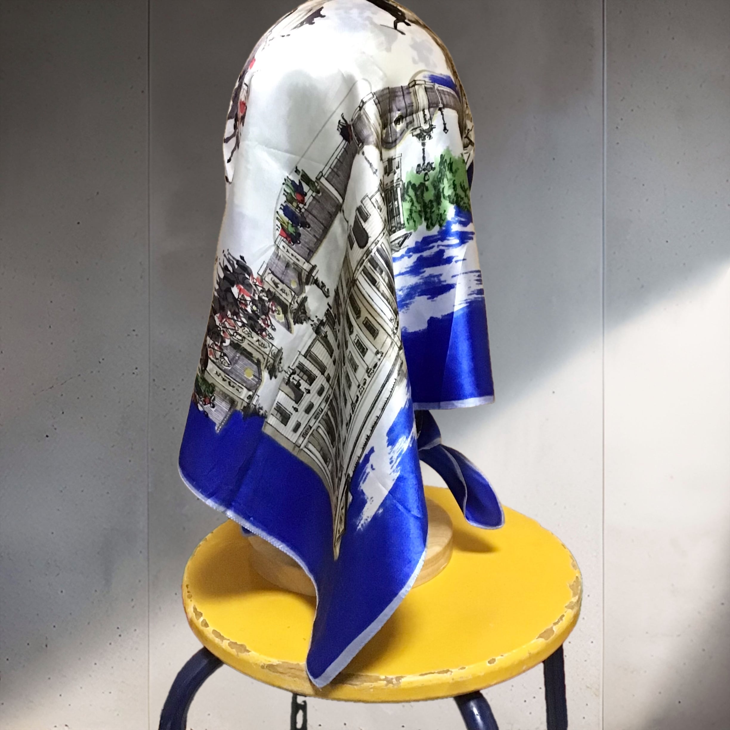 ロンドンのスーベニアスカーフ。こちらはシルクではありませんが、鮮やかなブルーやイラストのタッチも良くいのでご紹介です♡頭やバッグに巻いたり、写真の様にお手持ちのリングを使ったアレンジもおすすめです◎生地感もしっかりとしており気兼ねなく使って頂けると思います!