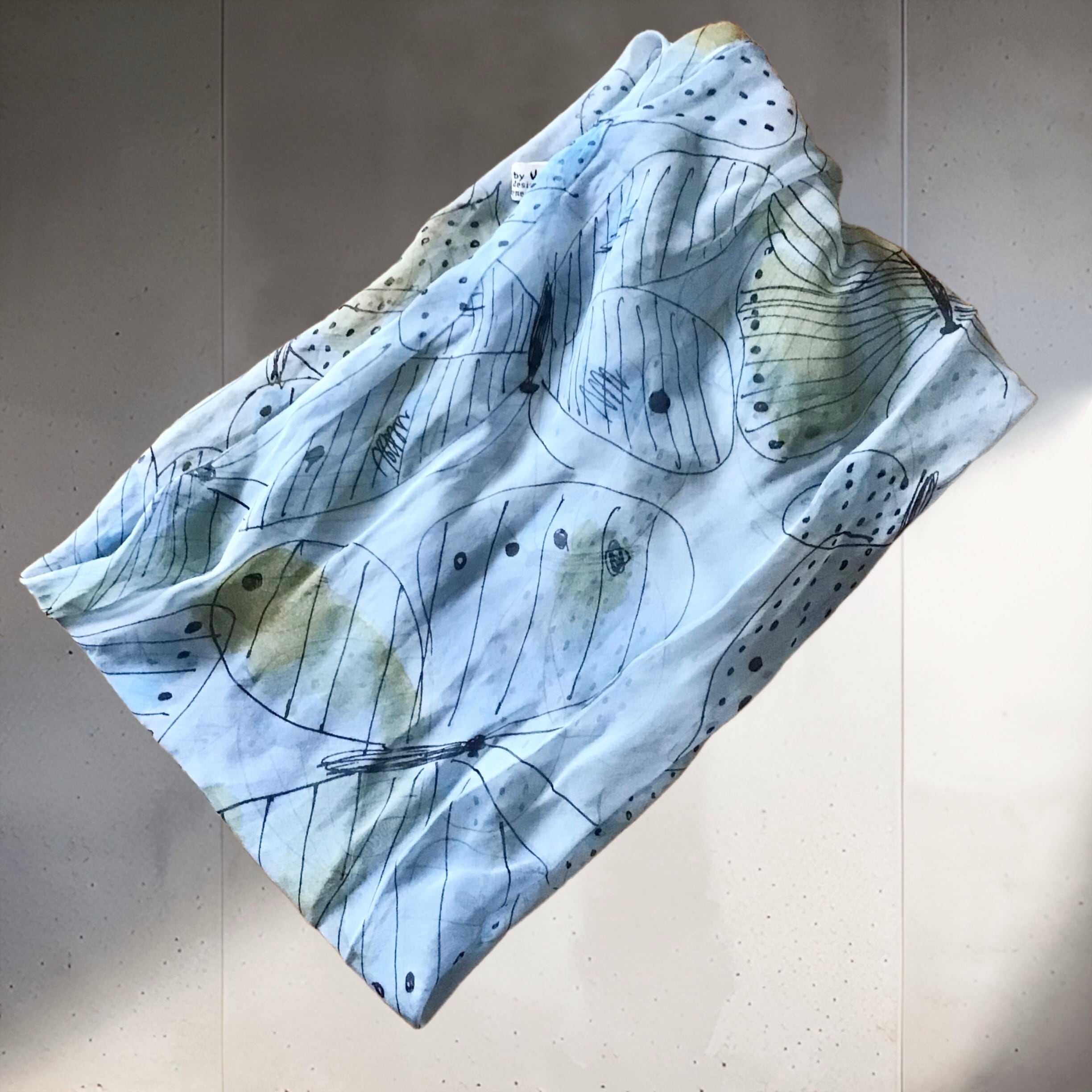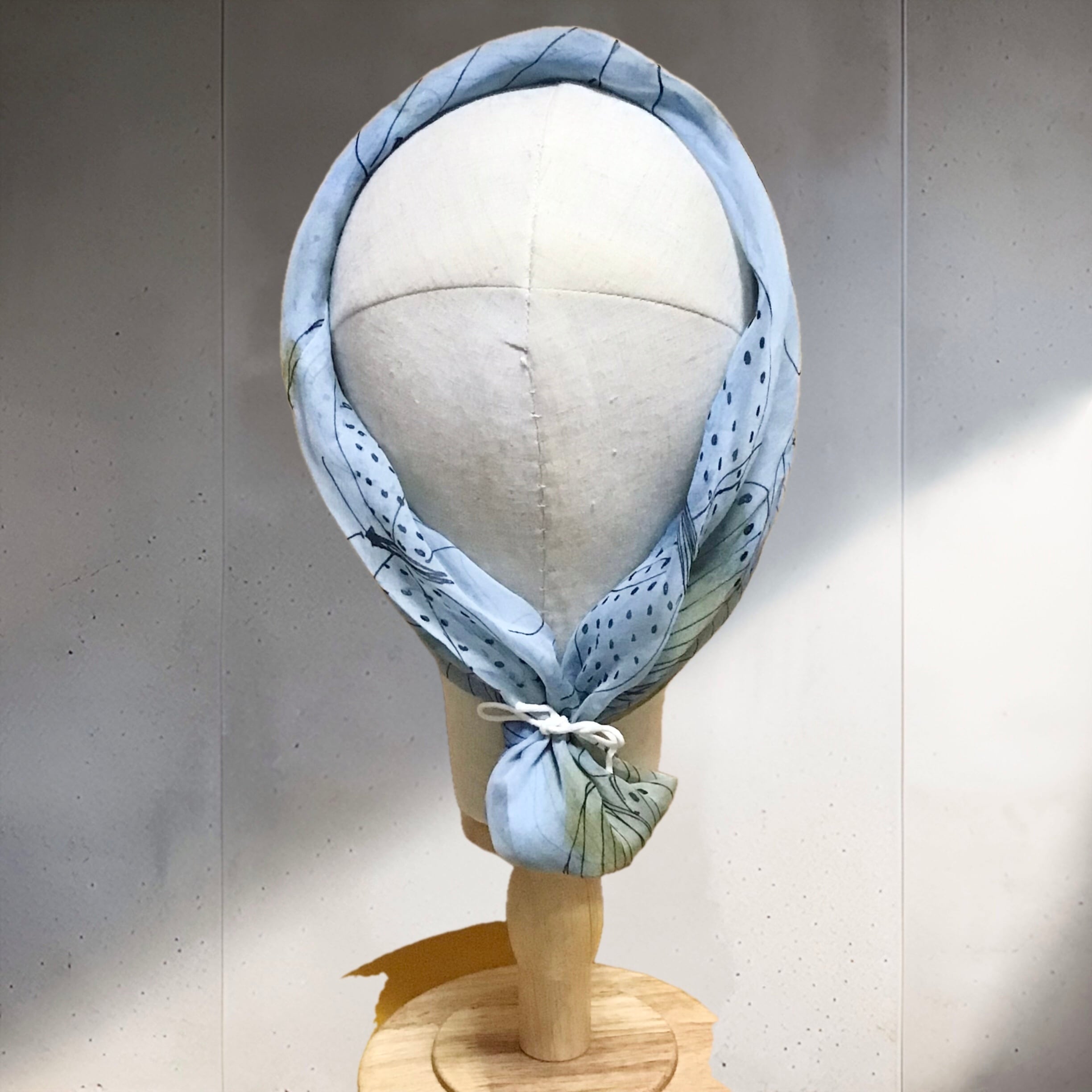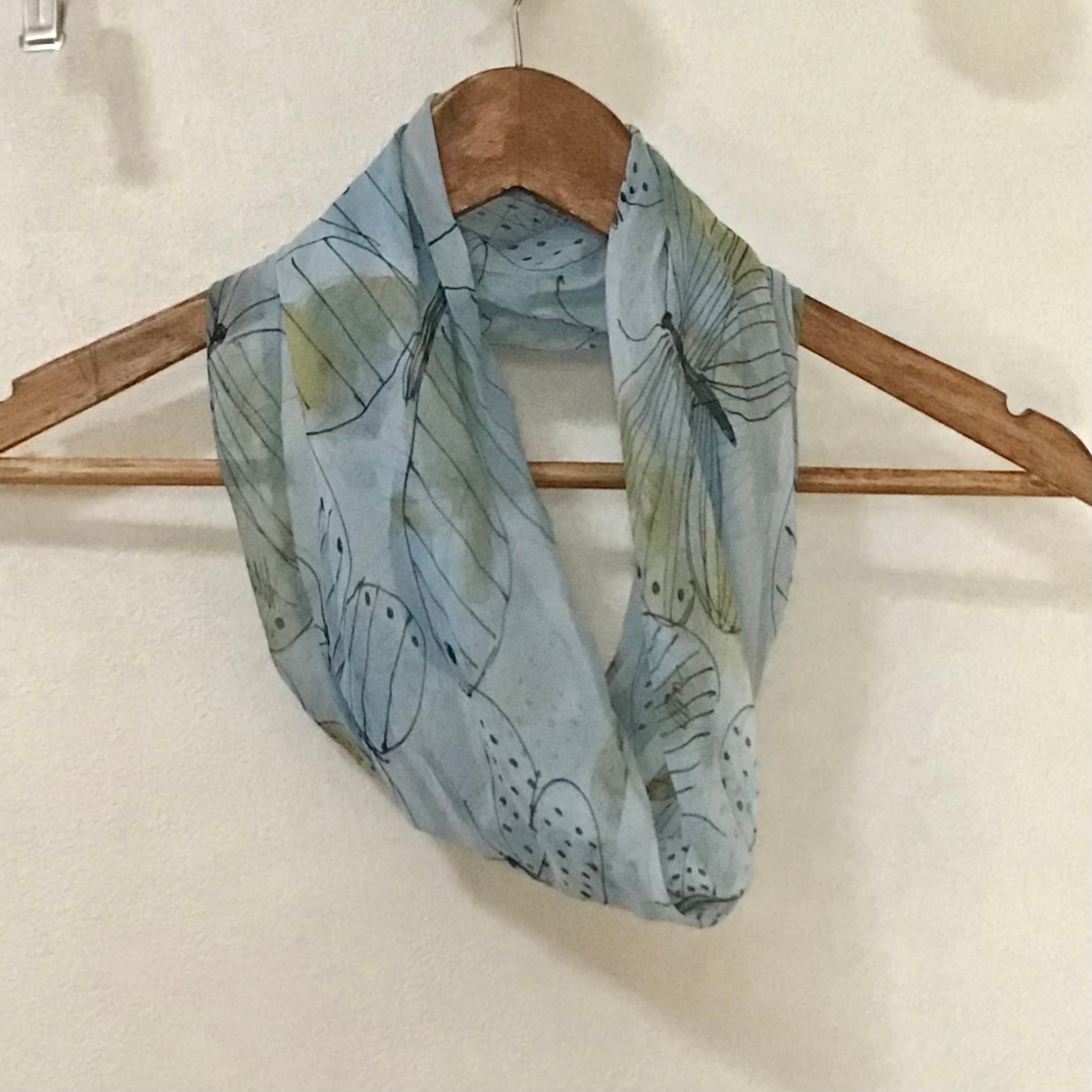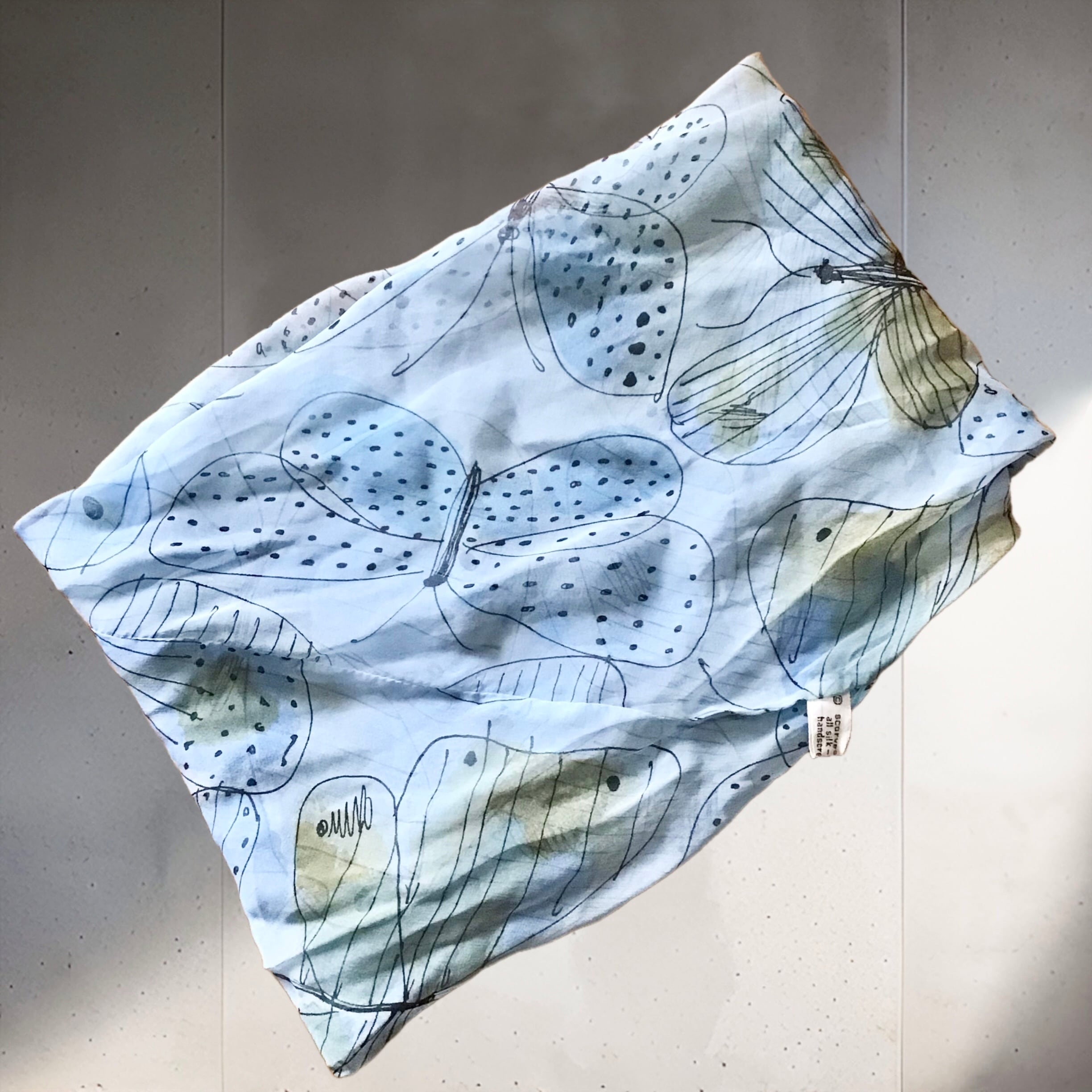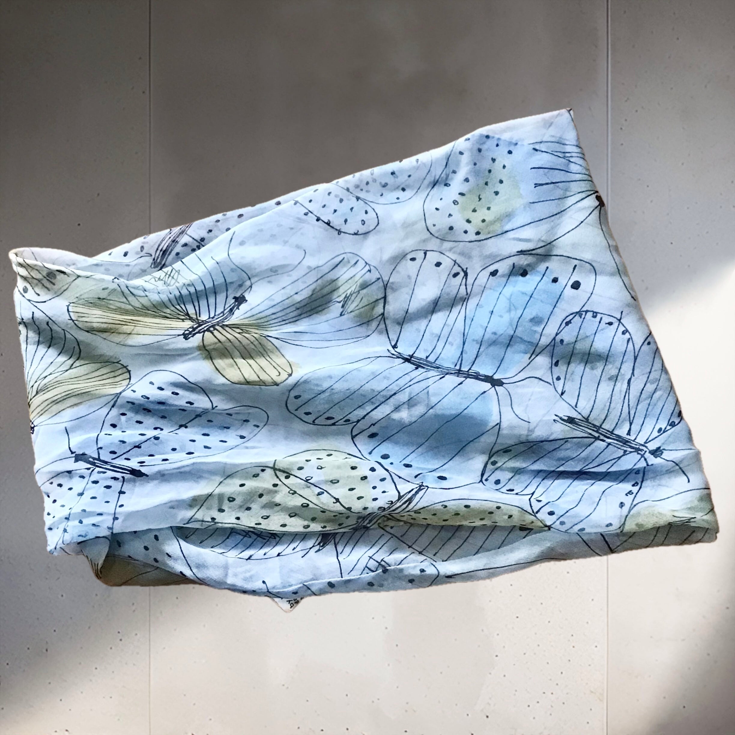 ベラのシルクシフォンスカーフ、輪っか状に縫われたものです◎淡いブルーにラフなタッチの蝶々が可愛いらしく、ターバンの様に使ったり、お手持ちのリングを使ったアレンジもおすすめです♡