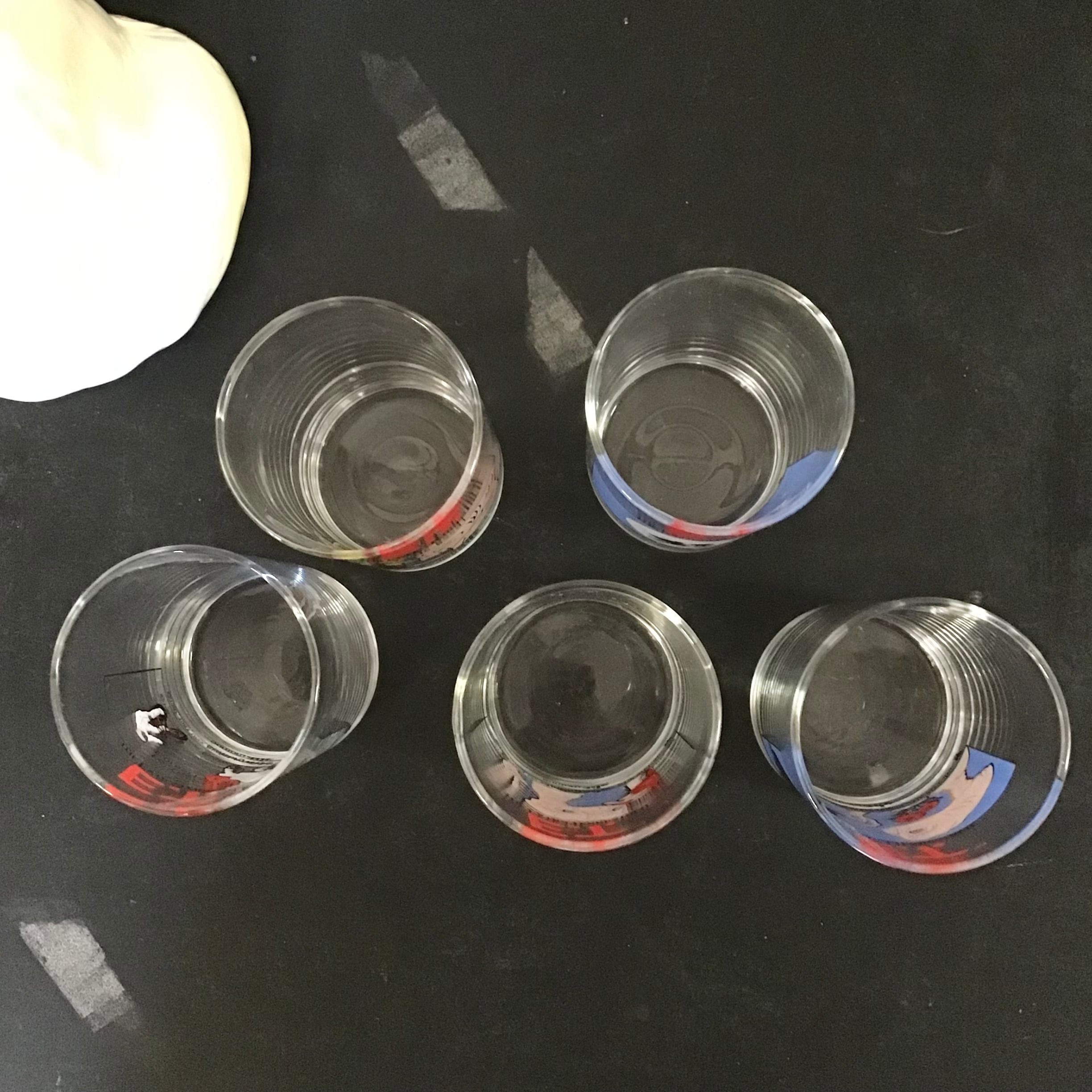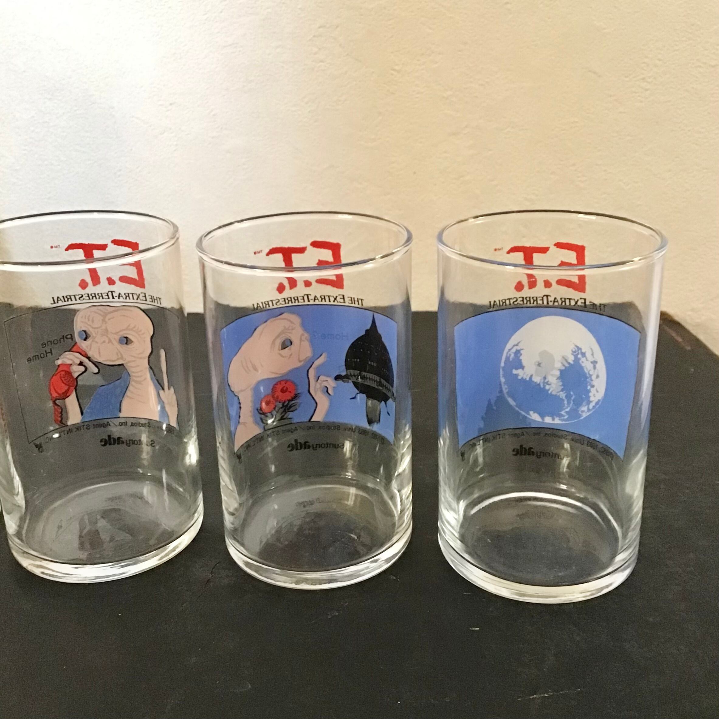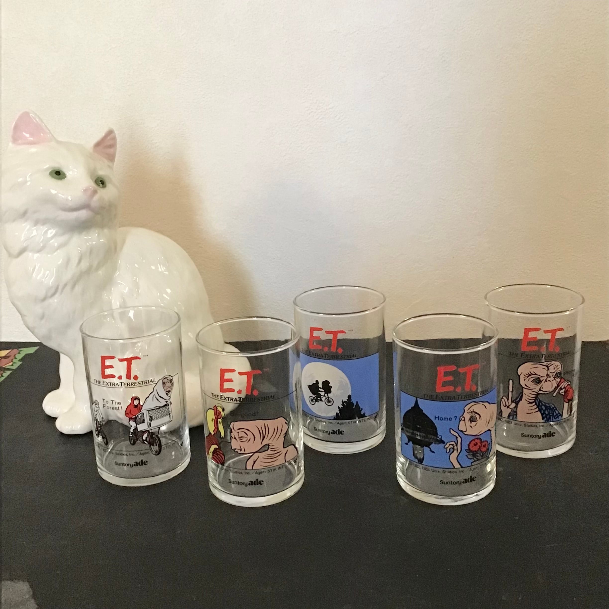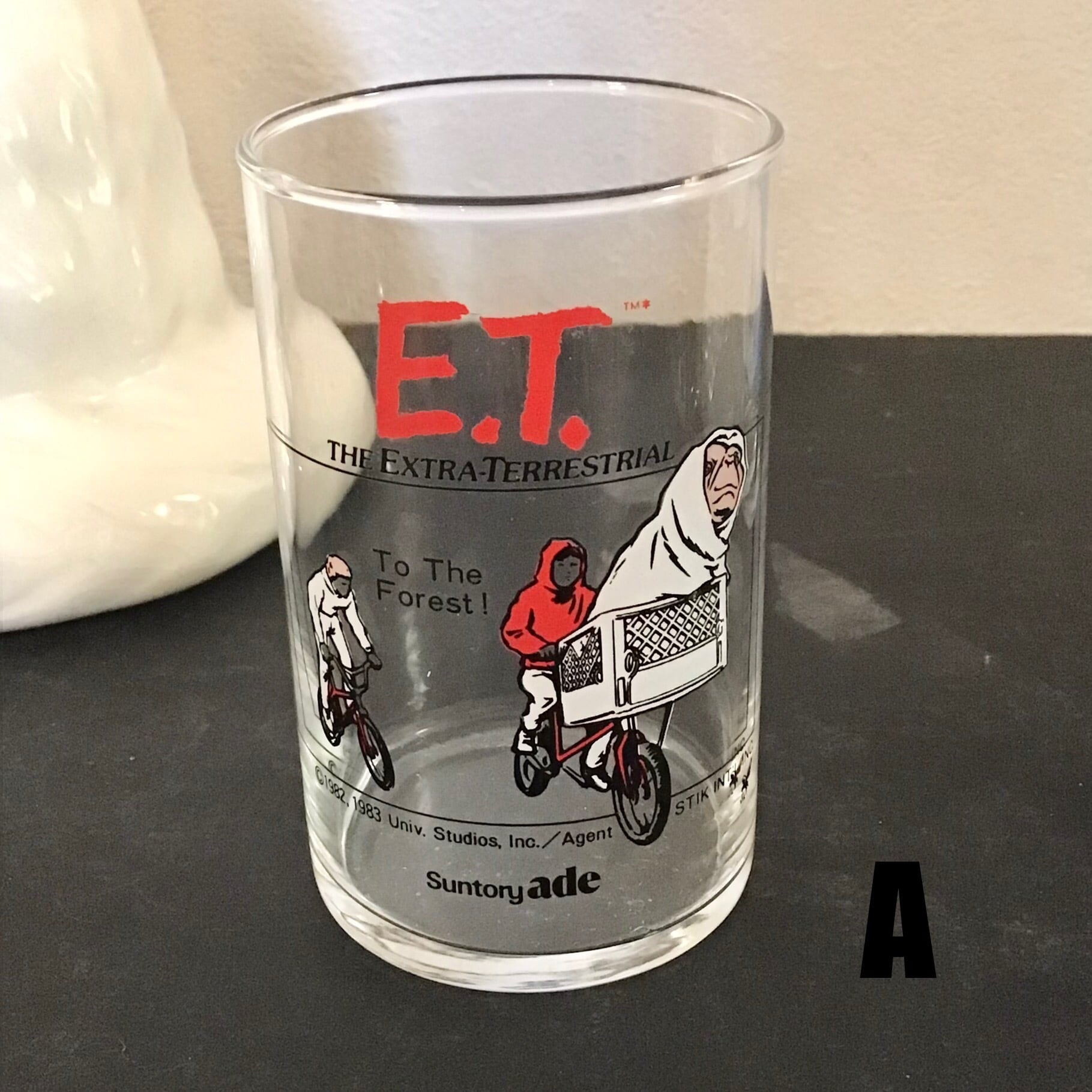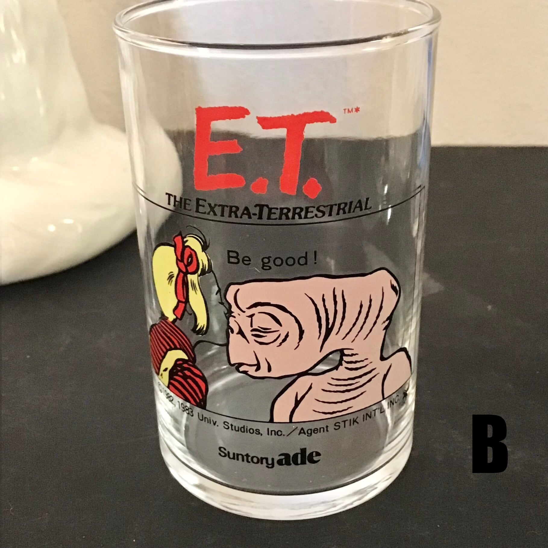 1980年代のE.T.グラス。こちらは日本のもので、サントリーエイドというジュースのノベルティーです◎いろいろなE.T.の名場面が描かれ絵柄は5種類あります♡小ぶりでチープな雰囲気込みでとても可愛らしいグラスです!傷などなく状態も良好です!