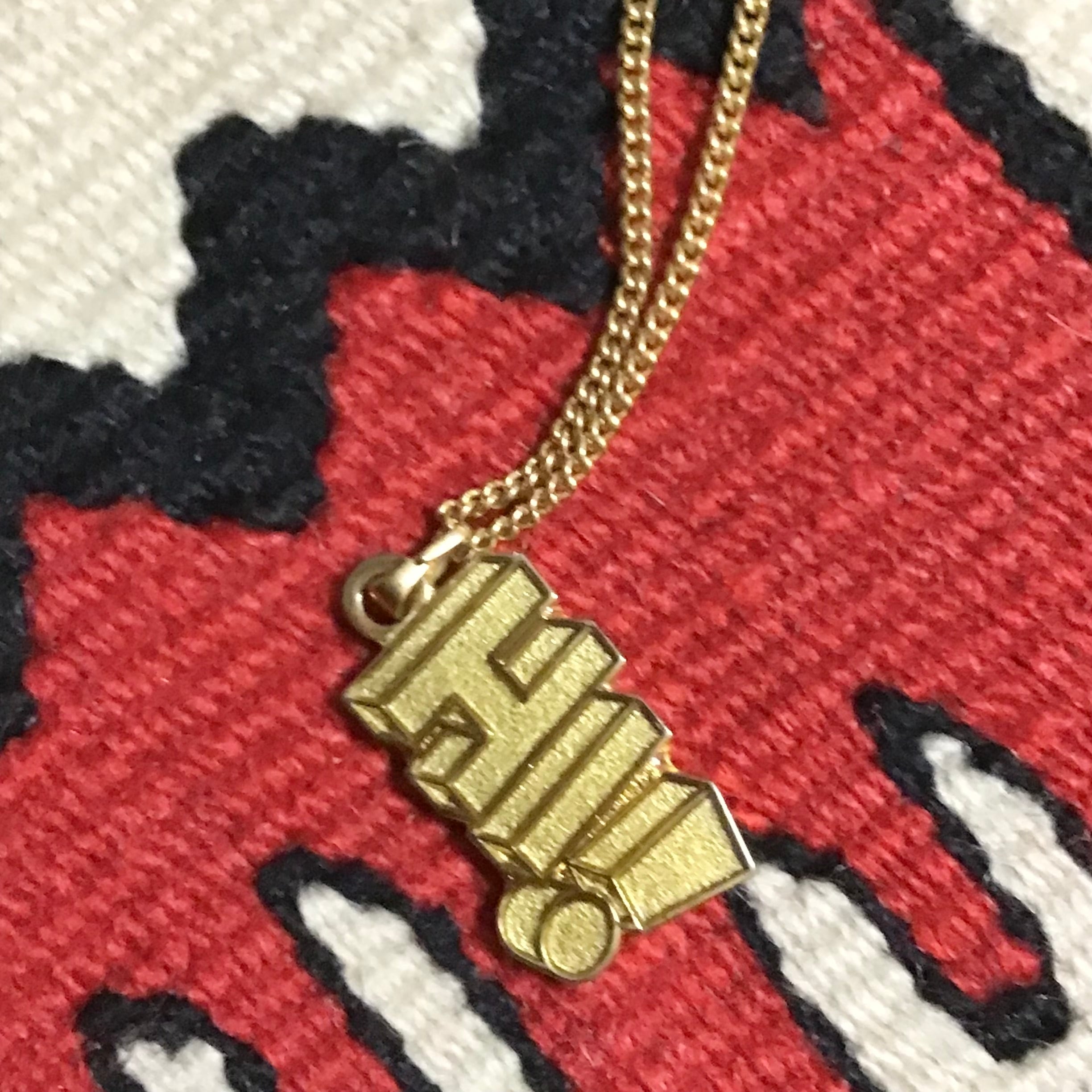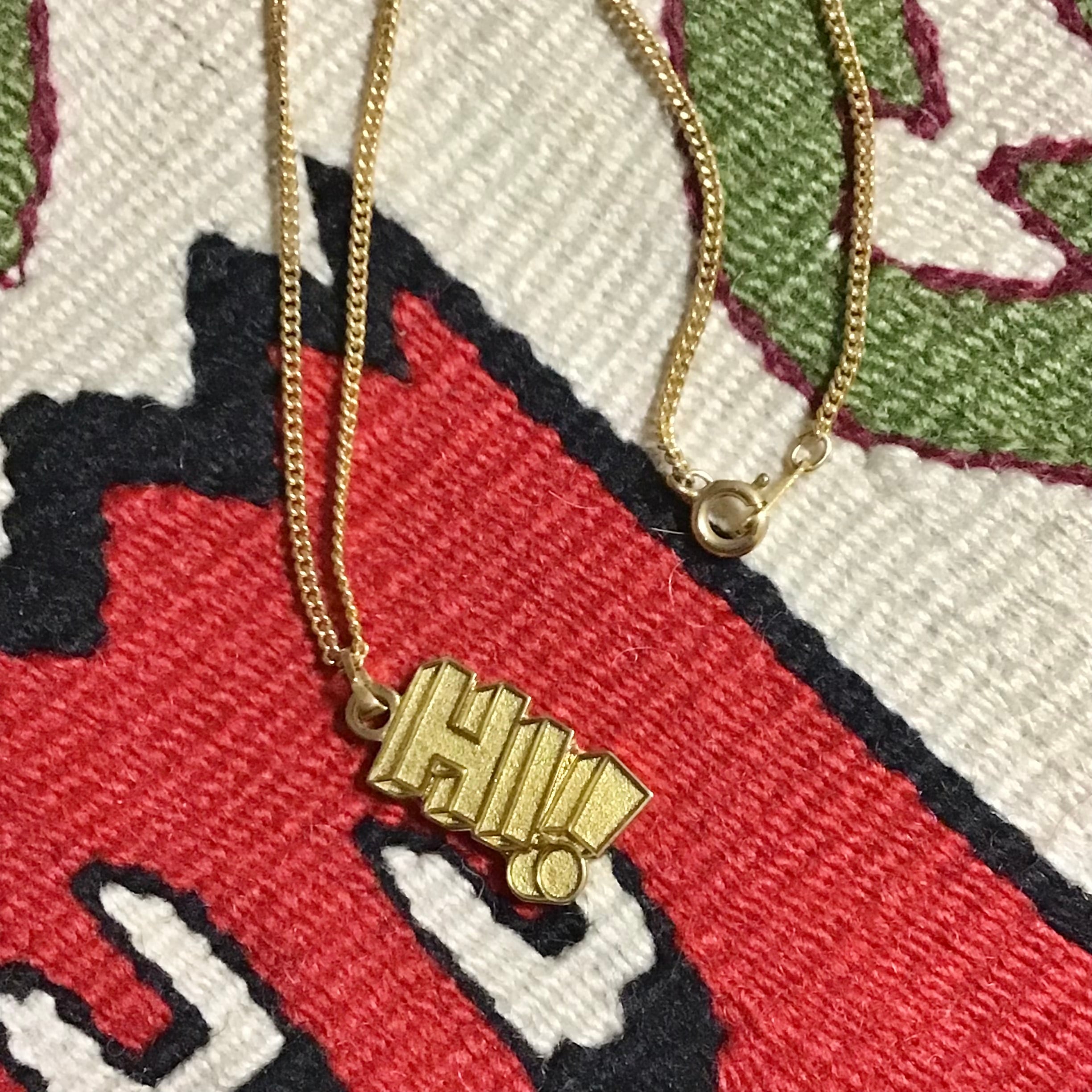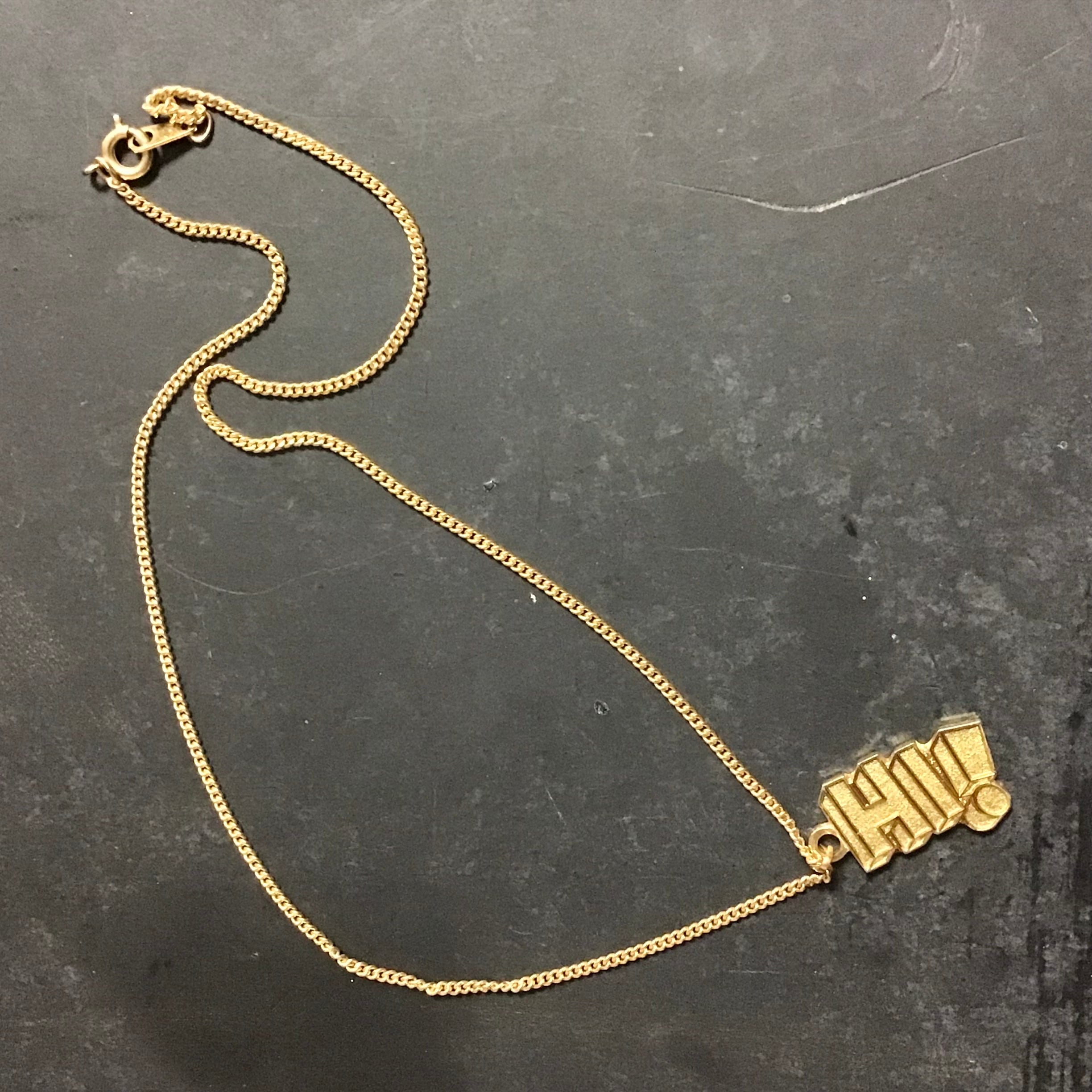 “Hi!”のロゴがユニークなゴールドトーンネックレス、チープな雰囲気も魅力のお品で、ビーズやパールのネックレスと重ねても可愛いと思います♡ギフトにもおすすめです◎