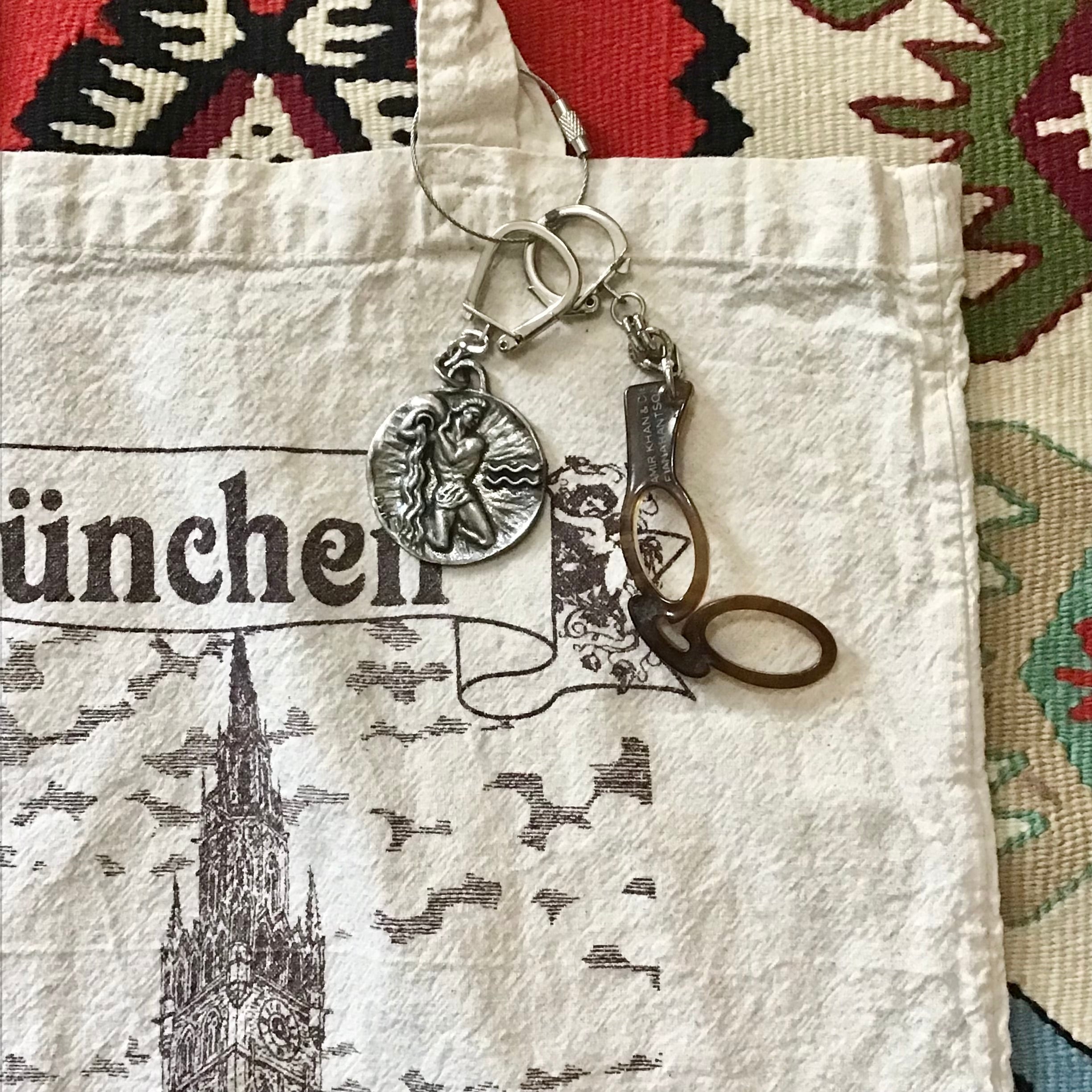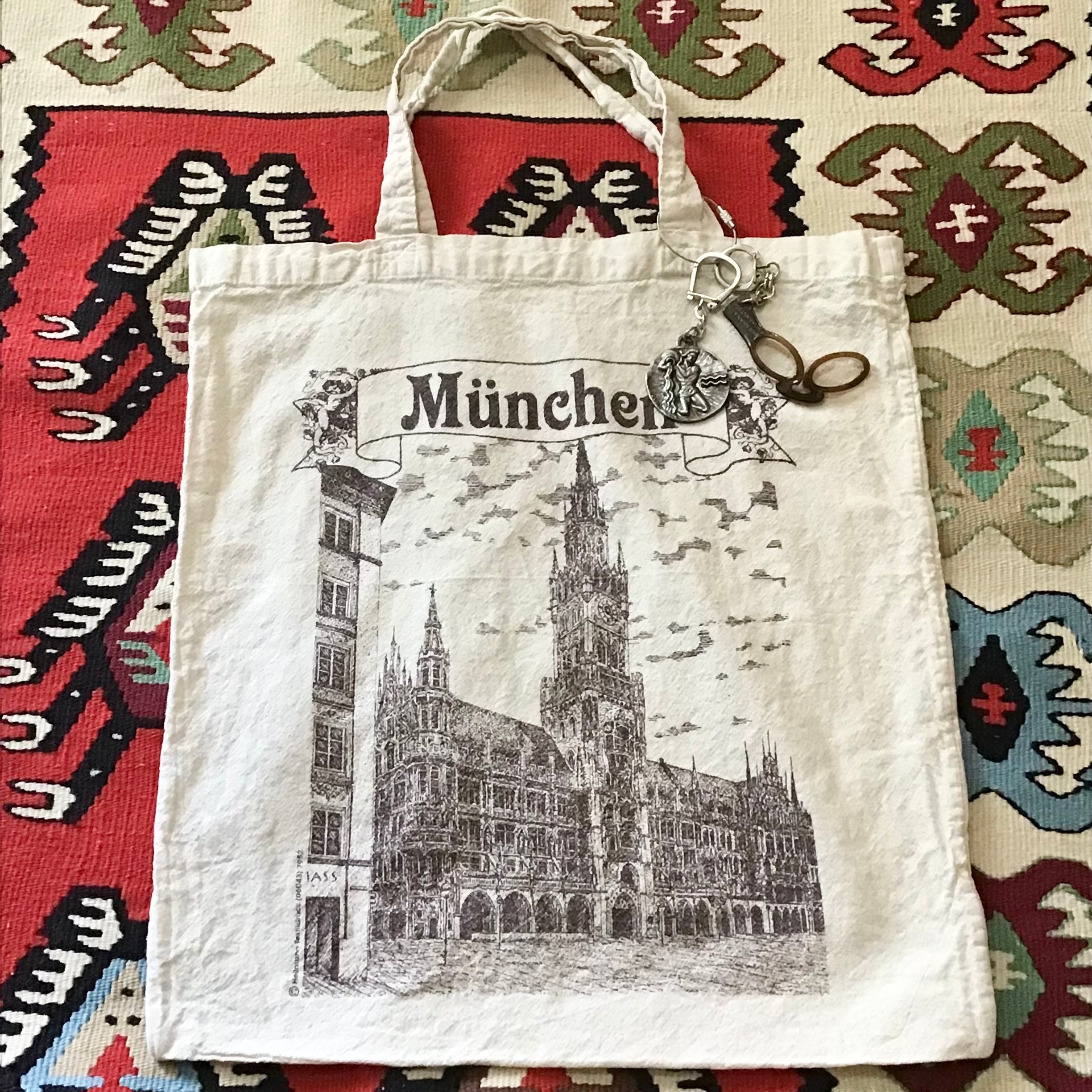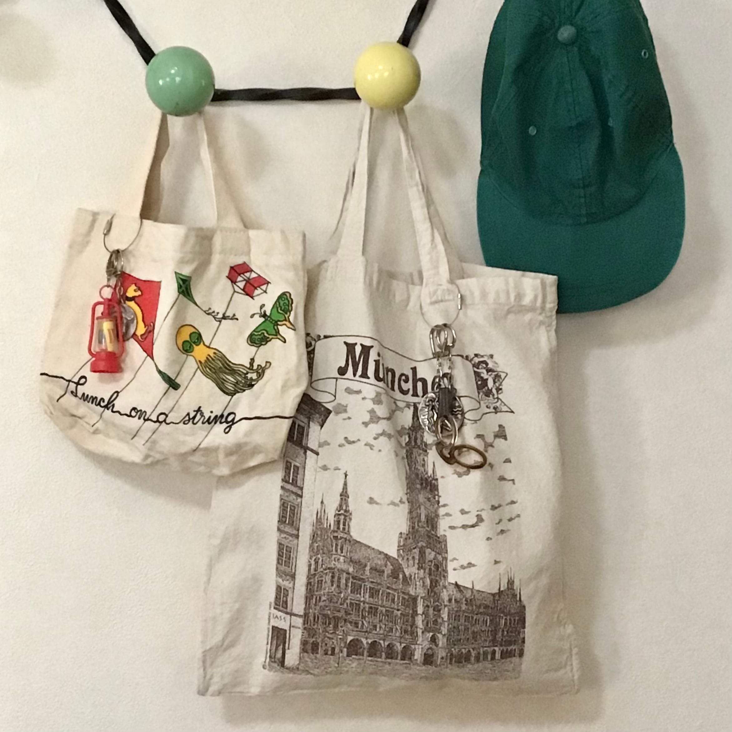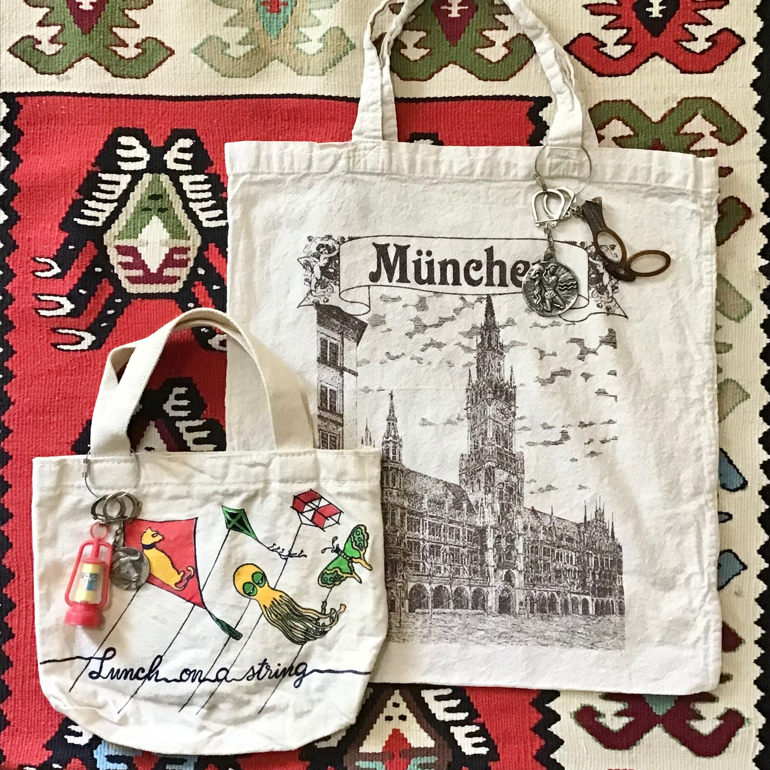 プリントトートバッグ、こちらに店主セレクトのキーホルダー2個をセットにしてご紹介です◎雰囲気のあるプリントと、持ち手が短めのなのが可愛いです♡ちょっとしたお出かけやサブバッグに是非!