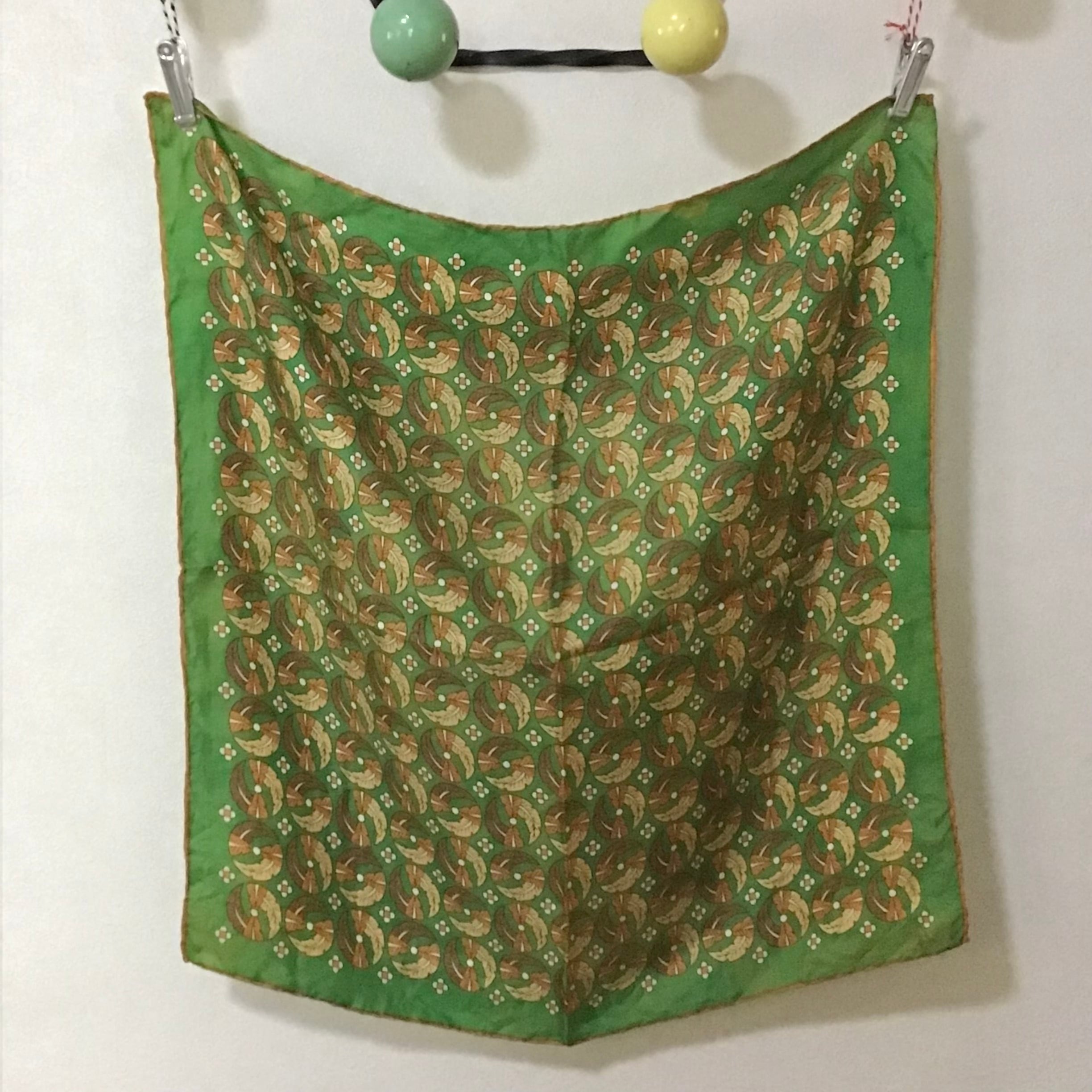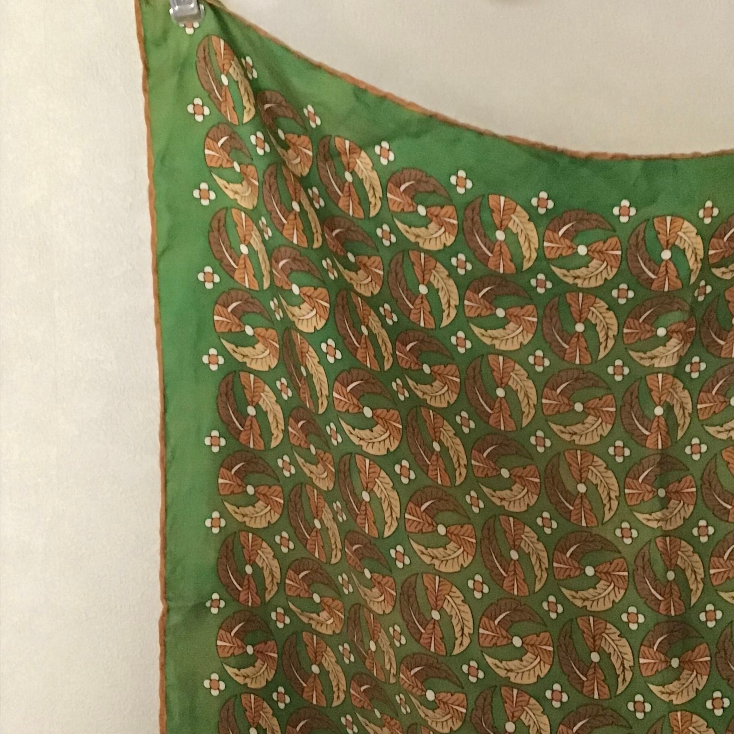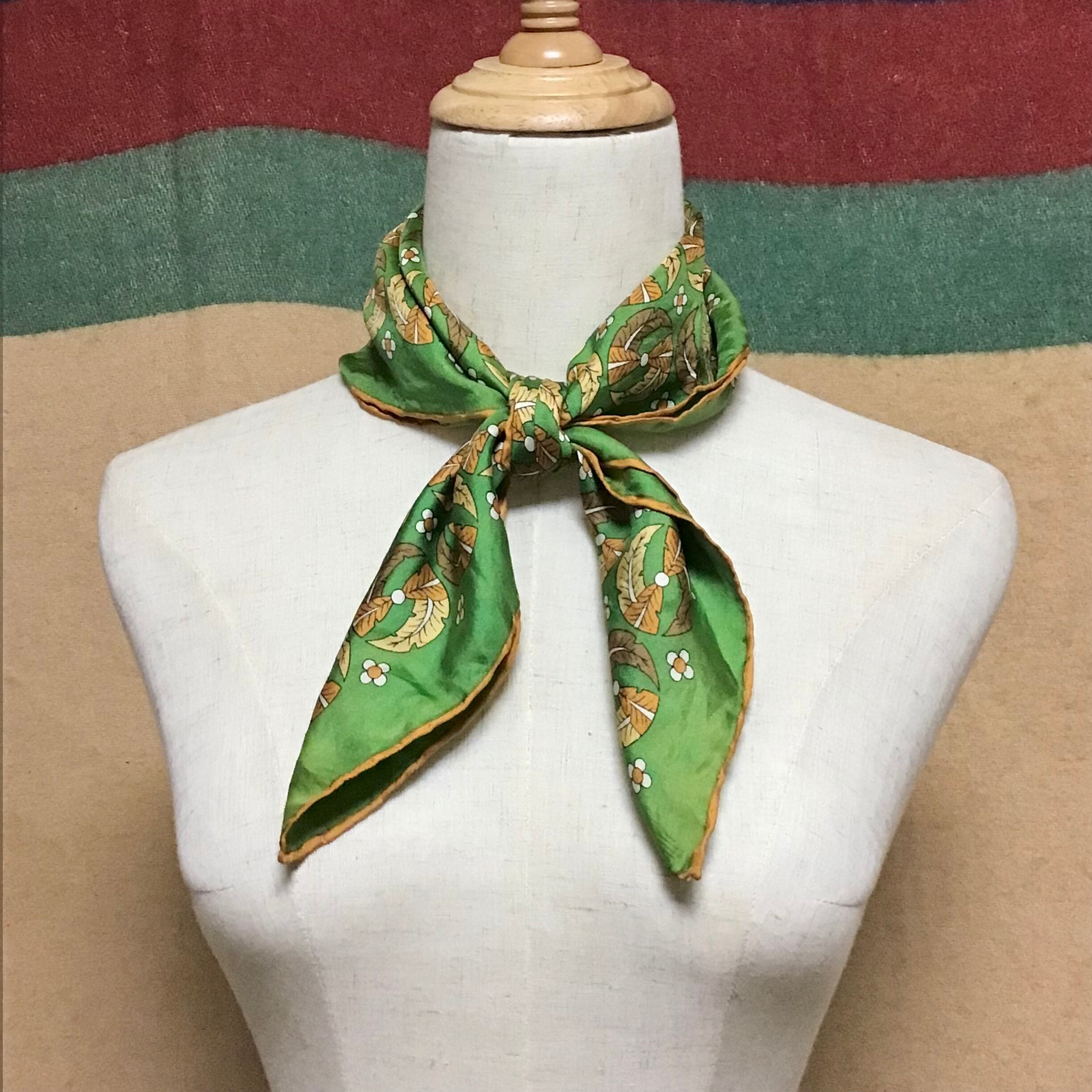 1970年代のシルクスカーフ、葉っぱと花をモチーフにしたデザインがシックな雰囲気です♡頭や首に巻くのにちょうど良いサイズ感、合わせやすいカラーで出番も多くなりそうです◎
