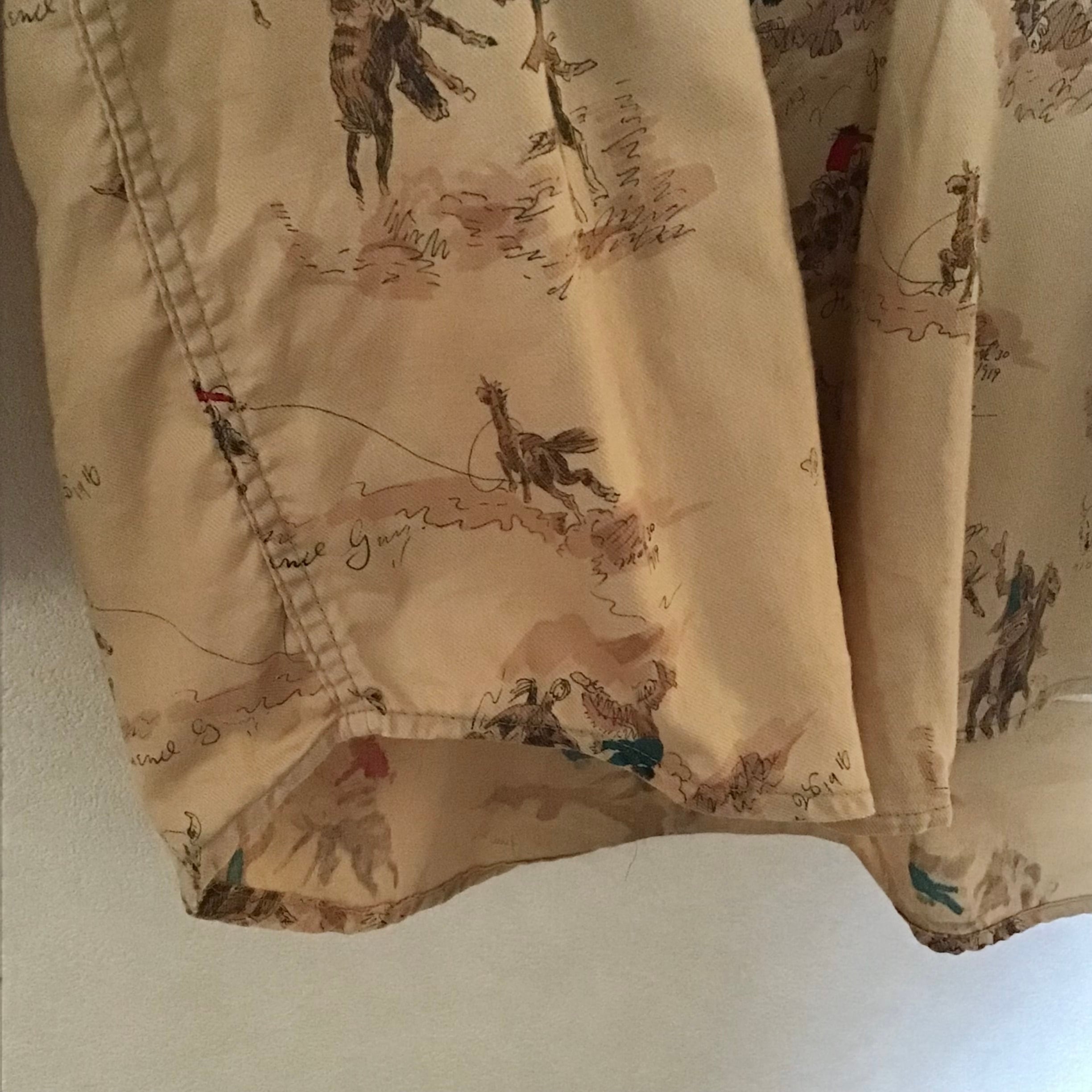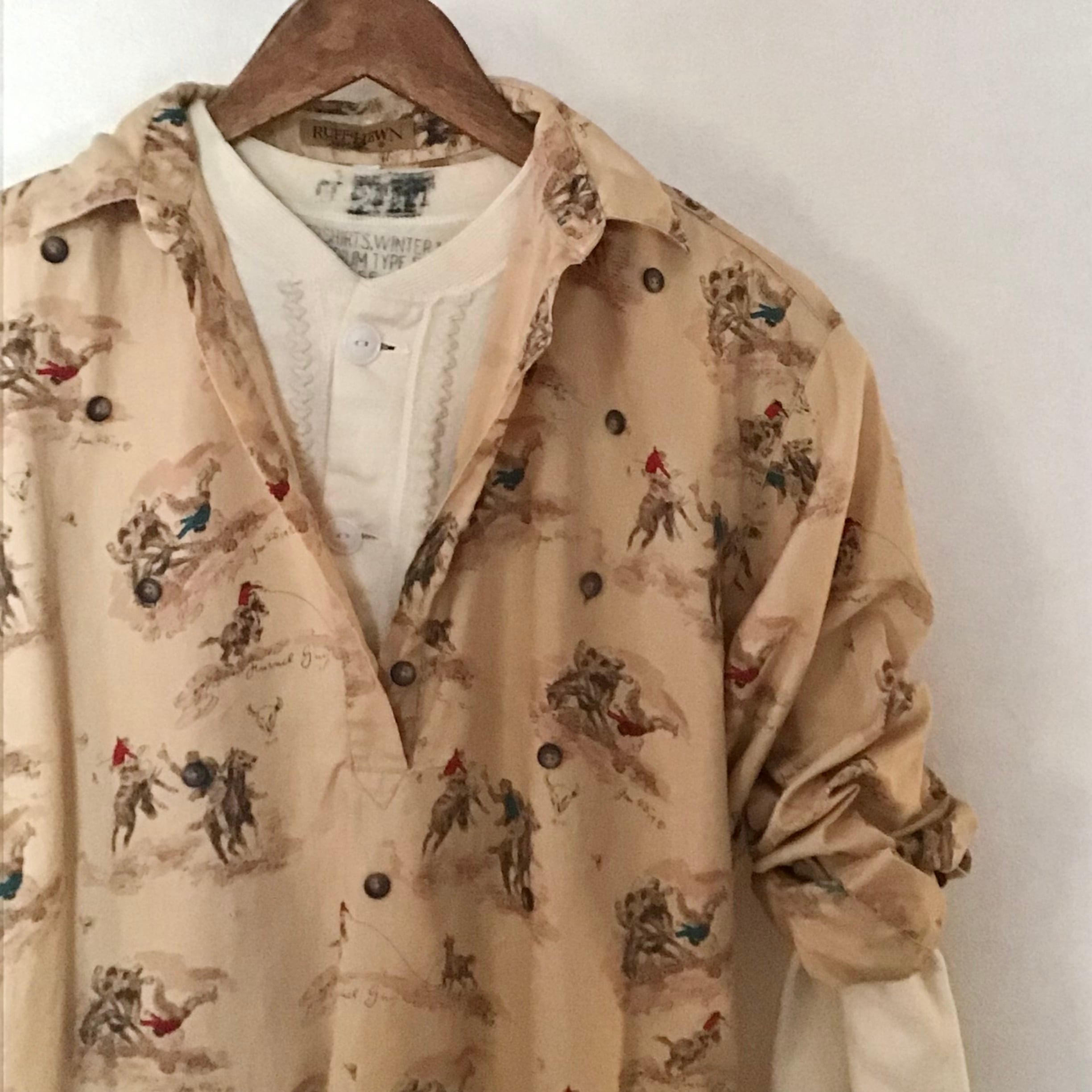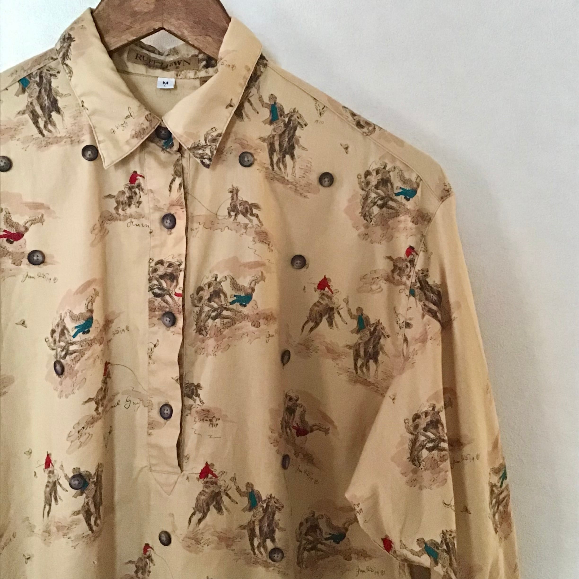 コットンのプリントプルオーバーシャツ、くすんだベージュに所々に入った赤と青がポイントのカウボーイ柄が良い雰囲気です♡柔らかな薄手のコットンは着心地も良く、洗いざらしで袖はラフにロールアップして首元にはバンダナを巻いたり、ショーツを合わせても良さそうです◎フロントの胸当ては取られており、ボタンのみ残っています。