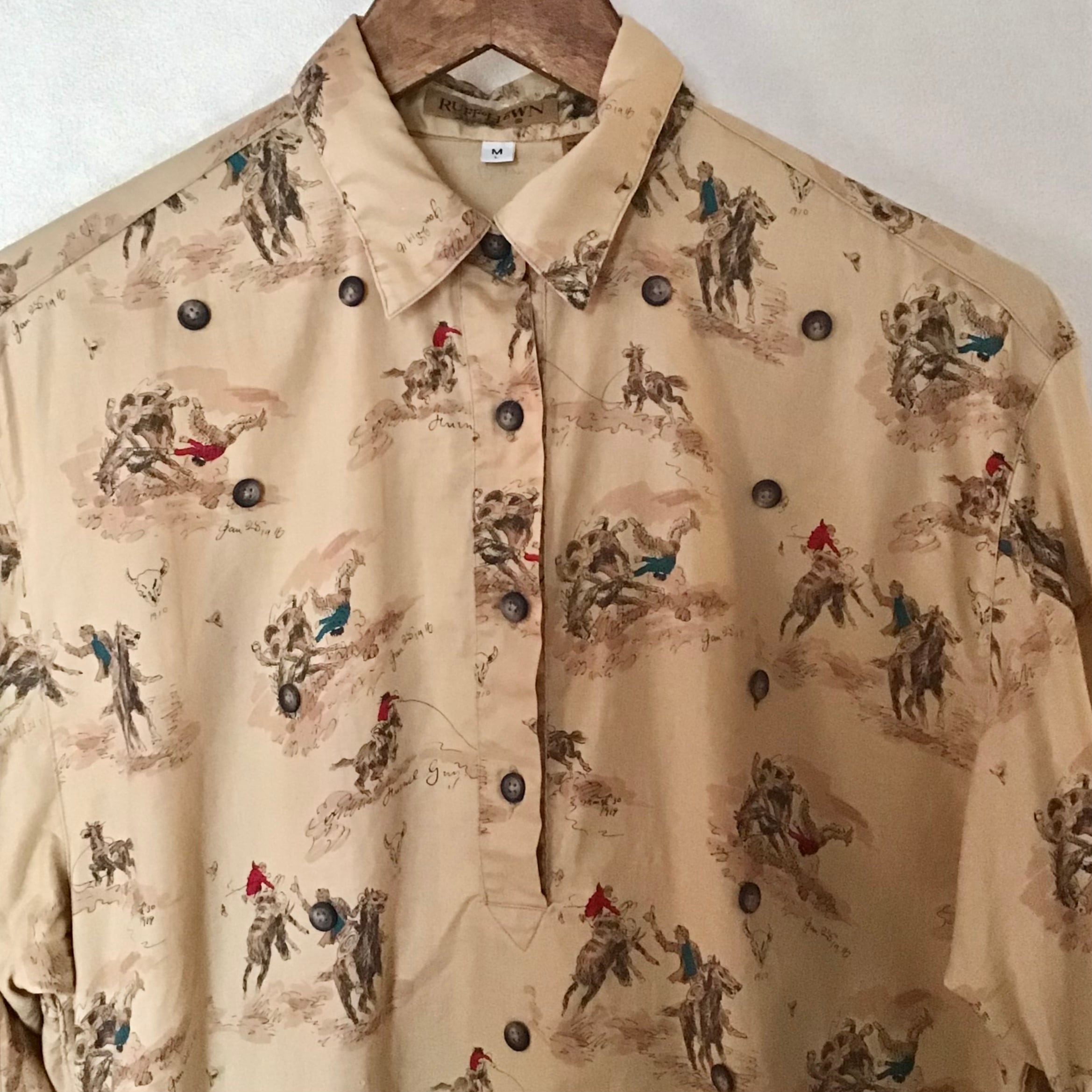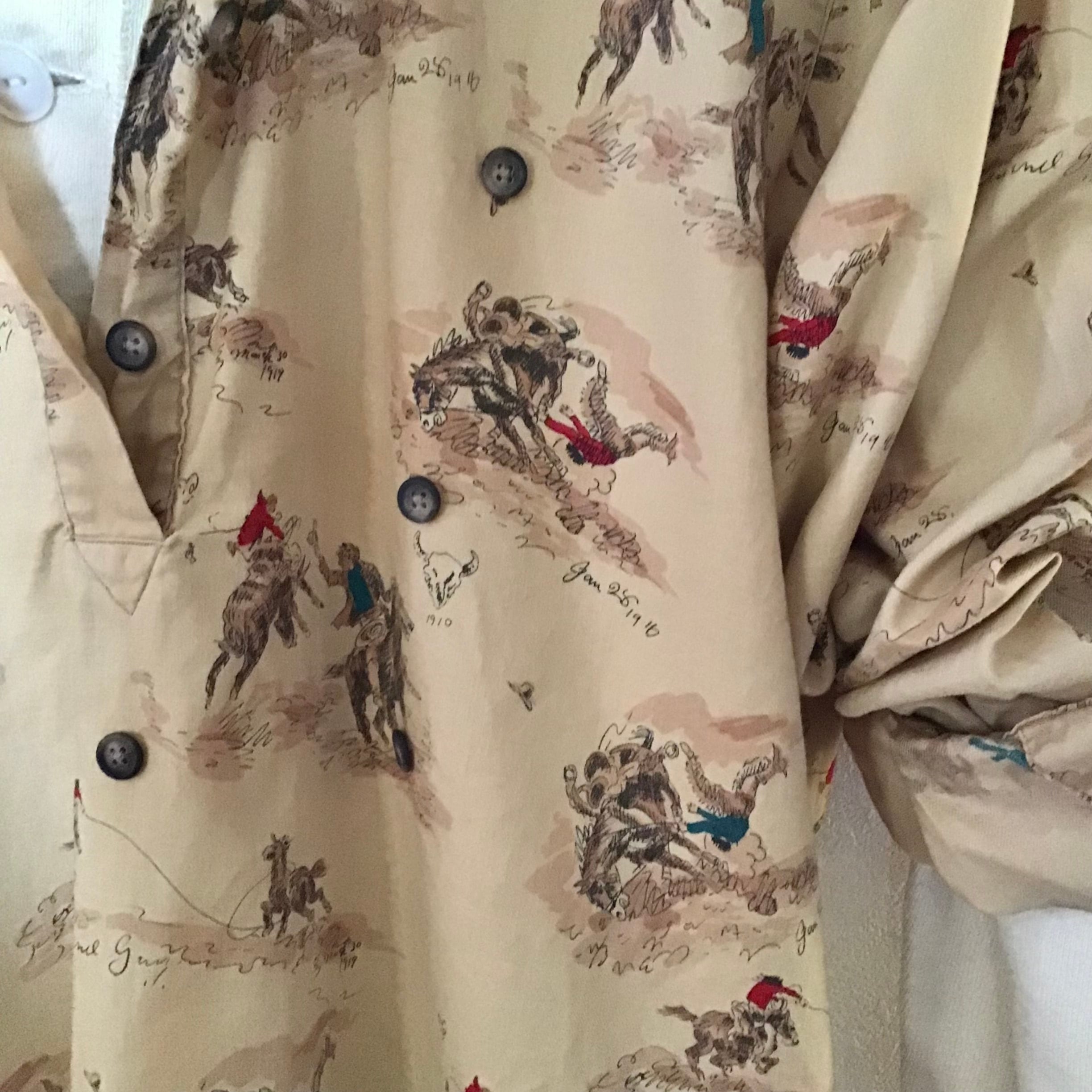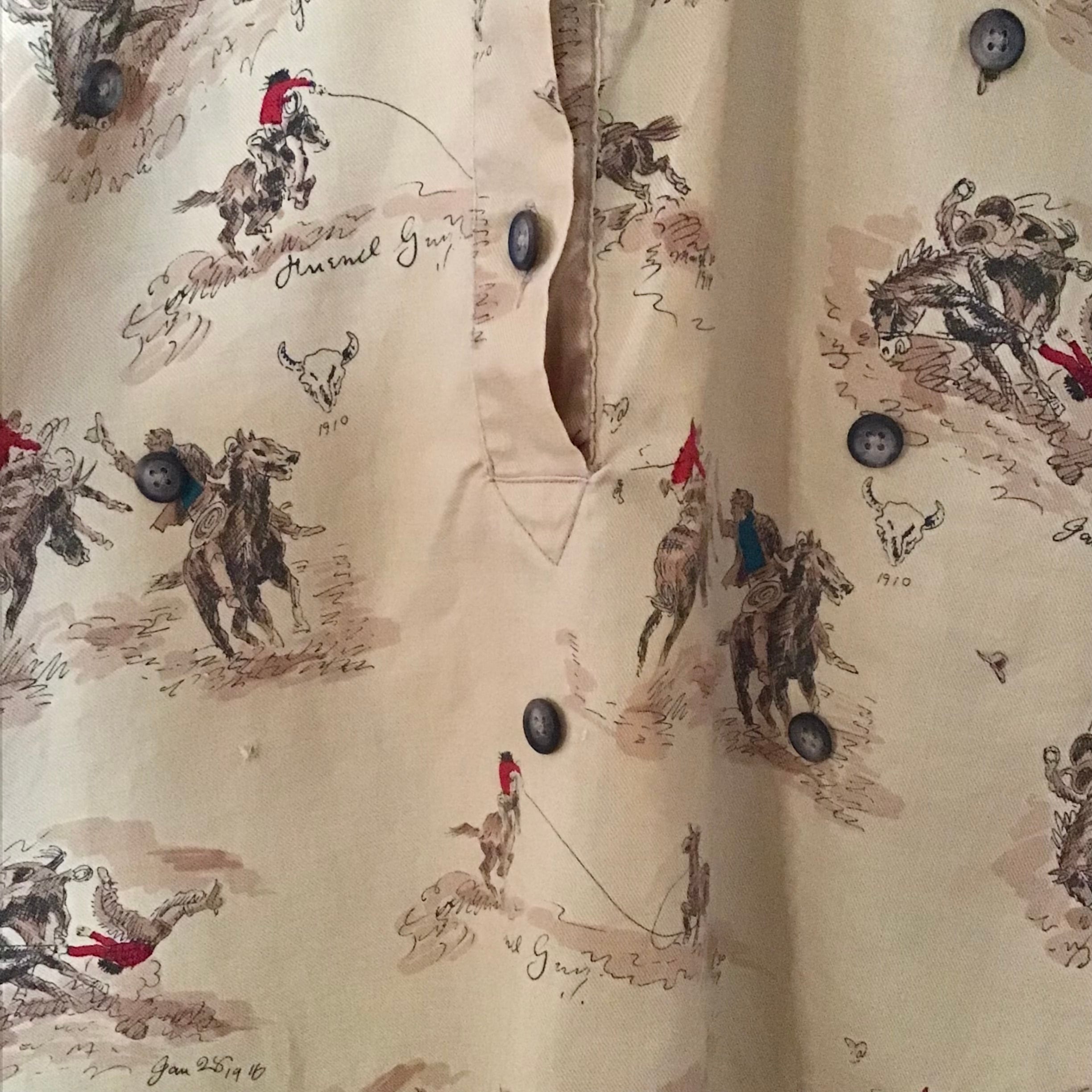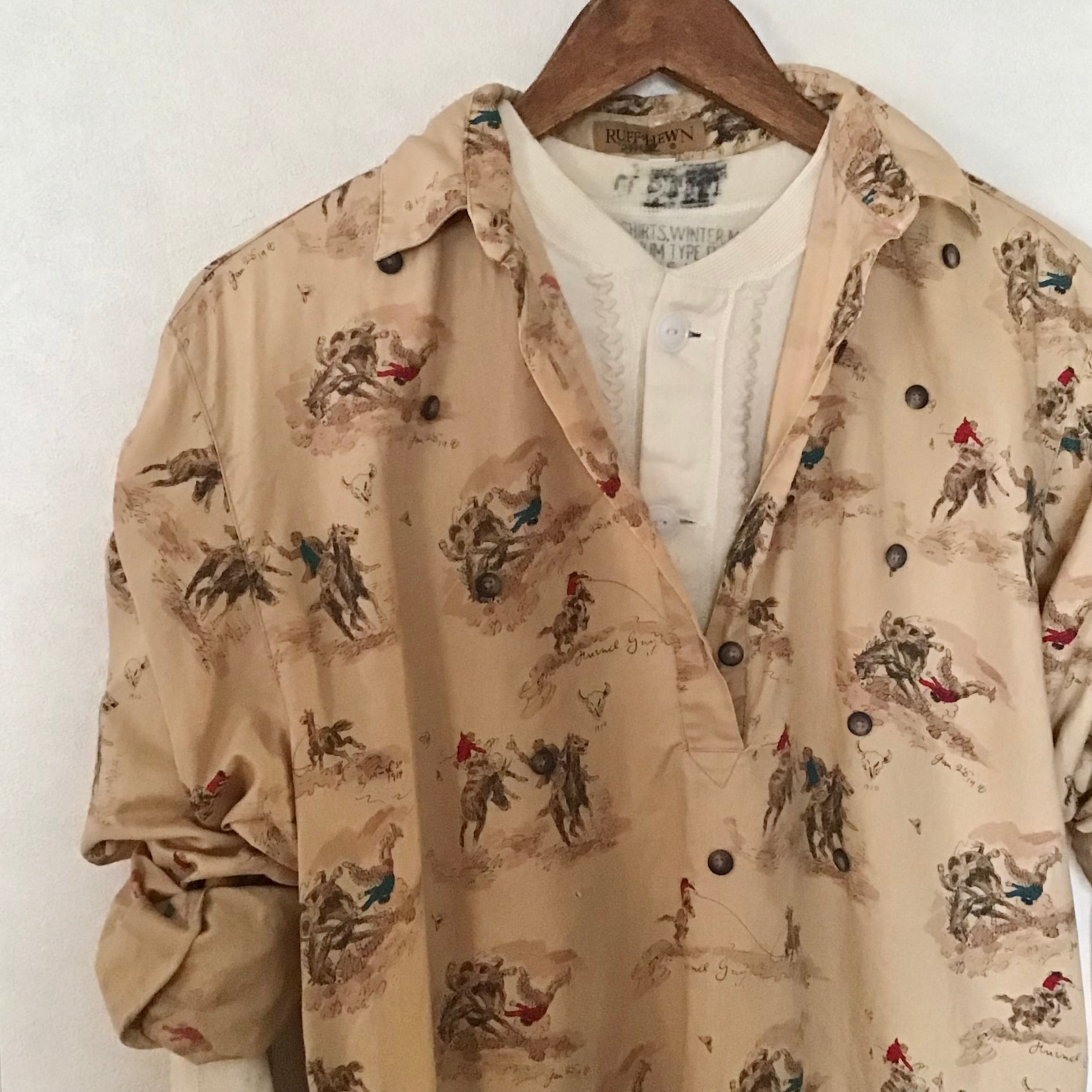 コットンのプリントプルオーバーシャツ、くすんだベージュに所々に入った赤と青がポイントのカウボーイ柄が良い雰囲気です♡柔らかな薄手のコットンは着心地も良く、洗いざらしで袖はラフにロールアップして首元にはバンダナを巻いたり、ショーツを合わせても良さそうです◎フロントの胸当ては取られており、ボタンのみ残っています。