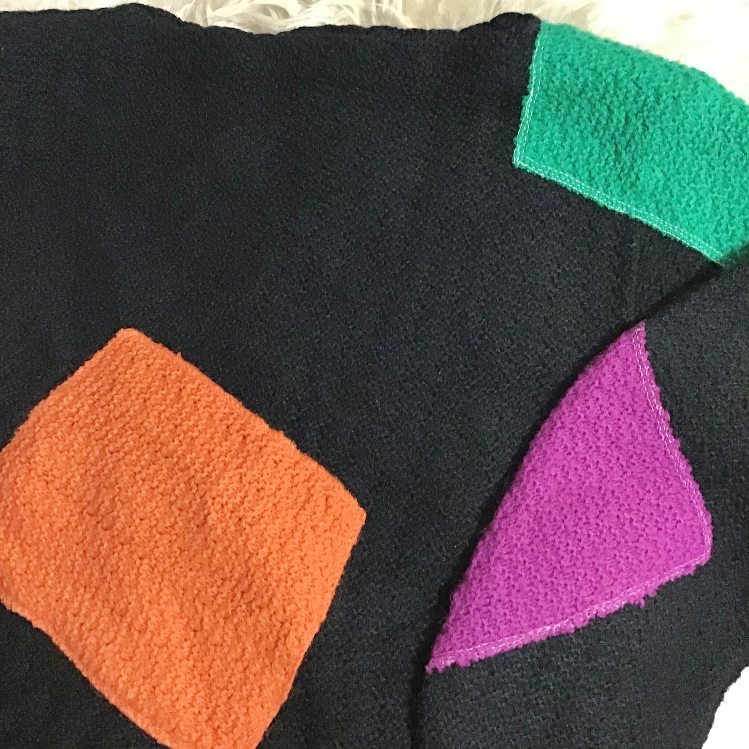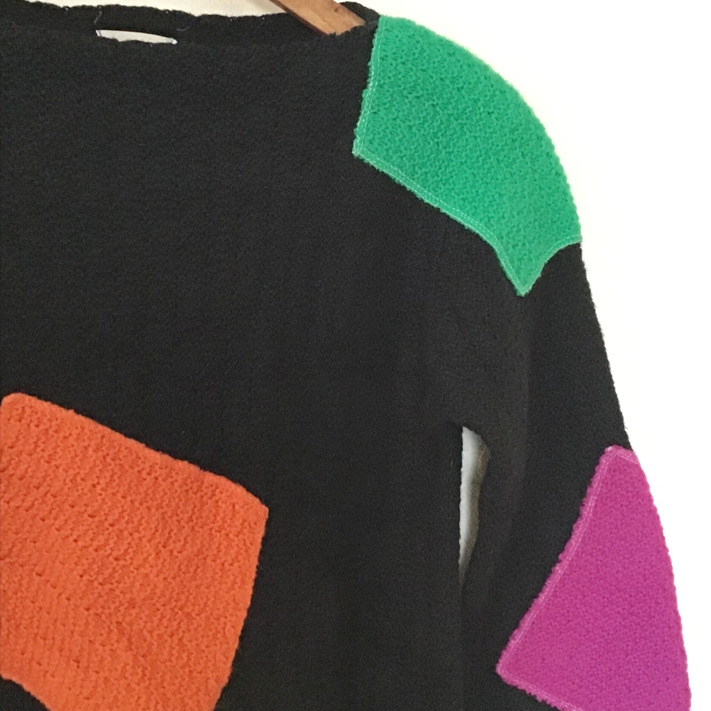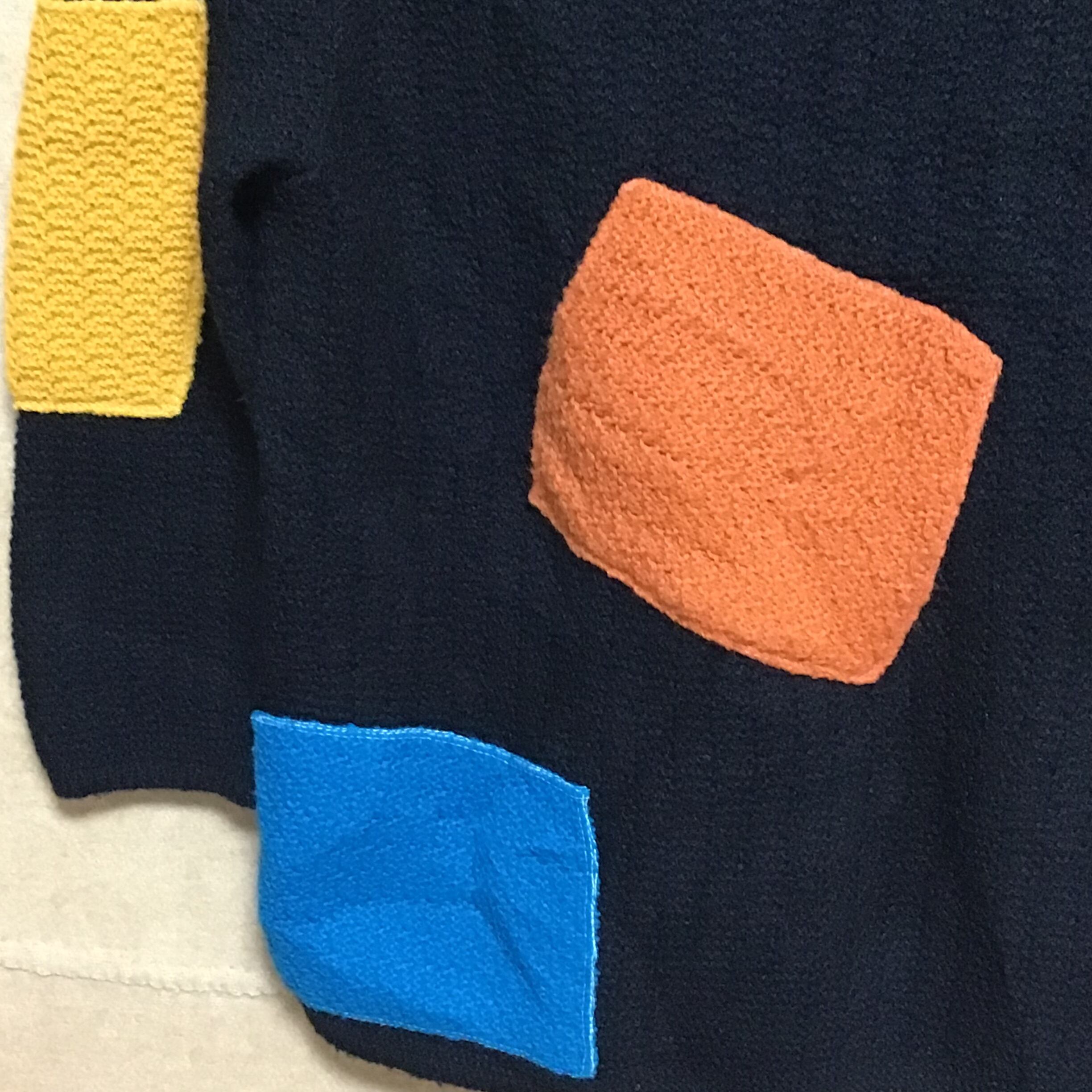 カラフルなアップリケが可愛いアクリルニット、右袖のイエローのみポケットになっています♡