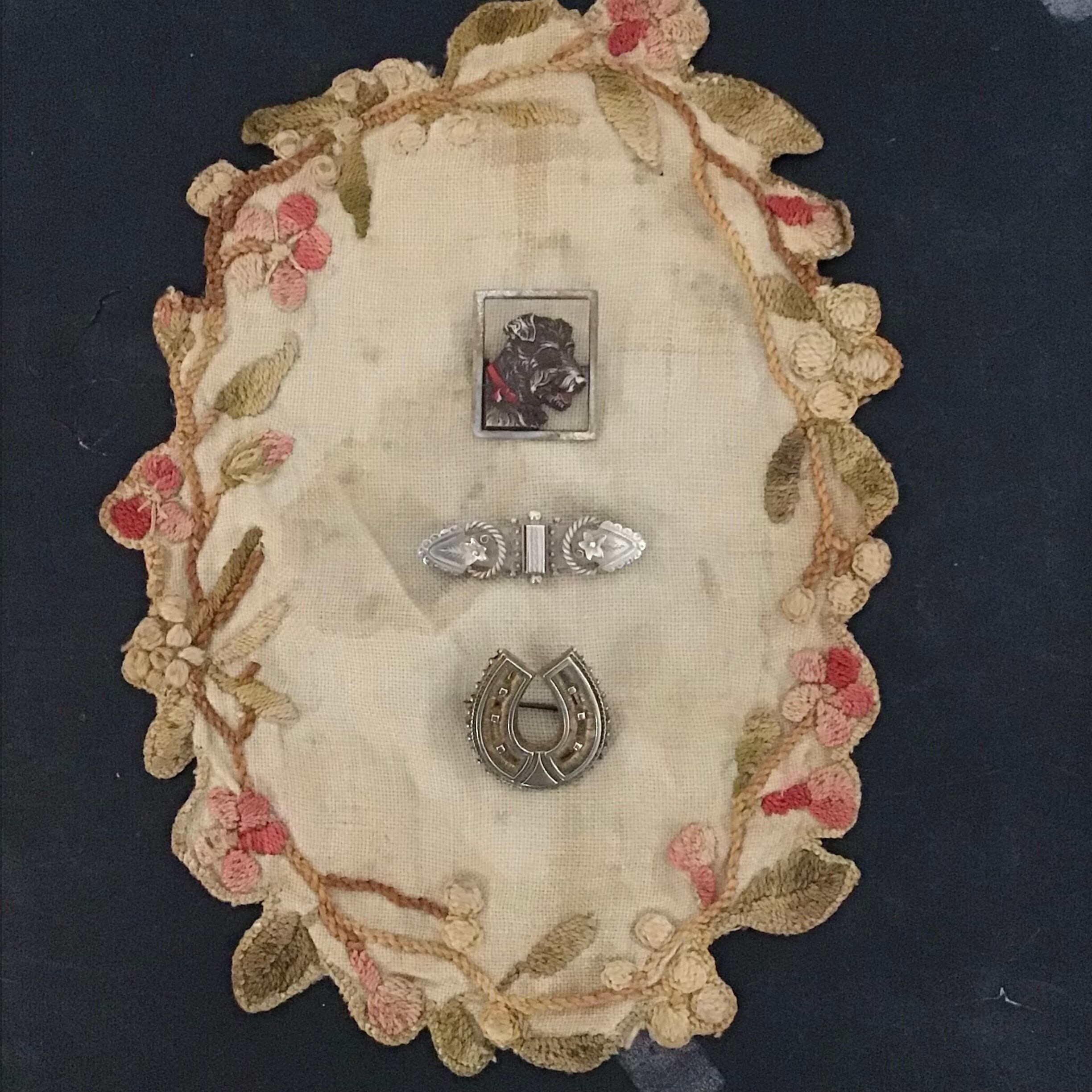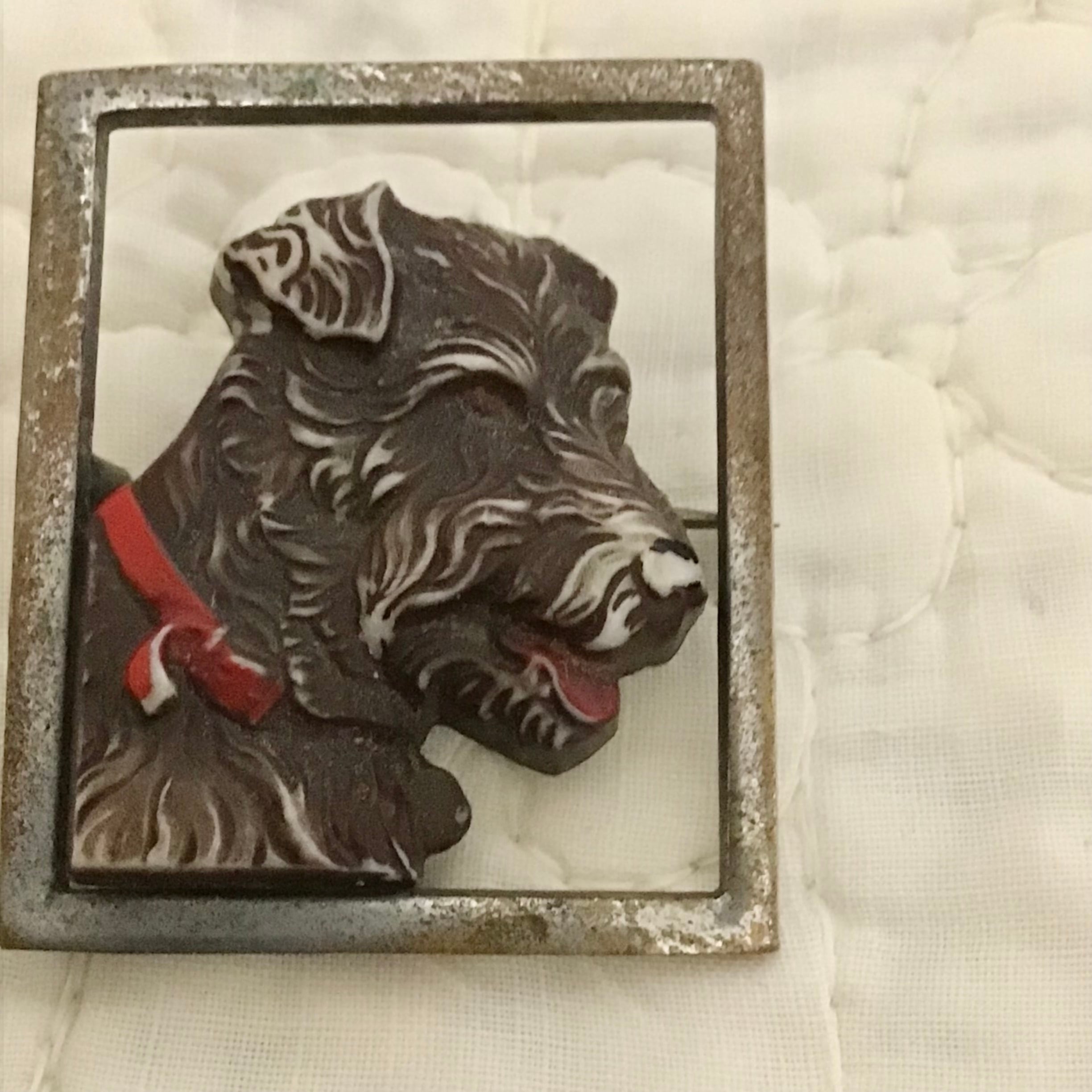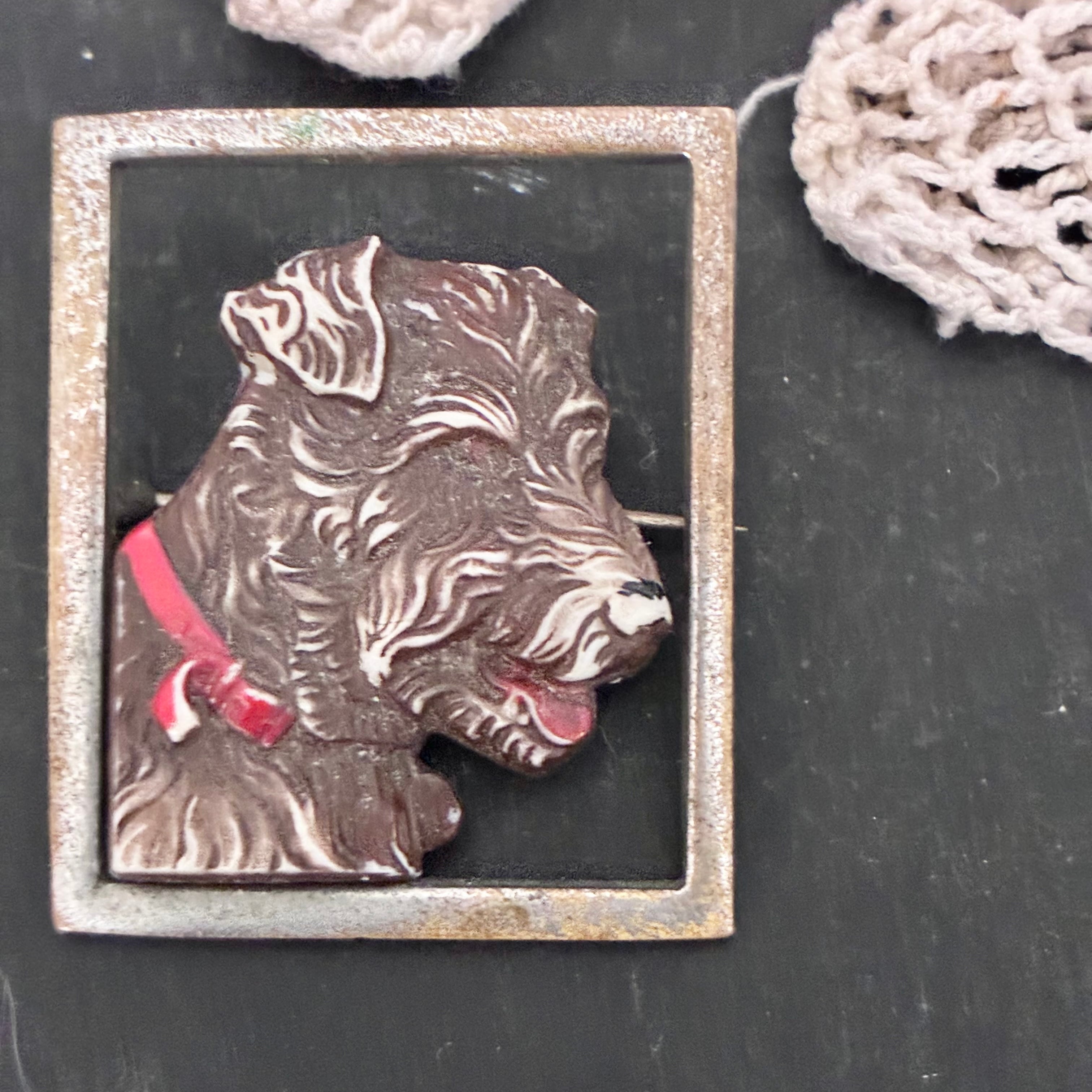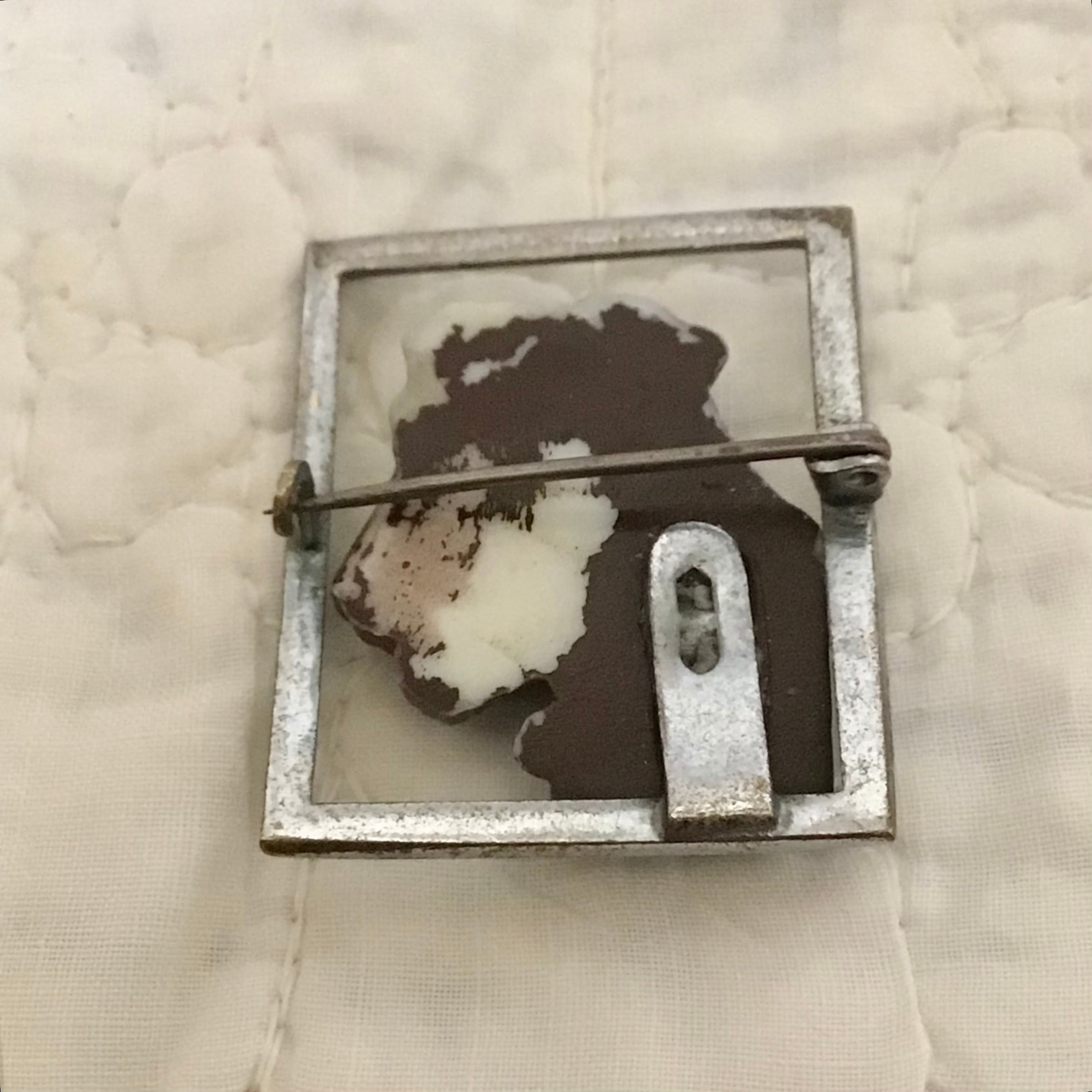1920〜30年代のブローチ、シルバーコーティングされた真鍮製の枠にセルロイドのワンちゃんがセットされています♡窓から覗いているようなデザインが可愛いらしく、経年の擦れや変色がとても味わい深く良い風合いとなっています◎